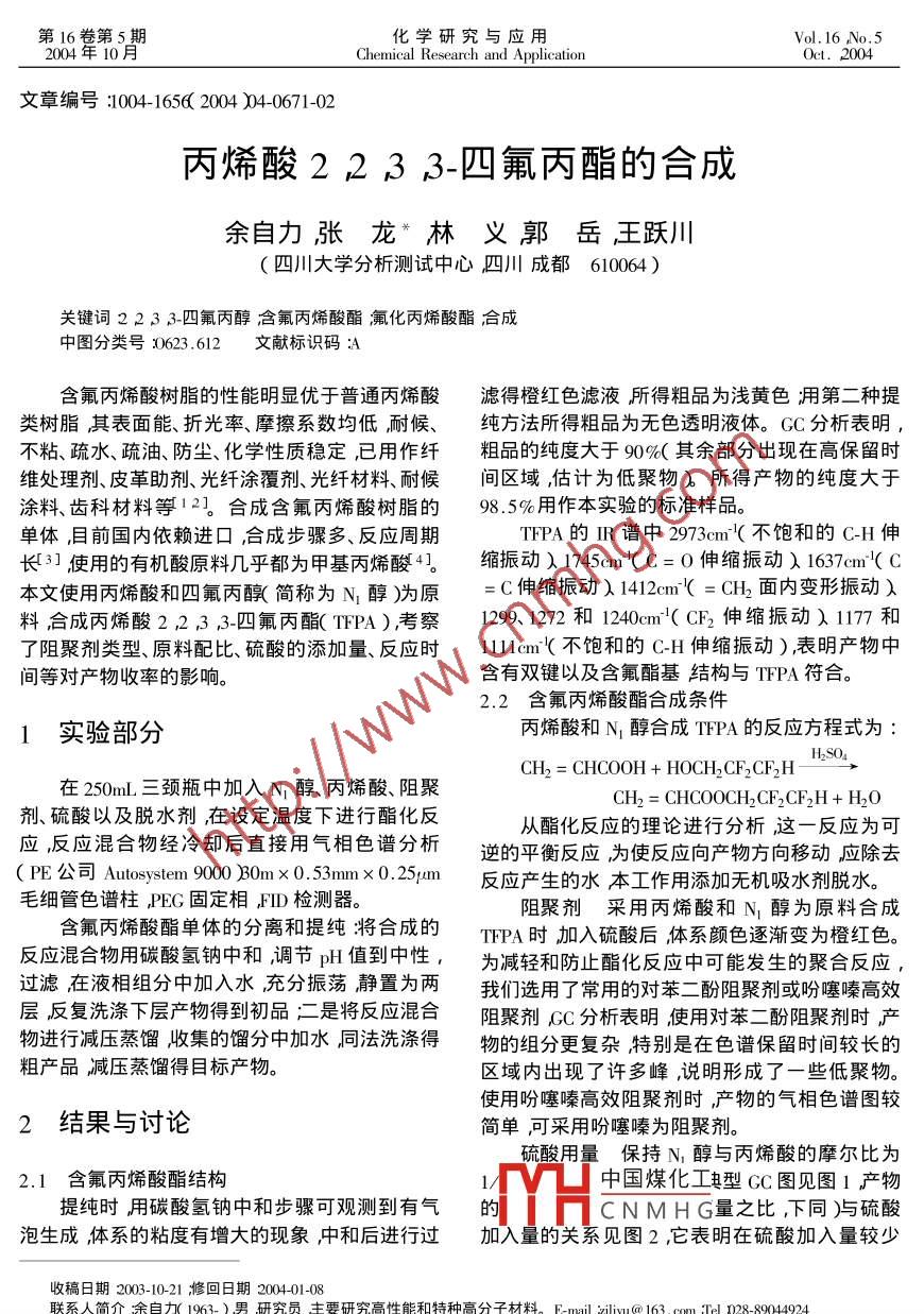 第16卷第5期化學研究與應用Chemical Research and ApplicationOct.2004文章編號:004-1656(2004)4067102丙烯酸2233-四氟丙酯的合成余自力張龍”林義郭岳王躍川四川大學分析測試中心四川成都610064)關(guān)鍵詞2233-四氟丙醇含氟丙烯酸酯氟化丙烯酸酯冾成中圖分類號623.612文獻標識碼:A含氟丙烯酸樹脂的性能明顯優(yōu)于普通丙烯酸濾得橙紅色濾液所得粗品為淺黃色用第二種提類樹脂其表面能、折光率、摩擦系數(shù)均低耐候、純方法所得粗品為無色透明液體。GC分析表明,不粘、疏水、疏油、防塵、化學性質(zhì)穩(wěn)定已用作纖粗品的純度大于90%其余部分岀現(xiàn)在高保留時維處理劑、皮革助劑、光纖涂覆劑、光纖材料、耐候間區(qū)域,估計為低聚物)所得產(chǎn)物的純度大于涂料、齒科材料等12合成含氟丙烯酸樹脂的98.5%用作本實驗的標準樣品單體,目前國內(nèi)依賴進口合成步驟多、反應周期TFPA的IR譜中2973cm(不飽和的CH伸長3使用的有機酸原料幾乎都為甲基丙烯酸4縮振動以1745cm(C=0伸縮振動1637cm(C本文使用丙烯酸和四氟丙醇簡稱為N醇)為原=C伸縮振動1412m(=CH2面內(nèi)變形振動入料合成丙烯酸2233四氟丙酯TFPA),考察10991272和1240m(CF2伸縮振動)17和了阻聚劑類型、原料配比、硫酸的添加量、反應時11limn(不飽和的CH伸縮振動)表明產(chǎn)物中間等對產(chǎn)物收率的影響。含有雙鍵以及含氟酯基結(jié)構(gòu)與TFPA符合。2.2含氟丙烯酸酯合成條件實驗部分丙烯酸和N醇合成TFPA的反應方程式為H2SOACH2=CHCOOH+ HOCH,CF2 CF2H在250mL三頸瓶中加入N1醇丙烯酸、阻聚CH2= CHCooCH, CF,CF,H+ H,O劑、硫酸以及脫水劑,在設定溫度下進行酯化反從酯化反應的理論進行分析這一反應為可應反應混合物經(jīng)冷卻后直接用氣相色譜分析逆的平衡反應為使反應向產(chǎn)物方向移動應除去(PE公司 Autosystem90000m×0.53mm×0.25;m反應產(chǎn)生的水本工作用添加無機吸水劑脫水毛細管色譜柱,PEG固定相FID檢測器。阻聚劑采用丙烯酸和N醇為原料合成含氟丙烯酸酯單體的分離和提純將合成的THPA時加入硫酸后體系顏色逐漸變?yōu)槌燃t色反應混合物用碳酸氫鈉中和調(diào)節(jié)pH值到中性過濾在液相組分中加入水充分振蕩靜置為兩我們選用了常用的對苯二酚阻聚劑或吩噻嗪高效物進行減壓蒸餾收集的餾分中加水同法洗滌得物的組分更復雜特別是在色譜保留時間較長的粗產(chǎn)品減壓蒸餾得目標產(chǎn)物。區(qū)域內(nèi)出現(xiàn)了許多峰,說明形成了一些低聚物使用吩噻嗪高效阻聚劑時產(chǎn)物的氣相色譜圖較2結(jié)果與討論簡單可采用吩噻嗪為阻聚劑。硫酸用量保持N醇與丙烯酸的摩爾比為2.1含氟丙烯酸酯結(jié)構(gòu)中國煤化工毎型GC圖見圖1產(chǎn)物提純時用碳酸氫鈉中和步驟可觀測到有氣的CNMHG量之比,下同)與硫酸泡生成體系的粘度有增大的現(xiàn)象中和后進行過加入量的關(guān)系見圖2,它表明在硫酸加入量較少牧稿日期2003-1021修回日期200401-08聯(lián)系人簡介凃自加1963-)男研究員主要研究高性能和特種高分子材料。 E-mail silly@163D28-8904924餐現(xiàn)在四川省質(zhì)量監(jiān)督檢驗所工作。672化學研究與應用第16卷的時隨著硫酸加入量的增加產(chǎn)物收率有增大的見圖3丙烯酸∧醇摩爾比較小時隨著丙烯酸趨勢而后隨著硫酸加λ量的進一步增加炇率逐比例的升高產(chǎn)物收率逐漸降低達到1:1時產(chǎn)物漸降低在摩爾比為1.75時收率達到最大,說明收率降低到較低水平,當丙烯酸含量進一步升高硫酸∧N醇的投料摩爾比在1.75附近較宜。時產(chǎn)物收率又升高達到1:1.25時又達到一個較高值繼續(xù)升高丙烯酸的量產(chǎn)物收率又有下降的趨勢。這是因為醇和酸合成酯的反應為平衡反應原料的非等摩爾比有利于化學反應向生成產(chǎn)物方向移動因而可荻得較高的產(chǎn)物收率。實際運用中N醇的價格遠高于丙烯酸采用丙烯酸N醇的摩爾比為1.25:1較好。時閉(min圖1典型反應產(chǎn)物混合物的氣相色譜圖somatogram of product mixture丙烯酸/N1醇(aol/mol)收圖3收率與原料配比的關(guān)系Fig 3 Yield versus the molar ratio of acrylic acid and NI反應時間在丙烯酸八N醇=1:1.5和硫酸N醇=1:1.5時反應進行25h以前反應混合物出現(xiàn)分層之后隨著反應時間的增加產(chǎn)物收率硫酸N醉鵝( now/mut)有降低的趨勢因此3h左右為較好的反應時間在上述選定的較好條件下所得產(chǎn)物收率保圖2產(chǎn)物收率與硫酸加入量的關(guān)系持在65~70%之間。致謝四川大學分析測試中心杜宗英老師為本實驗反應物配比TFPA收率與原料配比的關(guān)系提供氣相色譜測試成都德美精英化工有限公司為本實驗提供經(jīng)費支持在此一并表示感謝。參考文獻:[1]江源光纖與電纜及其應用技術(shù)2002(4)22-24[2 ]Kanzaki F. Sato , K. US-6 376 066( 2002[4] Maekawa T. Osawa, R,, Kamata S, Kumai[3]申屠寶卿翁志學西出宏之.高分子學報2002(5)64622X1997)Preparation of 2 2 3 rtetrafluoroproyl acrylateYU Zi-li ZHANG Long ,LiN Yi GUO Yue ANG Yue-chuanAnalytic& Testing Center Sichuan University Chengdu 610064 ChinaAbstract 22 3 3-tetrafluoropropyl acrylat TFPA )was prepay中國煤化工 id and2233tetrafluoropropanol in the presence of polymerization retarder delhCNMH Gted sulfuric acid. The ef.fect of polation retarder the amount of sulfuric acid and reaction duration on the yield of TFPa was reportedThe results showed that the yield of TPFE was 65-70 based on the theoretical calculation under optim