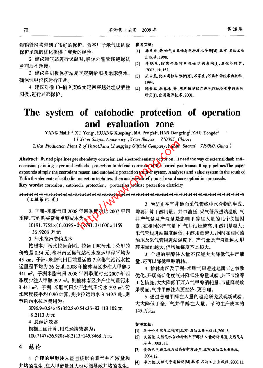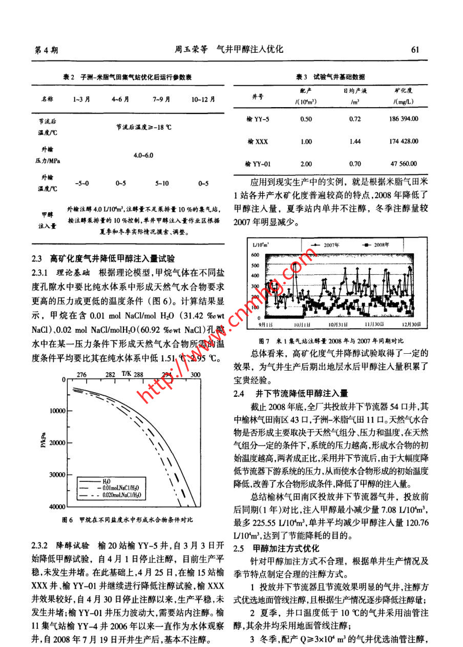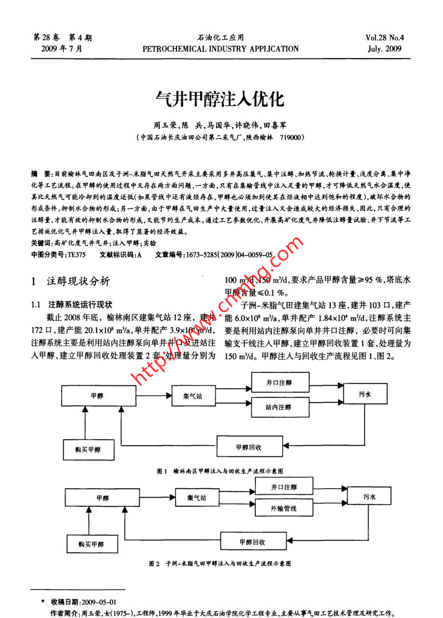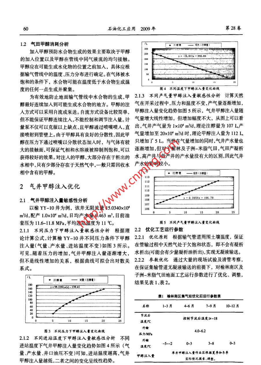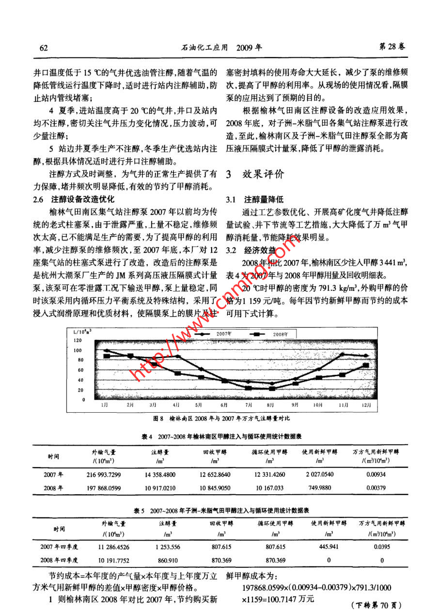 第28卷第4期石油化工應(yīng)用Vol.28 No.42009年7月.PETROCHEMICAL INDUSTRY APPLICATIONJuly. 2009氣井甲醇注人優(yōu)化周玉榮,陳兵,馬國華,許曉偉,田喜軍.(中國石油長慶油田公司第二采氣廠,陜西榆林719000)摘要:目前榆林氣田南區(qū)及子洲-米脂氣田天然氣開采 主要采用多井高壓集氣、集中注醇、加熱節(jié)流、輪換計量、淺度分離、集中凈化等工藝流程。在甲醇的使用過程中又存在兩方面問題,一方面,只有在集輸管線中注入足量的甲醇,才可降低天然氣水合溫度,使其比天然氣可能冷卻到的溫度還低(如果管線中還有液烴存在,甲醇也必須加到使其在烴液相中達(dá)到飽和的程度),破壞水合物的形成條件,抑制水合物的形成;另一方面,由于甲醇在氣田生產(chǎn)中大量使用,過量注入又會造成較大的經(jīng)濟損失,因此,只有合理的注醇量,才能有效的抑制水合物的形成,又能節(jié)約生產(chǎn)成本。通過工藝參數(shù)優(yōu)化、開展高礦化度氣井降低注醇量試驗、井下節(jié)流等工.藝措施優(yōu)化氣井甲醇注入量,取得了顯著的經(jīng)濟效益。關(guān)鍵詞:高礦化度氣井氣井;注入甲醇;實驗中團分類號:TE375文獻(xiàn)標(biāo)識碼:A 文章編 號:1673- 5285(2009 )04 -0059. -051注醇現(xiàn)狀分析100 m/d、150 m2/d, 要求產(chǎn)品甲醇含量≥95 % ,塔底水甲醇含量≤0.1 %。1.1 注醇系統(tǒng)運行現(xiàn)狀子洲-米脂氣田建集氣站13座,建井103口,建產(chǎn)截止2008年底,榆林南區(qū)建集氣站12座,建井能6.0x10* m/a,單井配產(chǎn)1.84x104 m'/d,注醇系統(tǒng)主172口,建產(chǎn)能20.1x108 m/a,單井配產(chǎn)3.9x10* m'/d,要 是利用站內(nèi)注醇泵向單井井口注醇,必要時可向集注醇系統(tǒng)主要是利用站內(nèi)注醇泵向單井井口及進(jìn)站注輸支干線注入甲醇, 建立甲醇回收裝置1套,處理量為人甲醇,建立甲醇回收處理裝置2套,處理量分別為150 m'/d。甲醇注人與回收生產(chǎn)流程見圖1.圖2。井口注醇甲醇集氣站↑站內(nèi)注醇購買甲醇甲醇回收圍1榆林南區(qū)甲醇注入與回收生產(chǎn)流程示意圖污水外輸管線圍2子洲-米脂氣田 甲醇注入與回收生產(chǎn)流程示意圍收稿日期:2009 -05-01作者簡介:周五榮,女(1975-),工程師,1999年畢業(yè)于大慶石油學(xué)院化學(xué)工程專業(yè),主要從事氣田工藝技術(shù)管理及研究工作。60石油化工應(yīng)用2009 年第28卷1.2氣田甲醇消耗分析◆川特展線科(計障量00加入甲醇預(yù)防水合物生成的效果主要取決于甲醇50、-13.811%+ 255.84的加入位置以及甲醇在管線中同氣液流的均勻接觸。甲醇應(yīng)在可能生成水化物的位置之前加入,具體應(yīng)根8據(jù)輸氣管線中的溫度、壓力分布進(jìn)行確定。在氣體被水飽和的條件下,水合物可能在溫度低于水合物生成溫20度的任何一點生成并聚集。團4不同溫度下甲醇注入量變化曲線為有效地防止地面輸氣管線中水合物的生成,甲2.1.3 不同產(chǎn)氣量甲醇注入量敏感性分析 計算天然醇最好連續(xù)加人到可能生成水合物的地方。甲醇的注氣在開采過 程中,壓力和溫度不變,產(chǎn)氣量逐漸增加,人方式可以采用自流或泵送。自流方式設(shè)備比較簡單,甲醇注人量變化趨勢如圖5所示,氣井甲醇注人量隨但不能保證甲醇連續(xù)注人,不能控制和調(diào)節(jié)注入量。計氣量增大線性增加,但增加幅度不大,從圖上可以看量泵不僅可以克服以上缺點,且甲醇通過噴嘴噴人,直出, 氣井產(chǎn)氣量為1x10* m'd,理論注醇量為107 L產(chǎn)接噴射到管壁上。由于甲醇具有良好的分散性,因此甲氣量增 加至20x10* m'/d時,理論甲醇注人量為112 L,醇在壓力下通過噴嘴以分散狀態(tài)加人時,與氣體有較只增加了 5 L。當(dāng)然在氣量增加的同時,氣井產(chǎn)水量也大的接觸面,可保證氣相和水溶液被抑制劑飽和,可以逐漸增加,但對于榆林及子洲-米脂氣田,氣田產(chǎn)凝析獲得較好的效果。對注人的甲醇,大部分存在于析出的水,高產(chǎn)井 與低產(chǎn)井的產(chǎn)水量沒有大的區(qū)別,因此氣井水相中,只有少部分存在于天然氣中,-般只需回收水產(chǎn)水的影響較小。相中含有的甲醇。,注脖量線性(件鵬量)113122氣井甲醇注入優(yōu)化11110109.yu0.2658x+106.792.1.氣井甲醇注入量敏感性分析10807以榆YY-10井為例,該井無阻流量15.0340x10*106m'd,配產(chǎn)1.0x10* m'/d,日均產(chǎn)水量0.463 m',目前油套壓為11.6~11.8 MPa,平均進(jìn)站溫度為11 C。.圍5不同產(chǎn)氣量甲醇注入量變化曲線2.1.1不同壓力下甲醇注入量敏感性分析 根據(jù)理2.2 優(yōu)化工藝運行參數(shù)論計算公式,計算榆YY-10井不同壓力條件下甲醇2.2.1 優(yōu)化原則 根據(jù)輸氣管道周圍土壤溫度, 保證注人量(氣量、產(chǎn)水量、進(jìn)站溫度不變)如圖3所示。在管輸過程中天然氣處于欠飽 和狀態(tài),即不會有凝析可見,隨著壓力的增加,氣井甲醇注入量逐漸增大,水析出(可能 會有少量凝析油析出),實現(xiàn)無凝液輸送。但不是線性增加的關(guān)系,根據(jù)曲線可擬合出對數(shù)關(guān)2.2.2 參數(shù)優(yōu)化通過大量的現(xiàn)場試驗 及清管考察,系式。在保證集輸管道無凝液輸送的前提下,對榆林南區(qū)及子洲-米脂氣田地面工藝運行參數(shù)進(jìn)行了優(yōu)化、調(diào)整,●非醇景一曦(注酵量)結(jié)果見表1.表2。180工98.228L()- 139.41| 14表l榆林南區(qū)集氣站優(yōu)化后運行參數(shù)表10名稱