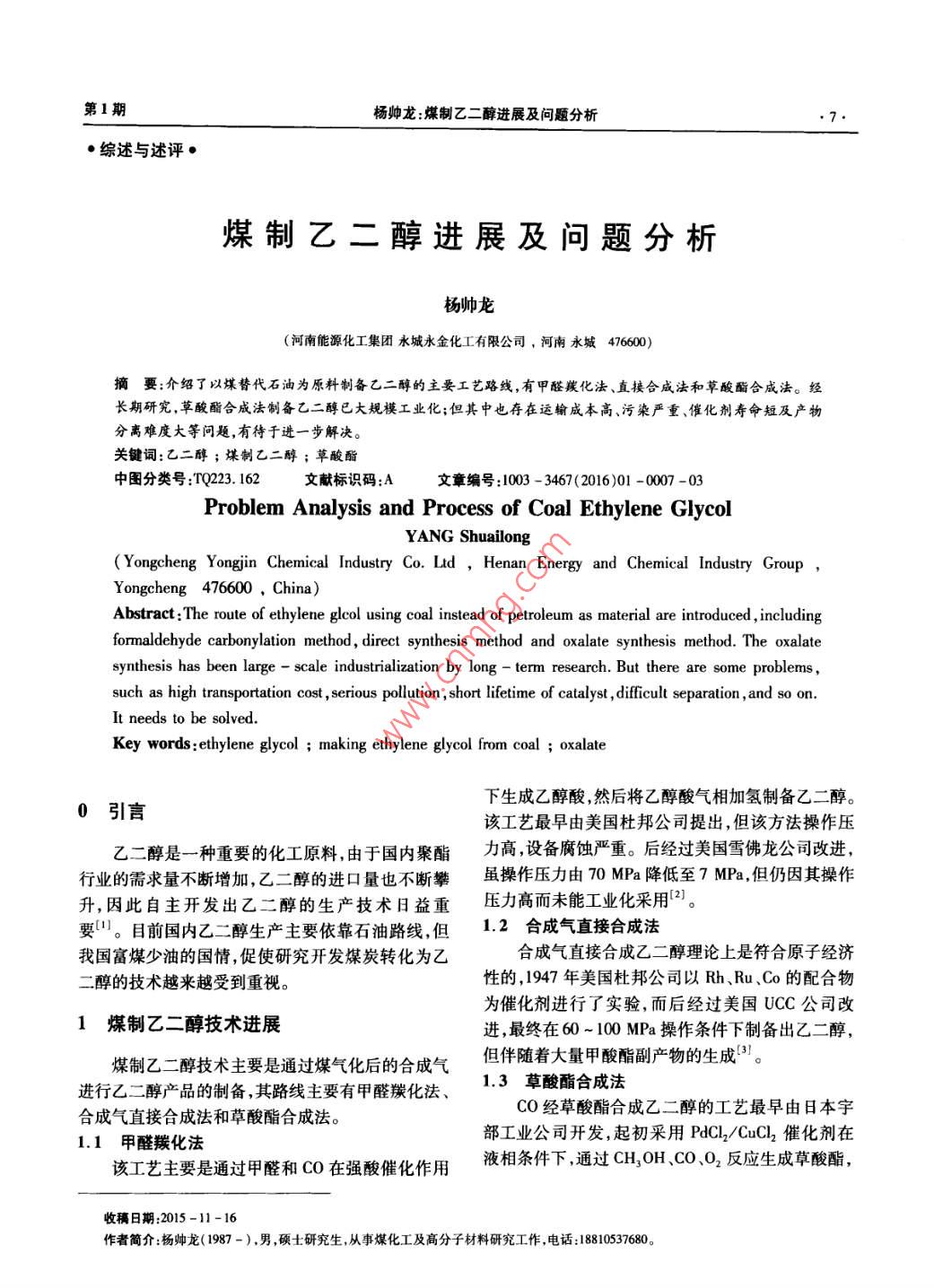 第1期楊帥龍:煤制乙二醇進展及問題分析·綜述與述評煤制乙二醇進展及問題分析楊帥龍(河南能源化工集團永城永金化工有限公司,河南永城476600摘要;介紹了以煤替代石油為原料制備乙二醇的主要工藝路線,有甲醛羰化法、直接合成法和草酸酯合成法。經(jīng)長期研究,草酸酯合成法制備乙二醇已大規(guī)模工業(yè)化;但其中也存在運輸成本高、污染嚴(yán)重、催化劑壽命短及產(chǎn)物分離難度大等問題,有待于進一步解決。關(guān)鍵詞:乙二醇;煤制乙二醇;草酸酯中圖分類號:TQ23.162文獻標(biāo)識碼:A文章編號:1003-3467(2016)01-0007-03Problem Analysis and Process of Coal Ethylene GlycolYANG ShuailongYongcheng Yongjin Chemical Industry Co. Ltd Henan Energy and Chemical Industry GroupYongcheng 476600, China)Abstract: The route of ethylene glcol using coal instead of petroleum as material are introduced, includingformaldehyde carbonylation method, direct synthesis method and oxalate synthesis method. The oxalatesynthesis has been large scale industrialization by long-term research. But there are some problemssuch as high transportation cost, serious pollution, short lifetime of catalyst, difficult separation, and so onIt needs to be solvedKey words: ethylene glycol making ethylene glycol from coal; oxalate下生成乙醇酸,然后將乙醇酸氣相加氫制備乙二醇0引言該工藝最早由美國杜邦公司提出,但該方法操作壓乙二醇是一種重要的化工原料,由于國內(nèi)聚酯力高,設(shè)備腐蝕嚴(yán)重。后經(jīng)過美國雪佛龍公司改進行業(yè)的需求量不斷增加,乙二醇的進口量也不斷攀雖操作壓力由70MPa降低至7MPa,但仍因其操作升,因此自主開發(fā)出乙二醇的生產(chǎn)技術(shù)日益重壓力高而未能工業(yè)化采用。要。目前國內(nèi)乙二醇生產(chǎn)主要依靠石油路線但1.2合成氣直接合成法我國富煤少油的國情,促使研究開發(fā)煤炭轉(zhuǎn)化為乙合成氣直接合成乙二醇理論上是符合原子經(jīng)濟二醇的技術(shù)越來越受到重視。性的,1947年美國杜邦公司以Rh、Ru、Co的配合物為催化劑進行了實驗,而后經(jīng)過美國UC公司改1煤制乙二醇技術(shù)進展進,最終在60~100MPa操作條件下制備出乙二醇,煤制乙二醇技術(shù)主要是通過煤氣化后的合成氣但伴隨著大量甲酸酯副產(chǎn)物的生成。進行乙二醇產(chǎn)品的制備,其路線主要有甲醛羰化法、1.3草酸酯合成法合成氣直接合成法和草酸酯合成法CO經(jīng)草酸酯合成乙二醇的工藝最早由日本宇1.1甲醛羰化法部工業(yè)公司開發(fā),起初采用PdCl2/CuCl2催化劑在該工藝主要是通過甲醛和CO在強酸催化作用液相條件下,通過CH, OH CO, O2反應(yīng)生成草酸酯,收稿日期:2015-11-16作者簡介楊帥龍(1987-),男,碩士研究生,從事煤化工及高分子材料研究工作,電話:18810537680。河南化工8HENAN CHEMICAL INDUSTRY2016年第33卷然后經(jīng)過加氫制備出乙二醇。但該反應(yīng)副產(chǎn)物較多,而且設(shè)備腐蝕嚴(yán)重“。后經(jīng)過日本宇部興產(chǎn)公2煤制乙二醇存在問題司和美國聯(lián)碳公司合作開發(fā)草酸二烷基酯合成工2.1運輸問題藝5,采用亞硝酸丁酯作為助劑,在8-11MPa和煤制乙二醇是以煤炭為基礎(chǔ)原料,我國華北和90~110℃條件下反應(yīng)生成草酸酯,解決了設(shè)備腐西北區(qū)的煤炭儲量占全國煤炭儲量的50%和30%蝕問題。但總體來說,液相條件下合成草酸酯易造左右,而聚酯工業(yè)多分布于東南,浙江和江蘇分別占成催化劑活性組分流失,而且其對反應(yīng)生成的水分40%和34%。煤制乙二醇項目建設(shè)在富煤地區(qū),即控制嚴(yán)格等,限制了其工業(yè)化。日本宇部興產(chǎn)公司華北和西北生產(chǎn)出的乙二醇再銷往東南地區(qū),需長開發(fā)了氣相條件下合成乙二醇的工藝,在0.5MPa距離運輸,其運輸條件受到限制,也增大了運輸成和80~150℃條件下即可進行反應(yīng),而且通過了本9。480h的穩(wěn)定連續(xù)運行,并進行了小型工業(yè)化生產(chǎn)。2.2污染問題國內(nèi)許多高校及研究單位也進行深人研究由于煤制乙二醇工藝生產(chǎn)直接采用CO、NO、O22005年華東理工大學(xué)重點實驗室和上海焦化達成及亞酯氣進行反應(yīng),這些氣體中含有部分惰性氣體,合作開發(fā)協(xié)議,通過研究,成功開發(fā)了30a的合成隨著反應(yīng)的不斷進行,會產(chǎn)生雜質(zhì)氣體(甲烷、CO2氣制乙二醇技術(shù)。雖然成功制備出聚酯級乙二醇,NO2),同時原來系統(tǒng)內(nèi)的惰性氣體將不斷累積,會但相應(yīng)的問題也暴露出來如催化劑壽命短反應(yīng)器影響到生產(chǎn)的正常進行,因此需要不斷從反應(yīng)系統(tǒng)溫度不易控制等。中科院福建物構(gòu)所從20世紀(jì)排出這些氣體。隨著尾氣的排放,NO、CO、甲醇和80年代開始進行研究,于2005年和江蘇丹化科技亞酯氣等有用氣體都會被排放,既造成了原料浪費合作進行了年產(chǎn)30的中試生產(chǎn),并在中試項目運也造成環(huán)境污染。通過新增一些塔設(shè)備將其中行過程中建立萬噸級工業(yè)化示范裝置。天津大學(xué)自的有用氣體成分進行回收,可有效地節(jié)約資源,降低1987年開始進行合成氣制乙二醇項目的研究工作,成本。以Pd-Fe/Al2O3為催化劑制備草酸二乙酯,并通過2.3催化劑壽命問題進一步加氫制備出乙二醇。通過年產(chǎn)300t乙二CO偶聯(lián)反應(yīng)制備草酸酯的過程中,催化劑通常醇裝置試驗考察了裝置運行穩(wěn)