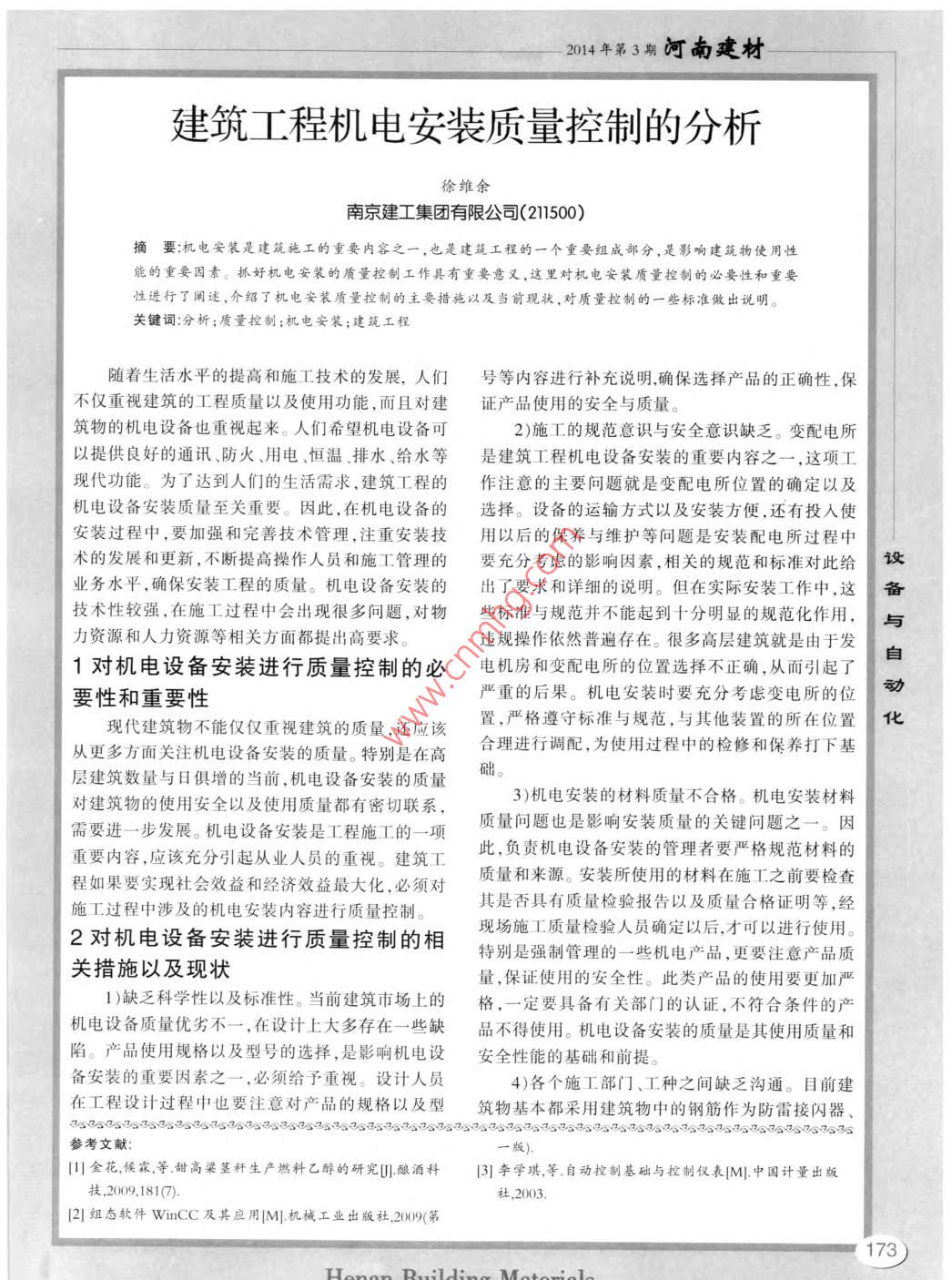 河南建材2014年第3期電氣自動(dòng)化在乙醇生產(chǎn)中的應(yīng)用張琬君王琳琳楊勇偉21中材建設(shè)有限公司(100176)2河南建筑材料研究設(shè)計(jì)院有限責(zé)任公司400002)摘要近年來(lái),利用甜高粱莖稈制乙醇的工藝得到廣泛應(yīng)用。該工藝簡(jiǎn)單、實(shí)用,將電氣自動(dòng)化技術(shù)應(yīng)用于乙醇生產(chǎn)中使得其工藝連續(xù),產(chǎn)量大幅度提高。關(guān)鍵詞:電氣自動(dòng)化;乙醇;溫度電氣自動(dòng)化技術(shù)在該項(xiàng)目的應(yīng)用主要體現(xiàn)在處5個(gè)溫度的平均值則是反映此段物料的發(fā)酵溫變頻技術(shù)、溫度PID控制,同時(shí)采用西門子 WinCC度。以此類推,根據(jù)發(fā)酵溫度的控制來(lái)調(diào)節(jié)發(fā)酵罐編程完成人機(jī)交互畫(huà)面。甜高粱莖稈制乙醇的工藝的轉(zhuǎn)速也是需要在 WinCC中編程得以實(shí)現(xiàn)。由原料粉碎及輸送、預(yù)熱塔、乙醇發(fā)酵罐蒸餾塔、4蒸餾塔乙醇儲(chǔ)存罐等主要部分組成。下面分別介紹每個(gè)主蒸餾塔和預(yù)熱塔的結(jié)構(gòu)是完全一樣的,其作用要工藝段的電氣自動(dòng)化應(yīng)用。是將發(fā)酵過(guò)的混合物通過(guò)蒸氣加熱進(jìn)行蒸餾,從而1原料粉碎及輸送將乙醇分離出來(lái),然后再進(jìn)行冷卻,提取出乙醇。蒸原料粉碎及輸送主要采用的是粉碎機(jī)和絞龍餾塔中蒸氣的溫度要控制在100℃左右,這樣可以設(shè)粉碎機(jī)將高粱莖稈切斷粉碎后經(jīng)過(guò)絞龍輸送到預(yù)使乙醇達(dá)到沸點(diǎn)后變成氣態(tài)從而提取出來(lái)。蒸氣溫備熱塔中粉碎機(jī)電機(jī)采用低壓直啟方式絞龍的輸度通過(guò)一個(gè)調(diào)節(jié)閥控制進(jìn)氣量。測(cè)溫同樣采用熱電與送量要大于粉碎機(jī)的產(chǎn)量,以避免原料堆積導(dǎo)致絞阻方式取平均值,根據(jù)溫度的平均值來(lái)調(diào)節(jié)閥門的自龍超負(fù)荷運(yùn)轉(zhuǎn)。開(kāi)度,從而實(shí)現(xiàn)溫度的PD控制。動(dòng)2預(yù)熱塔5乙醇儲(chǔ)存罐化預(yù)熱塔主要是利用蒸氣將物料進(jìn)行升溫,蒸氣乙醇儲(chǔ)存罐用來(lái)儲(chǔ)存蒸餾塔分離出來(lái)的乙醇,的溫度要控制在150~160℃,而且必須嚴(yán)格控制蒸由于乙醇具有揮發(fā)性和可燃性,因此乙醇存儲(chǔ)罐配氣與物料接觸,以避免產(chǎn)生過(guò)多的水分,這樣可以置可燃性氣體檢測(cè)裝置,其測(cè)點(diǎn)分布在儲(chǔ)存罐的上使得經(jīng)過(guò)預(yù)熱塔的物料溫度基本控制在20℃左方以及罐體的周圍。檢測(cè)裝置的終端安裝在中控室右。預(yù)熱塔采用的是變頻電機(jī),通過(guò)改變變頻器的內(nèi),一旦檢測(cè)到某個(gè)測(cè)點(diǎn)報(bào)警,就意味著此處的乙速度給定使得預(yù)熱塔中物料的旋轉(zhuǎn)速度得以變化。醇濃度超標(biāo),存在安全隱患,操作員根據(jù)報(bào)警情況物料溫度的測(cè)量采用熱電阻方式,好處是相對(duì)來(lái)說(shuō)采取相應(yīng)的措施。比較準(zhǔn)確。此處需要在 WinCc中進(jìn)行PD回路的6結(jié)語(yǔ)編程,即用經(jīng)過(guò)預(yù)熱塔的物料溫度來(lái)調(diào)節(jié)預(yù)熱塔的總之,利用甜高粱莖稈制乙醇屬于國(guó)家新能源旋轉(zhuǎn)速度,溫度越高,旋轉(zhuǎn)速度越快。溫度較低的時(shí)項(xiàng)目,今后定會(huì)增大投入。大規(guī)模生產(chǎn)對(duì)于電氣自候,旋轉(zhuǎn)速度相應(yīng)放慢,使得物料預(yù)熱的時(shí)間加長(zhǎng)動(dòng)化的精度要求會(huì)較提高,尤其是甜高粱莖稈的發(fā)從而使其溫度升高。酵溫度的嚴(yán)格控制,否則很容易發(fā)酵成醋而不是乙3乙醇發(fā)酵罐醇。對(duì)于DCS的投入也會(huì)相應(yīng)提高要求,測(cè)溫儀表乙醇發(fā)酵罐外觀類似于水泥廠中的大窯,發(fā)酵的精度以及DCS的控制精度會(huì)大大提高,這對(duì)于目罐長(zhǎng)55m,罐內(nèi)的物料與發(fā)酵菌種按照一定比例混前的DCS來(lái)說(shuō),是一項(xiàng)艱巨的任務(wù)同時(shí)也是一次難合進(jìn)行發(fā)酵,發(fā)酵溫度必須嚴(yán)格控制在30℃左右,得的機(jī)會(huì)。相對(duì)于DCS的高精度要求,電氣控制主否則發(fā)酵出來(lái)的就不是乙醇了發(fā)酵罐采用變頻器要是對(duì)傳動(dòng)設(shè)備的要求,目前的變頻技術(shù)已經(jīng)基本控制轉(zhuǎn)速,由于發(fā)酵罐較長(zhǎng),溫度又必須嚴(yán)格控制,能夠滿足其需求。相信不久的將來(lái),電氣自動(dòng)化技所以在發(fā)酵罐內(nèi)每隔6m需要設(shè)置5個(gè)測(cè)溫點(diǎn)。術(shù)在乙醇生產(chǎn)中將得到空前的提升。5個(gè)測(cè)溫點(diǎn)平均分布在發(fā)酵罐旋轉(zhuǎn)面的軸線上,此(1722014年第3期河南建材建筑工程機(jī)電安裝質(zhì)量控制的分析徐維余南京建工集團(tuán)有限公司(211500)摘要:機(jī)電安裝是建筑施工的重要內(nèi)容之一,也是建筑工程的一個(gè)重要組成部分,是影響建筑物使用性能的重要因素。抓好機(jī)電安裝的質(zhì)量控制工作具有重要意義,這里對(duì)機(jī)電安裝質(zhì)量控制的必要性和重要性進(jìn)行了闡述,介紹了機(jī)電安裝質(zhì)量控制的主要措施以及當(dāng)前現(xiàn)狀,對(duì)質(zhì)量控制的一些標(biāo)準(zhǔn)做出說(shuō)明。關(guān)鍵詞分析;質(zhì)量控制;機(jī)電安裝;建筑工程隨著生活水平的提高和施