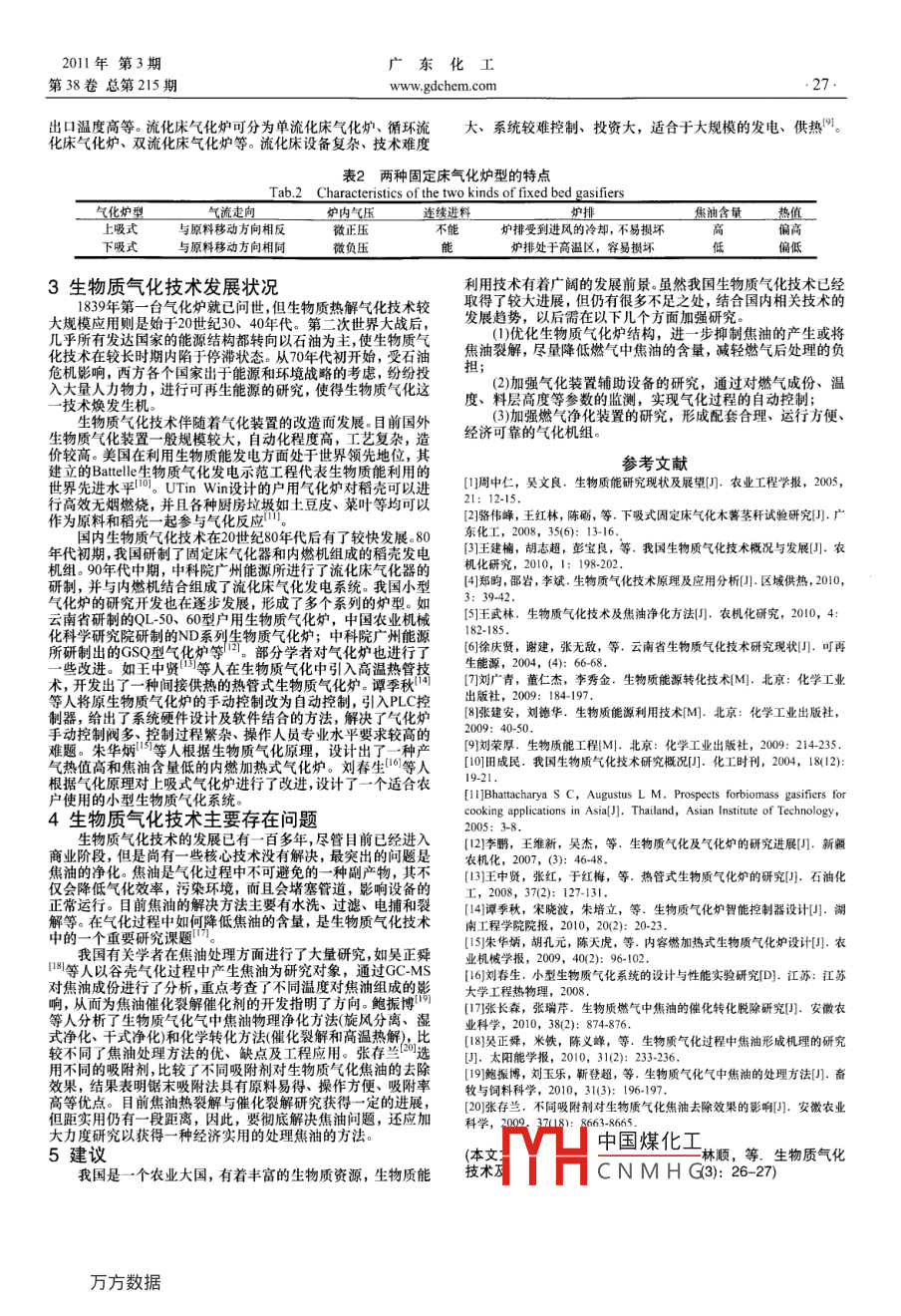廣東化工2011年第3期26ww.gdchem.com第38卷總第215期生物質(zhì)氣化技術(shù)及進(jìn)展陳起朋,曾顯華,胡林順,尹荔松(五邑大學(xué)分析測(cè)試中心,廣東江門(mén)529020)滴要]能源和環(huán)境的雙重壓力使得可再生清潔能源的開(kāi)發(fā)利用越來(lái)越重要。生物質(zhì)能是地球上重要的可再生能源,具有廣闊的發(fā)展前景。我國(guó)有著豐富的生物質(zhì)資源,開(kāi)發(fā)和利用生物質(zhì)能源對(duì)于緩解我國(guó)能源、環(huán)境及生態(tài)問(wèn)題都具有重要的意義。文章介紹了生物質(zhì)氣化技術(shù)的原理及研究進(jìn)展,分析了氣化過(guò)程中存在的主要問(wèn)題,并指出了氣化技術(shù)的研究方向鍵詞生物質(zhì);氣化;進(jìn)展中圖分類(lèi)號(hào)]TQ文獻(xiàn)標(biāo)識(shí)碼]A文章編號(hào)007-1865(2011)03-002602Biomass Gasification Technology and its DevelopmentChenZeng xianhua, Hu Linshun. Yin Lison(Instrumental Analysis Research Center, Wuyi University, Jiangmen 529020, China)Abstract: Becausc of the dual pressure of the energy and environment, the exploitation and utilization of the renewable and clean energy sources are becomingmore and more important. Biomass energy is an important and renewable energy resource on carth, which had a broad prospect of development. Our country hadabundant biomasses, exploitation and utilization of biomass sources is of great significance for softening the problems of energy, environment and ecologyIn the paper the principles and developments of biomass gasification technology were briefly introduced. The problems existed in the gasification process wereanalyzed. The research directions of gasification technology were proposedKeywords: biomass; gasification; development能源是經(jīng)濟(jì)和社會(huì)發(fā)展的重要物質(zhì)基礎(chǔ)。隨著石油和其他了氣化劑,使生物質(zhì)發(fā)生部分燃燒,從而為氣化過(guò)程提供了大化石能源的日漸枯竭和全球?qū)夂蜃兓瘑?wèn)題的日益關(guān)注,節(jié)約量的熱量,屬于自供熱源工藝。目前關(guān)于氧化法氣化技術(shù)的研能源、提高能源利用率和開(kāi)發(fā)利用可再生能源成為世界能源發(fā)究較多于煤炭、石油和天然氣而居于世界能源消費(fèi)總量第四位的能源在氧化法氣化工藝中,生物質(zhì)原料基本上要經(jīng)過(guò)氧化、還原、裂解(熱解)和干燥四個(gè)階段,其主要的反應(yīng)方程式如下,是具有廣泛應(yīng)用價(jià)值的清潔能源,是解決能源和環(huán)境危機(jī)氧化階段:C+O2=CO2+393.51kJ的重要保障。自20世紀(jì)70年代開(kāi)始,生物質(zhì)能的開(kāi)發(fā)和利用日2C0+221.34kJ益受到各國(guó)的高度重視,我國(guó)于2008年3月18日出臺(tái)的《可2C0+02CO2+565.94kJ生能源發(fā)展“十一五”規(guī)劃》確定了生物質(zhì)能利用的指導(dǎo)方針2H,+O2HO+483.68kJ和發(fā)展目標(biāo),為我國(guó)發(fā)展和使用生物質(zhì)技術(shù)指明了方向和道還原階段:C+CO2C0-162,4lkH,O+CCO+H,-118.82kJ我國(guó)生物質(zhì)種類(lèi)形態(tài)繁多,其轉(zhuǎn)化方式也多種多樣,其中2H0-+C=CO2+2H2-75.24kJ生物質(zhì)氣化技術(shù)是最具實(shí)用性的一種。生物質(zhì)氣化技術(shù)原理簡(jiǎn)H,O+COCO+H,-43.58kJ單,操作方便,成本低,效率高,可在工農(nóng)業(yè)生產(chǎn)的各個(gè)領(lǐng)域2常用氣化工藝及設(shè)備廣泛的使用2.1常用氣化介質(zhì)及特點(diǎn)1生物質(zhì)氣化基本原理化飛物質(zhì)氣化技術(shù)按原理可分為熱解氣化技術(shù)和氧化法氣等有害元素極少,所以非常適合于氣化目前生物質(zhì)氣化的常術(shù)。熱解氣化技術(shù)是指在沒(méi)有氧化劑的條件下,快速升溫用氣化介質(zhì)有空氣、氧氣、水蒸氣等以及這些氣體的混合物使生物質(zhì)中的有機(jī)高分子(纖維素、半纖維素、木質(zhì)素等)高溫這些不同的氣化方式都有各自的優(yōu)缺點(diǎn),其中空氣-水蒸氣氣裂解成固態(tài)炭、可燃?xì)夂蜕镉偷臒峄瘜W(xué)轉(zhuǎn)化技術(shù)。三種產(chǎn)物化結(jié)合了空氣氣化設(shè)備簡(jiǎn)單、操作維護(hù)簡(jiǎn)便以及水蒸氣氣化氣的比例跟熱解的工藝(升溫速率、氣相滯留時(shí)間、壓力等)有關(guān)中H2含量高的優(yōu)點(diǎn)。詳見(jiàn)表其生產(chǎn)過(guò)程需要外供熱源。氧化法氣化工藝在生產(chǎn)過(guò)程中加入表1常用氣化介質(zhì)及特點(diǎn)ab I The common gasification medi氣化介質(zhì)外供熱源氣體屬性產(chǎn)氣H2、CO摩爾比特點(diǎn)空氣不需要低熱值,約5MJm3設(shè)備簡(jiǎn)單、操作維護(hù)簡(jiǎn)便不需要中熱值,約15Mm3純氧成本高水蒸氣要中熱值,約17~21MA需要蒸汽發(fā)生器和過(guò)熱設(shè)備,技術(shù)復(fù)雜空氣(氧氣)水蒸氣不需要中低熱值,約115Mm3成本略高22常用氣化設(shè)備及特點(diǎn)為上吸式、下吸式、橫吸式和開(kāi)心式氣化器,目前較為成熟的前,常用的生物質(zhì)氣化爐主要有固定床氣化爐和流化床氣化前兩種爐型。表2是兩種爐型的主要特點(diǎn)氣化爐兩種。22.1固定床氣化爐2.2.2中國(guó)煤化工定床氣化爐設(shè)備簡(jiǎn)單、熱效率高,處理量小,適合中、CNMHG反應(yīng)速度快、反應(yīng)溫度小規(guī)模的工業(yè)化生產(chǎn)。在固定床氣化爐中,物料相對(duì)于氣流處均勻1質(zhì)數(shù)間、能趕繡上1F、生產(chǎn)能力大等優(yōu)點(diǎn),但于靜止?fàn)顟B(tài),根據(jù)氣化劑在爐內(nèi)的走向,固定床氣化器