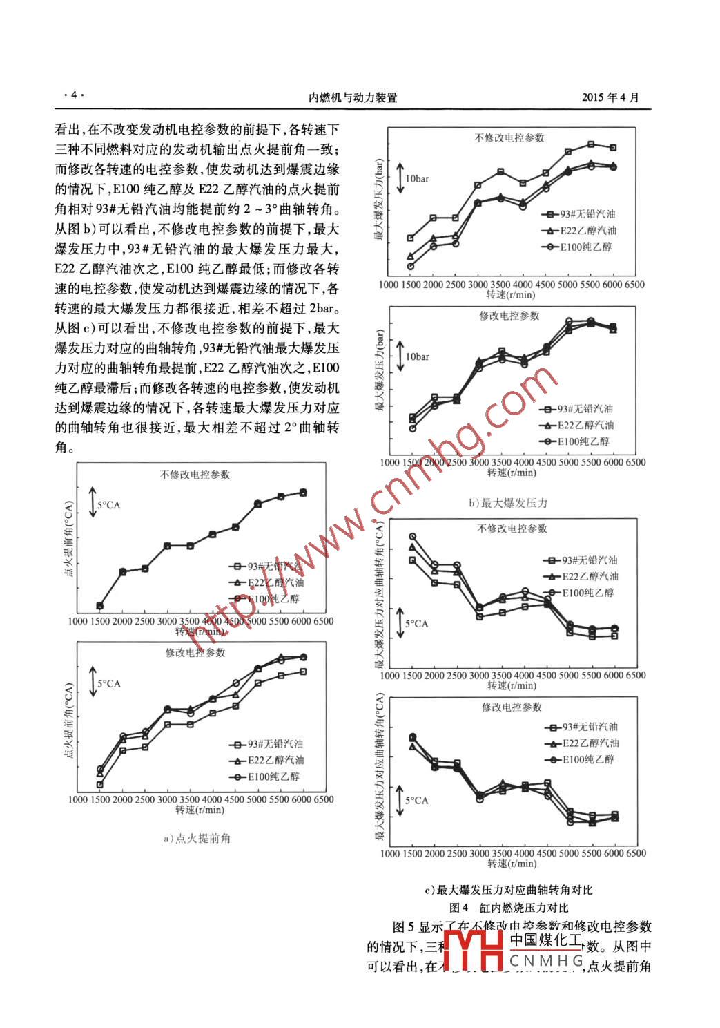 第32卷第2期Vol 32 No. 22015年4月內(nèi)燃機與動力裝置L.C.E& PowerplantApr.2015【試驗研究】乙醇混合燃料在乘用車汽油發(fā)動機中的試驗研究金暉陳偉國,王偉,馮心水(奇瑞汽車股份有限公司,安徽蕪湖241009摘要:隨著石油危機的來臨,乙醇燃料,因其為可再生生物能源的優(yōu)勢,成為一種很好的代用燃料。本文針對一款汽油發(fā)動機,分別對93#無鉛汽油、E22乙醇汽油及E00純乙醇在動力性及燃燒特性進行試驗研究和對比分析。試驗結(jié)果表明:對發(fā)動機及ECU數(shù)據(jù)不進行改動,隨著燃料中乙醇比例的提高,發(fā)動機動力性增加,最大爆發(fā)壓力不會超出現(xiàn)有汽油機水平:而修改電控參數(shù)點火提前角,隨著燃料中乙醇比例的提高,50%已燃質(zhì)量分數(shù)會提前,燃燒持續(xù)期縮短,并逐步接近或達到93#汽油的水平。關(guān)鍵詞:乙醇;汽油;動力性;燃燒特性中圖分類號:TK418.9文獻標志碼:A文章編號:1673-6397(2015)02-0001-05Experimental Study on Ethanol Blended Fuel on DieselEngine-Powered Passenger VehiclesJIN Hui, CHEN Wei-guo, WANG Wei, FENG Xin-shuiChery Automobile Co, Ltd., Wuhu 241009, China)Abstract: For oncoming oil crisis, ethanol fuel has been considered as a good alternative fuelbecause of its advantages as a renewable bioenergy. Basing on a diesel engine, this paper does theexperimental study and comparative analysis on the dynamic and combustible performance of this en-gine respectively on 93 unleaded gasoline, E22 ethanol gasoline and E100 pure ethanol. The testresults showed that the power increased and the maximum combustion pressure did not exceed thevalue of the engine when the proportion of ethanol in total fuel rise in the case of the engine andecu data has not been changed. When the setting of the ignition advance angle was changed, 50%mass fraction of the combusted gas arrives earlier and the combustion duration period got shorten andwas close to the level of 93# gasoline in the case of the proportion of ethanol in fuel riseKey Words: Ethanol; Gasoline; Dynamic Performance; Combustion Characteristic引言1973年發(fā)生首次世界性的“石油危機”,以及科學(xué)發(fā)展觀的的持續(xù)開展,使用乙醇混合燃料替代純1993年我國由石油輸出國轉(zhuǎn)變?yōu)槭瓦M口國,汽油已經(jīng)成為未來發(fā)展的趨勢。因此進行乙醇燃料16年以后的200年,我國石油對外依存度突破對乘用車汽油發(fā)動機影響的研究是十分必要的。50%國際公認的安全警戒線。到2013年末,我國使用乙醇混合燃料的發(fā)動機,在其經(jīng)濟性、熱效石油對外依存度已達到58.1%,逼近60%21。持續(xù)率、排放及催化轉(zhuǎn)化等方面具有優(yōu)勢的研究,多篇論升高的石油對外依存度為我國的能源安全帶來了巨文均有提及3。而本文針對一款乘用車汽油發(fā)動大壓力。機,在不修改結(jié)構(gòu)參數(shù)的前提下,進行不同比例乙醇YH中國煤化工作者簡介:金暉(1979-),男,工程師,主要從事發(fā)動機熱力學(xué)開發(fā)、CAE性CNMHG收稿日期:2014-12-06內(nèi)燃機與動力裝置2015年4月混合燃料的臺架試驗,研究不同比例乙醇混合燃料表2列出了93#無鉛汽油與乙醇的主要理化特對該款汽油發(fā)動機在全負荷工況下的動力性及燃燒性特性的影響。為研究不同比例乙醇混合燃料對發(fā)動機全負荷時動力性及燃燒特性的影響,試驗過程采用開發(fā)1試驗發(fā)動機、設(shè)備及方法ECU,可以對發(fā)動機的點火提前角、空燃比等電控參1.1試驗發(fā)動機數(shù)進行調(diào)整。試驗采用采用某款三缸四沖程多點電噴汽油發(fā)動機,未修改發(fā)動機的結(jié)構(gòu)參數(shù)。發(fā)動機的缸徑x2試驗結(jié)果分析行程:71mm×84mm,排量0.998L,壓縮比11.0:1。2.1對發(fā)動機動力性影響1.2試驗設(shè)備試驗首先使用93#無鉛汽油ECU數(shù)據(jù),不做任根據(jù)研究的內(nèi)容,搭建發(fā)動機試驗臺架。臺架何改動進行三種燃油的凈功率試驗。使用AVL電力測功機及 PUMA Open電力測功機控乙醇燃料的蒸發(fā)潛熱為862kJ/kg、辛烷值106制系統(tǒng),油耗儀使用AVL735S連續(xù)質(zhì)量流量儀,過均高于93#無鉛汽油的蒸發(fā)潛熱334kJ/kg、辛烷值量空氣系數(shù)采用 ETAS LA4-4.9-E型空燃比分析93,因此乙醇燃料的抗爆性比93#無鉛汽油好,可以儀測量,燃燒數(shù)據(jù)采集及分析系統(tǒng)使用 AVL Indi-使用93#無鉛汽油的電控數(shù)據(jù)直接進行三種燃油的Com燃燒分析系統(tǒng),曲軸轉(zhuǎn)角信號采集使用全負荷特性試驗,不會因爆震而導(dǎo)致發(fā)動機損壞。AVL364C角標儀,缸壓力傳感器使用 Kistler6053cc60預(yù)埋式缸壓傳感器。試驗使用的主要設(shè)備及傳感器如表1所示。5Nm表1試驗主要設(shè)備一覽表設(shè)備名稱設(shè)備廠家型號生產(chǎn)廠家測功機Dyno Road202/12SLAVL-93#無鉛汽油油耗儀AVLE22乙醇汽油空燃比儀LA-4.9-EETASE100純乙醇燃燒分析儀IndicomAVL100015002000250030003500400045005000550060006500角標儀AVL轉(zhuǎn)速(r/min)缸壓傳感器6053CC60Kistler1.3試驗方法為了驗證不同含量的乙醇混合燃料對汽油發(fā)動10kW機動力性及燃燒特性的影響,試驗分別使用乙醇含量為0的93#無鉛汽油、乙醇含量為22%的乙醇汽油(E22)及乙醇含量為100%的純乙醇(E100)分別日93#無鉛汽油E22乙醇汽油進行全負荷特性試驗。E100純乙醇表2汽油與乙醇的主要理化特性表100015002000250030003500400045005000550060006500項目93#汽油乙醇轉(zhuǎn)速(r/min)來源石油煉制產(chǎn)品植物淀粉物質(zhì)發(fā)酵蒸餾圖1不修