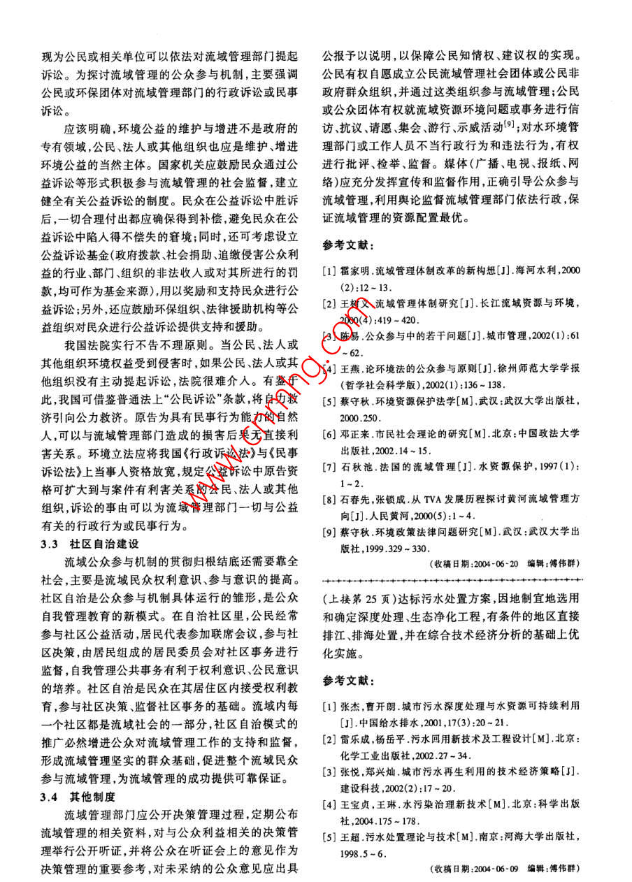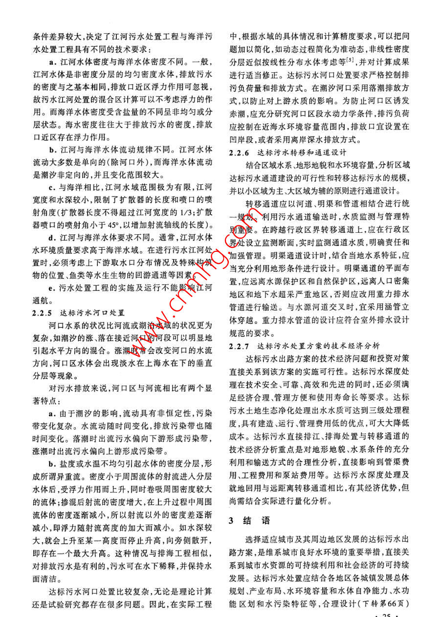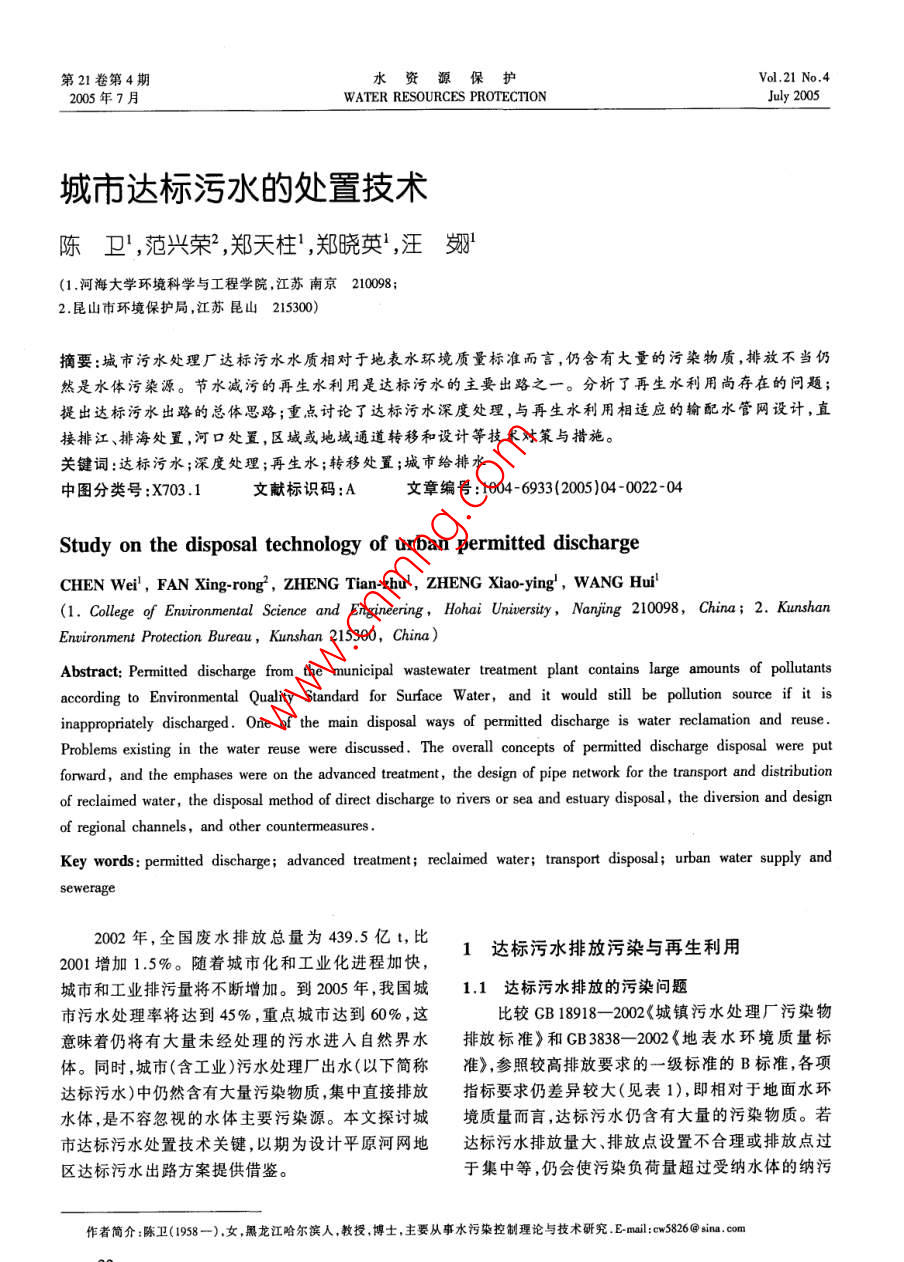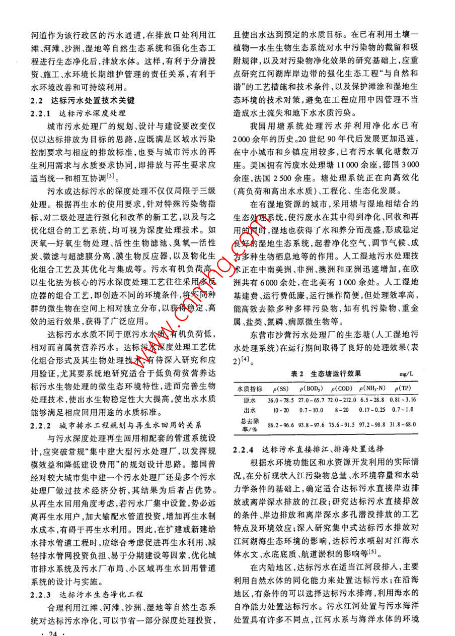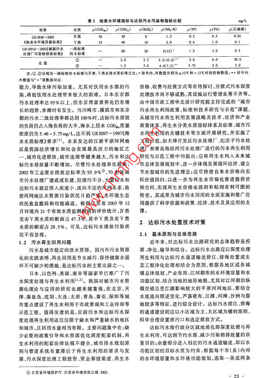 第21卷第4期水資源保護(hù)Vol.21 No.42005年7月WATER RESOURCES PROTECTIONJuly 2005城市達(dá)標(biāo)污水的處置技術(shù)陳衛(wèi)',范興榮2 ,鄭天柱' ,鄭曉英',汪歲別8(1.河海大學(xué)環(huán)境科學(xué)與工程學(xué)院,江蘇南京210098;2.昆山市環(huán)境保護(hù)局,江蘇昆山215300)摘要:城市污水處理廠達(dá)標(biāo)污水水質(zhì)相對(duì)于地表水環(huán)境質(zhì)量標(biāo)準(zhǔn)而言,仍含有大量的污染物質(zhì),排放不當(dāng)仍然是水體污染源。節(jié)水減污的再生水利用是達(dá)標(biāo)污水的主要出路之一。分析了再生水利用尚存在的問(wèn)題;提出達(dá)標(biāo)污水出路的總體思路;重點(diǎn)討論了達(dá)標(biāo)污水深度處理,與再生水利用相適應(yīng)的輸配水管網(wǎng)設(shè)計(jì),直接排江、排海處置,河口處置,區(qū)域或地城通道轉(zhuǎn)移和設(shè)計(jì)等技術(shù)對(duì)策與措施。關(guān)鍵詞:達(dá)標(biāo)污水;深度處理;再生水;轉(zhuǎn)移處置;城市給排水中圖分類號(hào):X703.1文獻(xiàn)標(biāo)識(shí)碼:A文章編號(hào):1004-6933(2005)04 -0022 -04Study on the disposal technology of urban permitted dischargeCHEN wei' , FAN Xing-rong', ZHENG Tian-zhu' , ZHENG Xiao-ying' , WANG Hui'(1. Clle of Enuironmental Science and Engineering, Hohai Uniersiy, Nanjing 210098, China; 2. KunshanEnironment Protection Bureau, Kunshan 215300,China)Abstract; Permitted discharge from the municipal wastewater treatment plant contains large amounts of pollutantsaccording to Environmental Quality Standard for Surface Water, and it would still be pollution source if it isinapproprately discharged. One of the main disposal ways of peited discharge is water reclamation and reuse.Problems existing in the water reuse were discussed. The overall concepts of permited discharge disposal were putforward, and the emphases were on the advanced treatment, the design of pipe network for the transport and distibutionof reclaimed water, the disposal method of direct discharge to rivers or sea and estuary disposal, the diversion and design :of regional channels , and other countermeasures.Key words: permitted discharge; advanced treatment; reclaimed water; transport disposal; urban water supply andsewerage2002年,全國(guó)廢水排放總量為439.5億t,比1達(dá)標(biāo)污水排放污染與再生利用2001增加1.5%。隨著城市化和工業(yè)化進(jìn)程加快,城市和工業(yè)排污量將不斷增加。到2005年,我國(guó)城1.1達(dá)標(biāo)污水排放的污染問(wèn)題市污水處理率將達(dá)到45% ,重點(diǎn)城市達(dá)到60%,這比較CB 18918- 2002《城鎮(zhèn)污水處理廠 污染物意味著仍將有大量未經(jīng)處理的污水進(jìn)入自然界水排放 標(biāo)準(zhǔn)》和CB3838- 2002《地表水環(huán)境 質(zhì)量標(biāo)體。同時(shí),城市(含工業(yè))污水處理廠出水(以下簡(jiǎn)稱準(zhǔn)》,參照較高排放要求的一級(jí)標(biāo)準(zhǔn)的B標(biāo)準(zhǔn),各項(xiàng)達(dá)標(biāo)污水)中仍然含有大量污染物質(zhì),集中直接排放指標(biāo)要求仍差異較大(見(jiàn)表1),即相對(duì)于地面水環(huán)水體,是不容忽視的水體主要污染源。本文探討城境質(zhì)量而言,達(dá)標(biāo)污水仍含有大量的污染物質(zhì)。若市達(dá)標(biāo)污水處置技術(shù)關(guān)鍵,以期為設(shè)計(jì)平原河網(wǎng)地達(dá)標(biāo)污水排放量大、排放點(diǎn)設(shè)置不合理或排放點(diǎn)過(guò)區(qū)達(dá)標(biāo)污水出路方案提供借鑒。于集中等,仍會(huì)使污染負(fù)荷量超過(guò)受納水體的納污作者簡(jiǎn)介:陳衛(wèi)(1958-).女,黑龍江哈爾濱人,教授,博士,主要從事水污染控制理論與技術(shù)研究. E mil:cw5826@ sina .com表1地表水環(huán)境指標(biāo)與達(dá)標(biāo)污水污染物指標(biāo)比較mg/L標(biāo)準(zhǔn)水質(zhì)p(C0Dmn)p(COD)p(BOD,) p(NH-N)p(TP)p(EN)p(石油類)CB3838-2002V類103061.50.30.50.01《地表水環(huán)境質(zhì)量標(biāo)準(zhǔn)》15402.00.4 :1.0CB 18918- 2002(城鎮(zhèn)污水 一級(jí)標(biāo)準(zhǔn)-602(8(15)3.0處理廠污染物排放標(biāo)準(zhǔn)》的 B標(biāo)準(zhǔn)3.35.3(10.0)5.06.050.0比值24.0(7.5)"3.75注:①.②分別為一- 級(jí)標(biāo)準(zhǔn)的B標(biāo)準(zhǔn)與IN類、V類水體水質(zhì)標(biāo)準(zhǔn)之比; *括號(hào)內(nèi)、外數(shù)值分別為≤12C和> 12C時(shí)的控制數(shù)值:**括號(hào)內(nèi)、外數(shù)值與"“?!绊?xiàng)數(shù)值對(duì)應(yīng).能力,導(dǎo)致水體污染加重。尤其對(duì)飲用水水源的污價(jià)格、收費(fèi)與經(jīng)營(yíng)方式等有待探討,分散式污水深度染,將給飲用水處理帶來(lái)極大的困難。日本東京都處理技術(shù)尚不夠成熟,其設(shè)施運(yùn)行管理良莠不齊等。污水處理率達(dá)9S%以上,但東京灣富營(yíng)養(yǎng)化仍有增由中國(guó)市政工程華北設(shè)計(jì)研究院主持完成的“城市長(zhǎng)的趨勢(shì),赤潮時(shí)有發(fā)生。當(dāng)川崎市、橫濱市和東京污水再生利用政策、標(biāo)準(zhǔn)和技術(shù)研究與示范”課題,都的污水二級(jí)處理率都達(dá)到100%時(shí),達(dá)標(biāo)污水排放從城市污水再生利用發(fā)展戰(zhàn)略及技術(shù)、經(jīng)濟(jì)和產(chǎn)業(yè)的負(fù)荷仍占人海負(fù)荷的大半,海水上層水CODmn質(zhì)量政策體系,再生水分類水質(zhì)指標(biāo)體系及標(biāo)準(zhǔn),城市污濃度仍為5.46 ~ 5.75 mg/L,達(dá)不到CB3097- -1997《海水再生利用的關(guān)鍵技術(shù)等方面開(kāi)展研究,