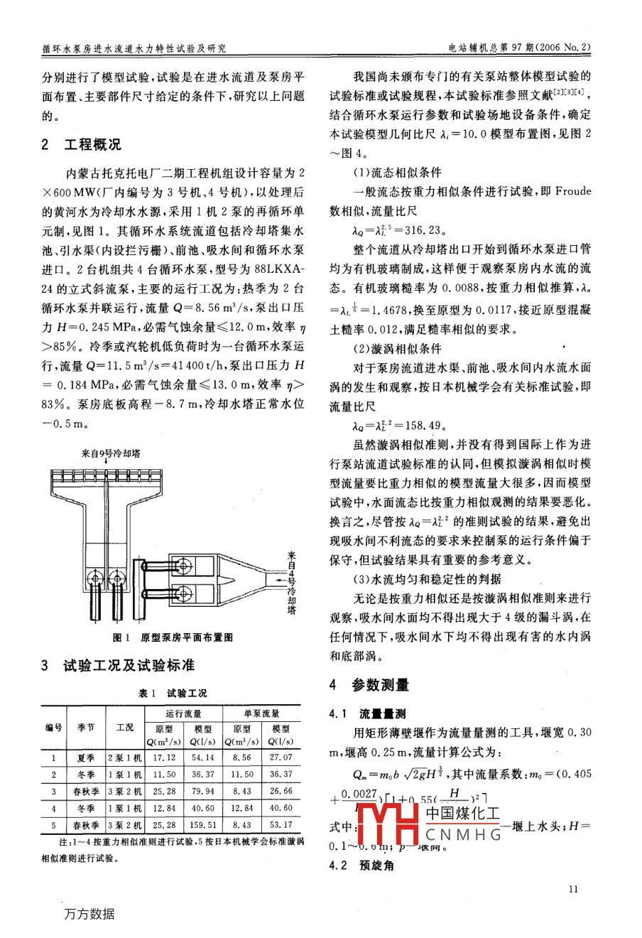 總第97期電站鋪機(jī)Vol, 972006年6月第2期Power Station A uxiliary EquipmentJune. 2006,No. 2文章編號(hào):1672-0210(2006)02 001004循環(huán)水泵房進(jìn)水流道水力特性試驗(yàn)及研究李書恒',王念慎2 ,鄭大瓊?(1.北京工業(yè)大學(xué),北京10044;2. 中國(guó)水利水電科學(xué)研究院,北京100038)商要:托克托電廠二期工程循環(huán)水泵房,因受場(chǎng)地限制,設(shè)計(jì)了兩種不同的流道型式,其中3號(hào)機(jī)進(jìn)水前池的底坡設(shè)計(jì)為23.7° ,大于規(guī)范要求的底坡不宜陡于1 : 4,對(duì)這兩種流道的模型試驗(yàn)結(jié)果表明,在7 m以上水深時(shí),3號(hào)機(jī)循環(huán)水泵能正常運(yùn)行,但4號(hào)機(jī)進(jìn)水流道流態(tài)及各項(xiàng)性能指標(biāo)要明顯優(yōu)于3號(hào)機(jī)。由于4號(hào)機(jī)進(jìn)水流道設(shè)計(jì)非常合理,對(duì)類似工程具有一定的借鑒作用。關(guān)鍵詞:循環(huán)水泵;進(jìn)水流道;流態(tài);漩渦;預(yù)旋角;深度中圖分類號(hào):TH31文獻(xiàn)標(biāo)識(shí)碼:AHydraulic Characteristic Test and Study on CirculatingWater Pump Station of Tuoketuo Thermal PlantLI Shuheng',W ANG Nianshen',ZHENG Daqiong*(1. Beijing Polytechnic University , Bejing 100044 ,China;2. China Institute of Water Resources and Hydropower Research , Beijing 100038 ,China)Abstract: Two different water inlet conduits are designed due to limitary space in circulating water pump station ofTuoketuo Thermal Plant. Base slope of 3# unit inlet forebay is designed 23. 7°, which surpasses the standard thatrequires base slope not steeper than 1:4. During model tests on two water inlet conduits, the results show thatcirculating water pumpof 3# unit can work normally in 7m water depth above and 4 # unit's inlet conduit flowpattern and other performance index are obviously better than those of 3# unit, which is worthful to similiar projectbecause the design of 4 # unit's inlet conduit is very reasonable.Key words:circulating water pump; inlet conduit;flow pattern; vortex;pre swirl angle; minimum submergence depth得到充分發(fā)揮。同時(shí),進(jìn)水流道形式的選擇又直接影1問題的提出響到整個(gè)泵站的投資大小和施工難度。循環(huán)水泵是火電廠最重要的輔機(jī)之一,對(duì)電廠的內(nèi)蒙古托克托電廠二期工程循環(huán)水泵房,因受安全運(yùn)行起著十分關(guān)鍵的作用。而循環(huán)水泵站進(jìn)水場(chǎng)地限制,設(shè)計(jì)了兩種不同的流道型式,其中3號(hào)機(jī)流道形式的合理選擇和設(shè)計(jì),直接關(guān)系到流道內(nèi)水頭循環(huán)水泵房進(jìn)水前池的底坡設(shè)計(jì)為23. 7°,大于泵損失的大小和流態(tài)的好壞,對(duì)循環(huán)水泵的安全和高效站設(shè)計(jì)規(guī)范要求的正向進(jìn)水的前池底坡不宜陡于運(yùn)行,起著非常重要的作用。優(yōu)化的進(jìn)水流道形式應(yīng)1:4(即14.04)。為了驗(yàn)證流道內(nèi)水流能否滿足該盡可能的減少吸水間內(nèi)部的水力損失,盡可能的消設(shè)計(jì)中國(guó)煤化工以及水泵能否安全除吸水間內(nèi)部的各種漩渦,能使循環(huán)水泵的水力性能穩(wěn)定究院對(duì)這兩種流道TYHCNMHG收稿8期:2005-06-06作者簡(jiǎn)介:李書恒(1976-),北京工業(yè)大學(xué),水利水電工程專業(yè),碩士研究生。1循環(huán)水泵房進(jìn)水流道水力特性試驗(yàn)及研究電站輔機(jī)總第97期(2006 No. 2)分別進(jìn)行了模型試驗(yàn),試驗(yàn)是在進(jìn)水流道及泵房平我國(guó)尚未頒布專門的有關(guān)泵站整體模型試驗(yàn)的面布置.主要部件尺寸給定的條件下,研究以上問題試驗(yàn)標(biāo)準(zhǔn)或試驗(yàn)規(guī)程,本試驗(yàn)標(biāo)準(zhǔn)參照文獻(xiàn)3E8IL0,的。結(jié)合循環(huán)水泵運(yùn)行參數(shù)和試驗(yàn)場(chǎng)地設(shè)備條件,確定本試驗(yàn)?zāi)P蛶缀伪瘸擀?= 10.0模型布置圖,見圖22工程概況,~圖4。內(nèi)蒙古托克托電廠二期工程機(jī)組設(shè)計(jì)容量為2(1)流態(tài)相似條件X 600 MW(廠內(nèi)編號(hào)為3號(hào)機(jī)、4號(hào)機(jī)),以處理后一般流態(tài)按重力相似條件進(jìn)行試驗(yàn),即Froude的黃河水為冷卻水水源,采用1機(jī)2泵的再循環(huán)單數(shù)相似,流量比尺元制,見圖1。其循環(huán)水系統(tǒng)流道包括冷卻塔集水λo=λ:°=316.23。池、引水渠(內(nèi)設(shè)攔污柵)、前池、吸水間和循環(huán)水泵整個(gè)流道從冷卻塔出口開始到循環(huán)水泵進(jìn)口管進(jìn)口。2臺(tái)機(jī)組共4臺(tái)循環(huán)水泵,型號(hào)為88LKXA-均為有機(jī)玻璃制成,這樣便于觀察泵房?jī)?nèi)水流的流24的立式斜流泵,主要的運(yùn)行工況為:熱季為2臺(tái)態(tài)。有機(jī)玻璃糙率為0. 0088,按重力相似推算,入。循環(huán)水泵并聯(lián)運(yùn)行,流量Q= 8.56m*/s,泵出口壓=x.+=1. 4678,換至原型為0. 0117 ,接近原型混凝力H=0. 245 MPa,必需氣蝕余量≤12.0m,效率η土糙率0.012,滿足糙率相似的要求。> 85%。冷季或汽輪機(jī)低負(fù)荷時(shí)為一臺(tái)循環(huán)水泵運(yùn)(2)漩渦相似條件行,流量Q=11.5m*/s=41 400t/h,泵出口壓力H對(duì)于泵房流道進(jìn)水渠、前池、吸水間內(nèi)水流水面= 0. 184 MPa,必需氣蝕余量≤13.0 m,效率n>渦的發(fā)生和觀察,按日本機(jī)械學(xué)會(huì)有關(guān)標(biāo)準(zhǔn)試驗(yàn),即83%。泵房底板高程-8. 7m,冷卻水塔正常水位流量比尺-0.5m。.λo=λξ2= 158.49。雖然漩渦相似準(zhǔn)則,并沒有得