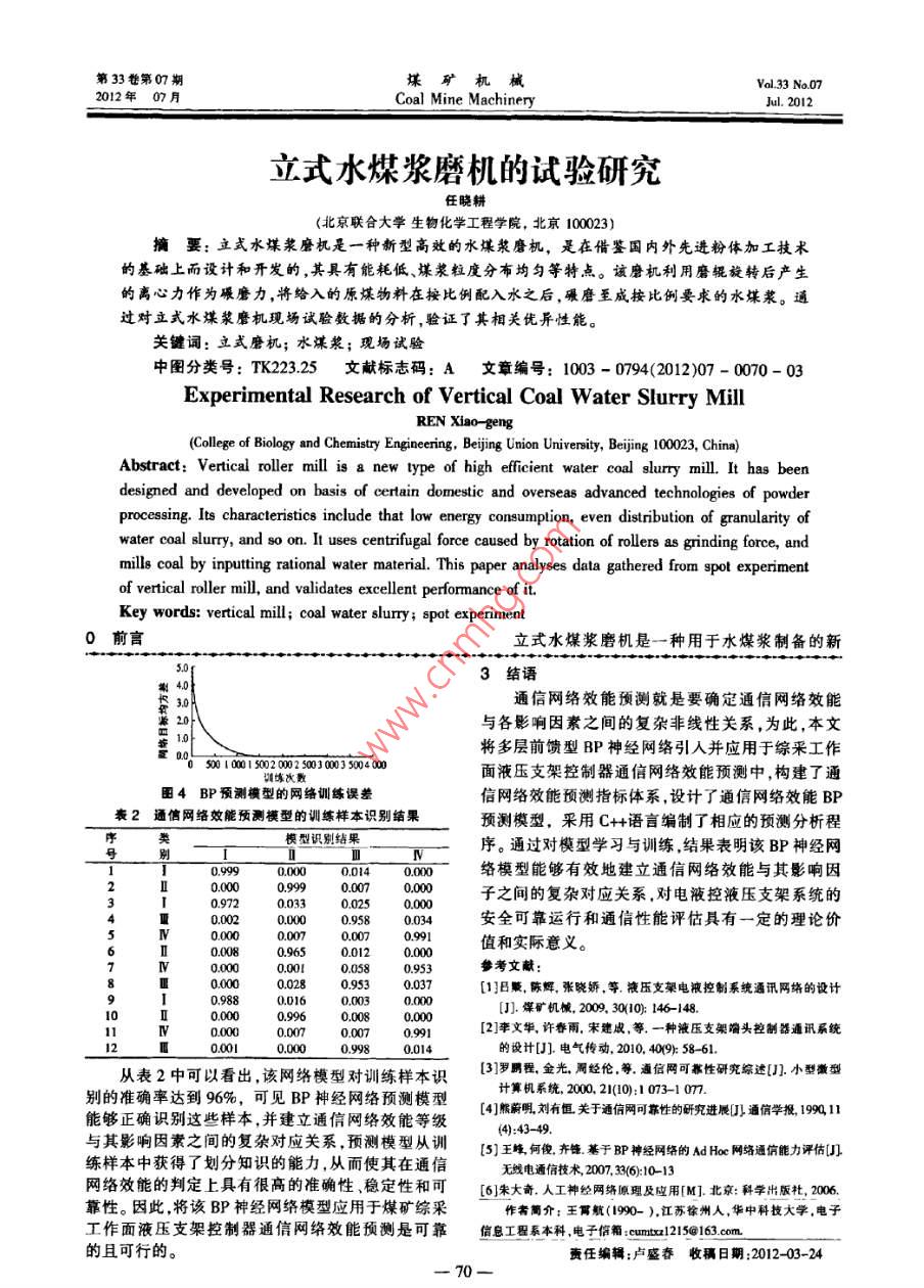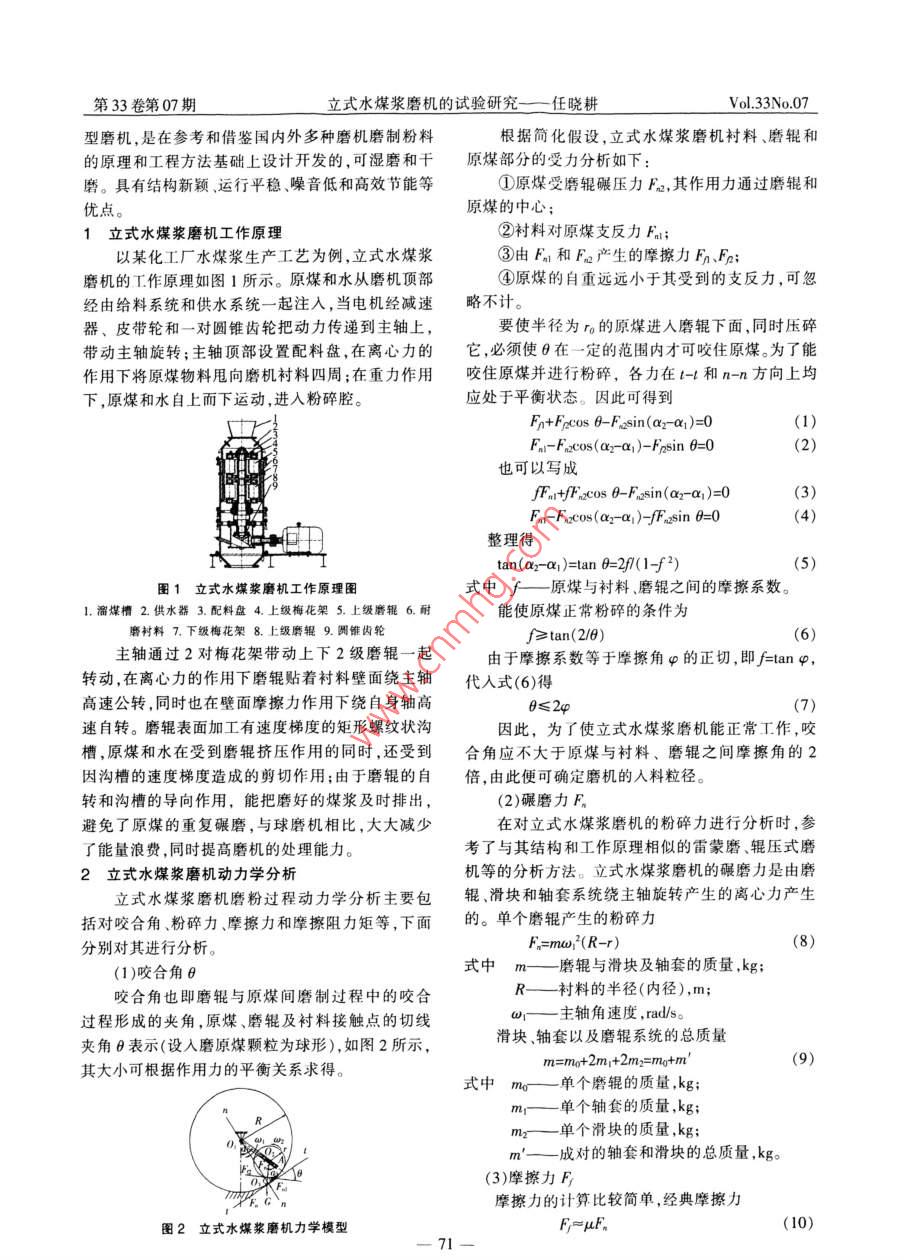 第33卷第0期煤礦機(jī)械33 Nol2012年0)月Coal Mine Machinery立式水煤漿磨機(jī)的試驗研究任曉耕(北京聯(lián)合大學(xué)生物化學(xué)工程學(xué)院,北京100023)摘要:立式水煤漿磨機(jī)是一種新型高效的水煤漿磨機(jī),是在借鑒國內(nèi)外先進(jìn)粉體加工技術(shù)的基礎(chǔ)上而設(shè)計和開發(fā)的,其具有能耗低、煤漿粒度分布均勻等特點。該磨機(jī)利用磨輥旋轉(zhuǎn)后產(chǎn)生的離心力作為嘬磨力,將給入的原煤物料在按比例配入水之后,碾磨至成按比例要求的水煤漿。通過對立式水煤漿磨機(jī)現(xiàn)場試驗數(shù)據(jù)的分析,驗證了其相關(guān)優(yōu)異性能。關(guān)鍵詞:立式磨機(jī);水煤漿;現(xiàn)場試驗中圖分類號:TK22325文獻(xiàn)標(biāo)志碼:A文章編號:1003-0794(2012)07-0070-03Experimental Research of Vertical Coal Water Slurry MillREN Xiao-gengCollege of Biology and Chemistry Engineering, Beijing Union University, Beijing 100023, China)Abstract: Vertical roller mill is a new type of high efficient water coal slurry mill. It has beendesigned and developed on basis of certain domestic and overseas advanced technologies of powderprocessing. Its characteristics include that low energy consumption, even distribution of granularity ofwater coal slurry, and so on. It uses centrifugal force caused by rotation of rollers as grinding force, andof vertical roller mill, and validates excellent peformance al i ses data gathered from spot experimentKey words: vertical mill; coal water slurry; spot experiment0前言立式水煤漿磨機(jī)是一種用于水煤漿制備的新3結(jié)語通信網(wǎng)絡(luò)效能預(yù)測就是要確定通信網(wǎng)絡(luò)效能與各影響因素之間的復(fù)雜非線性關(guān)系,為此,本文將多層前饋型BP神經(jīng)網(wǎng)絡(luò)引入并應(yīng)用于綜采工作05001001500500300035004面液壓支架控制器通信網(wǎng)絡(luò)效能預(yù)測中,構(gòu)建了通田4BP預(yù)測橫型的網(wǎng)絡(luò)訓(xùn)練誤差信網(wǎng)絡(luò)效能預(yù)測指標(biāo)體系,設(shè)計了通信網(wǎng)絡(luò)效能BP表2通信網(wǎng)絡(luò)效能預(yù)測模型的訓(xùn)練樣本識別結(jié)果預(yù)測模型,采用C+語言編制了相應(yīng)的預(yù)測分析程模型識別結(jié)果序。通過對模型學(xué)習(xí)與訓(xùn)練,結(jié)果表明該BP神經(jīng)網(wǎng)0000014000絡(luò)模型能夠有效地建立通信網(wǎng)絡(luò)效能與其影響因200000.999000700000033子之間的復(fù)雜對應(yīng)關(guān)系,對電液控液壓支架系統(tǒng)的安全可靠運行和通信性能評估具有一定的理論價0965值和實際意義0953參考文獻(xiàn):0953[1B販,陳輝,張曉嬌,等.液壓支架電液控制系統(tǒng)通訊網(wǎng)絡(luò)的設(shè)計J,煤礦機(jī),2009,3010);146-14800000070912]李文華許春雨宋建成等,一種液壓支架端頭控制器通訊系統(tǒng)的設(shè)計[電氣傳動,2010,409%58-61從表2中可以看出,該網(wǎng)絡(luò)模型對訓(xùn)練樣本識[3]羅鵬程金光周經(jīng)倫等,通信網(wǎng)可都性研究綜述[.小型徽型計算機(jī)系統(tǒng),20021(10):1073-10m別的準(zhǔn)確率達(dá)到96%,可見BP神經(jīng)網(wǎng)絡(luò)預(yù)測模型[4熊蔚明劉有恒關(guān)于通信網(wǎng)可靠性的研究進(jìn)展通信學(xué)報199l能夠正確識別這些樣本,并建立通信網(wǎng)絡(luò)效能等級與其影響因素之間的復(fù)雜對應(yīng)關(guān)系預(yù)測模型從訓(xùn)(5)王堆何痄值基于B棒經(jīng)網(wǎng)的AH網(wǎng)絡(luò)通你能力評估門練樣本中獲得了劃分知識的能力,從而使其在通信無線電迺信技術(shù)2007,3(6:10-13網(wǎng)絡(luò)效能的判定上具有很高的準(zhǔn)確性、穩(wěn)定性和可[6朱大奇人工神經(jīng)網(wǎng)絡(luò)原理及應(yīng)用(M1北京:科學(xué)出版,200靠性。因此,將該BP神經(jīng)網(wǎng)絡(luò)模型應(yīng)用于煤礦綜采作者簡介;王霄航(1990)江蘇徐州人,華中科技大學(xué),電子工作面液壓支架控制器通信網(wǎng)絡(luò)效能預(yù)測是可靠信息工程系本科,電子信箱: curtal2l5163cm的且可行的。責(zé)任編輯:盧盛春收稿日期:201第33卷第07期立式水煤漿磨機(jī)的試驗研究——一任曉耕Vol 33 No 0型磨機(jī),是在參考和借鑒國內(nèi)外多種磨機(jī)磨制粉料根據(jù)簡化假設(shè),立式水煤漿磨機(jī)襯料、磨輥和的原理和工程方法基礎(chǔ)上設(shè)計開發(fā)的,可濕磨和干原煤部分的受力分析如下:磨。具有結(jié)構(gòu)新穎、運行平穩(wěn)、噪音低和高效節(jié)能等①原煤受磨輥碾壓力F,其作用力通過磨輥和優(yōu)點。原煤的中心;1立式水煤漿磨機(jī)工作原理②襯料對原煤支反力Fa;以某化工廠水煤漿生產(chǎn)工藝為例,立式水煤漿③由Fn和F產(chǎn)生的摩擦力Fn、F;磨機(jī)的工作原理如圖1所示。原煤和水從磨機(jī)頂部④原煤的自重遠(yuǎn)遠(yuǎn)小于其受到的支反力,可忽經(jīng)由給料系統(tǒng)和供水系統(tǒng)一起注入,當(dāng)電機(jī)經(jīng)減速略不計。器、皮帶輪和一對圓錐齒輪把動力傳遞到主軸上,要使半徑為r的原煤進(jìn)入磨輥下面,同時壓碎帶動主軸旋轉(zhuǎn);主軸頂部設(shè)置配料盤,在離心力的它,必須使θ在一定的范圍內(nèi)才可咬住原煤。為了能作用下將原煤物料甩向磨機(jī)襯料四周;在重力作用咬住原煤并進(jìn)行粉碎,各力在t-和n-n方向上均下,原煤和水自上而下運動,進(jìn)入粉碎腔。應(yīng)處于平衡狀態(tài)。因此可得到Fnl-Fncos(ar-a,)-Frsin 6=0也可以寫