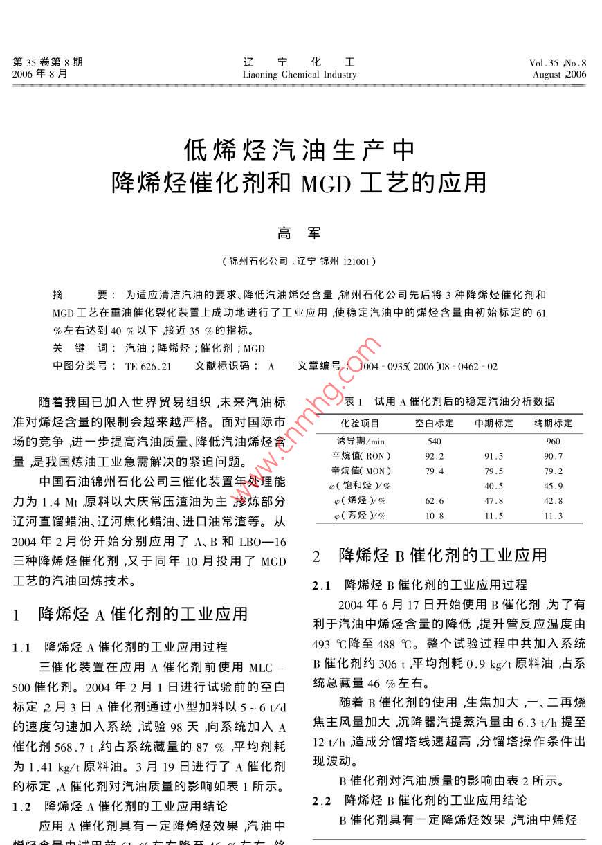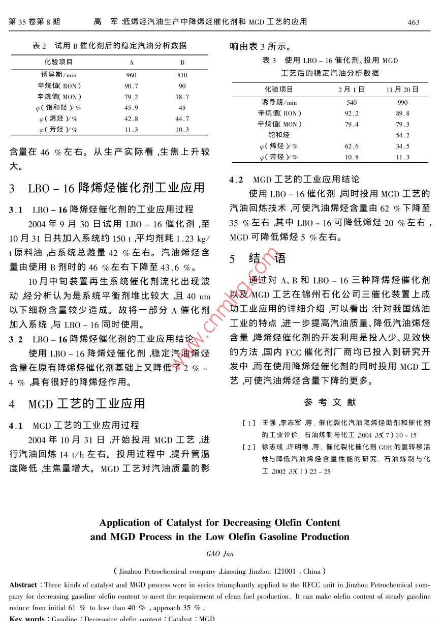 低烯烴汽油生產(chǎn)中降烯烴催化劑和MGD工藝的應(yīng)用