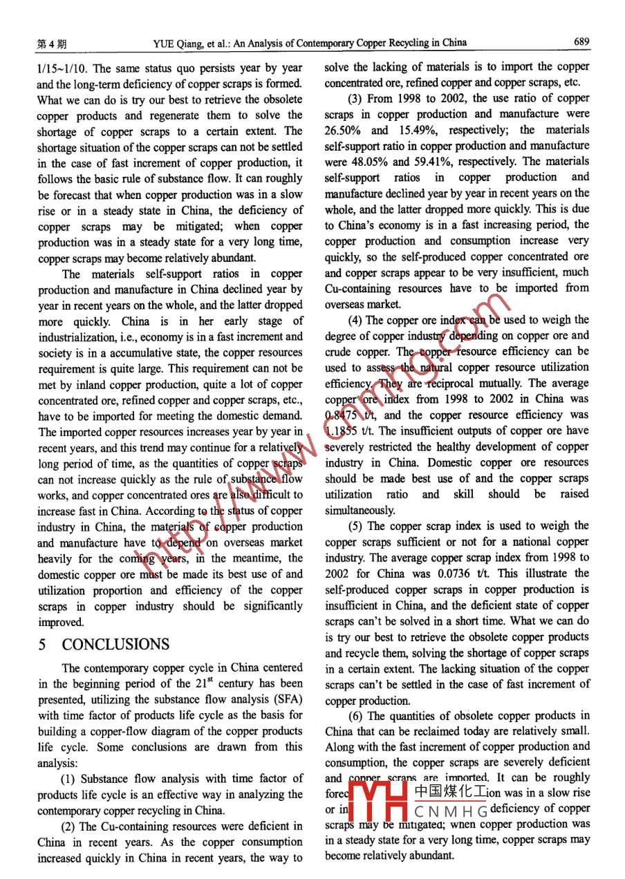 第6卷第4期過程工程學(xué)報Vol.6 No.42006年8月The Chinese Journal of Process EngineeringAug. 2006An Analysis of Contemporary Copper Recycling in ChinaYUE Qiang(岳強(qiáng)),LU Zhong-wu(陸鐘武)(SEPA Key Laboratory on Eco-Industry, Northeastern Universit, Shenyang, Liaoning 10004, China)Abstract: Copper consumption increased very quickly in China in recent years, which could not be met by inland copperindustry. In order to achieve a sustainable development of copper industry, an analysis of copper recycling in China wasnecessary. For the life cycle of copper products a copper-flow diagram with time factor was worked out and the contemporarycopper recycling in China was analyzed, ftom which the following data were obtained. The average life cycle of copperproducts was 30 years. From 1998 to 2002, the use ratio of copper scraps in copper production, the use ratio of copper scrapsin copper manufacture, the materials self-support ratio in copper production, and the materials self-support ratio in coppermanufacture were 26.50%, 15.49%, 48.05% and 59. 41%, respectively. The materials self-support ratios in copper productionand manufacture declined year by year in recent years on the whole, and the ltter dropped more quickly. The average indexof copper ore and copper scrap from 1998 to 2002 were 0.8475 t and 0.0736 t respectively, and copper resource eficiencywas 1.1855 Ut. Some efforts should be paid to reduce copper ores consumption and promote copper scraps regeneration.Copper scraps were mostly imported from foreign countries because of shortage in recent years in China. Here the reasonsrelated to copper scraps deficiency were also demonstrated. But we can forecast: when copper production was in a slow riseor in a steady state in China, the deficiency of copper scraps may be mitigated; when copper production was in a steady statefor a very long time, copper scraps may become relatively abundant. According to the status of copper industry in China, theraw materials of copper production and manufacture have to depend on oversea markets heavily in recent years, and at thesame time, the copper scraps using proportion and eficiency in copper industry should be improved.Key words: copper scrap; copper recycling; copper-flow diagram of the life cycle of copper products; self-support ratio;copper ore index; copper scrap index; copper resource eficiencyCLC No.: TF811Document Code: AArticle ID: 1009- 606X(2006)04 -0683-081 INTRODUCTIONcopper ore resources is as follows: reserves arerelatively abundant, but mostly in low grades; copper1.1 Backgroundores are dfficult for mining and milling; the reserve perCopper is an important basic material and widelycapita is deficient'. As a developing country,used in many fields, such as electricity, light industry,consumption of copper ores in China increased moreindustrial machinery,electronics, transportation,quickly than those in developed countries. Comparedcommunication and national defense, etc. The demandwith the demand, the supply of copper ores was severelyfor copper increased quickly in China in recent yearsin shortage and the self-support ratio of copper ores waswith the rapid development of economy, as indicated inonly about 50%. In the early stage of the 21st century,Table 1. China has become the largest country in copperthe condition of copper ore was austere. So theconsumption since 2002. Along with the rapidregeneration of copper scraps has an importantincrement of consumption, copper production in Chinasignifcance for the copper industry in China. Firstly,can not meet the demand, and the gap has to be filled byusing of copper scraps can reduce the consumption ofoversea markets.non-renewable resources- copper ores, and secondly, itThe reserves of copper ores in China are proved incan reduce consumption of energy and decreasethe fourth place throughout the world. The status quo ofenvironmental pollution.Table 1 Production and consumption of refined copper in China in 1995~2002 (x10*t)Year1995 1996 1997 1998 1 9992000 2001 2002 Increasing rate (%)Production107.97 11919 1l 794121.13 117.42 137.11 152.33 163.256.08Cosumption 114.70 119.27 126.97 140.22 148.42 192.81 230.73. 268.4412.92%Note: The data come from China Noferrous Metals Industy Yearbook (1996中國煤化工TYHCNMHGReceived date: 2005- -10- -18; Accepted date: 2006 -04 -08Foundato ti spre Key TccloierD‘Ce Pogamme (No 203A614A-42)Biography: YUE Qiang(1975-), male, native of Anshan City, Liaoning Province, Ph.D, lecturer, major in material flow analysis.684過程工程學(xué)報第6卷,An analysis of contemporary copper recycling ofin this paper, such as Kapur et al.5J on Asian copperChina is very useful in finding the recycling status quo cycle, Spatari et al.4 on European copper cycle, andof copper scraps in copper industry in China, which canlan Beers et al.sl on African copper cycle; Most ofhelp to attain the savings of Cu-containing resourcesthem are the components of the Stocks and Flowsand achieve a sustainable development in the industry.(STAF) Project of the Center for Industrial Ecology at1.2 The Investigative Status Quo of CopperYale University, which seeks a comprehensiveRecycling in China and Abroadaccounting of the anthropogenic mobilization of copperThe method of substance flow analysis is used inand other metals in the industrial economy; and worksanalyzing copper recycling in the present work.of Ayresl2.0), Graedel and Allenby", Kleijn, HansenSubstance flow analysis (SFA) is an effective tool fornd Lassen on theory and practice in general. It isstudying the industrial metabolism of specificclear that in developed countries the method of SFA hassubstances (e.g. copper, aluminum) in a certain spatial been shaped, and a wealth of experience accumulated.scale, for example, in the scale of a nation, a region or aCopper flow analysis in China was lacking and fewfirm. Industrial metabolism means the whole integratedpapers were published on it. There are only so