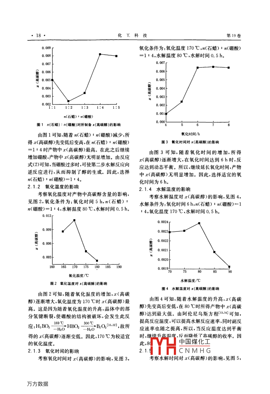 化工科技,2011, 19(1):17~20科研開發(fā)SCIENCE & TECHNOLOGY IN CHEMICAL INDUSTRY高碳醇的合成*張爽',龍小柱'”*,李 妍',尤明明',王晨曦',周 揚(yáng)(1. 沈陽化工大學(xué)化學(xué)工程學(xué)院,遼寧沈陽110142;2.遼河油田曙光工程技術(shù)處,遼寧盤錦124109)摘要:首次選用 石蠟、硼酸為原料,通過液相氧化反應(yīng)合成硼酸酯,再與氫氧化鈉發(fā)生水解反應(yīng)制得高碳醇。應(yīng)用紅外定量分析原理對(duì)其含量進(jìn)行分析。得到制備高碳醇的較優(yōu)工藝條件:n(石蠟) ;n(硼酸)=1: 4,氧化時(shí)間為6h,氧化溫度為170C,水解溫度為80C,水解時(shí)間為1h。產(chǎn)物收率約為12. 7%。關(guān)鍵詞:石蠟;硼酸;液相氧化;水解;高碳醇中圖分類號(hào): TQ223. 12+9文獻(xiàn)標(biāo)識(shí)碼: A文章編號(hào): 1008-0511(2011)01-0017-04高碳醇是指6個(gè)碳原子以上的一-元醇,一般以定 ,一段時(shí)間后,停止反應(yīng),得到中間產(chǎn)物。冷卻蠟酯的形式存在。其常被用于合成表面活性劑、增至室溫,向燒瓶中加入一定量質(zhì)量分?jǐn)?shù)5%的氫塑劑.洗滌劑等精細(xì)化工產(chǎn)品的基礎(chǔ)原料,并廣泛氧化鈉溶液,在一-定溫度下加熱水解,得到粗高碳應(yīng)用于石油化工、機(jī)械采礦、建筑冶金、造紙、食品、醇混合物。醫(yī)藥衛(wèi)生、日用化工以及農(nóng)業(yè)生產(chǎn)等領(lǐng)域。[1~4]將反應(yīng)所得產(chǎn)物轉(zhuǎn)人250 mL分液漏斗中,目前國內(nèi)外生產(chǎn)高碳醇的方法- -般分 為化學(xué)加人熱的去離子水,攪拌、靜置分離出水層,保留合成法[5.63及天然提取法[1,8]。然而,近十余年上層油狀物,重復(fù)此操作直至水層pH值為中性。來,合成高碳醇的報(bào)道較少。有人運(yùn)用石蠟催化將所得粗產(chǎn)物轉(zhuǎn)入三口瓶中,加入適量甲苯溶液,氧化法制高碳醇[.9],此方法由于加入催化劑,造減壓蒸餾直至水量無明顯變化后,再將產(chǎn)物置于成最終產(chǎn)物提純困難。本實(shí)驗(yàn)第一次利用固體石真空干燥箱,烘干至恒重。反應(yīng)方程式見式(1)、蠟與硼酸反應(yīng)生成酯,而后進(jìn)行水解反應(yīng)合成高式(2)。碳醇的新工藝,副產(chǎn)物硼酸通過水洗比較容易除C.Hz+2+H,BO.+O2二C-1H2m-1去。此方案工藝簡單,原料來源豐富,無污染,并COBO3 +H2O能達(dá)到環(huán)境經(jīng)濟(jì)雙贏的目的。Cr-1 H2m-1 COBO3 + H2O一NaOH2 H,BO3 +1實(shí)驗(yàn)部分Cn-1 H2n-1CH2OH(2)1.3 產(chǎn)物表征及含量分析.1 原料切片石蠟(60~62),硼酸:分析純,國藥集團(tuán)用NEXUS 470傅立葉變換紅外光譜儀對(duì)合上海化學(xué)試劑有限公司;氫氧化鈉,甲苯:分析純,成的高碳醇進(jìn)行分析,再利用紅外定量分析原理[I]對(duì)所合成的產(chǎn)品進(jìn)行定性和定量分析。沈陽新興試劑廠。.2 高碳醇的合成方法2結(jié)果與討論將適量的石蠟、硼酸加人到帶電動(dòng)攪拌、冷凝2.1 單因素實(shí)驗(yàn)結(jié)果管和溫度計(jì)的三口瓶中,攪拌并控制反應(yīng)溫度恒2.1.1 n(石蠟) : n(硼酸)對(duì)產(chǎn)物中x(高碳醇)收稿日期:2010-09-28作者簡介:張爽(1986-).女 .遼寧新民人,沈陽化工大中國煤化工對(duì)x(高碳醇)學(xué)在讀碩士,從事精細(xì)化工類研究。當(dāng)通訊聯(lián)系人,的影MHCNMHG媼度180C,氧*基金項(xiàng)目:遼寧省教育廳高等學(xué)??茖W(xué)研究基金項(xiàng)目化時(shí)間5 h,水解溫度80 C,水解時(shí)間0.5 h。(2009A591)。化T科技第19卷18●0.009 r氧化條件為:氧化溫度170 C,m(石蠟) : n(硼酸)=1 : 4,水解溫度80 C,水解時(shí)間0.5h.0.008 |0.0070. 06全0.000.005電0.005”0.0040.0030.0021:2 1:3 1:4 1:s0.0010m(石蠟) | n(碉酸)0.000吉6十8圈1 n(石端): n(硼酸)對(duì)所制備x(高碳醇)的影響氧化時(shí)間/h由圖1可知,隨著m(石蠟) : n(硼酸)減少,所得x(高碳醇)先變低后變高,在m(石蠟) : m(硼酸)團(tuán)3氧化時(shí)間對(duì) x(高碳醇)的影響=1:4時(shí)產(chǎn)物中x(高碳醇)最高。在此之后繼續(xù)由圖3可知,隨著氧化時(shí)間的增加,所得增加硼酸,產(chǎn)物中x(高碳醇)無明顯增加。由反應(yīng)x(高碳醇)逐漸增大,在氧化時(shí)間達(dá)到6 h時(shí),反式(2)可知,當(dāng)硼酸過多時(shí),可使第二步水解反應(yīng)向應(yīng)達(dá)到動(dòng)態(tài)平衡。所以,繼續(xù)延長氧化時(shí)間,產(chǎn)物逆反應(yīng)進(jìn)行,從而抑制了醇的生成。因此,選擇中x(高碳醇)無明顯增加。因此,選擇適宜的氧n(石蠟) : n(硼酸)=1*4.化時(shí)間為6 h.2.1.2氧化溫 度的影響2.1.4 水解溫度的影響.考察氧化溫度對(duì)產(chǎn)物中高碳醇含量的影響,考察水解溫度對(duì)x(高碳醇)的影響,見圖4,見圖2,氧化條件為:氧化時(shí)間5 h,n(石蠟) :水解條件為:氧化時(shí)間6 h,n(石蠟) : n(硼酸)=1n(硼酸)=1; 4,水解溫度80 C,水解時(shí)間0.5h.: 4,氧化溫度170 C,水解時(shí)間0.5h.0.012r0. 00240.0090.00230.000.00210. 00300. 00201601651701751801851900. 001979085氧化溫度/C水解溫度/C圈2氧化溫度對(duì)x(高碳醇)的影響團(tuán)4水解溫度對(duì)x(離碳醇)的影響由圖2可知,隨著氧化溫度的增加,x(高碳由圖4可知,隨著水解溫度的升高,x(高碳醇)逐漸增大,氧化溫度為170 C時(shí)x(高碳醇)最醇)先變高后變低,在80 C時(shí)所得產(chǎn)物中x(高碳高。這是因?yàn)殡S著氧化溫度的升高,晶體中的部醇)達(dá)到最大值。由阿倫尼烏斯方程(13.40可知,分氫鍵斷裂,使矚酸的結(jié)構(gòu)被破壞,會(huì)發(fā)生此反提高反應(yīng)溫