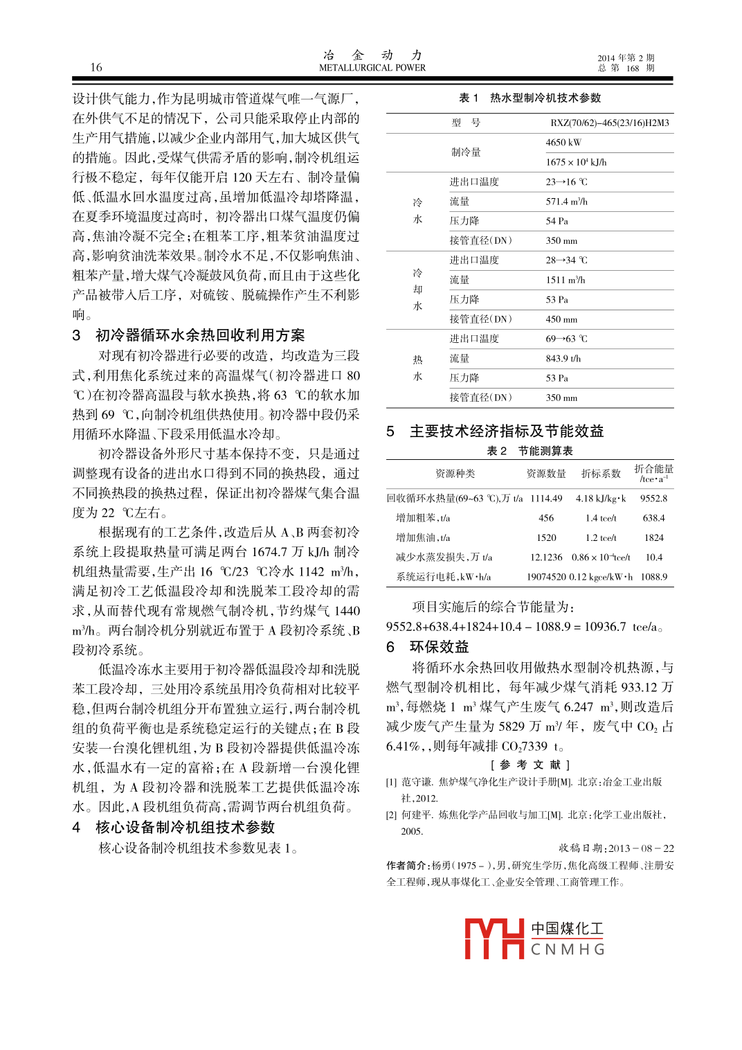 2014年第2期冶金動力METALLURGICAL POWER初冷器循環(huán)水余熱的回收利用楊勇…2,張丕祥1,張瓊芳(1.云南煤業(yè)能源股份有限公司;2.昆明焦化制氣有限公司,云南昆明650211)【摘要】分析了煤氣冷凝鼓風系統(tǒng)橫管初冷器生產(chǎn)現(xiàn)狀和煤氣凈化過程中所需冷卻水供給情況,結(jié)合熱源和用冷需求情況,對初冷器進行適當改造,將初冷器上段高溫循環(huán)水作為溴化鋰吸收式熱水型制冷機組熱源,回收生產(chǎn)余熱,實現(xiàn)能源的二次開發(fā)和利用,具有較好的經(jīng)濟效益和社會環(huán)保效益【關鍵詞】循環(huán)水余熱;回收;利用【中圖分類號】TK018【文獻標識碼】B【文章編號】1006-6764(2014)02-0015-02Recovery of Waste Heat from the Circulating Water of Primary CoolerYANG Yong", ZhANG Pixiang, ZhANG Qiongfang( Yunnan Coal Energy Co, Ltd. 2. Kunming Coking Gas Co, Ltd, Kunming, Yunnan 650211, China[Abstract] The current production situation of the horizontal-pipe primary cooler in thegas condensate blast system and the state of cooling water supply for gas purification processwere analyzed. The primary cooler was transformed based on the actual condition of heatsource and cooling water demand. The high-temperature circulating water in the upper sectionof the primary cooler was used as the heat source of lithium bromide absorption chiller to reino production waste heat and realize secondary energy development and utilization, achiev-ing good economic, social and environmental effectI Key words waste heat in circulating water; recovery; utilization1前言固焦爐,A段冷鼓有兩段式橫管初冷器4臺,每臺總余熱是工業(yè)企業(yè)生產(chǎn)過程中,由各種換熱設備、換熱面積為2300m2,I段供低溫水,Ⅱ段供循環(huán)用能設備和化學反應設備中產(chǎn)生而未被利用的熱能水,煤氣冷卻量30400m3h;B段有3套初冷器,每資源,其數(shù)量十分可觀,據(jù)統(tǒng)計,我國工業(yè)熱資源的臺總換熱面積為3225m2,其中I段供低溫水,Ⅱ段回收率僅達335%,有2乃3尚未利用。在煤氣初冷器供循環(huán)水段(實際包括兩段,實為三段型),煤氣冷卻的上段存在較高溫度的冷卻水,這部分冷卻循環(huán)水量30600m/h經(jīng)與80℃左右的煤氣換熱后,送往涼水架強制冷初冷器煤氣進口溫度為80℃,要求出初冷器卻降溫后,又返回初冷器上段循環(huán)使用,既額外消耗煤氣溫度為23℃。煤氣與循環(huán)水在初冷器經(jīng)間接電力資源,且水蒸發(fā)損耗大,同時大量低品位熱源被換熱初冷后,一是使煤氣冷卻、焦油氣和水蒸汽冷白白浪費。采用熱水型溴化鋰吸收式制冷機組,將循凝,減少氣體體積從而減少輸送煤氣的動力消耗,同環(huán)水余熱轉(zhuǎn)化成生產(chǎn)所需的低溫水,實現(xiàn)能源的二時使煤氣中的焦油和萘在低溫冷凝下來,得到焦油次開發(fā)和利用,不僅節(jié)約煤氣資源,而且足夠量的低和萘,為后工序煤氣的凈化創(chuàng)造條件。溫水能穩(wěn)定生產(chǎn)系統(tǒng)工藝技術(shù)指標,有利于生產(chǎn)操22目前生產(chǎn)用冷需求及制冷系統(tǒng)情況作的同時還能提高化學產(chǎn)品的回收率,產(chǎn)生附加經(jīng)昆明焦化制氣有限公司共有三處用冷需求:A濟效益,實現(xiàn)一舉多得,具有重要意義。段初冷器低溫水、B段初冷器低溫水、粗苯洗脫苯低2現(xiàn)狀溫水,全部低溫水由兩臺1674.7萬kh、一臺12562.1昆焦公司煤氣凈化初冷工藝情況萬kJh燃氣型直燃機組提供設備以煤氣作熱源,兩昆明焦化制氣有限公司煤氣冷凝鼓風工序共有用一備,實際YH中國煤化工。A、B兩套系統(tǒng),分別對應1*、2頂裝焦爐和3°、4搗昆明的快CNMHG已遠超昆焦冶金動力2014年第2期METALLURGICAL POWER總第168設計供氣能力,作為昆明城市管道煤氣唯一氣源廠表1熱水型制冷機技術(shù)參數(shù)在外供氣不足的情況下,公司只能采取停止內(nèi)部的型號RXZ(70/62-46523/16H2M3生產(chǎn)用氣措施,以減少企業(yè)內(nèi)部用氣,加大城區(qū)供氣的措施。因此,受煤氣供需矛盾的影響,制冷機組運制冷量x 10k/h行極不穩(wěn)定,每年僅能開啟120天左右、制冷量偏進出口溫度23→→+16℃低、低溫水回水溫度過高,雖增加低溫冷卻塔降溫冷流量5714m/h在夏季環(huán)境溫度過高時,初冷器出口煤氣溫度仍偏壓力降高,焦油冷凝不完全;在粗苯工序,粗苯貧油溫度過接管直徑(DN)高,影響貧油洗苯效果。制冷水不足,不僅影響焦油進出口溫度28→34℃粗苯產(chǎn)量,增大煤氣冷凝鼓風負荷,而且由于這些化5l1m沿h產(chǎn)品被帶入后工序,對硫銨、脫硫操作產(chǎn)生不利影水壓力降53P3初冷器循環(huán)水余熱回收利用方案進出口溫度69+63℃對現(xiàn)有初冷器進行必要的改造,均改造為三段熱流量843.9t/h式,利用焦化系統(tǒng)過來的高溫煤氣(初冷器進口80壓力降℃)在初冷器高溫段與軟水換熱,將63℃的軟水加管直徑(DN)350mm熱到69℃,向制冷機組供熱使用。初冷器中段仍采用循環(huán)水降溫、下段采用低溫水冷卻。5主要技術(shù)經(jīng)濟指標及節(jié)能效益初冷器設備外形尺寸基本保持不變,只是通過表2節(jié)能測算表調(diào)整現(xiàn)有設備的進出水口得到不同的換熱段,通過資源種類資源數(shù)量折標系數(shù)折合能量不同換熱段的換熱過程,保證出初冷器煤氣集合溫回收循環(huán)水熱量(69-63℃),萬ta111.49418kJ/kg·k95528度為22℃左右增加粗苯根據(jù)現(xiàn)有的工藝條件,改造后從A、B兩套初冷增加焦油,15201.2 tce/1824系統(tǒng)上段提取