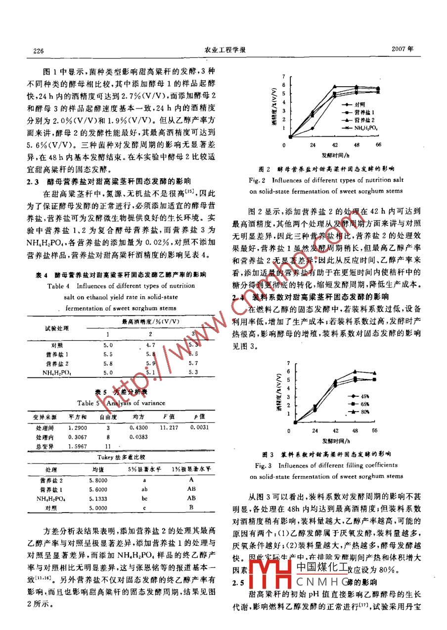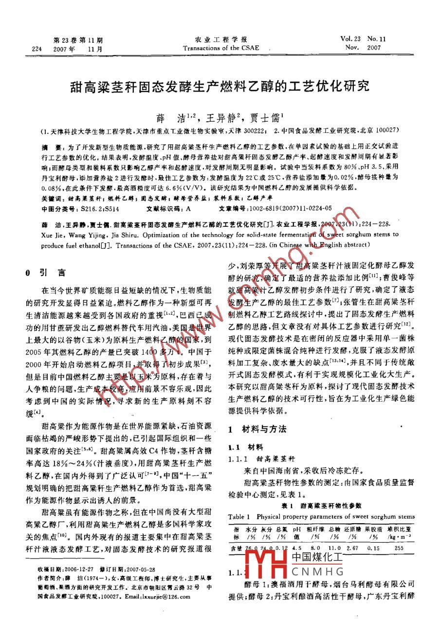 第23卷第11期農(nóng)業(yè)工程學報Vol 23 No 112242007年11月Transactions of the CSAENov.2007甜高粱莖稈固態(tài)發(fā)酵生產(chǎn)燃料乙醇的工藝優(yōu)化研究薛潔,王異靜2,賈士儒(1.天津科技大學生物工程學院,天津市重點工業(yè)微生物實驗,天津300222;2.中國食品發(fā)酵工業(yè)研究院,北京100027)摘要;為了開發(fā)新型生物質(zhì)能源研究了用甜高粱莖稈生產(chǎn)燃料乙醇的工藝參數(shù),在單因素試驗的基礎上用正交試驗進行工藝參數(shù)的優(yōu)化。結果表明發(fā)酵溫度、pH值酵母營養(yǎng)鹽對甜高粱稈固態(tài)發(fā)酵乙醇產(chǎn)率、起酵速度和發(fā)酵周期有顯著影響;而酵母類型和裝料系數(shù)只影響乙醇產(chǎn)率和起酵速度,對發(fā)酵周期無明顯影響。試驗中當裝料系數(shù)為80%pH35、采用丹寶利酵母,添加營養(yǎng)鹽2進行發(fā)酵時,最佳工藝參數(shù)為:發(fā)酵溫度為22C或25℃,營養(yǎng)鹽添加最為0.02%,酵母接種量為0.08%在此條件下發(fā)酵,最高酒精度可達66%(V/V)。該研究結果為中國燃料乙醇的發(fā)展提供科學依據(jù)關鍵詞:鋤高粱莖稈;燃料乙醇;固態(tài)發(fā)酵;酵營養(yǎng)鹽;裝料系數(shù);乙醇產(chǎn)率中圖分類號:S216.2;S514文蘇標識碼:A文章編號:1002-6819(2007)11-0224-05薛潔,王異靜賈士儒.甜高粱基稈固態(tài)發(fā)酵生產(chǎn)燃料乙酵的工藝優(yōu)化研究[農(nóng)業(yè)工程學報,2007,2311):224-228Xue Jie, Wang Yijing. Jia Shiru. Optimization of the technology for solid-state fermentation of sweet sorghum stemsproduce fuel ethanol [ J]. Transactions of the CSAE, 2007, 23(11): 224-228 (in Chinese with English abstract少,劉榮厚等開展了甜高粱莖稈汁液固定化酵母乙醇發(fā)0引言酵的研究,確定了最適的營養(yǎng)鹽添加比例;曹俊峰等在當今世界礦質(zhì)能源日益短缺的情況下,生物質(zhì)能就甜高粱汁乙醇發(fā)酵初步條件進行了研究,確定了液態(tài)的研究開發(fā)顯得日益緊迫。燃料乙醇作為一種新型可再發(fā)酵生產(chǎn)乙醇的最佳工藝參數(shù);張管生在甜高粱莖稈生清潔能源越來越受到各國政府的重視2,巴西已成制燃料乙醇工藝路線探討中,提出了固態(tài)發(fā)酵生產(chǎn)燃料功的用甘蔗研發(fā)出乙醇燃料替代車用汽油,美國是世界乙醇的思路,但文章沒有對具體工藝參數(shù)進行研究12上最大的以谷物(玉米)為原料生產(chǎn)燃料乙醇的國家,到現(xiàn)代固態(tài)發(fā)酵技術是在密閉的反應器中采用單一菌株2005年其燃料乙醇的產(chǎn)量已突破1400多萬t。中國于純種或限定菌株混合純種進行發(fā)酵,克服了液態(tài)發(fā)酵原2000年開始啟動燃料乙醇項目,并取得了初步成果),料加工復雜廢水量大的缺點132,并且不同于傳統(tǒng)敞但是目前中國燃料乙醇主要是以玉米為原料,存在著與開式固態(tài)發(fā)酵模式,有利于實現(xiàn)規(guī)模化工業(yè)化大生產(chǎn)。人爭糧的問題生產(chǎn)成本較高,應用前最不容樂觀因此本研究以甜高粱莖稈為原料,探討了現(xiàn)代固態(tài)發(fā)酵技術考慮到中國的實際情況,尋求新的生產(chǎn)原料刻不容生產(chǎn)燃料乙醇的技術可行性,旨在為工業(yè)化生產(chǎn)綠色能源提供科學依據(jù)甜高梁作為能源作物是在世界能源緊缺,石油資源1材料與方法面臨枯竭的嚴峻形勢下提出的,已引起國際組織和一些國家政府的關注6。甜高粱屬高效C4作物莖稈含糖1.1材料率高達18%~24%(汁液垂度),用甜高粱莖稈生產(chǎn)燃111甜高梁莖桿料乙醇,在國內(nèi)外得到了廣泛認可-0,中國“十一五來自中國海南省,采收后冷凍貯存。規(guī)劃明確的把甜高粱稈生產(chǎn)燃料乙醇作為首選,甜高粱甜高粱莖稈物性參數(shù)的測定:由國家食品質(zhì)量監(jiān)督作為能源作物顯示出誘人的前景檢驗中心測定,見表1。甜高粱雖有能源作物之稱,但在中國尚沒有大型甜衰1甜高粱莖稈物性參數(shù)Table 1 Physical property parameters of sweet sorghum stems高粲乙醇廠,利用甜高粱生產(chǎn)燃料乙醇是多國科學家攻指水分灰分總氮pH粗纖維總糖還原糖果膠質(zhì)堆積比重關的焦點。國內(nèi)外現(xiàn)有的報道主要集中在甜高粱莖標/%/%/%值%/%/%/%/kg·m-3稈汁液液態(tài)發(fā)酵工藝,對固態(tài)發(fā)酵技術的研究報道很含量60%0.124.5801.02.670.15255中國煤化工收稿日期:2006-12-27修訂日期:200705-281.1CNMHG作者簡介:薛潔(1974一),女高級工程師,博士研究生,主要從事葡萄酒聚酒方面的研充開發(fā)工作,北京市朝陽區(qū)霄云路32號中酵母1:澳福酒用干酵母,煙臺馬利酵母有限公司國食品發(fā)酵工業(yè)研究院,100027, Email: lxxuejic@126cm提供;酵母2:丹寶利釀酒高活性干酵母,廣東丹寶利酵第11期薛潔等:甜高粱莖稈固態(tài)發(fā)酵生產(chǎn)燃料乙醇的工藝優(yōu)化研究母有限公司提供;酵母3:釀酒酵母DV10,法國杰兔(北高梁稈的發(fā)酵現(xiàn)象,結果如表3所示京)工貿(mào)有限公司提供。酵母用2%的葡萄糖水30C活表3不同溫度對甜高粱莖稈固態(tài)發(fā)酵的影響化1h備用。Table 3 Influences of different temperatures1.1.3酵母營養(yǎng)鹽on solid-state fermentation of sweet sorghum stems營養(yǎng)鹽1:復合發(fā)酵助劑 GO-Ferm,法國杰兔(北溫度發(fā)酵時間/h京)工貿(mào)有限公司提供;營蕎鹽2:復合發(fā)酵助劑,中國42食品發(fā)酵工業(yè)研究院提供;營養(yǎng)鹽3:磷酸二氫銨(分析150.673.5乙醇含質(zhì)1.2試驗方法/%(V/V)2.