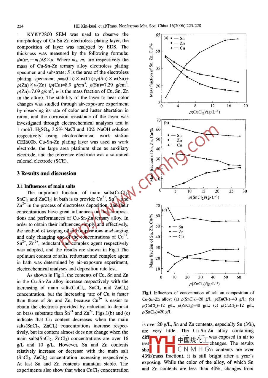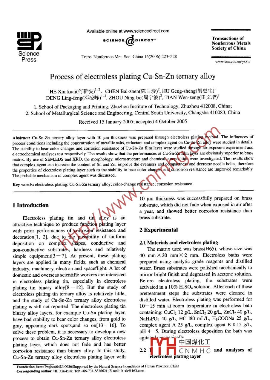 Available online at www.sciencedirect.comTransactions ofSCIENOE鄂*@oiner.NonfSociety of Chinarous MetalsScienceTrans. Nonferrous Met. Soc. China 16(2006) 223-228Presswww.csu.cdu.cn/ysxh/Process of electroless plating Cu-Sn- Zn ternary alloyHE Xin-kua(何新快).2, CHEN Bai-zhen(陳白珍)尸, HU Geng -sheng(胡更生)'DENG Ling-feng(鄧凌峰)',2, ZH0U Ning-bo(周寧波)尸, TIAN Wen-zeng(田文增)尸1. School of Packaging and Printing. Zhuzhou Institute of Technology, Zhuzhou 412008, China;2. School of Metallurgical Science and Engineering, Central South Universit, Changsha 410083, ChinaReceived 15 January 2005; accepted 4 October 2005Abstract: Cu-Sn-Zn temary alloy layer with 10 pμm thickness was prepared through elctroless plating method. The infuences ofprocess conditions including the concentration of matllic salts, reductant and complex agent on Cu-Sn-Zn aloy were studied in details.The stability to bear color changes and corrosion resistance of Cu-Sn-Zn film layer were studied through air-exposure experiment andeletrochemical analyses test respectively. The results show that the performances of Cu-Sn-Zn flm layer are obviouslysuperior to brassmatrix. By use of SEM,EDS and XRD, the morphology, microstnucture and chemical composition were investigated. The results showthat complex agent can increase the content of Sn and Zn, improve the evenness and compactness and decrease needle holes, thereforethe properties of electroless plating layer such as the stability to bear color changes and corrosion resistance are improved remakably.The probable mechanism of complex agent was discussed.Key words: electroless plating: Cu-Sn-Zn temary aly;, color-change resistance; corrosion resistance10 pum thickness was sucessfully prepared on brass1 Introductionsubstrate, which did not fade when exposed in air aftera year, and showed better corrosion resistance thanElectroless plating tin and tin alloy is anbrass substrate.attractive technique to produce function plating layerwith prior performances of corrosion resistance and2 Experimentaldecoration[1, 2], due to the possibility of uniformdeposition on complex shapes, conductive and2.1 Materials and electroless platingnon-conductive substrates, hardness and relativelyThe matrix used was brass(H65), whose size wassimple equipment[3- 7]. At present, these plating40 mmX 20 mmX2 mm. Electroless baths werelayers are applied in many fields, such as chemicalprepared using analytic grade reagents and distlledindustry, machinery, electron and spaceflight. A lot ofwater. Brass substrates were polished mechanically todomestic and overseas scientific workers are interestedmiror bright finish and degreased in acetone solution.in electroless plating tin, especially in electrolessBefore electroless plating, the substrates wereplating tin binary alloy[8- 12]. But the study ofactivated in a 10% H2SO4 solution. After each of theseelectroless plating tin ternary alloy is relatively lttle,pretreatment steps the substrates were cleaned irand the study of Cu-Sn-Zn termary alloy electrolessdistilled water, Electroless plating was performed forplating is still not reported. The electroless plating tin10- 15 min at room temperature in electroless bathbinary alloy layers, for example Cu-Sn plating layer,containing: CuCl 12 g/L, SnCl2 20 g/L, ZnCl2 40 g/L,have bad stability to bear color changes, from gold toNaH2PO2 40 g/L, HC 180 mL/L, HsCOONa 25 g/L,gray, appearing dark spots,and so on[13- 16]. Tocomplex agent A 25 g/L, complex agent B 0.15 g/L,solve these problem, it is necessary to develop a newpH 4- 5. During electroless deposition the bath wasprocess to obtain Cu-Sn-Zn temary alloy electrolessagitat中國(guó)煤化工plating layer, which does not fade and has bettercorrosion resistance than binary alloy. In this study,.2!YHCN M HG and analyses ofCu-Sn-Zn temnary alloy electroless plating layer withelectroless plating layerFoundation item: Projcec(04J140036)Supported by the Naturl Science Foundation of Hunan Province. ChinaCorrespondimg autbor: HE Xin-kuai; Tel: +86 731-8876621; F-mail: h-xk@ 163.com224HE Xin-kuai, ct al/Trans. Nonferrous Met. Soc. China 16(2006) 223-228KYKY2800 SEM was used to observe thea)■-Snmorphology of Cu-Sn-Zn electroless plating layer, thecomposition of layer was analyzed by EDS. The0tthickness was measured by the following formula:d=(m2- m)SXp. Where m2, m are respectively thmass of Cu-Sn-Zn ternary alloy electroless plating咨35-specimen and substrate; S is the area of the electrolessplating specimen; ρ=p(Cu) X w(Cu)+p(Sn) X w(Sn)+p(Zn)X w(Zn) (Cu)=8.9 g/cm', p(Sn)=7.29 g/cm',卡20個(gè)p(Zn)=7.09 g/cm', w is the mass fraction of Cu, Sn, Znin the alloy). The stability of the layer to bear colorchanges was studied through air-exposure experiment4812620by observing its rate of color and luster alteration inp(CuCl2)(g.L-1)room, and the corrosion resistance of the layer wasinvestigated through electrochemical analyses test in" (b)1 mol/L H2SO4, 3.5% NaCl and 10% NaOH solution0-respectively using electrochemical work stationCHI600b. Cu-Sn-Zn plating layer was used as workelectrode, the large area platinum slice as auxiliaryelectrode, and the reference electrode was a saturatedcalomel electrode (SCE).0}3 Results and discussion0葉3.1 Influences of main salts152550The important function of main salts(CuCl2,SnCl2 and ZnCl2) in bath is to provide Cu2+, Sn2+ andρ(SnCl2)(g.L))Zn~* in the process of electroless deposition, and their(e)"concentrations have great influences on the composi-tions and performances of Cu-Sn-Zn ternary alloy. In3order to obtain their influences simply and effectively,50■-Snthe method of keeping other compositions unchangingand only changing one of the concentrations of Cu2*,另40.-CuSn*+, Zn2*, reductant and complex agent respectivelywas adopted, and the results are shown in Fig. l.Theoptimum content of salts, reductant and complex agent20 tin bath was determined by air- exposure experiment,electrochemical analyses an