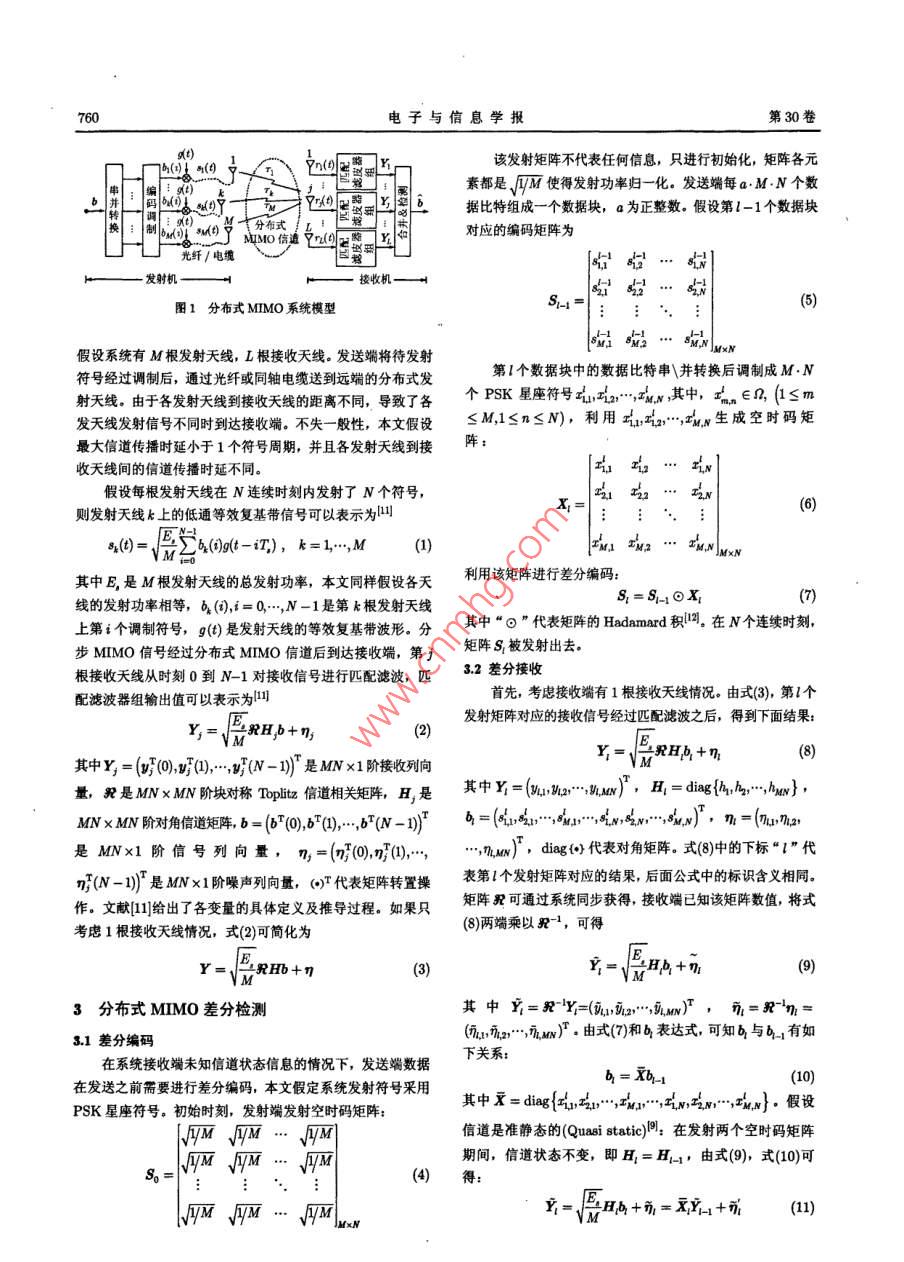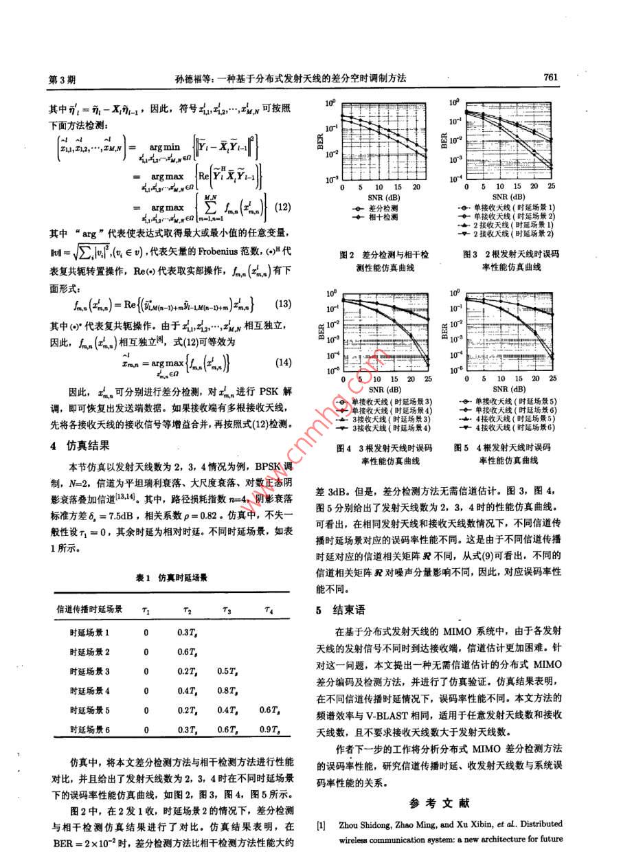 第30卷第3期電子與信息學報Vol. 30No 32008年3月Journal of Electronics Information TechnologyMar 2008一種基于分布式發(fā)射天線的差分空時調制方法孫德福唐友喜邵士海李少謙〔電子科技大學通信抗干擾技術國家級重點實驗室成都610054)摘要:在基于分布式發(fā)射天線的多入多出(、MIMO)系統(tǒng)中,由于各發(fā)射天線的發(fā)射信號不同時到達接收端,用于信道估計的導引設計及發(fā)射方法存在一定困難。針對這一問題,該文提出一種無需信道估計的分布式MIMO差分編碼及檢測方法:發(fā)送端將發(fā)射矩陣進行相位差分調制后發(fā)射,接收端利用前后接收量判斷相位信息恢復出發(fā)送端數據信息。該方法頻譜效率與 V-BLAST相同,適用于任意發(fā)射天線數和接收天線數,且不要求接收天線數大于發(fā)射天線數。仿真結果表明,在不同信道傳播時延情況下,誤碼率性能不同。關鍵詞:分布式發(fā)射天線;分布式多入多出;信道傳播時延;差分檢測中圖分類號:TN914文獻標識碼:A文章編號:1009-5896(2008)03-075904Differential Space Time Modulation withDistributed Transmit AntennasSun De-fu Tang You-xi Shao Shi-hai Li Shao-qian(National key Lab of Communication, University of Electronic Science and Technology ofChina, Chengdu 610054, China)Abstract: It is difficult to estimate channel knowledge in multiple input multiple output system which based ondistributed antenna structure because the transmit signals are received asynchronously. aiming at this matter,adifferential encoding and detection scheme is proposed where channel estimation is not needed. The proposedscheme has the game spectral efficiency as V-BLAST scheme and can be applied to any number of transmitantenna and receive antenna, besides the number of receive antenna can be less than transmit antenna. Thesimulation results show that the ber performance is different corresponding to different channel propagationKey words: Distributed transmit antennas; Distributed Multiple Input Multiple Output(MIMO); Channelpropagation delay; Differential detection1引言速移動或者天線數目較多情況下,系統(tǒng)接收端難以獲得準確近年來,分布式無線通信系統(tǒng)叫 distributed wireless的信道狀態(tài)信息,因此,在分布式MINO系統(tǒng)中,研究無需ommunication system受到越來越多的關注,果用分布式天做信道估計的非相干檢測技術很有必要。線結構的多入多出( Distributed Multiple Input Multiple國內外學者對同步MMO(信號同時發(fā)射,同時到達接收oupt;, Distributed MIMO)系統(tǒng)(本文簡稱為分布式端)差分檢測技術進行了一定研究1,但是,在分布式MIMO,可以使得收發(fā)天線間的鏈路更加獨立,空間相關性MMO系統(tǒng)中,由于發(fā)射天線在地域上的分布性引起各發(fā)射更弱,能達到更高的系統(tǒng)容量;由于天線分布于小區(qū)中不天線的發(fā)射信號不同時到達接收天線,同步MMO差分檢測同地理位置,能有效縮短信號的接入距離,降低發(fā)射信號功算法不再適用。到目前為止,還未發(fā)現基于分布式發(fā)射天線率,提高小區(qū)覆蓋率14。分布式MMO具有高容量、低功的MMO差分檢測技術的相關研究文獻。針對這一問題,本耗、更好的覆蓋、對人體低電磁損害等優(yōu)點,是第四代移動文提出一種適用于分布式發(fā)射天線系統(tǒng)的MMO差分編碼通信系統(tǒng)的顯著特征之一國5。及檢測方法在發(fā)送端和接收端都未知信道狀態(tài)信息的情況在分布式MIMO系統(tǒng)中,為了獲取信道狀態(tài)信息下,系統(tǒng)可進行非相干檢測。Channel State Information,CSI),需要占用額外的帶寬資本文其余部分是這樣安排的:第2節(jié)給出分布式MIMO源;由于各發(fā)射天線的發(fā)射信號不同時到達接收端,用于信系統(tǒng)模型:第3節(jié)給出一種分布式MIMO差分編碼及檢測方道估計的導引設計及發(fā)射方法都存在一定困難;另外,在高法:仿真結果在第4節(jié)給出:最后是對全文總結20060817收到,20070205改回2分布式MIMo系統(tǒng)模型國家自然科學基金(6027200,60572090,60472045,60496313)和教文獻[1]提出了分布式MIMO系統(tǒng)模型,如圖1所示育部博士點基金(20061400資助課題電子與信息學報第30卷該發(fā)射矩陣不代表任何信息,只進行初始化,矩陣各元素都是M使得發(fā)射功率歸一化,發(fā)送端每aMN個數(=x據比特組成一個數據塊,a為正整數。假設第l-1個數據塊分布式MMo信通對應的編碼矩陣為光纖/電纜發(fā)射機一接收機…圖1分布式MIMO系統(tǒng)模型假設系統(tǒng)有M根發(fā)射天線,L根接收天線。發(fā)送端將待發(fā)射符號經過調制后,通過光纖或同軸電纜送到遠端的分布式發(fā)第l個數據塊中的數據比特串\并轉換后調制成MN射天線由于各發(fā)射天線到接收天線的距離不同,導致了各個FS星座符號,x”“;x其中,最大信道傳播時延小于1個符號周期,并且各發(fā)射天線到接n≤N),利用發(fā)天線發(fā)射信號不同時到達接收端。不失一般性,本文假設≤M,1≤n≤N),利用xy生成空時碼矩收天線間的信道傳播時延不同。假設每根發(fā)射天線在N連續(xù)時刻內發(fā)射了N個符號,22則發(fā)射天線k上的低通等效復基帶信號可以表示為E4(0VM>40(-7),k=…,M(1)n1城2…或其中E,是M根發(fā)射天線的總發(fā)射功率,本文同樣假設各天利用該矩陣進行差分編碼X線的發(fā)射功率相等,b(),=0…N-1是第k根發(fā)射天線上第個調制符號,g()是發(fā)射天線的等效復基帶波形,分其中“”代表矩陣的 Hadamard積,在N個連續(xù)時刻,步MMO信號
