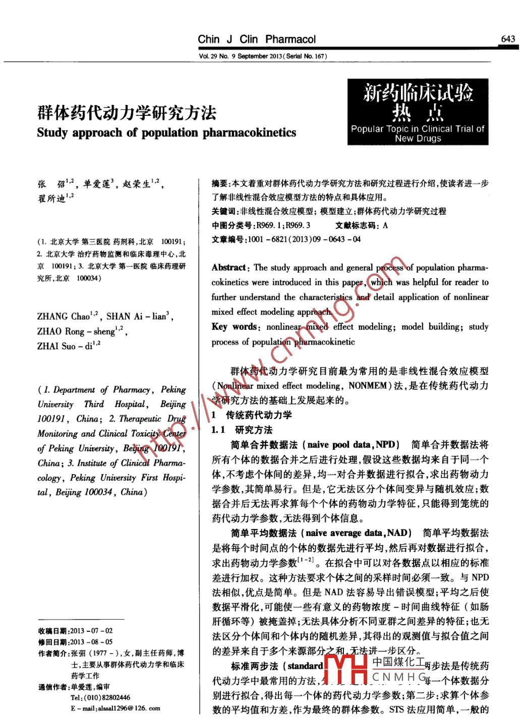 Chin J Clin PharmacoVol 29 No. 9 September 2013( Serial No 167)新約臨床試驗(yàn)群體藥代動(dòng)力學(xué)研究方法熱Study approach of population pharmacokineticsPopular Topic in Clinical Trial ofNew Drugs張招2,單愛蓮3,趙榮生12,摘要:本文著重對(duì)群體藥代動(dòng)力學(xué)研究方法和研究過程進(jìn)行介紹,使讀者進(jìn)一步翟所迪12了解非線性混合效應(yīng)模型方法的特點(diǎn)和具體應(yīng)用。關(guān)鍵詞:非線性混合效應(yīng)模型;模型建立;群體藥代動(dòng)力學(xué)研究過程中圖分類號(hào):B969.1;B969.3文獻(xiàn)標(biāo)志碼:A(1.北京大學(xué)第三醫(yī)院藥劑科,北京100191;文章編號(hào):1001-6821(2013)09-0643-042.北京大學(xué)治療藥物監(jiān)測(cè)和臨床毒理中心,北京100191;3.北京大學(xué)第一醫(yī)院臨床藥理研Abstract The study approach and general process of population pharma究所,北京100034)introduced in this paper, which was helpful for reader tofurther understand the characteristics and detail application of nonlinearZHANG Chao, SHAN Ai-lianmixed effect modeling approachZHAO Rong-shengKey words: nonlinear mixed effect modeling; model building; studyZHAI Suo -d i'.2process of population pharmacokinetic群體藥代動(dòng)力學(xué)研究目前最為常用的是非線性混合效應(yīng)模型(I. Department of Pharmacy, Peking( Nonlinear mixed effect modeling, NONMEM)法,是在傳統(tǒng)藥代動(dòng)力University Third Hospital, Beiying學(xué)研究方法的基礎(chǔ)上發(fā)展起來的100191, China; 2. Therapeutic Drug1傳統(tǒng)藥代動(dòng)力學(xué)Monitoring and Clinical Toxicity Center1.1研究方法of Peking University, Beijing 100191簡單合并數(shù)據(jù)法( naive pool data,NPD)簡單合并數(shù)據(jù)法將China; 3. Institute of Clinical pharma所有個(gè)體的數(shù)據(jù)合并之后進(jìn)行處理,假設(shè)這些數(shù)據(jù)均來自于同一個(gè)cology, Peking University First Hospi體,不考慮個(gè)體間的差異,均一對(duì)合并數(shù)據(jù)進(jìn)行擬合,求出藥物動(dòng)力tal, Beijing 100034, China)學(xué)參數(shù),其簡單易行。但是,它無法區(qū)分個(gè)體間變異與隨機(jī)效應(yīng);數(shù)據(jù)合并后無法再求算每個(gè)個(gè)體的藥物動(dòng)力學(xué)特征,只能得到籠統(tǒng)的藥代動(dòng)力學(xué)參數(shù),無法得到個(gè)體信息。簡單平均數(shù)據(jù)法( naive average data,NAD)簡單平均數(shù)據(jù)法是將每個(gè)時(shí)間點(diǎn)的個(gè)體的數(shù)據(jù)先進(jìn)行平均,然后再對(duì)數(shù)據(jù)進(jìn)行擬合,求出藥物動(dòng)力學(xué)參數(shù)21。在擬合中可以對(duì)各數(shù)據(jù)點(diǎn)以相應(yīng)的標(biāo)準(zhǔn)差進(jìn)行加權(quán)。這種方法要求個(gè)體之間的采樣時(shí)間必須一致。與NPD法相似,優(yōu)點(diǎn)是簡單。但是NAD法容易導(dǎo)出錯(cuò)誤模型;平均之后使數(shù)據(jù)平滑化,可能使一些有意義的藥物濃度-時(shí)間曲線特征(如腸肝循環(huán)等)被掩蓋掉;無法具體分析不同亞群之間差異的特征;也無收稿日期:2013-07-02修回日期:2013-08-05法區(qū)分個(gè)體間和個(gè)體內(nèi)的隨機(jī)差異,其得出的觀測(cè)值與擬合值之間作者簡介:張弨(1977-),女,副主任藥師,博的差異來自于多個(gè)來源部分之和無法講一步區(qū)分士,主要從事群體藥代動(dòng)力學(xué)和臨床標(biāo)準(zhǔn)兩步法( standard中國煤化工兩步法是傳統(tǒng)藥藥學(xué)工作LCNMH一個(gè)體數(shù)據(jù)分通信作者:單愛蓮,編審代動(dòng)力學(xué)中最常用的方法Tel:(010)82802446別進(jìn)行擬合,得出每一個(gè)體的藥代動(dòng)力學(xué)參數(shù);第二步:求算個(gè)體參E-mail:alssal1296@@126.com數(shù)的平均值和方差,作為最終的群體參數(shù)。STS法應(yīng)用簡單,一般的644中國臨床藥理學(xué)雜志第29卷第9期2013年9月(總第167期)藥物動(dòng)力學(xué)軟件均可以完成。STS法的局限性在于該差模型偏倚、給藥或者采樣誤差造成。其最常用的法必須先對(duì)所有個(gè)體應(yīng)用相同的模型進(jìn)行擬合表達(dá)方式有加法模型和比例模型。公式如下1.2傳統(tǒng)法的缺點(diǎn)y三f(x,P)+E藥代動(dòng)力學(xué)研究必須密集采樣;無法定量藥代動(dòng)其中,y是第個(gè)體在k周期的第j個(gè)觀察點(diǎn);f(…)力學(xué)參數(shù)的變異性(個(gè)體內(nèi)個(gè)體間和周期間變異);無是個(gè)體藥代動(dòng)力學(xué)參數(shù)預(yù)測(cè)值,是P4和獨(dú)立變量x法進(jìn)行不同種屬、人群或者給藥方案間的外推和預(yù)測(cè);(通常為時(shí)間或者劑量)的函數(shù);e是殘差變異,用于無法進(jìn)行復(fù)雜體系的藥代動(dòng)力學(xué)/藥效學(xué)相互關(guān)系研描述個(gè)體預(yù)測(cè)值與實(shí)際觀察值之間的差別,e假設(shè)服究;無法進(jìn)行多個(gè)研究的集合分析;無法進(jìn)行協(xié)變量和從均值為0,方差為δ的正態(tài)分布。包括疾病進(jìn)展在內(nèi)的影響因素的動(dòng)態(tài)分析和預(yù)測(cè)。群體藥代動(dòng)力學(xué)方法可以對(duì)不同來源的大規(guī)模數(shù)2群體藥代動(dòng)力學(xué)( NONMEM)法據(jù)進(jìn)行分析,探討它們間的相互關(guān)系。 Sheiner教授認(rèn)NONMEM法解決了傳統(tǒng)藥代動(dòng)力學(xué)研究方法的為,該方法體現(xiàn)了學(xué)習(xí)-驗(yàn)證的過程。群體藥代動(dòng)力學(xué)主要缺點(diǎn),用 FORTRAN語言編制(說明書)。目前的模型建立的