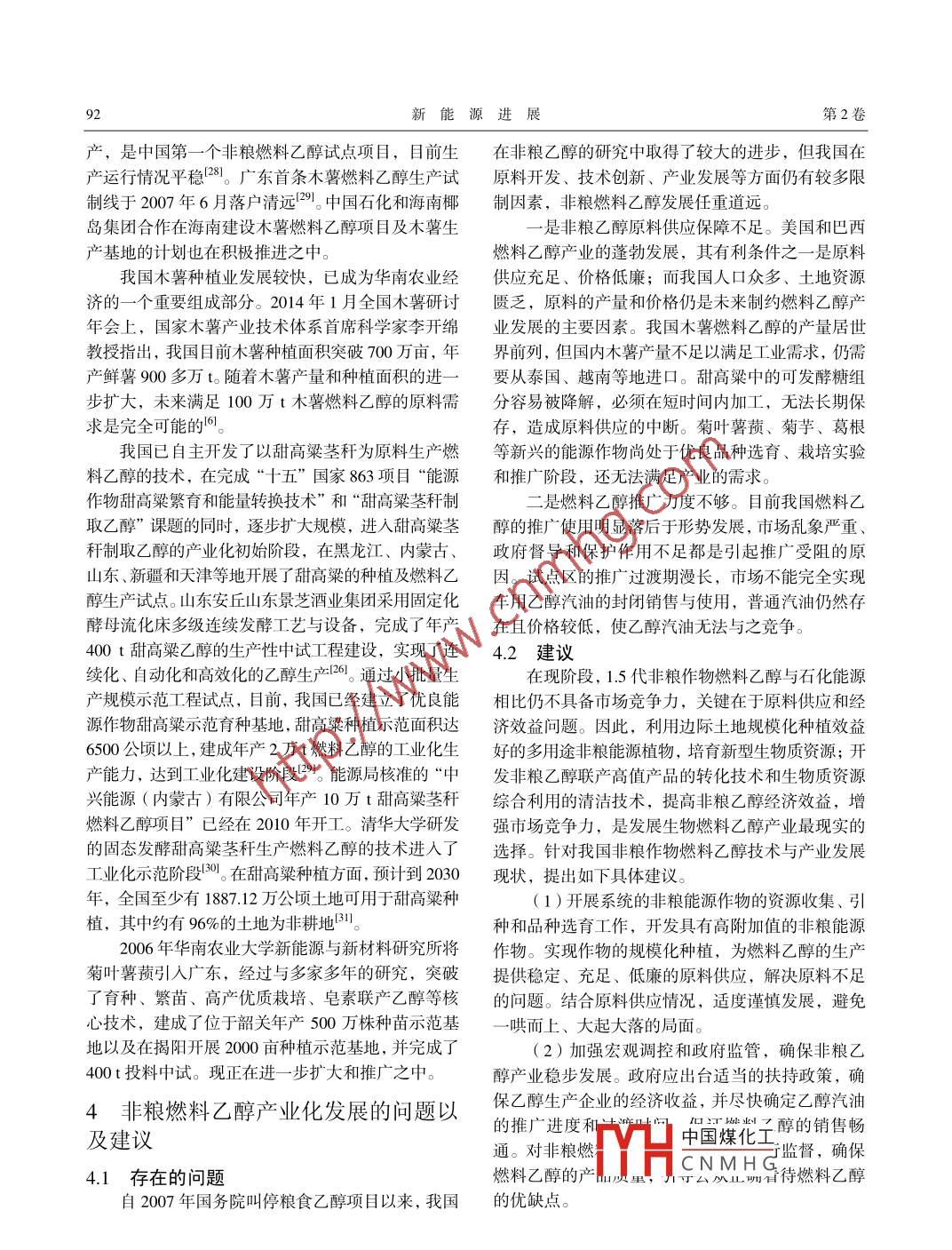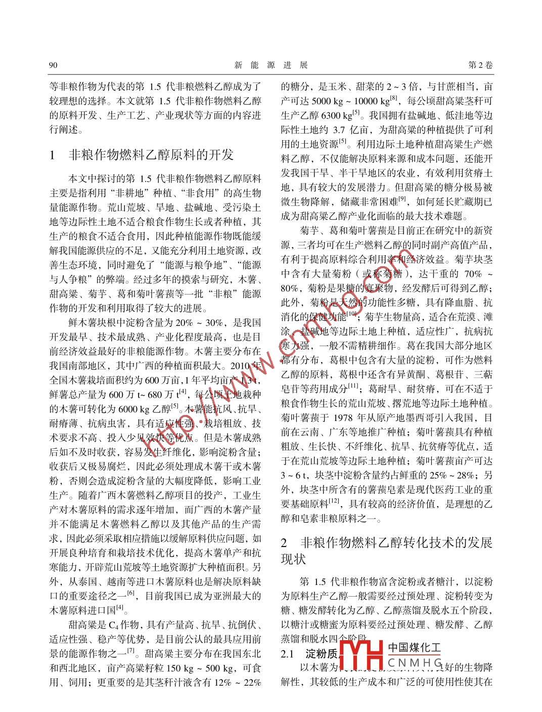 第2卷第2期新能源進(jìn)展Vol 2 No. 22014年4月ADVANCES IN NEW AND RENEWABLE ENERGYApr.2014文章編號:2095-560X(2014)020089-05我國非糧作物燃料乙醇技術(shù)與產(chǎn)業(yè)發(fā)展現(xiàn)狀王霞1,陳迪嘉23,葉廣英23,謝君23(1.茂名職業(yè)技術(shù)學(xué)院,化學(xué)工程系,茂名525000;2.華南農(nóng)業(yè)大學(xué),新能源與新材料研究所,廣州510642農(nóng)業(yè)部能源植物資源與利用重點(diǎn)實(shí)驗(yàn)室,廣州510642)摘要:非糧燃料乙醇是我國生物質(zhì)能源發(fā)展的重點(diǎn)之一。本文就我國木薯、甜高粱、菊芋、葛和菊葉薯蕷等幾種非糧能源作物的資源優(yōu)勢、非糧乙醇轉(zhuǎn)化技術(shù)及其產(chǎn)業(yè)發(fā)展現(xiàn)狀進(jìn)行探討,并對我國非糧作物燃料乙醇產(chǎn)業(yè)的可持續(xù)發(fā)展提出了建議關(guān)鍵詞:燃料乙醇;非糧能源作物;淀粉;糖質(zhì)中圖分類號:TK6文獻(xiàn)標(biāo)志碼:Adoi:10.3969/issn.2095560X.2014.02.002Development of Technology and Industrialization ofNon-Grain Crops Fuel EthanolWANG Xia, CHEN Diii 2.3 YE Guang-ying", XIE Jun2,3(1. Department of Chemical Engineerin, Maoming Polytechnic College, Maoming 525000, China2. Institute of New Energy and New Materials, South China Agriculture University, Guangzhou 510642, China3. Key Laboratory of Energy Plants Resource and Utilization, Ministry of Agriculture, Guangzhou 510642, China)Abstract: Non-grain fuel ethanol is one of emphases on the development of biomass energy in China. Non-grain energycrops, such as cassava, cane, Jerusalem artichoke, kudzu, and Dioscorea composite, etc, are discussed from aspects ofresource advantages, development of ethanol conversion technology, and industrialization in China. Suggestions about howto develop non-grain crops fuel ethanol industry are proposed in this articleKey words: fuel ethanol; non-grain energy crops; starch; sugariness0引言化技術(shù)創(chuàng)新、推進(jìn)液體燃料等生物質(zhì)能源產(chǎn)品規(guī)?;a(chǎn)與示范”的發(fā)展需求。2012年,我國燃料乙可再生能源是解決我國能源供需矛盾、改善能醇產(chǎn)量約為166萬t,是繼美國和巴西之后的第三大源結(jié)構(gòu)和實(shí)現(xiàn)可持續(xù)發(fā)展的戰(zhàn)略選擇。近年來,作燃料乙醇生產(chǎn)國。第1代糧食燃料乙醇主要以玉米、為一種能替代化石燃料的清潔液體燃料能源,生物甘蔗等為原料,雖然為環(huán)境倸護(hù)、節(jié)能減排、降低石燃料乙醇受到了人們的關(guān)注。生物質(zhì)乙醇的廣泛油消耗做出了較大貢獻(xiàn),但是也存在過度消耗糧食、應(yīng)用,使其在全球范圍內(nèi)的產(chǎn)量大幅提高凹。根據(jù)與人畜爭奪口糧、與糧林爭奪土地的弊端。第2代纖2007年9月國家發(fā)展和改革委員會公布的《可再生維素乙醇具有資源豐富、成本低廉、綠色環(huán)保、低能源中長期發(fā)展規(guī)劃》,預(yù)計(jì)2020年我國可再生能碳節(jié)源、不爭糧、不爭地等特點(diǎn),符合世界能源發(fā)源消費(fèi)量將達(dá)到能源消費(fèi)總量的15%左右,而生物展趨勢和環(huán)保潮流,受到國家政策支持,發(fā)展?jié)摿θ剂弦掖甲鳛橹攸c(diǎn)發(fā)展對象之一,年利用量將達(dá)到巨大,然而生產(chǎn)成本高使其產(chǎn)業(yè)化進(jìn)程緩慢。我1000萬t。2012年,科技部發(fā)布了《生物質(zhì)能源科國是人口大國,糧食安全是關(guān)乎國家穩(wěn)定的首要問技發(fā)展¨“十二五”重點(diǎn)專項(xiàng)規(guī)劃》,明確了我國“加題。現(xiàn)階段,在發(fā)展糧食燃料乙醇不可行、纖維素快新型能源植物的規(guī)模化培育、加強(qiáng)生物質(zhì)高效轉(zhuǎn)燃料乙醇暫不圍經(jīng)洺性的背晷下以木薯、甜高粱中國煤化工*收稿日期:201309-04修訂日期:201404-10CNMHG基金項(xiàng)目:廣東省科技計(jì)劃重點(diǎn)項(xiàng)目(2011B090400437);“十二五”國家科技支撐計(jì)劃(201BAD22B01)通信作者:謝君,E-mail:xIejun@scau.edu.cn新能源進(jìn)展第2卷等非糧作物為代表的第1.5代非糧燃料乙醇成為了的糖分,是玉米、甜菜的2~3倍,與甘蔗相當(dāng),畝較理想的選擇。本文就第1.5代非糧作物燃料乙醇產(chǎn)可達(dá)5000kg-1000kg48,每公頃甜高粱莖稈可的原料開發(fā)、生產(chǎn)工藝、產(chǎn)業(yè)現(xiàn)狀等方面的內(nèi)容進(jìn)生產(chǎn)乙醇6300kg3。我國擁有鹽堿地、低洼地等邊行闡述際性土地約3.7億畝,為甜高粱的種植提供了可利用的土地資源。利用邊際土地種植甜高粱生產(chǎn)燃1非糧作物燃料乙醇原料的開發(fā)料乙醇,不僅能解決原料來源和成本問題,還能開本文中探討的第1.5代非糧作物燃料乙醇原料發(fā)我國干旱、半干旱地區(qū)的農(nóng)業(yè),有效利用貧瘠土主要是指利用“非耕地”種植、“非食用”的高生物地,具有較大的發(fā)展?jié)摿Α5鸶吡坏奶欠謽O易被量能源作物?;纳交钠?、早地、鹽堿地、受污染土微生物降解,儲藏非常困難,如何延長貯藏期已地等邊際性土地不適合糧食作物生長或者種植,其成為甜高粱乙醇產(chǎn)業(yè)化面臨的最大技術(shù)難題生產(chǎn)的糧食不適合食用,因此種植能源作物既能緩菊芋、葛和菊葉薯蕷是目前正在硏究中的新資解我國能源供應(yīng)的不足,又能充分利用土地資源,改源,三者均可在生產(chǎn)燃料乙醇的同時副產(chǎn)高值產(chǎn)品善生態(tài)環(huán)境,同時避免了“能源與糧爭地”、“能源有利于提高原料綜合利用率和經(jīng)濟(jì)效益