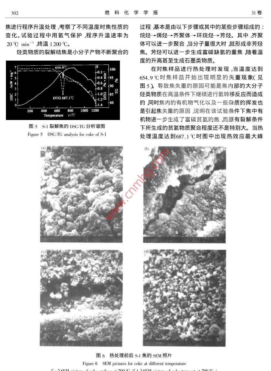 第32卷第4期燃料化學(xué)學(xué)報Vol.31 No.42003年8月JOURNAL OF FUEL CHEMISTRY AND TECHNOLOGYAug.2003文章編號:0253-24092003 )04-0300-05吸熱型碳?xì)淙剂蠠崃呀饨沟男再|(zhì)研究郭永勝,何龍,方文軍,林瑞森(浙江大學(xué)化學(xué)系,浙江杭州310027 )摘要:采用掛片測焦的方法測定了吸熱型碳?xì)淙剂蟂-1結(jié)焦速率隨裂解時間的變化結(jié)果顯示隨反應(yīng)時間的延長燃料的結(jié)焦速率基本呈現(xiàn)增加趨勢。利用能量彌散x射線分析對金屬掛片滲碳現(xiàn)象的考察結(jié)果顯示掛片焦中明顯有金屬原子的遷移。還利用儀器分析手段對吸熱型碳?xì)淙剂蟂-1在700C時裂解所生成焦的性質(zhì)進(jìn)行了考察元素分析結(jié)果顯示隨反應(yīng)時間的延長焦的氫碳比變低掃描電鏡對焦表面形態(tài)結(jié)構(gòu)的研究結(jié)果顯示熱處理溫度對焦的結(jié)構(gòu)有著很大的影響。對可溶焦的分析結(jié)果顯示s- 1裂解結(jié)焦并不是單一歷程結(jié)焦過程的中間產(chǎn)物基本分芳烴類與非芳烴類兩種。關(guān)鍵詞:結(jié)焦;氫碳比;滲碳;吸熱型碳?xì)淙剂现袌D分類號:V434. 14文獻(xiàn)標(biāo)識碼:A .吸熱型碳?xì)淙剂鲜?種新型航空航天燃料,它1實驗既可以通過自身的熱容、氣化潛熱吸熱還可以通過1.1實驗原料選用自行配制的吸熱型碳?xì)淙剂匣瘜W(xué)裂解吸收并儲存飛行器高溫部位產(chǎn)生的熱量,s- 1進(jìn)行裂解結(jié)焦實驗,S- 1的基本物性見文獻(xiàn)在裂解的同時還可以得到燃燒性能良好的小分子產(chǎn)[ 1] ,該燃料具有相對較高的密度,有利于提高燃料物這些產(chǎn)物進(jìn)入燃燒室后通過燃燒再把能量釋放的體積熱值從而減輕飛行器的負(fù)載;同時,S-1燃出來,從而在提高能量利用率的同時(1-6]還有效的料還具有較高的吸熱能力即熱沉值較大當(dāng)裂解溫解決了飛行器的冷卻問題。但是,吸熱型碳?xì)淙剂隙葹?00 C時其熱沉值可以達(dá)到3.0M]J kgt'。在進(jìn)行裂解反應(yīng)時還會有小分子產(chǎn)物的聚合、縮合1.2試驗裝置與方法為了研究吸熱型碳?xì)淙剂系榷畏磻?yīng)而導(dǎo)致結(jié)焦。結(jié)焦會帶來許多不利影熱裂解結(jié)焦性質(zhì),建立了-套連續(xù)流動式測焦裝置響如堵塞閥門和過濾器油路變窄改變噴霧形狀,(圖1)2影響霧化質(zhì)量嚴(yán)重時可導(dǎo)致發(fā)動機(jī)熄火降低熱交換效率結(jié)焦還會導(dǎo)致金屬管道中滲碳現(xiàn)象的發(fā)生,從而降低其機(jī)械性能。吸熱型碳?xì)淙剂狭呀饨Y(jié)焦的研究一直 是此類燃0料開發(fā)的技術(shù)重點,國內(nèi)外都進(jìn)行了大量的探索。但是這些研究大多是圍繞結(jié)焦抑制劑的開發(fā)以及\92l結(jié)焦機(jī)理的推測展開的7-12] ,而針對反應(yīng)生成的焦茜16-15炭本身的性質(zhì)研究卻不多。焦炭的結(jié)構(gòu)性質(zhì)直接決定于燃料裂解過程中小分子產(chǎn)物的聚合路徑,并與結(jié)焦機(jī)理密切相關(guān)134]。本文利用掃描電鏡.圖1吸熱型碳 氫燃料結(jié)焦測定裝置( S-570SEM ,HTTACHI Co. Japan入元素分析( EA1110 ,Figure 1 Coke determination system for endothemie hydrocarbon fuelItaly )以及能量彌散X射線分析( Finder-100EDX )等1-N2; 2-surge damping valve; 3- -manometer; 4- rotor分析手段對吸熱型碳?xì)淙剂蟂- 1熱裂解焦的性質(zhì)flowmeter ;5一-fuel ;6- pump ;7一valve ;8一temperature- con-進(jìn)行了深入研究,為航空燃料的研究與開發(fā)提供了troller ;9一carburetor ;10- -electric heater;11- -copper ;12-reactor ; 13一-coke-collector ; 14- gas-liquid separator ; 15- -gas切實可靠的依據(jù)。chromatograph ; 16- computer workstation收稿日期: 2002-08-28 ;修回日期:2003-06-024期郭永勝等:吸熱型碳?xì)淙剂蠠崃呀饨沟男再|(zhì)研究301燃料由WPG-6型微量高壓平流泵輸送通過從圖2可以看出S-1裂解結(jié)焦速率隨時間的變指定流量的載氣攜帶進(jìn)入預(yù)熱系統(tǒng)汽化后在反應(yīng)化極不規(guī)律。反應(yīng)初期,由于掛片中金屬原子的催管內(nèi)進(jìn)行裂解反應(yīng)。反應(yīng)生成的小分子產(chǎn)物在隨載化生焦作用結(jié)焦速率較快隨著結(jié)焦量的增加合金氣排出的過程中不斷的發(fā)生縮合、聚合反應(yīng)而結(jié)焦,表面慢慢的被焦覆蓋,金屬原子催化生焦的作用相隨著反應(yīng)時間的延續(xù),焦不斷的沉積在反應(yīng)管尾部應(yīng)減弱結(jié)焦速率也隨之下降。但隨著裂解反應(yīng)的的掛片上。當(dāng)裂解反應(yīng)結(jié)束后,取出掛片即可測定.繼續(xù),很快Ni-Cr合金上出現(xiàn)滲碳現(xiàn)象(焦的EDX譜結(jié)焦量并對焦的性質(zhì)進(jìn)行研究實驗所選用的掛片圖對此是很好的證明,見圖3)部分活性Ni、Cr金屬為Ni-Cr 合金。:原子遷移到焦層表面重新恢復(fù)對結(jié)焦的催化作用。同時由于滲碳現(xiàn)象的出現(xiàn)以及焦在掛片表面的不斷2結(jié)果與 討論2.1結(jié)焦速率隨 反應(yīng)時間的變化在以前的研究沉積,合金表面變得相對粗糙,比表面積增大,使得中14]重點是測定結(jié)焦量,即利用脈沖進(jìn)樣法研究更多的烴可以粘附于焦的表面參與結(jié)焦反應(yīng)從而提添加不同結(jié)焦抑制劑后燃料裂解結(jié)焦量的減少從高了結(jié)焦速率。而評價抑制劑的效果。但是,-次脈沖的結(jié)焦量只圖3是對焦的EDX分析譜圖圖中顯示從掛片能反映初始結(jié)焦速率,而結(jié)焦是-個隨時間不斷變上