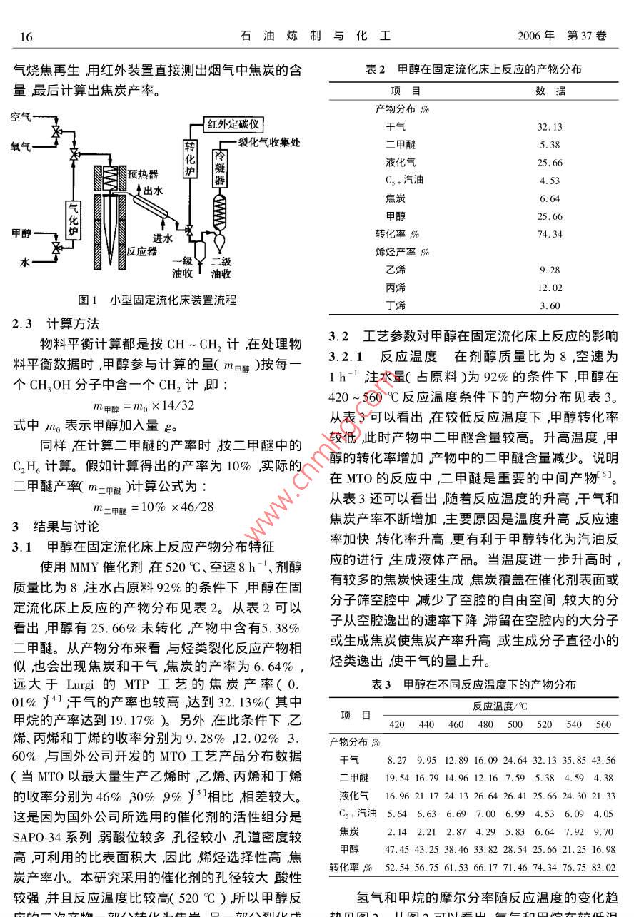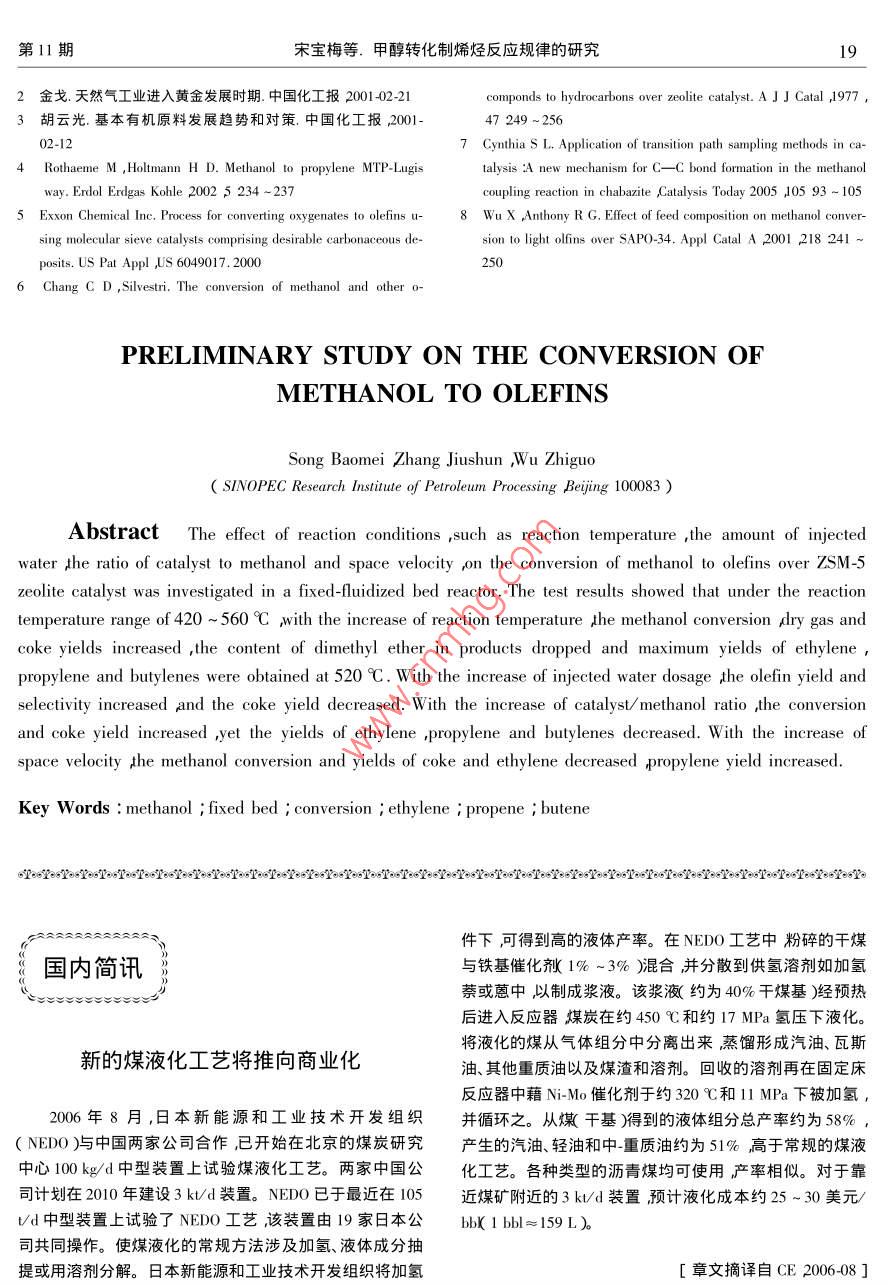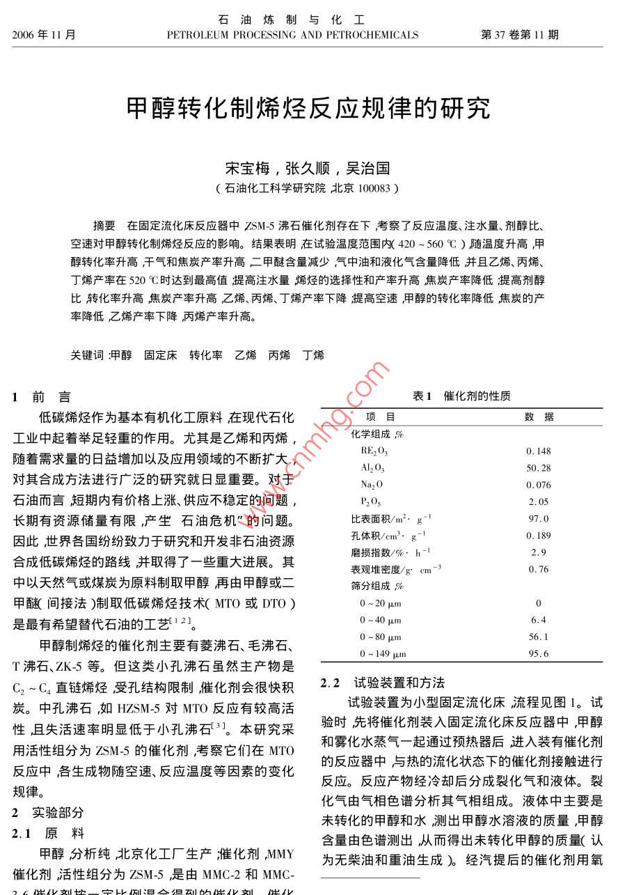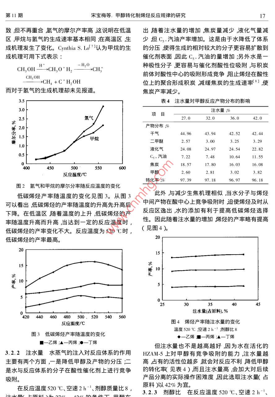 16石油煉制與化工2006年 第37卷氣燒焦再生用紅外裝置直接測出煙氣中焦炭的含表2甲醇在固定流化床 上反應的產(chǎn)物分布量最后計算出焦炭產(chǎn)率。項目數(shù)據(jù)產(chǎn)物分布%空氣一1[紅外定碳儀]干氣32.13氧氣一C裂化氣收集處二甲醚肉化|液化氣25.66.預熱器t出水器C5+汽油4.53焦炭6. 64甲醇25.66化爐進水爺轉(zhuǎn)化率,%74.34反應器烯烴產(chǎn)率%水-級丫二級乙烯9.28油收I油收丙烯12.02圖1小型固定流化床裝 置流程丁烯3. 602.3計算方法物料平衡計算都是按CH ~CH2計在處理物3.2工藝參數(shù)對甲醇在固定流化床上反應的影響料平衡數(shù)據(jù)時,甲醇參與計算的量( m甲醇)按每-3.2.1反應溫度 在劑醇質(zhì)量比為8 ,空速為1 h-1注水量(占原料)為92%的條件下,甲醇在個CH,OH分子中含一個CH2計即:420~560 C反應溫度條件下的產(chǎn)物分布見表3。m甲醇=mo x 14/32從表3可以看出在較低反應溫度下,甲醇轉(zhuǎn)化率式中mo表示甲醇加入量go同樣在計算二甲醚的產(chǎn)率時按二甲醚中的較低,此時產(chǎn)物中二甲醚含量較高。升高溫度,甲C2H。計算。假如計算得出的產(chǎn)率為10%實際的醇的轉(zhuǎn)化率增加產(chǎn)物中的二甲醚含量減少。說明在MTO的反應中二甲醚是重要的中間產(chǎn)物°].二甲醚產(chǎn)率( m_甲醚)計算公式為:從表3還可以看出,隨著反應溫度的升高,干氣和m二甲醚=10% x46/28焦炭產(chǎn)率不斷增加,主要原因是溫度升高,反應速3結(jié)果與討論3.1甲醇在固定流化床 上反應產(chǎn)物分布特征率加快轉(zhuǎn)化率升高,更有利于甲醇轉(zhuǎn)化為汽油反使用MMY催化劑在520 C、空速8h~'、劑醇應的進行生成液體產(chǎn)品。當溫度進-步升高時質(zhì)量比為8注水占原料92%的條件下,甲醇在固有較多的焦炭快速生成焦炭覆蓋在催化劑表面或定流化床上反應的產(chǎn)物分布見表2。從表2可以分子篩空腔中,減少了空腔的自由空間較大的分看出,甲醇有25.66%未轉(zhuǎn)化,產(chǎn)物中含有5.38%子從空腔逸出的速率下降滯留在空腔內(nèi)的大分子二甲醚。從產(chǎn)物分布來看與烴類裂化反應產(chǎn)物相或生成焦炭使焦炭產(chǎn)率升高或生成分子直徑小的似,也會出現(xiàn)焦炭和干氣焦炭的產(chǎn)率為6.64%,烴類逸出使干氣的量上升。遠大于Lurgi的MTP工藝的焦炭產(chǎn)率( 0.表3甲醇在不同反應溫 度下的產(chǎn)物分布01% y4]干氣的產(chǎn)率也較高達到32. 13%(其中反應溫度/C甲烷的產(chǎn)率達到19.17% )。另外在此條件下,乙420 440 460 480 500 52( ) 540 560烯、丙烯和J烯的收率分別為9.28%,12.02%3.60%與國外公司開發(fā)的MTO工藝產(chǎn)品分布數(shù)據(jù)8.27 9.95 12.89 16.09 24.64 32.13 35.85 43.56(當MTO以最大量生產(chǎn)乙烯時,乙烯、丙烯和丁烯二甲醚 19.54 16.7914.9612.167.595.384.59 4.38的收率分別為46% 30% 9% °]相比相差較大。液化氣16.96 21.17 24.13 26.64 26.41 25. 6624.30 21.33這是因為國外公司所選用的催化劑的活性組分是Cs.汽油5.64 6.63 6.69 7.00 6.99 4.53 6.09 4.05SAP0-34系列弱酸位較多孔徑較小孔道密度較2.14 2.21 2.87 4.29 5.83 6.64 7.92 9.747.4543.25 38.46 33.82 28.54 25.66 21.25 16. 98高,可利用的比表面積大,因此烯烴選擇性高焦轉(zhuǎn)化率% 52.54 56.75 61.53 66.17 71.46 74.34 76.75 83.02炭產(chǎn)率小。本研究采用的催化劑的孔徑較大酸性較強并且反應溫度比較高(520C)所以甲醇反氫氣和甲烷的摩爾分率隨反應溫度的變化趨應的二次產(chǎn)物一部分轉(zhuǎn)化為焦炭另-部分裂化成勢見圖2。從圖2可以看出氫氣和甲烷在較低溫小分子烯烴:國蹈焦炭、干氣的產(chǎn)率高。度區(qū)摩爾產(chǎn)率基本相同在較高溫度區(qū)雖然趨勢一第11期宋寶梅等.甲醇轉(zhuǎn)化制烯烴反應規(guī)律的研究17致但不再重合氫氣的摩爾產(chǎn)率高這說明在低溫出隨著注水量的增加焦炭量減少液化氣量減區(qū),甲烷與氫氣的生成速率基本相同在高溫區(qū)生少但C3.汽油產(chǎn)率增加。這是由于水降低了體系.成機理發(fā)生了變化。Cynthia s. Lo 7認為甲烷的生,的分壓,使得生成的相對較大的分子更容易擴散到成機理可用下式表示:催化劑表面,因此Cs.汽油的量增加;另外水是一H-H20.種極性分子更容易與催化劑酸性位吸附,與積炭CH,OH-→CH,O*H2→CH$前體對酸性中心的吸附形成競爭阻止烯烴在酸性CH,OH>CH, +C+ H2OH位.上的聚合形成積炭減緩焦炭的生成速率(8] ,使而對于氫氣的生成機理卻未見報道。焦炭產(chǎn)率減少。3.5 r表4注水量對甲醇 反應產(chǎn)物分布的影響3.0注水量%頁目.5 t氫氣27.032.036.042.0產(chǎn)物分布%柵2.0卜干氣44.9643.9442.5242.44.5甲烷二甲醚.2. 573. 003.253.29.0 F液化氣24. 0824. 9724. 5422. 82Cs+汽油7.227.4810.6411.55焦炭18.5717.8016. 03.16.0840045050050600甲醇2.60.2.813.023.82反應溫度/C轉(zhuǎn)化率%97.3997. 1896.9796.18圖2氫氣和甲烷的摩爾分率隨反應溫度的變化低碳烯烴產(chǎn)率隨溫度的變化見圖3。從圖3此外與減少生焦機理相似當水分子與烯烴可以看出低碳烯烴的產(chǎn)率隨溫度的升高先升高后中間產(chǎn)物在酸中心上競爭吸附時迫使烯烴及時從下降。在低溫區(qū)隨著溫度的上升,低碳烯烴的產(chǎn)反應區(qū)逸出,水的添加有利于提高低碳烯烴選擇率隨溫度升高而升高當達到一定的反應溫度時,性。因此隨著注水量的增加烯烴的產(chǎn)率略有提高低碳烯烴的產(chǎn)率變化不大。反應溫度為520 C時,(見圖4 )。低碳烯烴的產(chǎn)率最高。20 r155t冊10