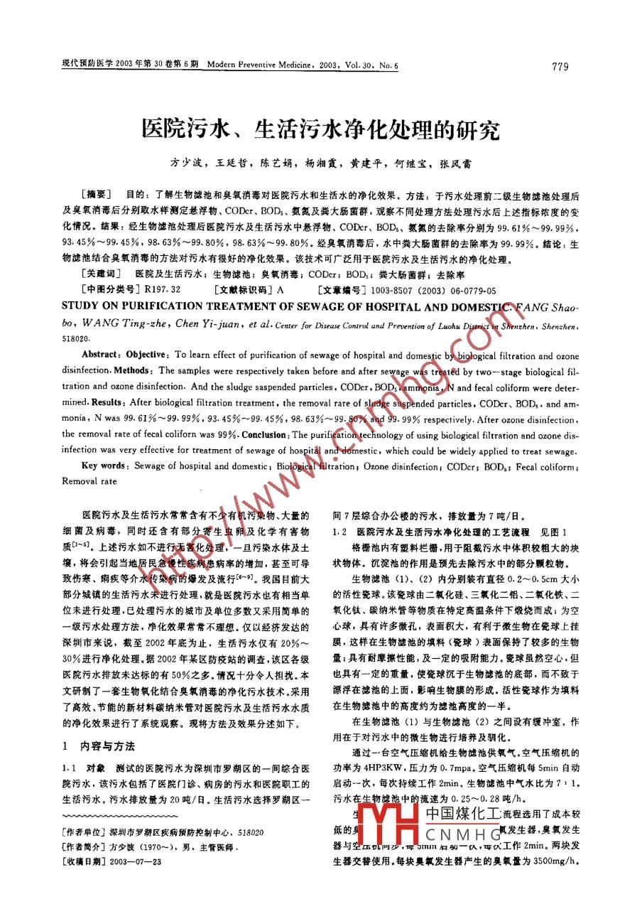 現(xiàn)代預(yù)防醫(yī)學(xué)2003年第30卷第6期Modern Preventive Medicine, 2003, Vol 30. No.6779醫(yī)院污水、生活污水凈化處理的研究方少波,王廷哲,陳藝娟,楊湘霞,黃建平,何繼寶,張風(fēng)雷[摘要]目的: 了解生物濾他和臭氧消毒對(duì)醫(yī)院污水和生活水的凈化效果.方法,于污水處理前二級(jí)生物健池處理后及臭氧消毒后分別取水樣測(cè)定懸浮物、CODer. BOD3、氨氮及糞大腸菌群,觀(guān)察不同處理方法處理污水后上述指標(biāo)依度的變化情況。結(jié)果:經(jīng)生鈞濾袍處理后醫(yī)院污水及生活污水中懸浮物、CODer. BOD,、 氨氮的去除率分別為99. 61%~99.99%,93. 45% ~99.45%,98. 63%~99. 80%,98. 63%~ 99.80%。經(jīng)臭氧消毒后.水中糞大腸菌群的去除率為99. 99%。結(jié)論:生鈞濾池結(jié)合臭氧消毒的方法對(duì)污水有很好的凈化效果。該技術(shù)可廣泛用于醫(yī)院污水及生活污水的凈化處理。[關(guān)建詞]醫(yī)院及生活污水; 生物濾弛;臭氟消毒; CODer; BOD3;糞大腸菌群;去除率[中團(tuán)分類(lèi)號(hào)] R197. 32[文獻(xiàn)標(biāo)識(shí)碼] A[文章編號(hào)] 1003-8507 (2003) 06-0779-05STUDY ON PURIFICATION TREATMENT OF SEWAGE oF HOSPITAL AND DOMESTIC. FANG Shao-bo,WANG Ting-zhe, Chen Yi-juan, et al. Center for Diseuse Control and Prevention of Luwohu Dirict in Shenrhen. Shenher,518020.Abstract: Objective: To learn efct of purification of sewage of hospital and domestic by biological filtration and ozonedisinfection. Methods: The samples were respectively taken before and after sewage was treated by two- stage biological fil-tration and ozone disinfection. And the sludge saspended particles, CODer , BOD, ammonia, N and fecal coliform were deter-mined. Results: After biological filtration treatment,the removal rare of sludge suspended particles, CODer. BOD,. and am.monia, N was 99. 61% ~ 99.99%, 93. 45%-99.45% , 98. 63%~ 99.80% and 99. 99% respectively. After ozone disinfection,the removal rate of fecal coliforn was 99%. Concluston: The purification technology of using biological filtration and ozone dis-infection was very efetive for treatment of sewage of bhospital and domestic, which could be widely applied to treat sewage.Key words: Sewage of bospital and domestic | Biological fltation; Ozone disinfection CODer; BOD3; Fecal coliform;Rermoval rate醫(yī)院污水及生活污水常常含有不少有機(jī)污染物、大量的間7層綜合辦公樓的污水,排放量為7噸/日。細(xì)菌及病毒,同時(shí)還含有部分寄生蟲(chóng)卵及化學(xué)有害物1.2醫(yī)院污 水及生活污水凈化處理的工藝流程見(jiàn)圖 1質(zhì)[~日。上述污水如不進(jìn)行無(wú)害化處理,-旦污染水體及土格柵池內(nèi)有塑料欄柵,用于阻截污水中體積較粗大的塊壤,將會(huì)引起當(dāng)?shù)鼐用窦甭约膊』疾÷实脑黾樱踔量蓪?dǎo).狀物體.沉淀池的作用是預(yù)先去除污水中的部分顆粒物。致傷寒、痢疾等介水傳染病的爆發(fā)及流行06-0]。我國(guó)目前大生物濾池(1)、 (2)內(nèi)分別裝有直徑0. 2~0.5cm大小部分城鎮(zhèn)的生活污水未進(jìn)行處理,就是醫(yī)院污水也有相當(dāng)單的活性瓷球。該瓷球由二氧化硅、三氧化二鋁、二氧化鐵、二位未進(jìn)行處理,已處理污水的城市及單位多數(shù)又采用簡(jiǎn)單的氧化鈦、磯納米管等物質(zhì)在特定高溫條件下煅燒而成:為空一級(jí)污水處理方法,凈化效果常常不理想。僅以經(jīng)濟(jì)發(fā)達(dá)的心球,具有許多徽孔,表面積大,有利于微生物在瓷球上掛深圳市來(lái)說(shuō),截至2002年底為止,生活污水僅有20%~膜,這樣在生物糖池的填料(瓷球)表面保持了較多的生物30%進(jìn)行凈化處理.據(jù)2002年某區(qū)防疫站的調(diào)查,該區(qū)各級(jí)量;具有耐摩探性能,及- -定的吸附能力。瓷球雖然空心。但醫(yī)院污水排放未達(dá)標(biāo)的有50%之多。情況十分令人擔(dān)擾。本也具有一定的重量,使瓷球沉于生物攄池的底部,而不致于文研倒了-套生物氧化結(jié)合臭氧消毒的凈化污水技術(shù)。采用縹浮在濾池的上面,影響生物膜的形成。活性瓷球作為填料了高效、節(jié)能的新材料碳納米管對(duì)醫(yī)院污水及生活污水水質(zhì)在生物濾他中的高度約為濾池高度的--半。的凈化效果進(jìn)行了系統(tǒng)觀(guān)察?,F(xiàn)將方法及效果分述如下。在生物謔池(1)與生物濾池(2)之間沒(méi)有緩沖室.作用在于對(duì)污水中的微生物進(jìn)行培養(yǎng)及馴化。1內(nèi)容與方法.通過(guò)一臺(tái)空氣壓縮機(jī)給生物攄池供氧氣.空氣壓縮機(jī)的1.1對(duì)象測(cè)試的醫(yī)院污水為深圳市羅湖區(qū)的一間綜合醫(yī)功率為4HP3KW,壓力為0. 7mpa.空氣壓縮機(jī)每5min自動(dòng)院污水,該污水包括了醫(yī)院門(mén)診、病房的污水和醫(yī)院職工的啟動(dòng)一次,每次持續(xù)工作2min.生物濾池中氣水比為7: 1. .生活污水。污水排放量為20噸/日。生活污水選擇羅湖區(qū)一污水在生物濾池中的流速為0. 25~0. 28噸/h.中國(guó)煤化工流程選用了成本較[作者單位]深圳市羅朔區(qū)疾病預(yù)防控制中心,518020低的身CN M H C發(fā)生器,奧氧發(fā)生[作者簡(jiǎn)介]方少波(1970~), 男,主管醫(yī)師.器與空本網(wǎng)少,母bmun舊的一a,母以工作2min。兩塊發(fā)[收稿日期] 2003-07-23生器交替使用.每塊臭氧發(fā)生器產(chǎn)生的臭氧量為3500mg/h.780現(xiàn)代預(yù)防醫(yī)學(xué)2003年第30卷第6期Modern Preventive Medicine, 2003. Vol. 30. No. 6空氣壓縮機(jī)醫(y