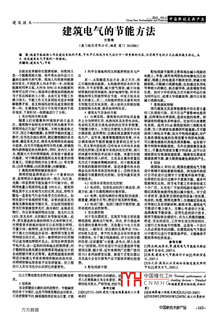 建筑技術(shù)China New Technologm中圍新技術(shù)新產(chǎn)品建筑電氣的節(jié)能方法方賢貴(廈門航空有限公司,福建廈門361006)摘要:隨著節(jié)能減排工作在建設(shè)系統(tǒng)的開展,節(jié)電早已經(jīng)成為電氣設(shè)計(jì)中一項(xiàng)重要的內(nèi)容,而實(shí)現(xiàn)節(jié)電的方式也越來(lái)越多樣化。本文談?wù)劷ㄖ姎夤?jié)能的一些措施。關(guān)鍵詞:建筑電氣;節(jié)能目前全世界都存在能源短缺,而我國(guó)又3科學(xué)合理地利用太陽(yáng)能照明技術(shù)與產(chǎn)配電線路節(jié)能則主要體現(xiàn)在減小線路的是一個(gè)能源消耗大國(guó),每年要從國(guó)外進(jìn)口大品電阻上。畢竟城市電網(wǎng)供電的電源電壓已經(jīng)量的石油和天然氣等,我國(guó)人均資源和能源其一、太陽(yáng)能是無(wú)處不有、取之不盡、用線路上的電流是不能改變的,要減少線相對(duì)貧乏不到世界人均水平的一半而我國(guó)之不竭的清潔能源。太陽(yáng)能照明技術(shù)的開發(fā)路損耗只能減小線路電阻比如通過(guò)采用電能源利用率又低大約為30%(日本的能源利利用,可節(jié)省資源減少?gòu)U氣排放減少對(duì)地導(dǎo)率較小的銅芯鋁芯做導(dǎo)體,或者縮短導(dǎo)線用率可達(dá)到57%)我國(guó)單位建筑面積能耗相球資源的使用和破壞保護(hù)地球環(huán)境。科學(xué)合長(zhǎng)度,如對(duì)于環(huán)形供電方式可將開環(huán)運(yùn)行改當(dāng)于發(fā)達(dá)國(guó)家的2-3倍,由此可見節(jié)能工作理地利用太陽(yáng)能照明在節(jié)能、環(huán)保方面具有為閉環(huán)運(yùn)行,或增大導(dǎo)線截面等都可以有效潛力很大。節(jié)能工作又關(guān)系到技術(shù)進(jìn)步和緩重大的意義。其二、太陽(yáng)能照明技術(shù)通常利用減小線路電阻。解能需矛盾,是支持國(guó)民經(jīng)濟(jì)迅速發(fā)展的重太陽(yáng)能光伏發(fā)電系統(tǒng),將人射的太陽(yáng)輻射能7重視諧波抑制要一環(huán)。在建筑電氣設(shè)計(jì)中實(shí)現(xiàn)節(jié)能的手段直接轉(zhuǎn)換為電能,提供給照明負(fù)荷現(xiàn)代建筑尤其是智能建筑中存在著大量有很多,下面針對(duì)一些措施進(jìn)行了分析。4建筑電氣設(shè)備的節(jié)能的三次諧波污染,其不僅會(huì)嚴(yán)重影響電能質(zhì)1充分利用天然光源4I空調(diào)系統(tǒng)。建筑物內(nèi)的用電設(shè)備基量還將增加功率損耗造成電能的浪費(fèi)。抑隨著人們對(duì)能源和環(huán)境保護(hù)的日益關(guān)本上分為照明燈具、電熱用具及各類電動(dòng)機(jī)。制諧波的措施有多種途徑。比如可以改善配注,建筑物中如何充分利用天然光源來(lái)節(jié)約電動(dòng)機(jī)尤其是交流電動(dòng)機(jī)的應(yīng)用非常頻繁,電系統(tǒng),選用DYnl接線組別的三相配電變照明用電已引起廣泛重視。天然光源是取之節(jié)能潛力較大。大型公共建筑大多設(shè)有中央壓器,為三次諧波電流提供環(huán)流通路;盡可能不盡、用之不竭的能源。在照明節(jié)能的實(shí)施工空調(diào)系統(tǒng)眾所周知空調(diào)系統(tǒng)是建筑中的用保持三相電壓平衡;加大中性線的截面;對(duì)產(chǎn)程中,應(yīng)當(dāng)充分加以利用制定建筑物的采光電大戶。近年來(lái),隨著智能建筑的發(fā)展,中央生高次諧波電流的負(fù)荷設(shè)置專用供電回路標(biāo)準(zhǔn)確定采光方式將采光和照明有機(jī)地結(jié)空調(diào)系統(tǒng)的節(jié)能控制越發(fā)重要而且更為可可以避免諧波對(duì)其他負(fù)荷的影響,也有助于合起來(lái)。白天盡可能地利用天然光源使建筑行。其主要內(nèi)容包括①冷凍水與冷卻水系統(tǒng)集中抑制和消除諧波。另外在諧波源設(shè)備選物內(nèi)獲得穩(wěn)定的光照條件同時(shí)室內(nèi)引入陽(yáng)的優(yōu)化控制;②冰蓄冷系統(tǒng)的優(yōu)化控制現(xiàn)行型上,盡量選用諧波含量少的設(shè)備,還可以在光既能大大節(jié)約照明能耗亦有助于提高室的冰蓄冷控制技術(shù)還很不成熟,冰蓄冷控制諧波源處安裝諧波濾波器、隔離變壓器或有內(nèi)溫度,對(duì)于降低建筑能耗也具有重要的現(xiàn)策略仍需作深入研究,尤其是在蓄冰裝置優(yōu)源諧波調(diào)節(jié)器最大限度地避免諧波的產(chǎn)生8結(jié)語(yǔ)法2光擱板;()反射高窗;(4棱鏡窗。冷系統(tǒng)的能源利用效率,促進(jìn)冰蓄冷技術(shù)的我國(guó)加入WO后我國(guó)在建筑電氣節(jié)能2高效的照明控制系統(tǒng)設(shè)計(jì)商業(yè)化應(yīng)用具有決定性的意義;③熱交換系設(shè)計(jì)領(lǐng)域中面臨著新的挑戰(zhàn),因?yàn)閲?guó)外的設(shè)照明控制是照明設(shè)計(jì)中一個(gè)重要的內(nèi)統(tǒng)溫差與流量的優(yōu)化控制;④變風(fēng)量系統(tǒng)等計(jì)公司在設(shè)計(jì)過(guò)程中十分重視環(huán)保和節(jié)能,容,是照明設(shè)計(jì)基礎(chǔ)理論的一部分,與燈具、控制技術(shù)如果我們?cè)谠O(shè)計(jì)過(guò)程中不重視節(jié)能,就有可光源一樣是照明節(jié)能實(shí)施中不可缺少的。照42給排水系統(tǒng)的優(yōu)化控制明用電量占我國(guó)用電總量10%左右,建筑照43電動(dòng)機(jī)。包括電動(dòng)機(jī)的正確選型調(diào)十分廣泛,從發(fā)電廠開始到線路末端的用戶明在其中又占有相當(dān