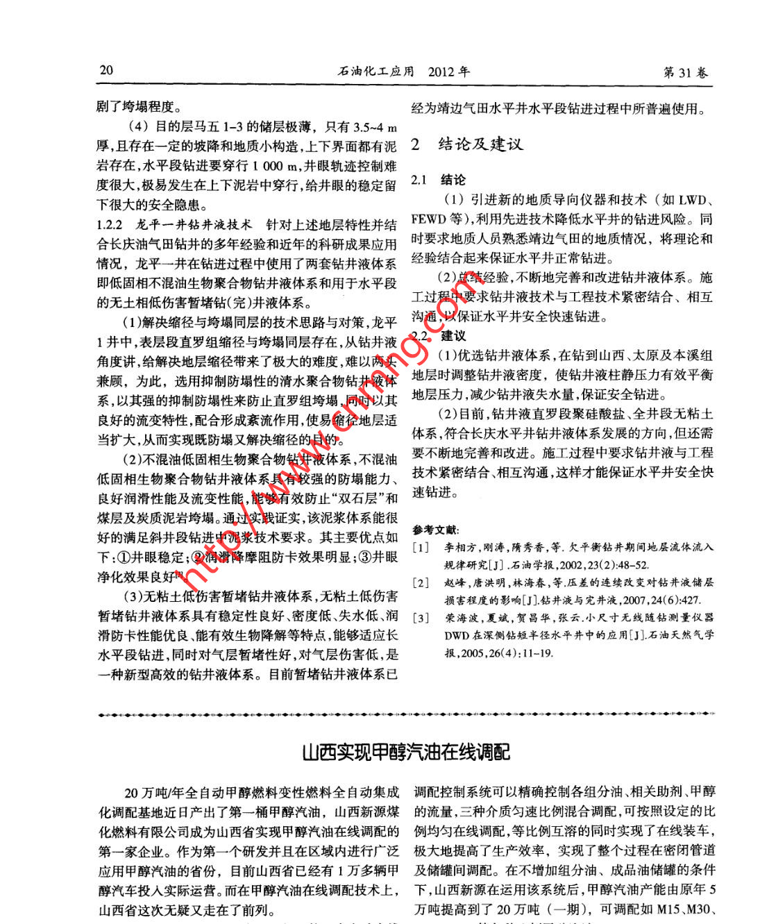 20石油化工應(yīng)用2012 年第31卷劇了垮塌程度。經(jīng)為靖邊氣田水平井水平段鉆進(jìn)過程中所普遍使用。(4)目的層馬五1-3的儲層極薄,只有3.5~4 m厚,且存在- -定的坡降和地質(zhì)小構(gòu)造,上下界面都有泥2結(jié) 論及建議巖存在,水平段鉆進(jìn)要穿行1 000 m,井眼軌跡控制難2.1 結(jié)論度很大,極易發(fā)生在上下泥巖中穿行,給井眼的穩(wěn)定留下很大的安全隱患。(1)引進(jìn)新的地質(zhì)導(dǎo)向儀器和技術(shù)( 如LWD、1.2.2龍平一井鉆 井液技術(shù)針對 上述地層特性并結(jié)FEWD等),利用先進(jìn)技術(shù)降低水平井的鉆進(jìn)風(fēng)險。同合長慶油氣田鉆井的多年經(jīng)驗(yàn)和近年的科研成果應(yīng)用時要求地質(zhì)人員熟悉靖邊氣田的地質(zhì)情況,將理論和情況,龍平一井在鉆進(jìn)過程中使用了兩套鉆井液體系經(jīng)驗(yàn)結(jié)合起來保證水平井正常鉆進(jìn)。即低固相不混油生物聚合物鉆井液體系和用于水平段(2)總結(jié)經(jīng)驗(yàn),不斷地完善和改進(jìn)鉆井液體系。施.工過程中要求鉆井液技術(shù)與工程技術(shù)緊密結(jié)合、相互的無土相低傷害暫堵鉆(完)井液體系。(1)解決縮徑與垮塌同層的技術(shù)思路與對策,龍平溝通,以保證水平井安全快速鉆進(jìn)。1井中,表層段直羅組縮徑與垮塌同層存在,從鉆井液2.2建議角度講,給解決地層縮徑帶來了極大的難度,難以兩頭(1)優(yōu)選鉆井液體系,在鉆到山西、太原及本溪組兼顧,為此,選用抑制防塌性的清水聚合物鉆井液體地層時調(diào)整鉆井液密度,使鉆井液柱靜壓力有效平衡系,以其強(qiáng)的抑制防塌性來防止直羅組垮塌,同時以其地層壓力,減少鉆井液失水量,保證安全鉆進(jìn)。良好的流變特性,配合形成紊流作用,使易縮徑地層適(2)目前,鉆井液直羅段聚硅酸鹽、全井段無粘土當(dāng)擴(kuò)大,從而實(shí)現(xiàn)既防塌又解決縮徑的目的。體系,符合長慶水平井鉆井液體系發(fā)展的方向,但還需(2)不混油低固相生物聚合物鉆井液體系,不混油要不斷地完善和改進(jìn)。施工過程中要求鉆井液與工程低固相生物聚合物鉆井液體系具有較強(qiáng)的防塌能力、技術(shù)緊密結(jié)合、相互溝通,這樣才能保證水平井安全快良好潤滑性能及流變性能,能夠有效防止“雙石層”和速鉆進(jìn)。煤層及炭質(zhì)泥巖垮塌。通過實(shí)踐證實(shí),該泥漿體系能很參考文獻(xiàn):好的滿足斜井段鉆進(jìn)中泥漿技術(shù)要求。其主要優(yōu)點(diǎn)如[1] 李相方,剛濤,隋秀香,等.欠平衡鉆井期間地層流體流入下:①井眼穩(wěn)定;②潤滑降摩阻防卡效果明顯;③井眼規(guī)律研究[J]石油學(xué)報,2002,23(2):48-52.凈化效果良好叫。[2趙峰,唐洪明,林海春,等.壓差的連續(xù)改變對鉆井液儲層(3)無粘土低傷害暫堵鉆井液體系,無粘土低傷害損害程度的影響[J].鉆井液與完井液,2007 ,24(6):427.暫堵鉆井液體系具有穩(wěn)定性良好、密度低、失水低、潤[3] 榮海波,夏斌, 賀昌華,張?jiān)?小尺寸無線隨鉆測量儀器滑防卡性能優(yōu)良、能有效生物降解等特點(diǎn),能夠適應(yīng)長DWD在深側(cè)鉆短半徑水平井中的應(yīng)用[J]石油天然氣學(xué)水平段鉆進(jìn),同時對氣層暫堵性好,對氣層傷害低,是報,2005,26(4):11-19.一種新型高效的鉆井液體系。目前暫堵鉆井液體系已山西實(shí)現(xiàn)甲醇汽油在線調(diào)配20萬噸/年全自動甲醇燃料變性燃料全自動集成調(diào)配控制 系統(tǒng)可以精確控制各組分油、相關(guān)助劑甲醇化調(diào)配基地近日產(chǎn)出了第一桶甲醇汽油, 山西新源煤的流量, 三種介質(zhì)勻速比例混合調(diào)配,可按照設(shè)定的比化燃料有限公司成為山西省實(shí)現(xiàn)甲醇汽油在線調(diào)配的例均勻在線 調(diào)配,等比例互溶的同時實(shí)現(xiàn)了在線裝車,第-家企業(yè)。作為第一-個研發(fā)并 且在區(qū)域內(nèi)進(jìn)行廣泛極大地提高了 生產(chǎn)效率,實(shí)現(xiàn)了整個過程在密閉管道應(yīng)用甲醇汽油的省份,目前山西省已經(jīng)有1萬多輛甲及儲罐間調(diào)配。 在不增加組分油、成品油儲罐的條件醇汽車投人實(shí)際運(yùn)營。而在甲醇汽油在線調(diào)配技術(shù)上,下 ,山西新源在運(yùn)用該系統(tǒng)后,甲醇汽油產(chǎn)能由原年5山西省這次無疑又走在了前列。萬噸提高到了20萬噸(一期),可調(diào)配如M15、M30、與傳統(tǒng)的甲醇汽油生產(chǎn)工藝相比較,全自動在線M85 、M100等各種比例甲醇汽油。