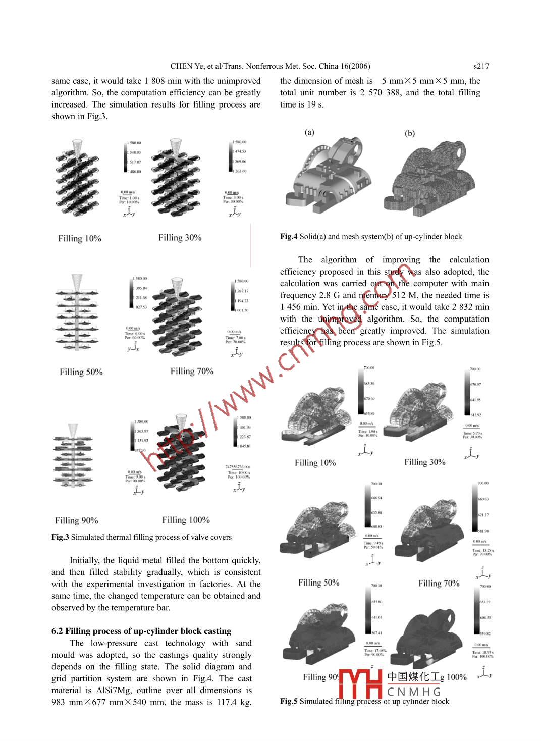 Available online at www.sciencedirect.comsCIENCEz @oIREcT.Transactions of.Nonferrous Metals罵PSociety of ChinaScienceTrans. Nonferrous Met. Soc. China 16(2006) s214-s218Presswww.csu.edu.cn/ysxb/Numerical simulation for thermal flow filling process of castingCHEN Ye(陳嘩), ZHAO Yu-hong(趙宇宏)尸,HOU Hua(侯華)'1. College of Materials Science and Engineering, North University of China, Taiyuan 03005 1, China;2. College of Materials Science and Engineering, Taiyuan University of Technology, Taiyuan 030024, ChinaReceived 20 April 2006; accepted 30 June 2006Abstract: The solution algorithm (SOLA) method was used to solve the velocity and pressure field of the thermal flow fllingprocess, and the volume of fluid (VOF) method for the free surface problem. Since the“donor-acceptor rule often results in the freeinterface vague, the explicit difference method was adopted, and a method describing the free surface state at0