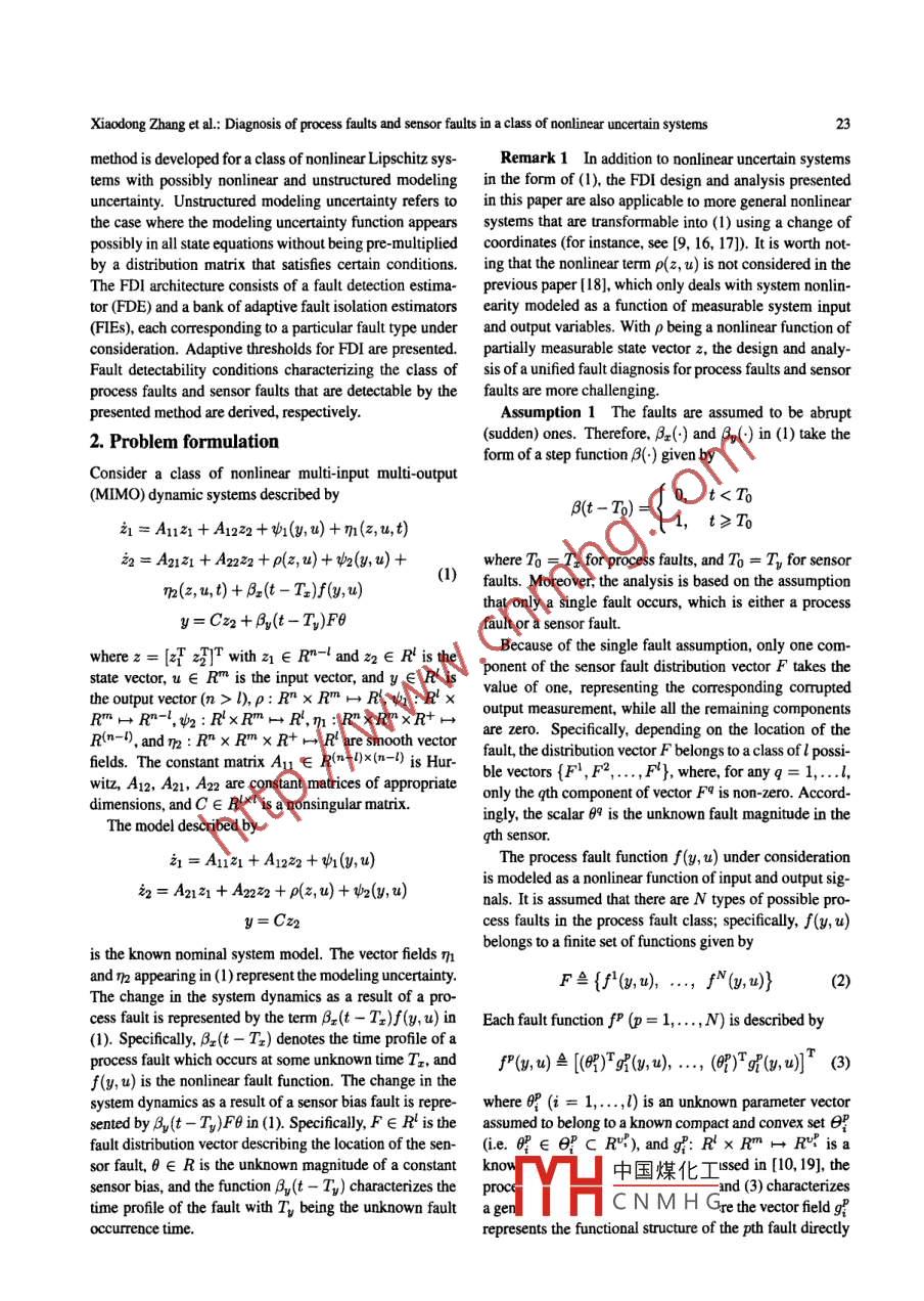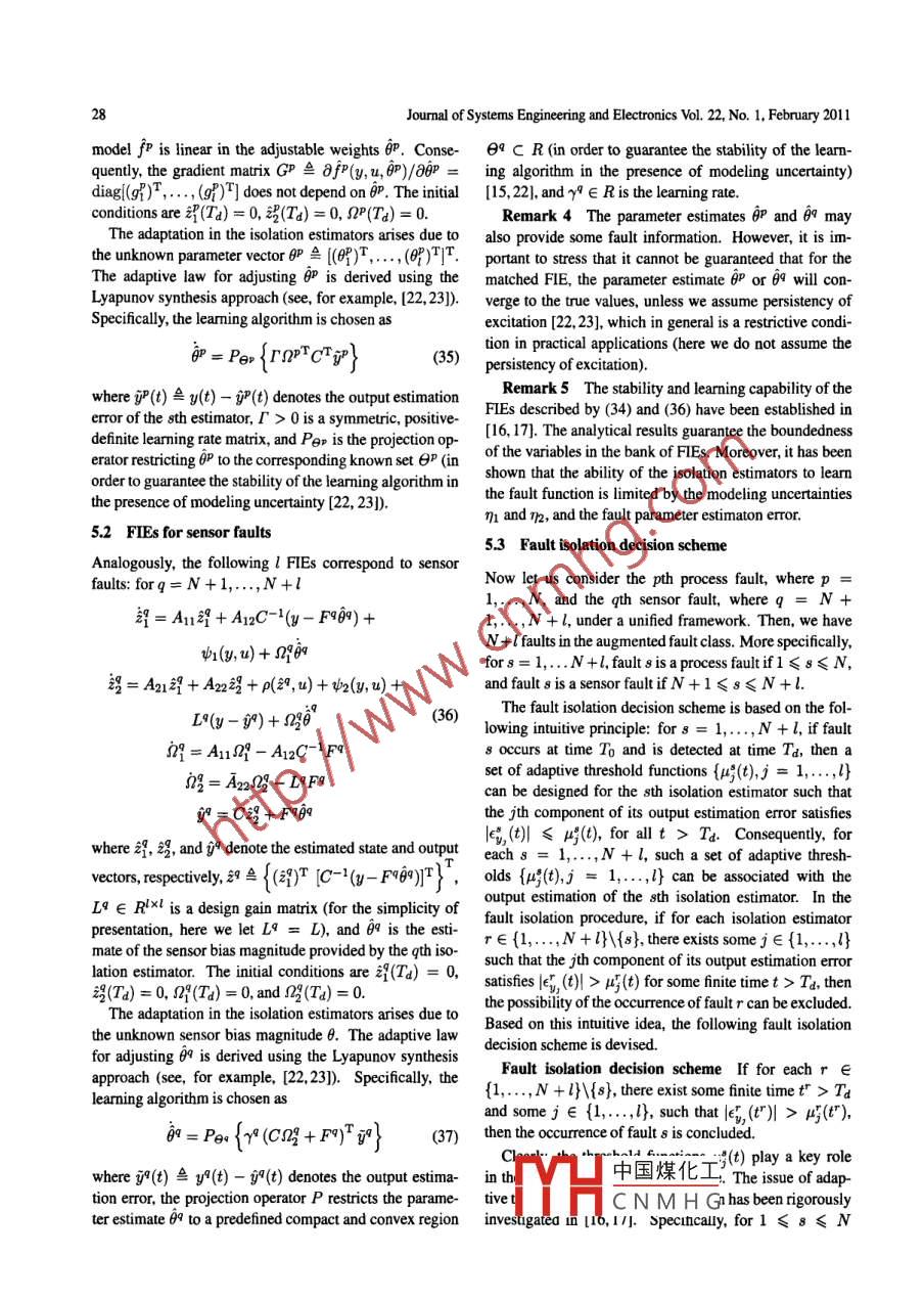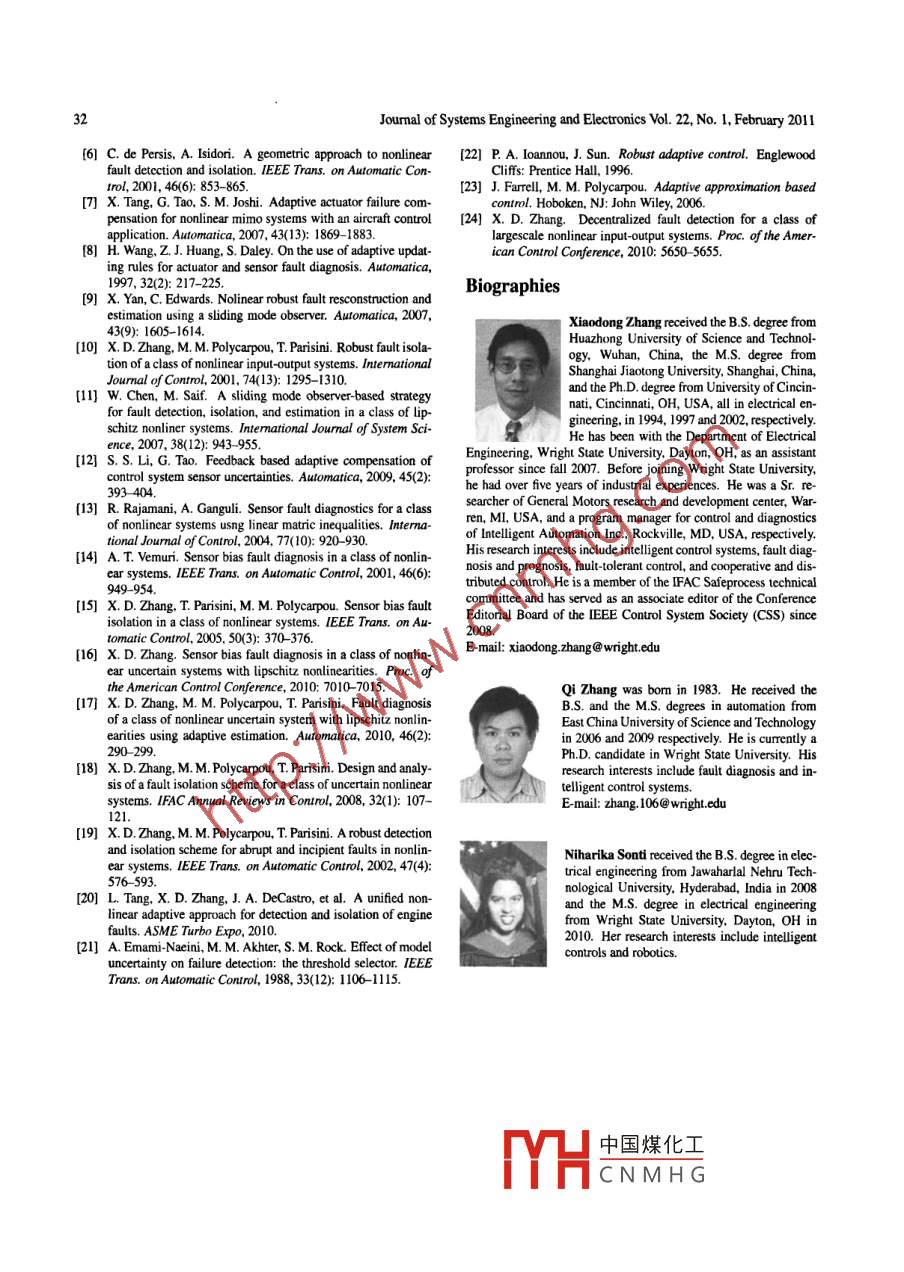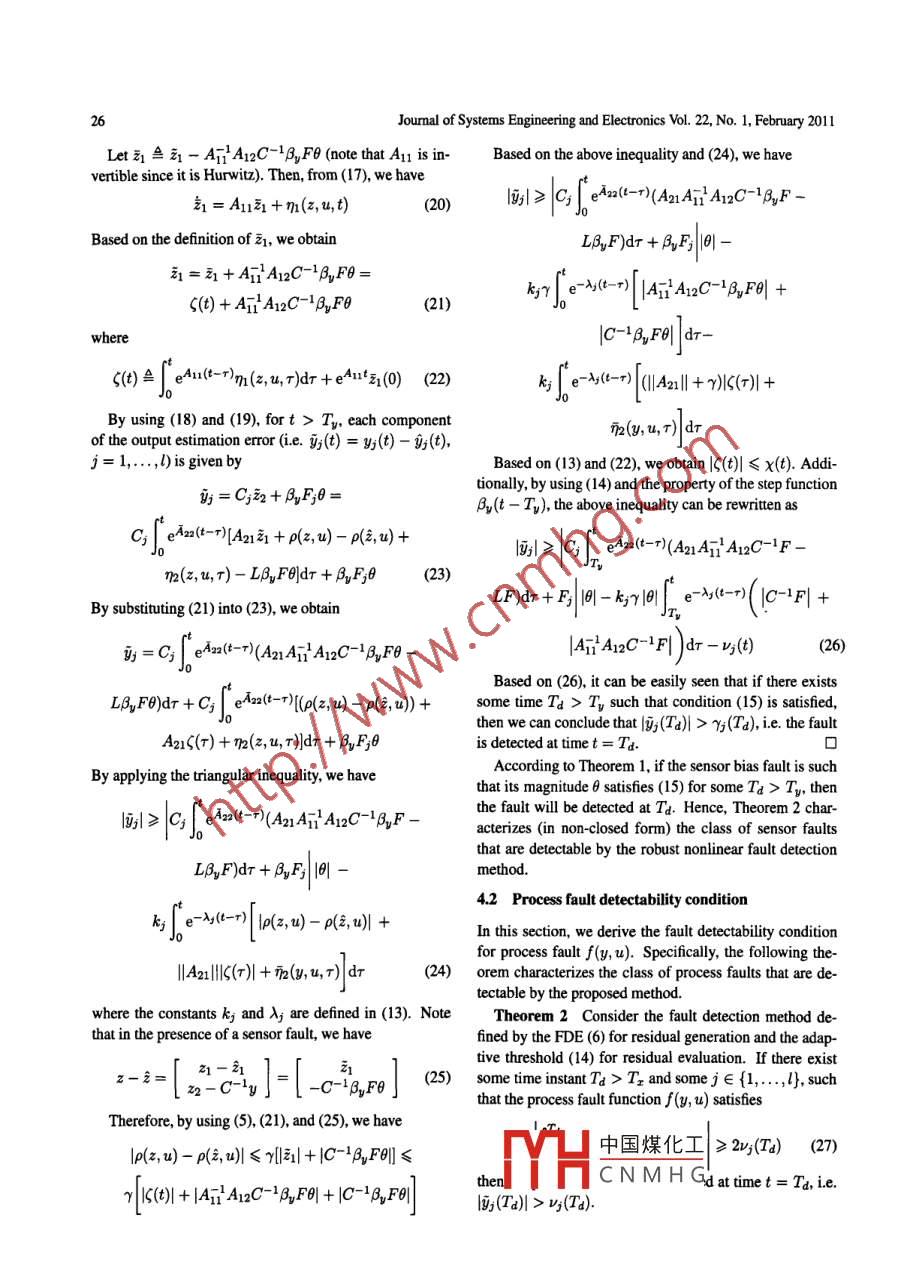 Journal of Systems Engineering and Electronics Vol. 22, No. 1, February 2011, pp.2232Available online at www.jseepub.comDiagnosis of process faults and sensor faults ina class of nonlinear uncertain systemsXiaodong Zhang*, Qi Zhang, and Niharika SontiDepartment of Elcrical Engineering, Wright State University, Dayton, OH 45435, USAAbstract: This paper presents a fault diagnosis method for pro-Moreover, a faulty sensor output may also cause inaccuratecess faults and sensor faults in a class of nonlinear uncertaindiagnosticlprognostic results, resulting in unecessary re-systems. The faut detection and isolation architecture consistsplacement of system component or mission abortion. Oneof a faut detection estimator and a bank of adaptive isolation es-of the most difficult problems in sensor validation is that, intimators, each corresponding to a particular fault type. Adaptivemany practical systems, both the process components (i.e.thresholds ftor fault detection and isolation are presented. Faultdetectability cnditins characterizing the class of process faultsactuators and the controlled plant) and sensors are proneand sensor fauts that are detectable by the presented method areto faults. However, many nonlinear fault diagnostic meth-derived. A simulation example of robotic arm is used to ilustrateods deal with process faults and sensor faults separately,the efectiveness of the fauit diagnosis method.especially for nonlinear uncertain systems. Specifcally,Keywords: fault detection, fault isolatin, fault detecabilit, ro-when dealing with sensor validation, it is usually assumedbustness, sensor bias, process faults.that there are no process faults; when dealing with processfaults, it is often assumed that the sensors are“healthy". InDOI: 10.3969/ssn.10044132 2011.01.003the former case, a process fault may be misinterpreted as asensor fault; in the ltter case, a sensor fault may be misin-1. Introductionterpreted as a process fault. Both cases may potentiallyIn recent years, there was significant research activity inlead to a high false alarm rate and unnecessary mainte-the design and analysis of fault diagnosis and accommo-nance. Therefore, it would be desirable to consider sensordation schemes (see, for example, [1- 4]). Considerablefaults and process faults under one unified framework.research effort was devoted to the development of faultIn previous papers [10, 15-17], nonlinear fault diagno-diagnosis and accommodation schemes for nonlinear sys- sis methods were developed for process faults and sensortems in the framework of various kinds of assumptions andfaults, respectively. However, process faults and sensorfault scenarios (seior instance, [5- -10], and the refer-faults were considered separately. Specifically, for the pro-ences cited therein).cess fault diagnosis problem [10, 17], we assumed the sen-The overall fault diagnosis procedure can be dividedsors are healthy, and for the sensor fault diagnosis probleminto three steps: () fault detection is the process of deter- [15, 16], we assumned there are no process faults. In [18],mining whether a fault has occurred or not; (iI) fault iso-a unified fault diagnosis method for sensor faults and pro-lation deals with the issue of determining the location/type cess faults was developed for a class of nonlinear uncertainof fault; and (ii) fault estimation provides an estimate ofsystems in which the known system nonlinearity is repre-the magnitude or severity of the fault. In addition to faultsented as a function of known system signals (i.e. inputdiagnosis, there is also the problem of fault accommoda-and output variables). In this paper, we extend these pre-tion, which deals with control reconfiguration methods forvious results by considering a different class of nonlinearcompensating for the effects of faults.systems, in which the known nonlinearity is modeled as aAn important area of fault diagnosis and accommoda-nonlinear function of the system input and state variablestion is sensor validation and fault-tolerant control[11-15].and satisfes a Lipschitz condition. With partially mea-A sensor fault may lead to poor regulation or tracking per-surable states and the Dresence of modeling uncertainty,formance, or even affect the stability of control systems. the de中國煤化工sis methods becomeManuseript received November 18, 2010.more|YHCNMHG*Coresponding author.uus paper, d lauit ueuecuon and isolation (FDI)Xiaodong Zhang et al: Diagnosis of process faults and sensor faults in a class of nonlinear uncertain systems23method is developed for a class of nonlinear Lipschitz sys-Remark 1 In addition to nonlinear uncertain systemstems with possibly nonlinear and unstructured modelingin the form of (1), the FDI design and analysis presenteduncertainty. Unstructured modeling uncertainty refers to in this paper are also applicable to more general nonlinearthe case where the modeling uncertainty function appearssystems that are transformable into (1) using a change ofpossibly in all state equations without being pre-multiplied coordinates (for instance, see [9, 16, 17]). It is worth not-by a dstribution matrix that satisfies certain conditions.ing that the nonlinear term p(z, u) is not considered in theThe FDI architecture consists of a fault detection estima-previous paper [18], which only deals with system nonlin-tor (FDE) and a bank of adaptive fault isolation estimators earity modeled as a function of measurable system input(FIEs), each corresponding to a particular fault type underand output variables. With P being a nonlinear function ofconsideration. Adaptive thresholds for FDI are presented.partially measurable state vector z, the design and analy-Fault detectability conditions characterizing the class ofsis of a unified fault diagnosis for process faults and sensorprocess faults and sensor faults that are detectable by thefaults are more challenging.presented method are derived, respectively.Assumption 1 The faults are assumed to be abrup