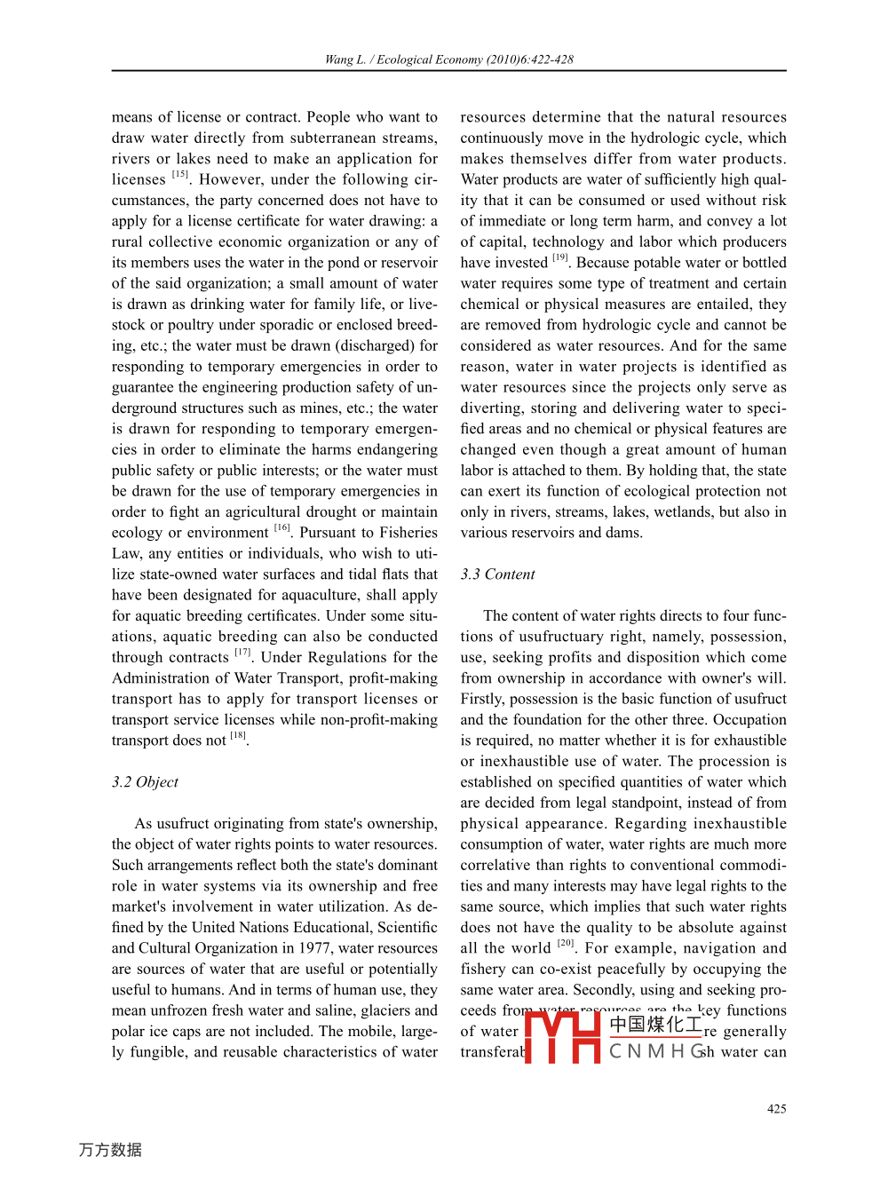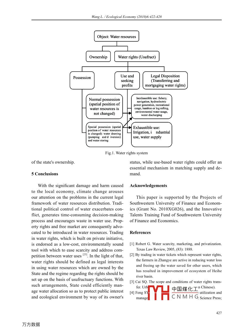 Ecological Economy (2010)6:422-428Empirical StudyRebuilding water rights system from the perspective of usufructWANG LeiSchool of Law, Southwestern University of Finance and Economics, Chengdu 610074, P: R. ChinaAbstract: As the source of life, water is indispensable to human beings. Being aware of the water stress imposed bypopulation growth, climate change, rapid urbanization, pollution, many scholars and decision makers argue that theestablishment of water rights cand their system is the primary measure to tackle the water crisis problem. However;no consensus has been reached regarding the definition, nature and content of water rights both practically anaacademically. By examining the existing theories regarding water rights, this article tries to redefine the entitlementsfrom the aspect of civil law. Meanwhile, it provides a system which classifies various rights by the four fiunctions ofusufruct.Keywords: Water rights; Water rights system; Water resources; Usufruct1 Introductiontransfer has been recognized by the governmentand non-government advocates as both an efficientThe recent drought ravaging southwest China and conflict-reducing means to achieve environ-for months, had led millions of residents in Gui- mental and ecological ends such as maintainingzhou, Yunnan, Sichuan, Chongqing, and Guangxi instream flow, conservation of soil and water 2.faced up with drinking water shortages. Although On the contrary, the academic field fails to makeit seems that the disaster resulted from the impact a strong response to the practical needs of waterof greenhouse gases on the hydrologic cycle, the market and water trading, which actually involvesdestabilized climate should not take all the at- the definition of water rights and the identificationtribution. A lack of effective water rights systemsof their system.creates major problems for the management ofSince a clear definition of property rights is aincreasingly scarce water supplies.requisite for market economy, this article tries toAs the source of life, water is indispensable to redefine water rights from the aspects of subject,human beings. However, the distribution of this object and content, by examining the existingnatural resource in China varies largely from place theories regarding water rights. In the meanwhile,to place and the imbalance between supply and it provides a system which classifies various rightsdemand exacerbates, especially under the context by the functions of usufructuary right.of the unexpected natural calamity. It has beenargued that the best way to meet the challenge is 2 An overview and analysis of existing theoriesthe introduction of market mechanism into water concerning water rightssupply. The construction of the market-based in-stitutional and regulatory systems is the primaryThere are various theories about water rights,measure to tackle the water crisis problem. The especially relating to the definition of water rights.transfer of water required by market can offer sub- In sum, those explanations can be classified intostantial economic efficiencies in distributing water two schools in accordance with whether ownershipto those who value it most "I. What's more, water of water resources is included.2.1 A system of rights including ownership of wa-Received June 16, 2010; Accepted Aug. 10, 2010* E-mail address: leiwangl 140@hotmail.comter resources中國(guó)煤化工Author: WANG Lei (1979- ), female, lecturer, PhD, specializedin water law.Professor,MYHC N M H Gargument422◎2010 Ecological Economy (ttp://xb.suse .edu.cn/)Wang L. / Ecological Economy (2010)6:422-428about water rights by saying that the system con- paid on utilization instead of ascription of prop-sisting of the ownership, the usufructuary right,erty. Hence, it is unnecessary to put ownership intothe right for public using, the administrative right,the category of water rights. Moreover, the ideathe management right of water resources, the envi- of land determining water was established underronmental right to water, and the property right ofthe historical background that water was privatelyaquatic product [3]. The same opinion was sharedowned as land, but with water being realized as .by other scholars, by holding that water rights arenon-renewable resources, it is isolated from landa group of rights containing the ownership, the and ascribed to the state or public (91 and accord-usufructuary right and the management right 4, oringly there is no need to follow the rights regimea bunch of rights covering the ownership, the usu- relating to land.fructuary right, the right for water allocation, thComprehensiveness seems to feature in thealienation right, the trading right, etc 5I. Besides,opinions regarding a group or a bunch of rights.some views narrowed the scope of the water rights However, they have caused contradiction andsystem, which only comprises the ownership andconfusion to the water rights system since thosethe usufructuary right 0. Encyclopedia of China specific rights are overlapped and some of them. Water points out that water rights mean individu-are not labeled from legal perspective. Besides, theals' or organizations' ownership and the usufruc- hybrid conception of property rights and drawingtuary right of surface and underground water”right regarding water fails to make a clear distinc-Furthermore, the right of drawing water is increas- tion between water resources and water products,ingly recognized as the key element for waterto explain the nature of water rights and, more im-resources being transformed into water products,portantly, to categorize water- drawing right in civiland reflects the distribution of water resources and rights system. Anyway, in light of the designinga means of its exhaustible consumption. Under theintention and the trading essence of the system,context, water rights are identified as a hybrid of water right means the usufructury right of waterproperty rights and drawing right regarding water,