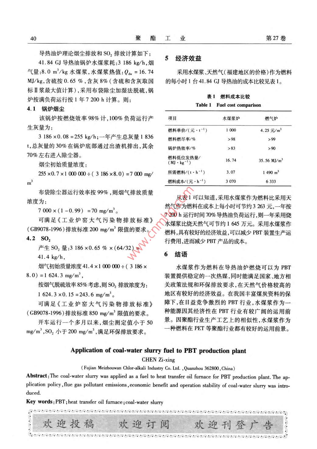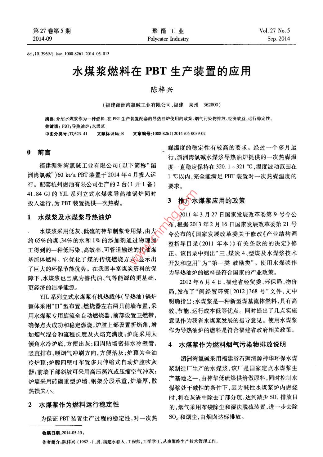 水煤漿燃料在PBT生產(chǎn)裝置的應(yīng)用