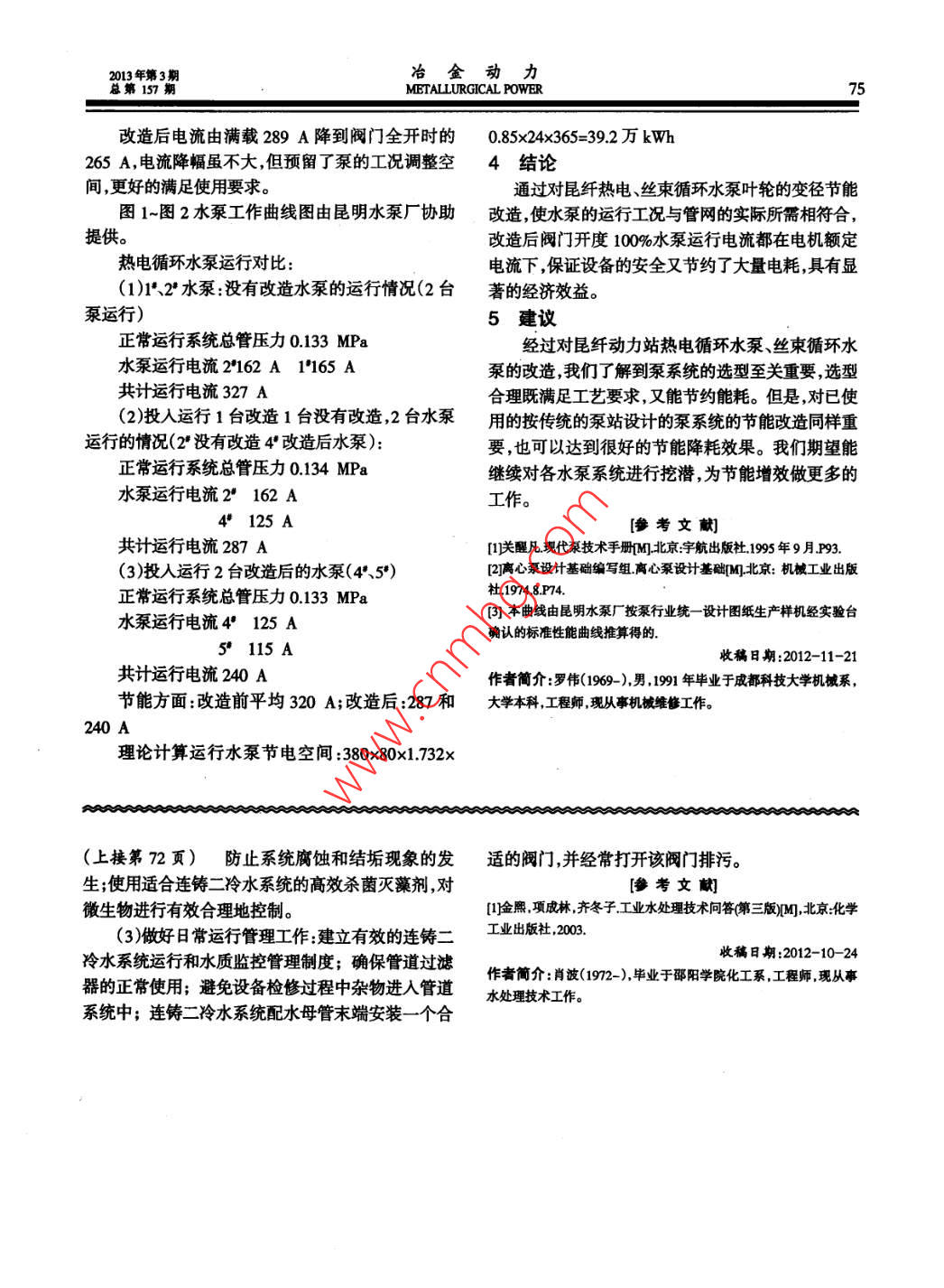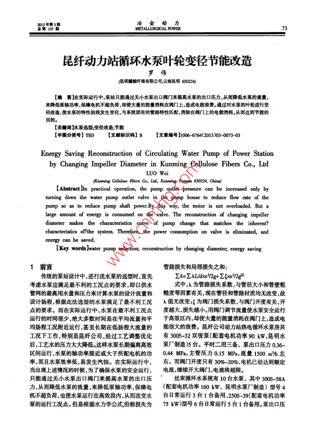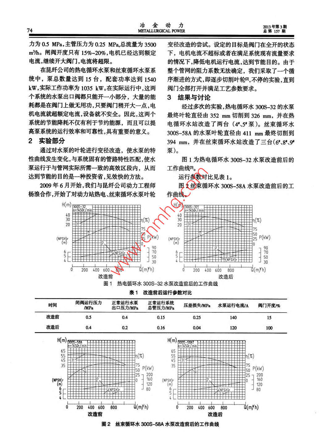 冶金動力總第157期METALLURGICAL POWER73昆纖動力站循環(huán)水泵葉輪變徑節(jié)能改造羅偉(昆明醋酸纖維有限公司,云南昆明650224)[摘要]在實(shí)際運(yùn)行中 ,泵站只能通過關(guān)小水泵出口閥門來提高水泵的出口壓力,從而降低水泵的流量,來降低泵軸功率,保障電機(jī)不超負(fù)荷,卻使大量的能量消耗在閥門上,造成電能浪費(fèi)。通過對水泵的葉輪進(jìn)行變徑改造,使水泵的特性曲線發(fā)生變化,與系統(tǒng)固有的管路特性匹配,消除在閥門上的電能消耗,從而達(dá)到節(jié)能的目的。[關(guān)鍵詞]冰泵選型;交徑改造;節(jié)能[中圈分類號] TH3[文獻(xiàn)標(biāo)識碼] B[文章編號]1006- 6764(2013)03-0073-03Energy Saving Reconstruction of Circulating Water Pump of Power Stationby Changing Impeller Diameter in Kunming Cellulose Fibers Co., LtdLUO Wei(Kunming Celulse Fibers Co, Lid, Kurming Yunnan 650224, China)[Abstract]In practical operation, the pump outlet pressure can be increased only bytuming down the water pump outlet valve in the pump house to reduce flow rate of thepump so as to reduce pump shaft power.By this way, the motor is not overloaded. But alarge amount of energy is consumed on the valve. The reconstruction of changing impellerdiameter makes the characteristics curve of pump change that matches the inherent?characteristics of?the system. Therefore, the power consumption on valve is eliminated, andenergy can be saved.[Key words ]water pump selection; reconstruction by changing diameter, energy saving1前言管路損失和局部損失之和:傳統(tǒng)的泵站設(shè)計中,進(jìn)行送水泵的選型時,首先Zh= EALdx?/2g+ Eζxu3N2g"考慮水泵應(yīng)滿足最不利的工況點(diǎn)的要求,即以供水式中,λ為管路損失系數(shù),與管徑大小和管壁粗管網(wǎng)的最高用水量和壓力來計算水泵的設(shè)計流量和糙度等因素 有關(guān),現(xiàn)在管徑和管路材質(zhì)均無改變,故設(shè)計揚(yáng)程,根據(jù)此法選型的水泵滿足了最不利工況λ值無政變;ζ為閥門損失系數(shù),與閥門開度有關(guān),開點(diǎn)的要求。而在實(shí)際運(yùn)行中,水泵在最不利工況點(diǎn)度越大,損失越小。用閥門調(diào)節(jié)流量使水泵安全運(yùn)行運(yùn)行的時間很少,絕大多數(shù)時間是在平均流量和平于高效區(qū)內(nèi),卻使大量的能量消耗在閥門上,造成電均揚(yáng)程工況附近運(yùn)行,甚至長期在低揚(yáng)程大流量的能很大的浪費(fèi)。昆纖公司動力站熱電循環(huán)水泵房共工況下工作,特別是昆纖公司,經(jīng)過工藝調(diào)整優(yōu)化有300S- 32雙吸泵(配套電機(jī)功率90 kW,昆明水后,工藝水的壓力大大降低。這樣水泵長期偏離高效泵廠制造)5臺。平時二用三備,泵出口壓力0.36~區(qū)間運(yùn)行,水泵的軸功率接近或大于所配電機(jī)的功0.44 MPa, 主管壓力0.15 MPa, 流量1500 m3/h 左率,而且水泵效率低,易發(fā)生汽蝕。在實(shí)際運(yùn)行中,右。而閥門開度只有30%~20%,電機(jī)已經(jīng)達(dá)到額定當(dāng)出現(xiàn)上述情況的時候,為了確保水泵的安全運(yùn)行,電流,繼續(xù)開大閥門,電流將超限。只能通過關(guān)小水泵出口閥門來提高水泵的出口壓'絲束循環(huán)水系統(tǒng)有10臺水泵,其中300S -58A力,從而降低水泵的流量,來降低泵軸功率,保障電(配套電機(jī)功率160 kW,昆明水泵廠制造)型號4機(jī)不超負(fù)荷,也使水泵運(yùn)行在高效段內(nèi),從而改變水臺日常運(yùn)行3臺1臺備用、250S- 39(配套電機(jī)功率泵的運(yùn)行工況點(diǎn)。但是根據(jù)水力學(xué)公式,沿程損失為75 kW)型號6臺日常運(yùn)行5臺1臺備用。泵出口壓冶金動力2013年第3期74METALLURGICAL POWER總第157期力為0.5 MPa,主管壓力為0.25 MPa,總流量為3500變徑改造的嘗試。設(shè)定的目標(biāo)是閥門在全開的狀態(tài)m2/h。閘閥開度只有15%~20% ,電機(jī)已經(jīng)達(dá)到額定下,電機(jī)電流不超標(biāo)或者在滿足系統(tǒng)現(xiàn)有流量要求電流,繼續(xù)開大閥門,電流將超限。的情況下,降低電機(jī)運(yùn)行電流,達(dá)到節(jié)能目的。由于在昆纖公司的熱電循環(huán)水泵和絲束循環(huán)水泵系整個管網(wǎng)的阻力系數(shù)無法確定,我們采取了一一個循統(tǒng)中,泵總數(shù)量達(dá)到15臺,配套功率達(dá)到1540序漸進(jìn)的方式,即逐步切削葉輪四,不停的實(shí)驗(yàn),直到kW,實(shí)際工作功率為1035 kW。在實(shí)際運(yùn)行中,這兩閥門全部打開并滿足工藝參數(shù)要求。個系統(tǒng)的水泵出口閥都只能開一小部分,大量的能3結(jié)果與討論耗都是在閥門上做無用功,只要閥門稍開大-一點(diǎn), 電經(jīng)過多次的實(shí)驗(yàn),熱電循環(huán)水300S- -32的水泵機(jī)電流就超額定電流,設(shè)備就不安全。因此,這兩個最終葉輪直徑由352 mm切削到326 mm,并在熱系統(tǒng)的節(jié)能降耗不僅有利于節(jié)約能源,而且可以提電循環(huán)水站改造了兩臺(4*、5* 泵)。絲束循環(huán)水高泵系統(tǒng)的運(yùn)行效率和可靠性,具有重要的意義。300S- -58A的水泵葉輪直徑由411 mm最終切削到2實(shí)驗(yàn)部分394 mm,并在絲束循環(huán)水站改造了三臺(6*.8*、9*通過對水泵的葉輪進(jìn)行變徑改造,使水泵的特泵)。性曲線發(fā)生變化,與系統(tǒng)固有的管路特性匹配,使水圖1為熱電循環(huán)水300S -32水泵改造前后的泵運(yùn)行于與管網(wǎng)實(shí)際所需-致的高效區(qū)段內(nèi),從而工作曲線。達(dá)