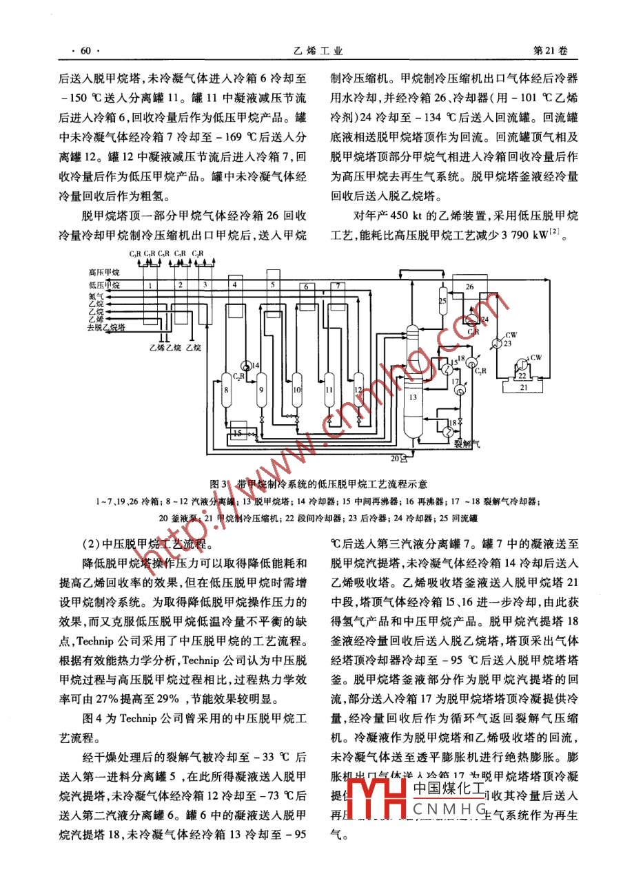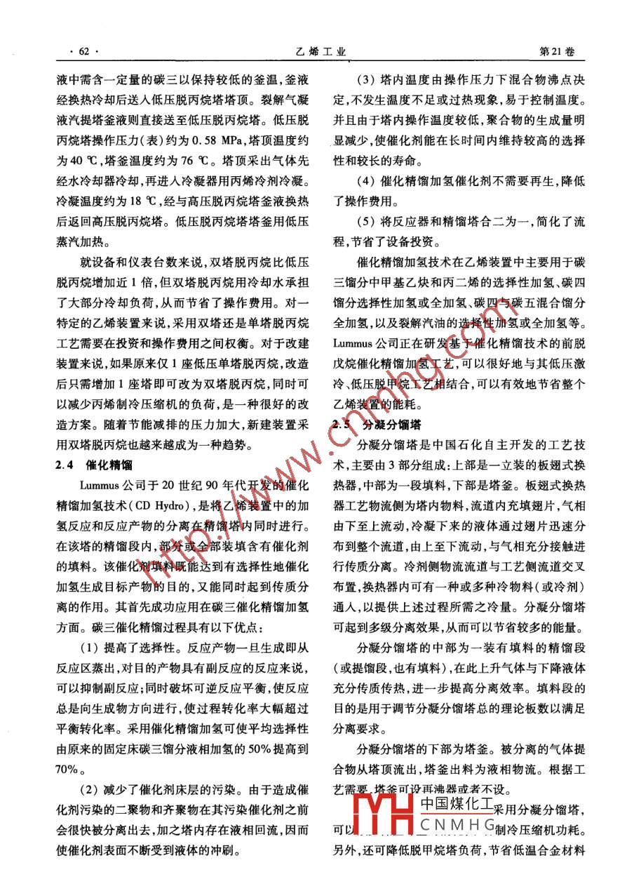 專家講座乙烯工業(yè)2009,21(2) 59 ~64ETHYLENE INDUSTRY乙烯裝置順序分離技術(shù)(二)盛在行,王振維(中國石化工程建設(shè)公司,北京, 100101)摘要:主要介紹了 乙烯裝置順序分離技術(shù)。并對近年來與順序分離技術(shù)有關(guān)的技術(shù)進(jìn)展進(jìn)行簡要介紹。對順序分離技術(shù)的特點(diǎn)及其適用范圍進(jìn)行了初步分析。關(guān)鍵詞:乙烯;順序分離;低壓脫甲烷;催化精餾;分凝分餾塔;二元制冷2.2降低脫甲 烷塔的壓力化及壓縮機(jī)制造技術(shù)的發(fā)展,甲烷制冷壓縮機(jī)可降低脫甲烷塔的操作壓力,可以提高甲烷和.以采用帶千氣密封的離心式壓縮機(jī)取代以往的活乙烯的相以揮發(fā)度,從而降低回流比。這樣既可塞式甲烷壓縮機(jī),有效地解決了運(yùn)轉(zhuǎn)周期及冷箱被以降低能耗,又可以降低甲烷中乙烯的含量,提高機(jī)組機(jī)油凍堵的問題,提高了裝置的穩(wěn)定性。近幾乙烯回收率。.通常當(dāng)脫甲烷塔操作壓力為3.0. ~年來,Lummus 公司又開發(fā)了二元和三元制冷技術(shù),3.2MPa時,稱為高壓脫甲烷;當(dāng)脫甲烷塔操作壓可以直接給低壓脫甲烷塔提供所需的制冷負(fù)荷。力為1.05~1.25 MPa時,稱為中壓脫甲烷;當(dāng)脫低壓脫甲烷塔塔頂溫度約-134 C ,塔釜溫度甲烷塔操作壓力為0.5 ~0.7 MPa時,稱為低壓脫約-54C,全塔操作溫度很低。為回收其低溫冷甲烷。早期的順序分離流程均采用高壓脫甲烷。量,將其再沸器和中間再沸器均用于預(yù)冷裂解氣。(1)低壓脫甲烷工藝流程。相應(yīng)的冷箱和進(jìn)料溫度與高壓脫甲烷系統(tǒng)相比也為降低乙烯裝置綜合能耗, Lummus公司從20發(fā)生了變化,見圖3。世紀(jì)70年代后期開始,從高壓脫甲烷塔的工藝流預(yù)冷至約-36C的裂解氣在加熱脫甲烷塔塔程改為低壓脫甲烷塔的分離流程。由于脫甲烷塔釜液的同時被-54 C的塔釜液冷卻至-47 C ,此壓力的降低,系統(tǒng)低于-101C的冷量增大,因而.裂解氣經(jīng)乙烯冷劑被冷卻至-55 C ,然后用于加發(fā)展出不同的制冷方式。以往主要采用兩種制冷熱脫甲烷塔中間再沸器,裂解氣同時被冷卻至方式:甲烷循環(huán)制冷和甲烷壓縮制冷。甲烷循環(huán). -57 C ,再經(jīng)乙烯冷劑冷卻至-72 C后進(jìn)入汽液制冷利用裂解氣壓縮機(jī)兼做制冷壓縮機(jī),其原理分離罐8。罐8中凝液經(jīng)岐化換熱器后,-部分送是:冷箱系統(tǒng)分離出的碳-餾分( 主要是甲烷)節(jié)人脫甲烷塔,另一部分減壓回?zé)岷笤偎腿嗣摷淄榱骱筇峁├淞?回收冷量后的低壓甲烷物料與裂塔。罐中未冷凝氣體經(jīng)冷箱4和冷卻器冷卻至解氣混合后進(jìn)人裂解氣壓縮機(jī),然后進(jìn)人冷箱系-98 C送人分離罐9。罐9中凝液減壓后送入脫統(tǒng)再分離,物料(甲烷)在系統(tǒng)內(nèi)循環(huán),同時提供低甲烷塔,未冷凝氣體經(jīng)冷箱5冷卻至-136 C后送溫級的冷量。該方法中甲烷存在-一個分離-混入分離罐10。罐10中的凝液減壓經(jīng)冷箱5回?zé)岷?分離的循環(huán),增加了能耗,同時導(dǎo)致裂解壓縮機(jī)系統(tǒng)處理能力增大,僅在小裝置中為避免裝置收稿日期:2009 -03 -02。過于復(fù)雜而使用。對于大、中型乙烯裝置,甲烷制中國煤化工徐州人,997年畢業(yè)于冷系統(tǒng)可采用開式熱泵系統(tǒng)。脫甲烷塔頂?shù)臍庀郈NMHG學(xué)位,現(xiàn)從事乙烯裝置分進(jìn)入甲烷制冷壓縮機(jī),升壓后可用乙烯冷劑將甲.YH師,高級工程師,已發(fā)烷冷凝,為脫甲烷塔提供回流。隨著裝置的大型表論文5篇。乙烯工業(yè)第21卷后送入脫甲烷塔,未冷凝氣體進(jìn)人冷箱6冷卻至制冷壓縮機(jī)。甲烷制冷壓縮機(jī)出口氣體經(jīng)后冷器-150 C送人分離罐11。罐11中凝液減壓節(jié)流用水冷卻,并經(jīng)冷箱26、冷卻器(用-101乙烯后進(jìn)人冷箱6,回收冷量后作為低壓甲烷產(chǎn)品。罐冷劑)24冷卻至- 134 C后送人回流罐?;亓鞴拗形蠢淠龤怏w經(jīng)冷箱7冷卻至-169 C后送人分底液相送脫甲烷塔頂作為回流?;亓鞴揄敋庀嗉半x罐12。罐12中凝液減壓節(jié)流后進(jìn)入冷箱7,回脫甲烷塔頂部分甲烷氣相進(jìn)人冷箱回收冷量后作收冷量后作為低壓甲烷產(chǎn)品。罐中未冷凝氣體經(jīng)為高壓甲烷去再生氣系統(tǒng)。脫甲烷塔釜液經(jīng)冷量冷量回收后作為粗氫?;厥蘸笏腿嗣撘彝樗C摷淄樗斠徊糠旨淄闅怏w經(jīng)冷箱26回收對年產(chǎn)450kt的乙烯裝置,采用低壓脫甲烷冷量冷卻甲烷制冷壓縮機(jī)出口甲烷后,送人甲烷.工藝,能耗比高壓脫甲烷工藝減少3790 kW12]。CRC.RC.R C.R CR.,高壓甲烷低壓電烷2624去脫乙婉塔乙烯乙烷乙烷CWPCRCRL21|13二L202-圖3帶甲 烷制冷系統(tǒng)的低壓脫甲烷工藝流程示意1-7.19 .26冷箱;8-12汽液分離罐; 13脫甲烷塔; 14冷卻器; 15中間再沸器; 16再沸器; 17 ~18裂解氣冷卻器;20釜液泵; 21甲烷制冷壓縮機(jī); 22段間冷卻器; 23后冷器; 24冷卻器; 25回流罐(2)中壓脫甲烷工藝流程。C后送人第三汽液分離罐7。罐7中的凝液送至降低脫甲烷塔操作壓力可以取得降低能耗和脫甲烷汽提塔,未冷凝氣體經(jīng)冷箱14冷卻后送入提高乙烯回收率的效果,但在低壓脫甲烷時需增乙烯吸收塔。乙烯吸收塔釜液送人脫甲烷塔21設(shè)甲烷制冷系統(tǒng)。為取得降低脫甲烷操作壓力的中段,塔頂氣體經(jīng)冷箱15、16進(jìn)一步冷卻,由此獲效果,而又克服低壓脫甲烷低溫冷量不平衡的缺得氫氣產(chǎn)