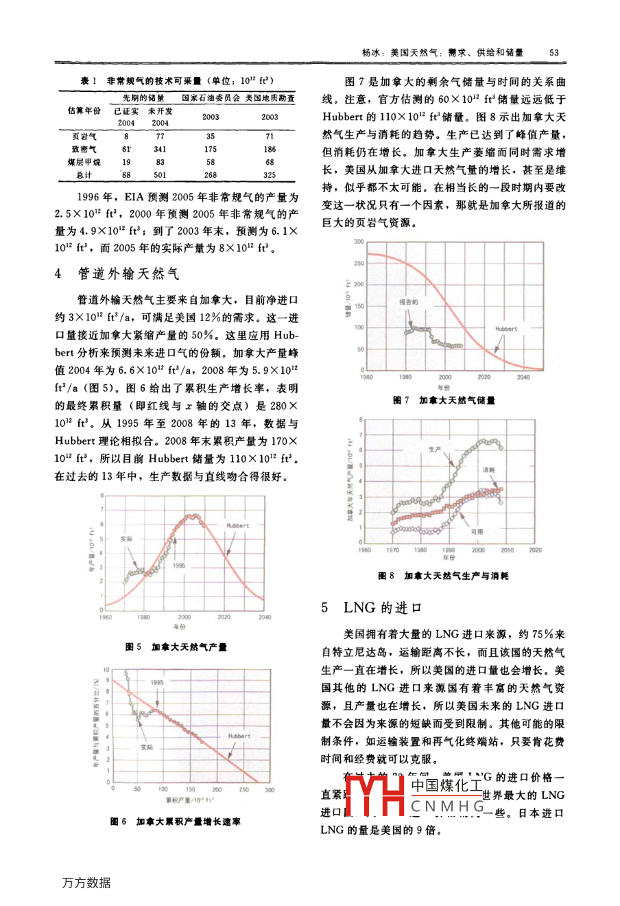 楊冰:美國(guó)天然氣:需求、供給和儲(chǔ)量美國(guó)夭然氣:需求、供給和儲(chǔ)量編譯:楊冰(大慶油田工程有限公司)審校:張興平(大慶油田工程有限公司)要評(píng)價(jià)了美國(guó)過去和目前天然氣的時(shí)間或標(biāo)準(zhǔn)日期,a;產(chǎn)量,給出了天然氣未來儲(chǔ)量的來源。目前t。—峰值產(chǎn)量年;美國(guó)常規(guī)天然氣供給緊縮,只能提供需求的b—產(chǎn)量變化因子,1012ft43%。美國(guó)能源信息管理局(EIA)預(yù)測(cè)目Q—時(shí)間t時(shí)的累積產(chǎn)量前44%的天然氣需求來自非常規(guī)能源,另Hubbert理論曲線在獲得了充分的長(zhǎng)期生產(chǎn)數(shù)據(jù)外的13%來自進(jìn)口。還介紹了僅應(yīng)用歷史后與生產(chǎn)數(shù)據(jù)擬合得很好。自1989年以來,當(dāng)實(shí)際生產(chǎn)數(shù)據(jù)來估算天然氣儲(chǔ)量的方法,該方法生產(chǎn)達(dá)到最大產(chǎn)量且產(chǎn)出約一半的天然氣時(shí),數(shù)據(jù)趨涉及價(jià)格、地質(zhì)、政治、技術(shù)、最終可采氣勢(shì)與理論曲線非常一致,從此曲線不能馬上看出未來量或儲(chǔ)量的增長(zhǎng),不做任何假定,可見這種產(chǎn)量,尤其在離散數(shù)據(jù)數(shù)量相當(dāng)大時(shí)。圖2表明,到評(píng)估是現(xiàn)實(shí)的2020年常規(guī)大然氣可能減至7×102ft詞天然氣需求供給儲(chǔ)量進(jìn)口美國(guó)Dol:10.3969/.isn.1002-641X.2010.50141概述母常凈進(jìn)口1987年以來,美國(guó)天然氣的消耗量已經(jīng)超過了美國(guó)的生產(chǎn)能力,兩者之間的差距通過管道和船只進(jìn)口液化天然氣(LNG)來彌補(bǔ)。供給中最大的部分是常規(guī)天然氣,但已開始不斷降低,現(xiàn)在只圖1美國(guó)天然氣資源的最近走勢(shì)能提供總需求量的43%;供給中的第二大部分是致密天然氣,目前為29%,且在迅速增長(zhǎng);供給中的第三部分是管道天然氣的進(jìn)口,占12%;其余的來自煤層甲烷、頁巖氣和LNG。天然氣供給中各部分的趨勢(shì)如圖1所示。非常規(guī)天然氣產(chǎn)量在最近的20年中已增長(zhǎng)了4倍。2常規(guī)天然氣圖1表明,美國(guó)常規(guī)天然氣產(chǎn)量持續(xù)下降,從1990年的15×1012ft(1ft3=38.317dm3)降至圖2美國(guó)常規(guī)天然氣的產(chǎn)量2008年的10×1012ft。天然氣歷史產(chǎn)量與時(shí)間的可以重新描制生產(chǎn)數(shù)據(jù)曲線,以檢測(cè)是否與關(guān)系曲線呈現(xiàn)出鐘形(圖2),曲線不包括非常規(guī) Hubbert理論相符,并表明什么時(shí)候開始達(dá)到似天然氣產(chǎn)量。圖2中的紅色曲線是一個(gè)對(duì)數(shù)分布,合。圖3是年生產(chǎn)量與累積生產(chǎn)量的比值(y軸)該曲線方程是 M. King Hubbert使用的對(duì)數(shù)曲線與累積產(chǎn)量(x軸)的關(guān)系曲線,可以看到一線的導(dǎo)數(shù)。導(dǎo)數(shù)曲線方程為P=dQ/dt,其中性圖形(紅色),從1989年開始與 Hubbert理論2P曲線cOS為零中國(guó)煤化工軸相交時(shí),產(chǎn)量終累積產(chǎn)量為式中P—天然氣產(chǎn)量,1012ft;CNMHG新發(fā)現(xiàn)一個(gè)大的峰值產(chǎn)量天然氣田,那么這條曲線將會(huì)改變,但迄今為止產(chǎn)52國(guó)外油田工程第26卷第5期(2010.5)量數(shù)據(jù)跟從 Hubbert曲線已經(jīng)20年了。從圖3可求的7%。正如它的命名,頁巖氣產(chǎn)自頁巖,也需以看出,美國(guó)至今產(chǎn)出常規(guī)天然氣約930×1012要水平井或水力壓裂開采。由圖4可知,頁巖的增ft,還有約230×1012ft·待生產(chǎn)長(zhǎng)速率在它的指數(shù)階段。顯然, Fort Worth盆地中的 Barnett Shale是頁巖氣產(chǎn)量最大的地區(qū),2008年產(chǎn)量為1.4×102ft3。在1993年與2008年間 Barne產(chǎn)出5.0×1012ft2頁巖氣,剩余儲(chǔ)量能接近26×1012ft'。人們相信,目前32%的生產(chǎn)增長(zhǎng)率是不會(huì)持久的,尤其在目前的高油價(jià)(4美元/10°Btu)情況下。一些研究人員估測(cè)可能達(dá)到6美元或更高。路易斯安娜州西北部和東得克薩斯州的13美國(guó)常規(guī)天然氣的累積產(chǎn)量增長(zhǎng)速率Haynesville Shale是目前天然氣市場(chǎng)的亮點(diǎn)。初始產(chǎn)量在15~20MMcd( 1 MMcfd=10°ft3)是3非常規(guī)天然氣正常產(chǎn)量。第一年的降幅達(dá)65%~80%。計(jì)算的天然氣可采量為34×102ft3。每口井鉆至11500美國(guó)非常規(guī)天然氣生產(chǎn)份額從1998年總產(chǎn)量15250ft需7.5~9.5百萬美元的成本的28%上升到2007年的46%。圖1表明,產(chǎn)量穩(wěn)Haynesville可能需要6~8美元/10Btu才可達(dá)到步增長(zhǎng),目前已與常規(guī)天然氣的產(chǎn)量相當(dāng)。非常規(guī)經(jīng)濟(jì)開采天然氣可以分為三類:致密氣、頁巖氣和煤層氣。在美國(guó)有20多個(gè)頁巖生產(chǎn)區(qū),據(jù)估測(cè),到非常規(guī)天然氣基本上能彌補(bǔ)常規(guī)天然氣的下降,因2020年7個(gè)大的生產(chǎn)區(qū)的產(chǎn)量可以達(dá)到10×102此國(guó)內(nèi)天然氣的總產(chǎn)量一直很穩(wěn)定,只是近幾年有14×1012ft3,這個(gè)預(yù)測(cè)可能太樂觀了。了明顯的不足。近年來,商天然氣價(jià)格帶來了高鉆3.3煤層甲烷機(jī)數(shù)量的動(dòng)用,鉆井?dāng)?shù)量增多,產(chǎn)量自然增長(zhǎng)。圖煤層甲烷(CBM)是指煤層基質(zhì)中吸收的甲給出美國(guó)非常規(guī)天然氣的生產(chǎn)產(chǎn)量。烷。在煤夾層中可能存在一些自由氣,這是煤開采中的危險(xiǎn)因素,但