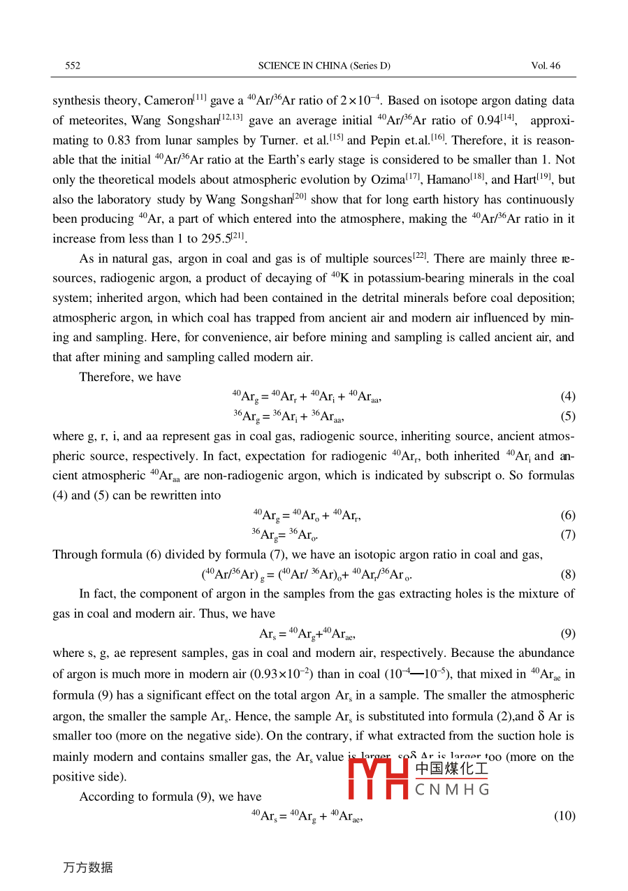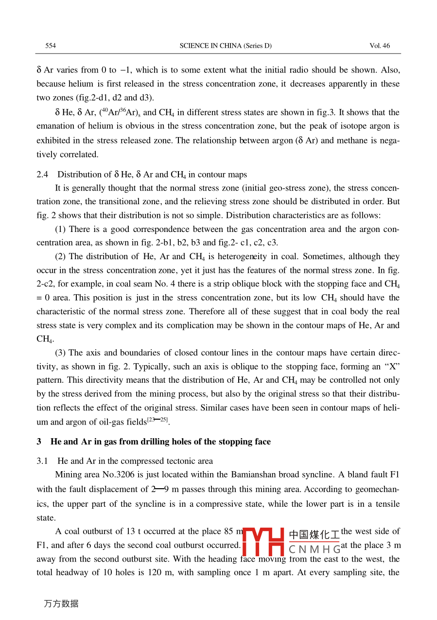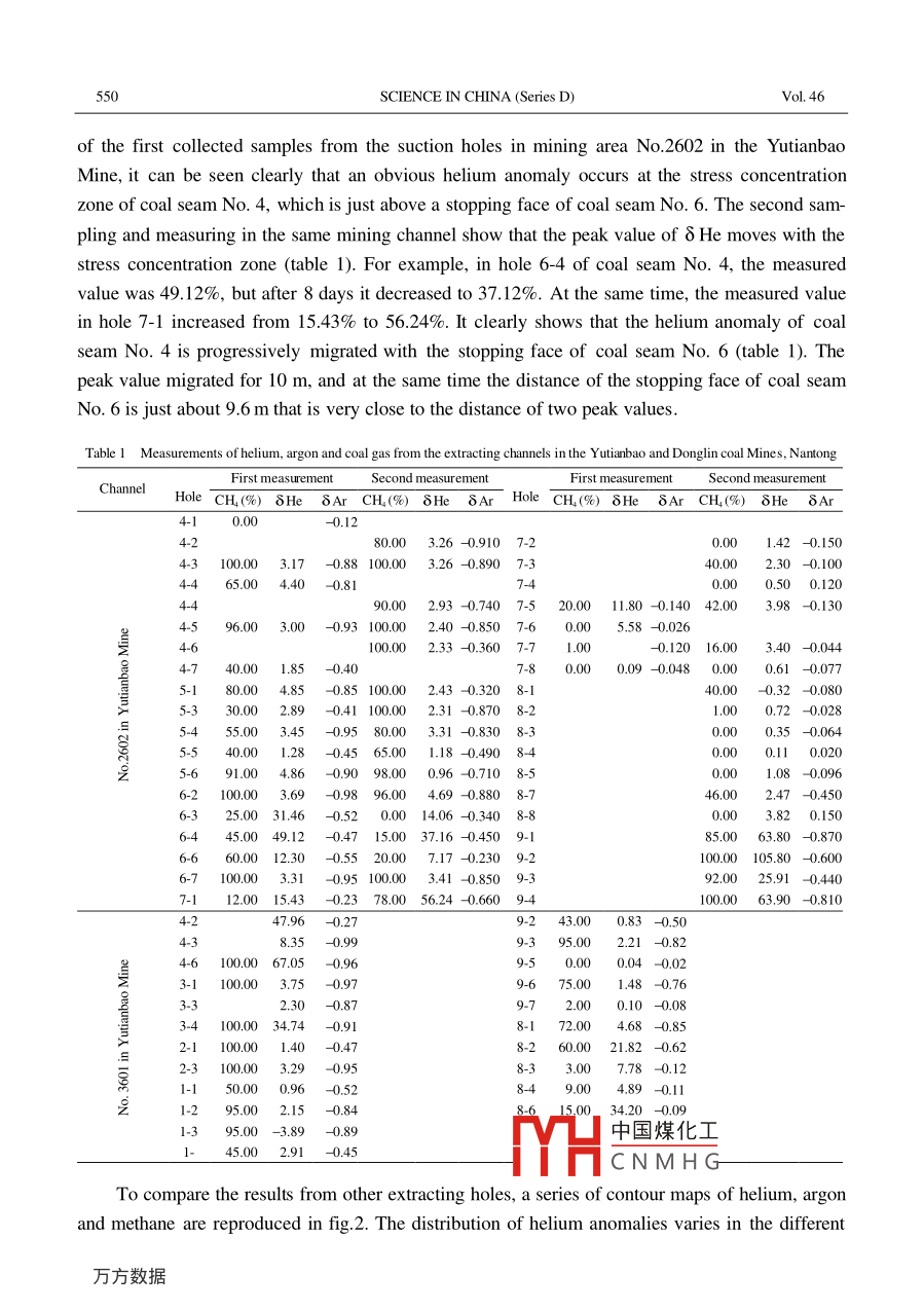 Vol 46 No 6SCIENCE IN CHINA(Series D)June 2003Stress emission of helium and argon in coal seamsZHU Ming(朱銘), ZHOU Ruiguang(周瑞光), YIN Daixun(尹代勛),GAO Yusheng(高玉生), ZHANG Fusong(張福松),CHENG Binfang(成彬芳), LIU Qiang(瀏劉強(qiáng))& LUO Xinhua(羅信華1. Institute of Geology and Geophysics, Chinese Academy of Sciences, Beijing 100029, China2. Nantong Mining Bureau, Chongqing 630802, China3. Tianjin Investigation, Design and Research Institute of Water Resources and Hydropower, Tianjin 300022, ChinaCorrespondenceshouldbeaddressedtoZhuMing(email.Zhmyr@sohu.com)Received December 17. 2002Abstract In the Yutianbao Mine, the Nantong Coal Field, Chongqing a lot of gas samples weremeasured and analyzed. It has been found in these samples that helium is sensitive to stress concentration, while argon is sensitive to stress release. Compared with the flowing out of gas itself, thecombination of helium and argon can be more suitably used as an indicator to predict gas outburstIn a mining area of this mine, both 8 He 30 and 8 Ar <-0.97 can be used critically to define thedangerous area. Also, the contour maps of 8 He, 8 Ar and CH can provide a guidance for engineering monitoringKeywords: helium, argon and its isotope, stress emanation, prediction of gas outburst, contour map, engineering geologyThe relationship between inert gas and geologic stress has been paid attention to by seis-mologists in the recent twenty years. Recent studies of seismic belts show that changes ofgeological stress can lead to emanation of inert gas from geological bodies F. In the studiedemanation of radon in a granite sample under stress in 1981, Holub et al. l found that it emitted alarge number of radon just under 1/2 o. In 1983, Honda et al. studied release effect of heliumand argon from various rocks under a uniaxial stress, concluding that the degas of squeezed sam-ples should primarily depend on new surfaces produced by expansion. These results show that therelease effect of helium and argon is only related to physical process of stress changes. Accordinto Ozima, the emanation of inert, such as helium and argon, due to a geologic dynamic process,is called stress emanation. Of course, an earthquake is a larger scale geological dynamic processThen, can the stress emanation be found in engineering geological scale? It is the problem to bediscussed in this paperIn engineering geological studies, one of the most interesting and important tasks is to evalu-ate and predict geological disasters threatening engineering projects. For this reason, monito中國煤化工)mw,theCNMHGSOft rock, kata-rock and clay rock. Moreover, even in hard rock, it is difficult to know real stress changesCoal is a soft rock and contains a lot of radiogenic helium and argon that had long beenSCIENCE IN CHINA (Series D)VoL 46accumulated owing to decaying of radioactive elements U, Th and K. In addition, a certainamount of non-radiogenic helium and argon (including the atmosphere-derived different geologi-cal periods ) could be trapped, therefore, the abundance of He and the isotopic ratio of Ar are farhigher in coal and gas than in atmosphere. In coal mining process, since the stress state and itschange in different mining positions are sometimes known, it is possible to establish the relation-ship between the stress state and the inert gas emanation. In the Longtan coal system, South Chinathere are a plenty of the suction holes, favorable for gas sampling in this study. Therefore, a coal-an ideal natural laboratory for studying the relationship between stress and helium andargon emanation in soft rockGeological background, sample location and analysis techniqueThe work area is located in the yutian bao mine of the nantong coal district. about 130 kmsouth of Chongqing City, China. In the Nantong Coal District the outbursts of coal and gas havebeen very serious. Since 1955, such accidents have happened more than 1200 times, includingtimes of bursting out 500-1000 t coal and twice of more than 1000 t. The Longtan coal system ofPermian ages here contains 7 bed coals, in which coal seams No 4 and No 6 are exploitable beds2.5-3.2 m and 1.5 m thick, respectively. In coal seam No 4 as the mainly mined bed, the coaland gas outbursts are frequent and serious, while in No. 6 they are accidentalMost part of the Yutianbao Mine is located in the Bamianshan syncline and its east and westflanks belong to the Yaqueyan shear fold zone and the Yutangjiao shear fold zone, respectively.Huge outbursts accidents have been focused near Fault Fl through the central part of the Bamianshan syncline and in the Yaqueyan shear fold zone. In order to decrease the danger of coal and gasoutbursts coal seam No. 6 has first been mined to relieve stress in coal seam no. 4. with miningof coal seam No 6, a different stress state occurs in coal seam No 4 (and it can usually be dividedinto four zones: the initial geo-stress zone (normal stress zone), the stress concentration zone, thetransitional zone, and the stress relieving zone). But as the further mining of the underlying coalseam No 6, the stress state in the overlying coal seam No 4 continued to vary. Although someng measures were adopted, the danger of coal and gas outburst accident has not beenreduced yet. In order to reduce such a danger as much as possible and to utilize gas as fuel, theextracting channels between No 4 and No. 6 were dug in a certain density, and then from thesechannels, the suction holes were drilled toward coal seam No. 4. A gas-extracting system was setup to utilize gas. It is the suction holes that provide us a good chance to collect gas samplesThe samples used in this study were collected from mining areas No 2602(30 m level) andNo, 3601(100 m level) of the Yutianbao Mine. In mining area No 2602 samples were collectedtwice, with an interval of 8 days. In addition, gas was t中國煤化工 machine channelNo3602 of the Yutianbao mine and airway No 2603 ofCNMHGAll samples of H