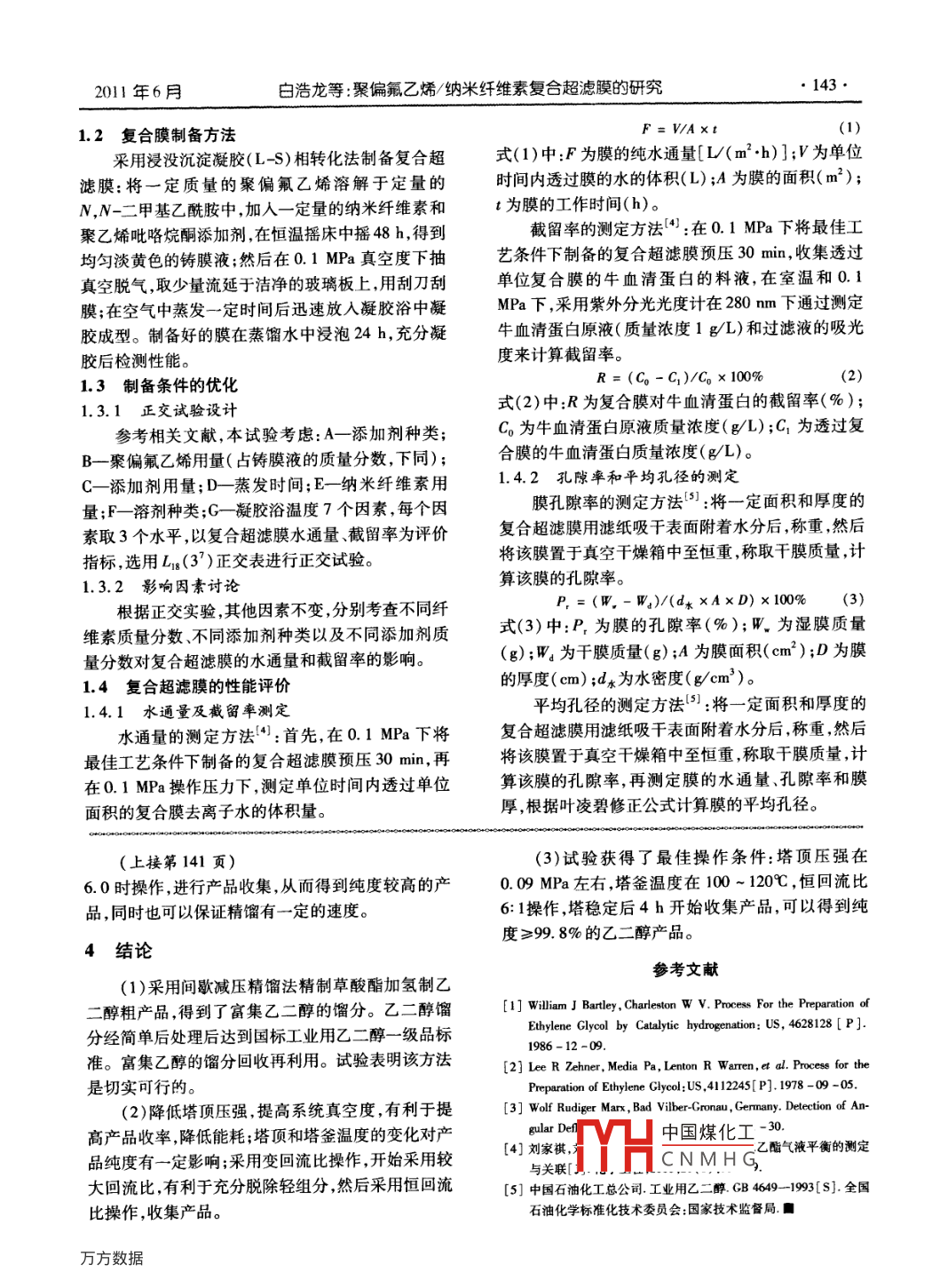 June 2011現(xiàn)代化工第31卷增刊(1)140Moderm Chemical Industry20J年6月草酸二乙酯加氫制乙二醇產(chǎn)品精餾試驗(yàn)研究范鑫,王科,袁小金,許紅云,李揚(yáng),胡玉容(西南化工研究設(shè)計(jì)院,國(guó)家碳一化學(xué)工程技術(shù)研究中心工業(yè)排放氣綜合利用國(guó)家重點(diǎn)實(shí)驗(yàn)室,四川成都610225)摘要:通過減壓間歇精餾對(duì)草酸二乙酯加氫制乙二醇產(chǎn)品進(jìn)行精制。試驗(yàn)表明該方法切實(shí)可行,獲得了純度≥998%的乙二醇產(chǎn)品;同時(shí)探討了塔頂壓強(qiáng)、回流比變化對(duì)產(chǎn)品純度的影響,獲得了試驗(yàn)條件下的最佳操作條件,為工業(yè)化提純草酸二乙酯加氫制乙二醇產(chǎn)品提供了有益信息。關(guān)鍵詞:乙二醇;草酸二乙酯;減壓精餾中圖分類號(hào):TQ028.13文獻(xiàn)標(biāo)識(shí)碼:A文章編號(hào):0253-4320(2011)S1-0140-02Preparation of ethylene glycol with hydrogenation of diethyl oxalateby vacuum distillationFAN Xin, WANG Ke, YUAN Xiao-jin, XU Hong-yun, LI Yang, HU Yu-rong(The Southwest Research Design Institute of Chemical Industry, National Cl Chemical Engineering andTechnology Research Center, State Key Laboratory of Industrial Vent Gas Reuse, Chengdu 610225, China)Abstract: The fraction of ethylene glycol is enriched from crude glycol by vacuum batch distillation. The crudeglycol is prepared by the hydrogenation of diethyl oxalate. The experiment show that this separation method is feasible andethylene glycol with purity of more than 99. 8% is obtained. Furthermore the effects of tower top pressure, reflux ratio onproduct purity are analyzed. The optimal operating condition is determined in the experimental conditionKey words: ethylene glycol; diethyl oxalate; vacuum distillation乙二醇(EG)是一種重要的石油化工基礎(chǔ)有機(jī)用乙二醇國(guó)家標(biāo)準(zhǔn)GB4649-1993一級(jí)品指標(biāo)。原料、主要用于生產(chǎn)聚酯纖維、防凍劑、不飽和聚酯樹脂等,用途十分廣泛。乙二醇主要由石油加工得1工藝簡(jiǎn)介到的乙烯為原料來生產(chǎn),為了改變單純依賴石油的由于乙二醇粗產(chǎn)品料液沸點(diǎn)高,需要真空操作路線,并充分利用我國(guó)煤炭、天然氣及工業(yè)排放氣資且料液殘?jiān)厅c(diǎn)高;乙二醇產(chǎn)品純度要求較高源,現(xiàn)采用非石油路線從一氧化碳經(jīng)氧化偶聯(lián)制草(9.8%~999%),常采用多塔多次分離來完成;酸二乙酯再經(jīng)催化加氫制乙二醇。此工藝路線低沸點(diǎn)雜質(zhì)易夾帶走乙二醇;水和乙醇共沸物很難合成乙二醇為目前國(guó)內(nèi)Cl化學(xué)的矚目課題2-3。除去。乙二醇精制技術(shù)有2種生產(chǎn)流程:①連續(xù)生產(chǎn)針對(duì)分離難點(diǎn),本工藝采用分批生產(chǎn)即間歇流程,由三塔一蒸發(fā)器構(gòu)成,流程復(fù)雜,設(shè)備繁多,投生產(chǎn)流程以減少投資,并降低乙二醇損耗;采用耐資巨大;②間歇生產(chǎn)流程,由單塔組成,設(shè)備簡(jiǎn)單、操腐蝕的規(guī)腐蝕的規(guī)格玻璃彈簧填料,該填料的特點(diǎn)是玻璃作簡(jiǎn)單,可釆用微機(jī)控制。連續(xù)生產(chǎn)流程前者設(shè)備絲的毛細(xì)作用使液體分散成極薄的液膜,增大氣投資大,適于大規(guī)模生產(chǎn),間歇生產(chǎn)流程設(shè)備簡(jiǎn)單但液兩相接觸面積,克服了金屬填料耐腐蝕性能差操作復(fù)雜,適于中小規(guī)模生產(chǎn)的缺點(diǎn),但分離效率低于同規(guī)格網(wǎng)環(huán)填料和三角雖然人們對(duì)CO路線經(jīng)草酸酯加氫制乙二醇產(chǎn)螺旋填料。品在氣液平衡、模擬計(jì)算等方面做過許多工作但是關(guān)于草酸二乙酯加氫制乙二醇產(chǎn)品精制方面的2試驗(yàn)裝置與方法成果鮮有報(bào)道。該工作對(duì)草酸二乙酯加氫制乙二醇21乙二醇粗產(chǎn)品的組成和物性模試裝置產(chǎn)品進(jìn)行精制優(yōu)化工藝操作,減少工藝波乙二醇動(dòng),實(shí)現(xiàn)降低裝置能耗和物耗的目的,得到符合工業(yè)表1H中國(guó)煤化工分物性列于CNMHG收稿日期:2010-11-23;修回日期:2011-05-05作者簡(jiǎn)介:范鑫(1981-),男碩士,工程師研究方向?yàn)榉鞘吐肪€合成氣制乙二醇關(guān)鍵技術(shù)開發(fā),028-85964833,almonvant@163.com2011年6月范鑫等:草酸二乙酯加氫制乙二醇產(chǎn)品精餾試驗(yàn)硏究141表1原料組成和主要組分的物性試驗(yàn)首先將乙二醇粗產(chǎn)品加入塔釜,塔頂壓強(qiáng)物性乙醇乙二醇水草酸二乙酯乙酸乙酯其他控制在0.09MPa,取各溫度段的餾分用色譜分析組質(zhì)量分?jǐn)?shù)/%83.441.612.130成;然后回收乙醇組分。將富集的乙二醇餾分在減熔點(diǎn)/℃-114.3-13.20.0-40.6-83.6壓精餾塔中預(yù)熱;啟動(dòng)真空系統(tǒng),調(diào)節(jié)加熱功率,緩沸點(diǎn)/℃78.40197.85100.00185.4077.06慢升高釜溫;當(dāng)塔頂有回流液后,全回流操作,待塔密度/g·cm30.78901.151.00001.07850.8960釜和塔頂溫度穩(wěn)定后,設(shè)定回流比,開始取樣分析,并記錄塔頂溫度、塔釜溫度和塔頂壓強(qiáng)的變化情況。2.2分析方法3試驗(yàn)結(jié)果與討論樣品分析采用美國(guó) Agilent Technologies6820型氣相色譜儀,分析條件如表2所示。3.1試驗(yàn)結(jié)果表2氣相色譜分析條件通過小塔減壓精餾試驗(yàn),塔頂壓強(qiáng)控制在項(xiàng)目條件項(xiàng)目數(shù)值0.08-0.09MPa,塔釜溫度控制在1009以下可實(shí)檢測(cè)器TCD氫氣流量/mLm現(xiàn)對(duì)乙酸乙酯、大部分的乙醇和水