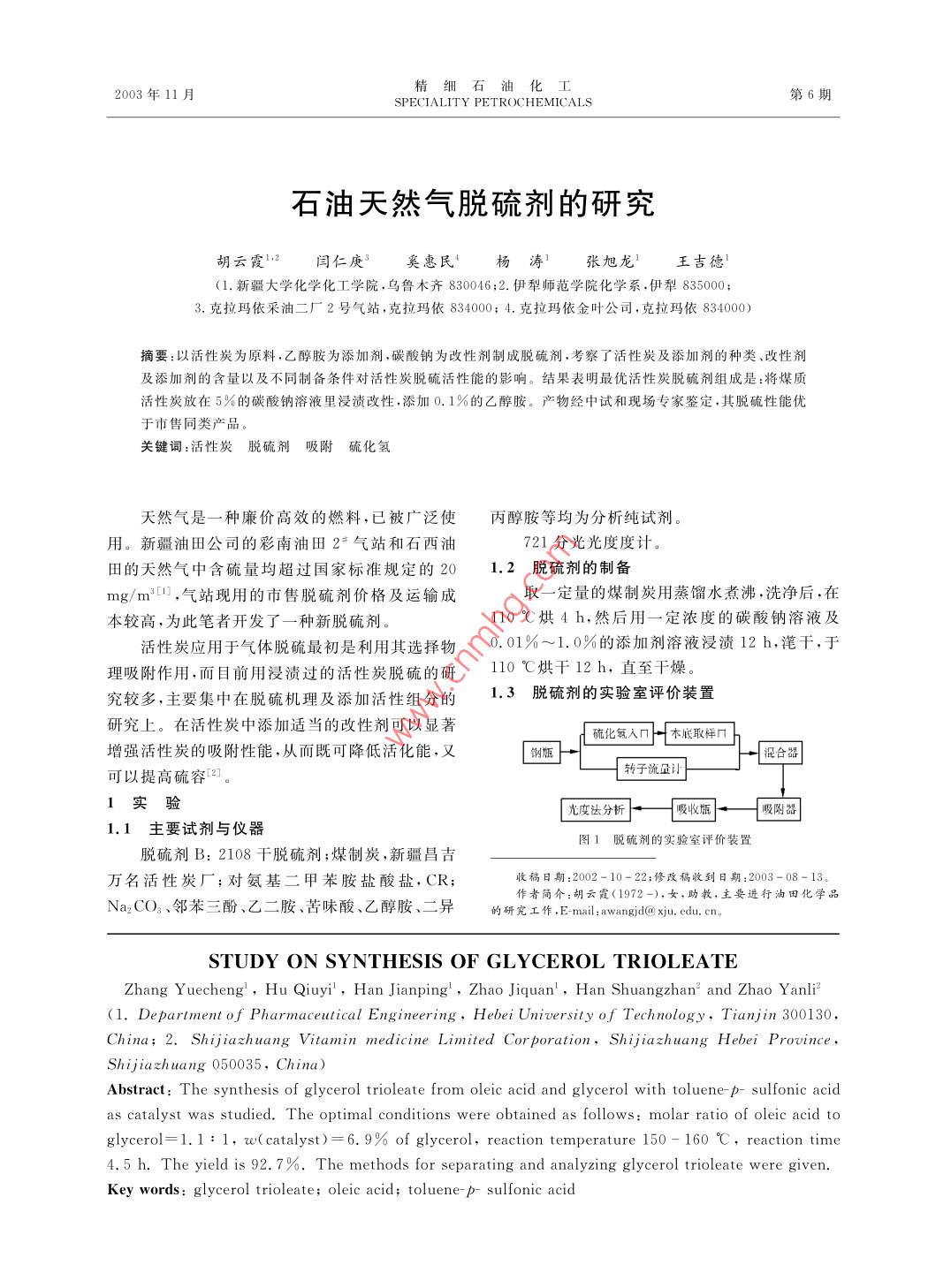 2003年11精細(xì)石油化工SPECIALITY PETROCHEMICALS第6期石油天然氣脫硫劑的研究胡云霞閆仁庚奚惠民楊濤張旭龍王吉德(1.新疆大學(xué)化學(xué)化工學(xué)院,烏魯木齊830046;2.伊犁師范學(xué)院化學(xué)系,伊犁835003.克拉瑪依采油二廠2號(hào)氣站,克拉瑪依834000;4.克拉瑪依金葉公司,克拉瑪依8340000摘要:以活性炭為原料,乙醇胺為添加劑,碳酸鈉為改性劑制成脫硫劑,考察了活性炭及添加劑的種類、改性劑及添加劑的含量以及不同制備條件對(duì)活性炭脫硫活性能的影響。結(jié)果表明最優(yōu)活性炭脫硫劑組成是:將煤質(zhì)活性炭放在5%的碳酸鈉溶液里浸漬改性,添加0.1%的乙醇胺。產(chǎn)物經(jīng)中試和現(xiàn)場(chǎng)專家鑒定,其脫硫性能優(yōu)于市售同類產(chǎn)品關(guān)鍵詞:活性炭脫硫劑吸附硫化氫天然氣是一種廉價(jià)高效的燃料,已被廣泛使丙醇胺等均為分析純?cè)噭┯?。新疆油田公司的彩南油?*氣站和石西油721分光光度度計(jì)。田的天然氣中含硫量均超過(guò)國(guó)家標(biāo)準(zhǔn)規(guī)定的201.2脫硫劑的制備mg/m,氣站現(xiàn)用的市售脫硫劑價(jià)格及運(yùn)輸成取一定量的煤制炭用蒸餾水煮沸,洗凈后,在本較高,為此筆者開(kāi)發(fā)了一種新脫硫劑110℃烘4h,然后用一定濃度的碳酸鈉溶液及活性炭應(yīng)用于氣體脫硫最初是利用其選擇物0.01%~1.0%的添加劑溶液浸漬12h,潷干,于理吸附作用,而目前用浸漬過(guò)的活性炭脫硫的研10℃烘干12h,直至干燥。究較多,主要集中在脫硫機(jī)理及添加活性組分的1.3脫硫劑的實(shí)驗(yàn)室評(píng)價(jià)裝置研究上。在活性炭中添加適當(dāng)?shù)母男詣┛梢燥@著硫化氫入口本底取樣口增強(qiáng)活性炭的吸附性能,從而既可降低活化能,混合器可以提高硫容2。轉(zhuǎn)子流量讠I實(shí)驗(yàn)光度法分析吸收瓶吸附器1.1主要試劑與儀器圖1脫硫劑的實(shí)驗(yàn)室評(píng)價(jià)裝置脫硫劑B:2108干脫硫劑;煤制炭,新疆昌吉萬(wàn)名活性炭廠;對(duì)氨基二甲苯胺鹽酸鹽,CR;收稿日期:2002-10-22;修改穡收到日期:2003-08-13。作者簡(jiǎn)介:胡云霞(1972-),女,助教,主要進(jìn)行油田化學(xué)Na2CO3、鄰苯三酚、乙二胺、苦味酸、乙醇胺、二異的研究工作,Emi: I wangid( xiu,du.cnSTUDY ON SYNTHESIS OF GLYCEROL TRIOLEATEZhang Yuecheng, Hu Qiuyi, Han Jianping, Zhao Jiquan, Han Shuangzhan and Zhao Yanli2(l. Department of Pharmaceutical Engineering, Hebei University of Technology, Tianjin 300130China; 2. Shijiazhuang Vitamin medicine Limited Cor poration, Shijiazhuang Hebei ProvinceShijiazhuang 050035, China)Abstract: The synthesis of glycerol trioleate from oleic acid and glycerol with toluene- p-sulfonic acidas catalyst was studied. The optimal conditions were obtained as follows: molar ratio of oleic acid toglycerol=1. 1:1, w(catalyst)=6.9% of glycerol, reaction temperature 150-160 C, reaction tim4.5 h. The yield is 92. 7%. The methods for separating and analyzing glycerol trioleate were givenKey words: glycerol trioleate; oleic acid; toluene-p-sulfcnic acl6胡云霞等.石油天然氣脫硫劑的研究1.4脫硫劑的實(shí)驗(yàn)室評(píng)價(jià)方法異丙醇胺、乙醇胺的加入量各為0.1%時(shí),其硫容在一定直徑的吸附器中,裝人一定質(zhì)量的脫都達(dá)到各自的最大值,與未加添加劑的脫硫劑相硫劑,H2S以10mL/min的流速通入,并由鋼瓶比,硫容分別提高了62%,50%,40%和107%中的N2以250mL/s的流速帶入吸附器,未反應(yīng)因此,選擇0.1%的乙醇胺為添加劑的H2S氣體由吸收液吸收,以無(wú)色澄清的堿性鋅表1添加劑種類及用量對(duì)硫容的影響氨絡(luò)鹽吸收液變渾濁時(shí)作為吸附終點(diǎn),吸附結(jié)束添加劑硫容/(mg:g1)后用分光光度計(jì)測(cè)吸收液的吸光度,計(jì)算吸硫容用量,%苦味酸鄰苯三酚二異丙醇胺乙醇胺量9.059.059.05硫容為單位質(zhì)量脫硫劑脫除的H2S換算成單質(zhì)硫的質(zhì)量。硫容越大,單位質(zhì)量脫硫劑的脫9.1414.6硫效果越好18.8硫容(g/s)=累計(jì)脫硫質(zhì)量15.6脫硫劑質(zhì)量1.011.09.1011.92結(jié)果與討論2.1活性炭種類對(duì)脫硫活性的影響分別用杏殼炭、煤制炭、椰殼炭進(jìn)行實(shí)驗(yàn)。結(jié)2.5實(shí)驗(yàn)氣中H2S含量對(duì)硫容的影響果表明:杳殼炭的脫硫效果最好,煤制炭次之,椰實(shí)驗(yàn)發(fā)現(xiàn),在固定實(shí)驗(yàn)氣流速情況下,配制氣殼炭較差。但杏殼炭單價(jià)高,且與煤制炭的脫硫體中HS含量從5g/m增加到14g/m3時(shí),硫效果相差不多,所以以煤制炭為脫硫劑主料容呈曲線遞減,即H2S含量每增加一倍,硫容減2.2碳酸鈉溶液濃度對(duì)脫硫劑活性的影響少10%~20%,可見(jiàn)降低H2S的濃度有利于脫硫反應(yīng)。但為了縮短實(shí)驗(yàn)周期,配制的實(shí)驗(yàn)氣中H2S濃度遠(yuǎn)大于需處理的石油天然氣中H2S的濃度(40~400mg/m3)。2.6實(shí)驗(yàn)氣流速對(duì)硫容的影響實(shí)驗(yàn)氣流速對(duì)硫容的影響明顯,流速?gòu)?00mL/min降到100mL/min時(shí),硫容提高20%30%。這是因?yàn)榱魉俳档?增加了H2S與脫硫劑浸漬液酸鈉含量.微圖2碳酸鈉溶液濃度對(duì)硫容的影響的接觸時(shí)間,有利于H2S進(jìn)行物理和化學(xué)吸附。用2%,5%,10%,20%碳酸鈉溶液浸漬經(jīng)過(guò)27脫硫劑質(zhì)量對(duì)硫容的影響干燥處理的活性炭,實(shí)驗(yàn)結(jié)果表明:用5%碳酸鈉分別稱取脫硫劑5.0,10.0g,在同樣的操作溶液浸漬活性炭脫硫效果最好。因?yàn)槿芤簼舛冗^(guò)條件下比較其