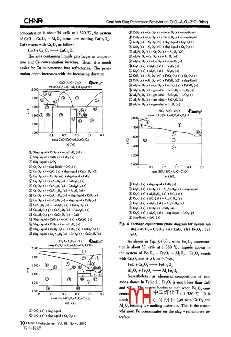China's RefractoriesCHNPTang Lihua, born in Jan. 1965, obtained his bachelor's degree, master's degree, and doctorsdegree from East China University of Science and Technology(ECUST)in 1987, 1996, and 2004, respec-tively. He is now the lead teacher of core course of Chemical Technology and mainly engages in the researchof coal transformation technology and waste solid resourcing technology. He also holds a part-time job as thejudge expert of Ministry of Education Study-abroad-returm Scientific Research Start Fund and member ofChina Chemical Industry Society. He has authored and co-authored 48 papersCoal ash Slag penetration behavior onCr.. -Zro, bricksTANG Lihua, GAO Ling, WANG Qiong, CHEN Dongxia, ZHOU YamingWANG Wenmei, WU Yongqiang, ZHU Zibin1 Engineering Research Center of Large Scale Reactor Engineering and Technology, East ChinaUniversity of Science and Technology, Shanghai 200237, China2 Shanghai Coking Chemical Corporation, Shanghai 200241, ChinaAbstractpared with the other gasifiers, slagging coal gasiThe penetration behavior of different kinds of coal joys great advantages in technical operationash slags into chrome corundum bricks was studied by ment, and supporting refractories. At presentcup test. As a preliminary attempt, the oxides of Fe20, most popular slagging coal gasifier in China is Texcoand MgO were added into coal ash to reduce the erosion gasifier, which operates at 1 300-1 500C under 2.7of refractories. Different cup tests were carried out to6. 5 MPaJ. Under such harsh conditstudy coal slag erosion to the refractories. Factsage was slag forms when coal ash flows down the refractoriesused to simulate the phase diagram of the main chemical lined wall. The slag penetrates into porous refractoriescompositions in coal ash and in the refractories. Both re- matrix, and subsequently corrosive reactions occursults agreed with each other. The results show that the which may lead to refractories degradation and spalelements in coal slag can penetrate into bricks and the ling. Therefore, the high cost of refractories replace-penetration deepens wih the duration increasing: it is ment( approximately USD I million)and long downdifficult for Fe but easier for Ca and Si to penetrate into time(3-6 weeks) make the industry experts rank imbricks; different kinds of melting coal ashes penetrate in- proving refractory durability No. I in a list of 20 re-to refractories differently and the penetration depth of sil- search and development needs.Previous studiesicon and calcium can be significanly reduced by adding have shown that slag penetration and chemical corrosionKey words: Coal ash slag, Chrome oxide-alumina- gasifier" y causes for refractories degradation in ance the slag refractories interaction iszirconia brick, Penetrate, FactSageunderstood, it becomes possible to develop solutionsminal composition and4 ntrodcti。ving中國(guó)煤化工 educe thCN MHGof great importanceThe gasification process is one of the most impor- to promote theof the gasificaant means to increase Chinas energy supply andStudies and gasifier operation results have showneet the expanding needs of chemical products. Com- that chrome oxide or chrome oxide -alumina refracto-China's Refractories Vol 19. No, 4,2010 5CHNRCoal Ash Slag Penetration Behavior on Cr,O, - -Zro, Bricksries has good performances such as low slag solubility mm were drilled in these cubic bricks. Then theseand good corrosion resistance 4-6. A number of re- holes were filled with coal ash samples. The refractorysearchers have used different methods to investigate slabs were placed in the muffle fumace and were heatedcoal ash slag penetration and chemical corrosion on to 1 300 C with different durations. After furnacehigh-chrome oxide refractories. For example, J. Raw- treatment, each cup test slab was sliced into half.Oneers. Alton and Chend cup test to study section was metallographically polished and observedinterface reactions of oxides with the high-chrome re- using a scanning electron microscope(SEM)to deterfactoriesMichael investigatedof mine the depth of coal slag penetrationrefractories in CADCAFI.Sundaram3-4got a coal position of the used slag was measured using SEM-enash slag penetration model. However, althoughergy dispersive X-ray spectroscopy(EDS)approaches can give good results when applied to2. 3 Equilibrium Phase Diagram Simulationash samples with the similar chemical composition, it isThe thermodFactSage is aless effective when applied to samples from different fusion of two well-known software packages in computa-sources.Hence,it is necessary to study penetration be- tional thermochemistry: Fact-Win and ChemSagehavior of some representative Chinese coal ash to Fact Sage consists of a series of information, databaseschrome oxide - corundum zirconia brick, whichcalculations, and manipulation modules that enable oneprovide theoretical basis to propose new ways toto access and manipulate pure substances and solutionprove refractories for Chinese representative coals.he phaseformed, their proportions, compositions, the activities2 Experimental Proceduresof individual chemical components and the thermodynamic properties for all compositions, pressure and2. 1 Starting Materialstemperature is. FactSage(version 5. 4)was used toThree representative Chinese coal samples were simulate equilibrium phase diagram of chemical compo-adopted in this study. The ash samples were preparedin a mume fumace at 800 C for 24 h according to Chi-sitions in coal ash and in the refractories. The equilibnese standard GB 212-91. The chemical compositions of rium phase diagram can give us a better understandingofthe three coal ash samples are listed in Table 1. Inthe slag-refractories interactionddition, an artificial slag was prepared by adding 12%Fe,O, and 3%MgO into SF coal ash. Refractories8 Results and Discussionare the chrome oxide- corundum -zirconiawhich are widely used in the commercial Texco3.1 Representative Coal Ash Slag PenetrationBehavior