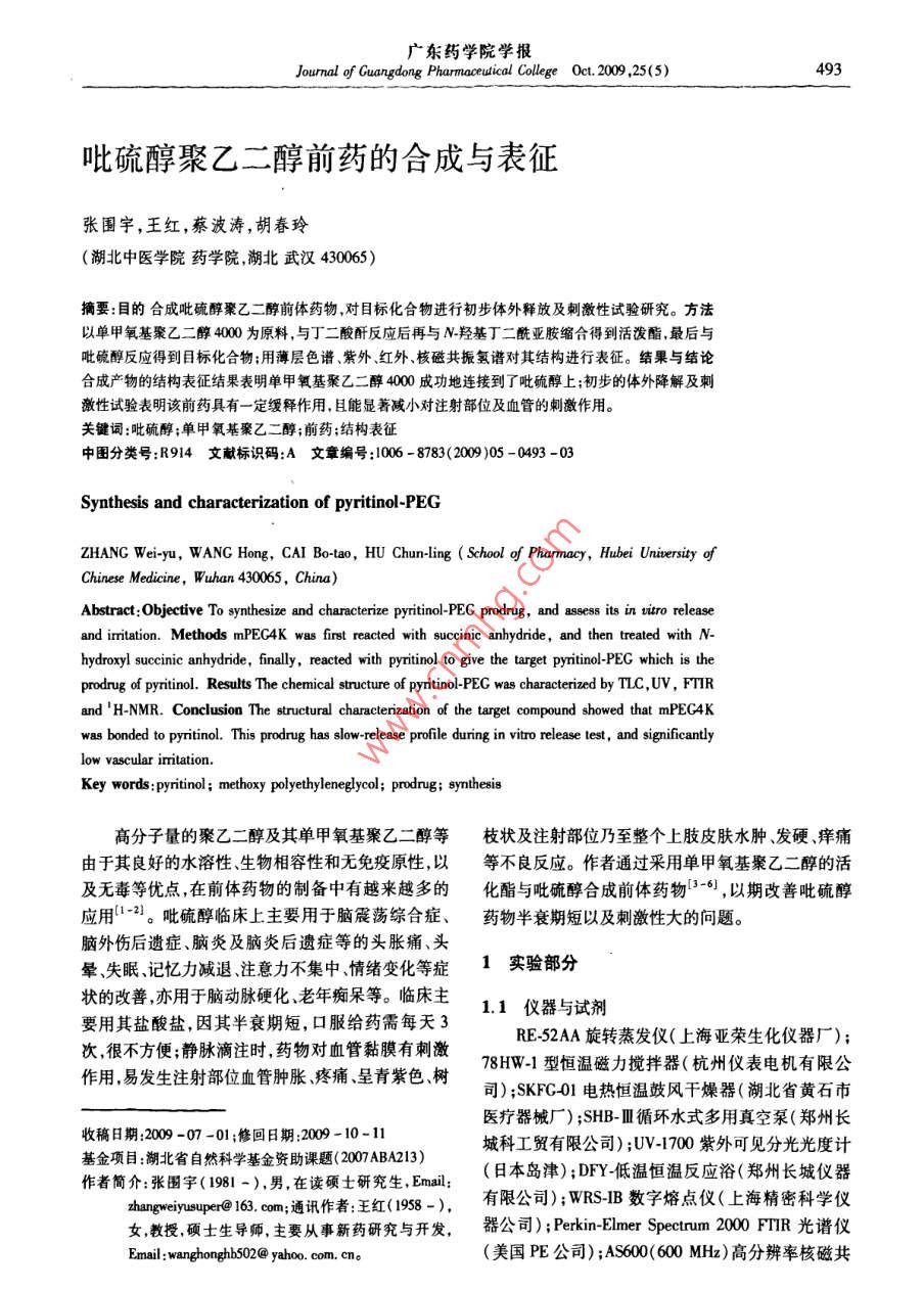 廣東藥學(xué)院學(xué)報Journal of Guangdong Pharmaceutical College Oct, 2009, 25(5)吡硫醇聚乙二醇前藥的合成與表征張圍宇,王紅,蔡波濤,胡春玲(湖北中醫(yī)學(xué)院藥學(xué)院湖北武漢430065)摘要:目的合成吡硫醇聚乙二醇前體藥物,對目標(biāo)化合物進行初步體外釋放及刺激性試驗研究。方法以單甲氧基聚乙二醇4000為原料,與丁二酸酐反應(yīng)后再與N羥基丁二酰亞胺縮合得到活潑酯最后與吡硫醇反應(yīng)得到目標(biāo)化合物;用薄層色譜、紫外、紅外、核磁共振氫譜對其結(jié)構(gòu)進行表征。結(jié)果與結(jié)論合成產(chǎn)物的結(jié)構(gòu)表征結(jié)果表明單甲氧基聚乙二醇4000成功地連接到了吡硫醇上;初步的體外降解及刺激性試驗表明該前藥具有一定緩釋作用,且能顯著減小對注射部位及血管的刺激作用。關(guān)鍵詞:吡硫醇;單甲氧基聚乙二醇;前藥;結(jié)構(gòu)表征中圖分類號:R914文獻標(biāo)識碼:A文章編號:1006-8783(200)05-0493-03Synthesis and characterization of pyritinol-PEGZHANG Wei-yu, WANG Hong, CAI Bo-tao, HU Chun-ling( School of pharmacy, Hubei University ofChinese medicine, Wuhan 430065. ChinaAbstract: Objective To synthesize and characterize pyritinol-PEG prodrug, and assess its in vitro releaseand imitation. Methods mPEG4K was first reacted with succinic anhydride, and then treated with Nhydroxyl succinic anhydride, finally, reacted with pyritinol to give the target pyritinol-PEG which is theprodrug of pyritinol. Results The chemical structure of pyritinol-PEG was characterized by TLC, UV, FTIRand 'H-NMR. Conclusion The structural characterization of the target compound showed that mPEG4Kwas bonded to pyritinol. This prodrug has slow-release profile during in vitro release test, and significantlylow vascular imitationKey words: pyritinol methoxy polyethyleneglycol; prodrug; synthesis高分子量的聚乙二醇及其單甲氧基聚乙二醇等枝狀及注射部位乃至整個上肢皮膚水腫、發(fā)硬癢痛由于其良好的水溶性生物相容性和無免疫原性以等不良反應(yīng)。作者通過采用單甲氧基聚乙二醇的活及無毒等優(yōu)點在前體藥物的制備中有越來越多的化酯與吡硫醇合成前體藥物3叫,以期改善吡硫醇應(yīng)用12。吡硫醇臨床上主要用于腦震蕩綜合癥、藥物半衰期短以及刺激性大的問題腦外傷后遺癥、腦炎及腦炎后遺癥等的頭脹痛、頭暈失眠、記憶力減退注意力不集中情緒變化等癥1實驗部分狀的改善亦用于腦動脈硬化、老年癡呆等。臨床主1.1儀器與試劑要用其鹽酸鹽,因其半衰期短,口服給藥需每天3次很不方便;靜脈滴注時,藥物對血管黏膜有刺激RE52AA旋轉(zhuǎn)蒸發(fā)儀(上海亞榮生化儀器廠);作用,易發(fā)生注射部位血管腫脹疼痛、呈青紫色樹78HW型恒溫磁力攪拌器(杭州儀表電機有限公司);SKFG01電熱恒溫鼓風(fēng)干燥器(湖北省黃石市醫(yī)療器械廠);SHB-Ⅲ循環(huán)水式多用真空泵(鄭州長收稿日期:2009-07-01;修回日期:2009-10-11城科工貿(mào)有限公司);Uv-1700紫外可見分光光度計基金項目:湖北省自然科學(xué)基金資助課題(200ABA213)作者簡介:張圍字(1981-),男在讀碩士研究生,Ema:(日本島津);DFY低溫恒溫反應(yīng)浴(鄭州長城儀器zhangweivusuper@163.com,通訊作者:王紅(98-),有限公司);wRSB數(shù)字熔點儀(上海精密科學(xué)儀女教授碩士生導(dǎo)師,主要從事新藥研究與開發(fā),器公司); Perkin-Elmer Spectrum200FTR光譜儀Email:wanghonghb502@yahoo.com.cne(美國PE公司);AS600(600MHz)高分辨率核磁共494廣東藥學(xué)院學(xué)報第25卷振儀;ZF6型三用紫外線分析儀(上海嘉鵬科技有85%,mp56.3-58.2℃。限公司)。1.2.2吡硫醇聚乙二醇前藥的合成參照文藥用單甲氧聚乙二醇400mPEC4K)(南京威獻進行合成試驗研究。稱取干燥的mPEC4K爾化工有限公司);吡硫醇(質(zhì)量分數(shù):98.5%,水A4.0g(0.1mmoL),用50 mL DMF溶解,0~5℃分:0.17%,批號:080519,上海新云化工有限公司提攪拌20min,依次加人NHs0.23g(0.2mmoL)和供);丁二酸酐、二環(huán)己基碳酰亞胺(DCC)、N羥基DCC0.62g(0.3mmoL),0~5℃攪拌10min,依次琥珀酰亞胺(NHS)、對二甲氨基吡啶(DMAP)、薄層加入吡硫醇0.48g(0.13mmoL)和DMAP0.16g層析硅膠GF、均為化學(xué)純,N,N-二甲基甲酰胺(0.13mmoL)。0~5℃反應(yīng)2h,30~35℃下反應(yīng)(DMF)、三氯甲烷、二氯甲烷、乙醚、甲醇、吡啶、丙20h,停止反應(yīng),反應(yīng)液過濾,濾液在快速攪拌下加酮均為分析純?nèi)肜湟颐?80mL,攪拌5min后置冰箱中靜置301.2方法mn。過濾得淺米黃色固體,將固體用30mL水溶解,1.2.1單甲氧基聚乙二醇4000琥珀酸單酯過濾濾液用二氯甲烷萃取(35mL×3),用1mol/L(mPEC4KA)的合成參照文獻[7-8]進行合成HCl洗滌(10mL×2)后再用水洗(15mL×2)。加試驗研究。稱取干燥的單甲氧基聚乙二醇4000人適量無水硫酸鈉干燥,靜置過夜。過濾干燥劑,濾(mPEC400040g(10mmoL),溶于150mL三氯甲液再用0.45μm微孔濾膜過濾,濾液濃縮,快速攪烷中加入丁二酸酐2.0g(20mmL)和1.6mL吡拌下加入冷無水乙醚沉淀產(chǎn)物,過濾得淺米黃色粉啶加熱回流反應(yīng)48h,減壓回收溶劑,殘余物中加末40℃真空干燥24h(干燥劑為P2O3),得淺米入飽和 NaHco3溶液150mL使溶解,過濾,用80黃色粉末(吡硫醇的載藥量4.89%),mp56.5mL乙酸乙酯萃取2次,水相冷卻至0℃后用2mo59.2℃L的HC酸化至pH2左右,用二氯甲烷100mL分32結(jié)果與討論次萃取,合并二氯甲烷層,無水Na2SO4干燥過夜。濾去干燥劑濃縮至粘稠快速攪拌下加入冷無水乙2.1合成醚300mL,放入冰箱靜置,待產(chǎn)品完全析出后過濾吡硫醇聚乙二醇前藥的