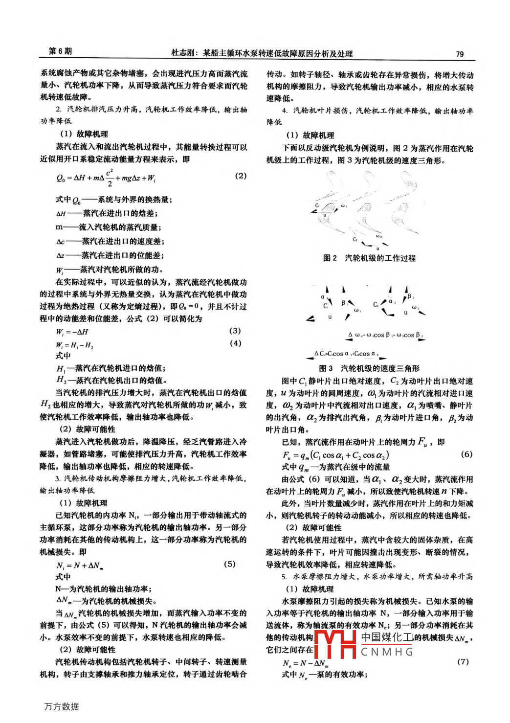 第13卷第6期中國水運(yùn)Vol.13No. 62013年6月China Water TransportJune2013某船主循環(huán)水泵轉(zhuǎn)速低故障原因分析及處理杜志剛(青島前進(jìn)船廠,山東青島266001)摘要:文中針對某船主循環(huán)水泵轉(zhuǎn)速低故障,從系統(tǒng)組成、設(shè)備結(jié)構(gòu)、工作原理等方面進(jìn)行故障原因分析,找出故障的可能原因,并總結(jié)修理過程確診故障原因。關(guān)鍵詞:汽輪機(jī)軸流泵轉(zhuǎn)速功率中圖分類號(hào): TK267文獻(xiàn)標(biāo)識(shí)碼: A文章編號(hào): 1006 -7973 (2013) 06- 0078-03一、 主循環(huán)水系統(tǒng)簡介a)流量4,000m3/h;1.主循環(huán)水系統(tǒng)b)揚(yáng)程10m水柱;主循環(huán)水系統(tǒng)的用途是在主機(jī)各種工況下,供給主冷凝c) 轉(zhuǎn)速1,000r/ min;器足夠的冷卻海水,使其建立所要求的真空。系統(tǒng)組成如圖d)葉片安裝角度2.3°.。1,主要有:4. 蝶閥a)汽輪循環(huán)水泵,包括汽輪機(jī)和水泵;蝶閥采用10MPa液壓油啟閉,可手動(dòng)操作裝置,液操b)蝶閥四只;和手操以液壓系統(tǒng)旋塞控制。c)管板結(jié)構(gòu)主冷凝器。二、故障情況2.主循環(huán)水泵汽輪機(jī)某船修后試車時(shí),調(diào)整汽輪機(jī)進(jìn)汽壓力為2MPa時(shí),汽主循環(huán)水泵汽輪機(jī)(下文簡稱汽輪機(jī)),為低壓、單缸、輪機(jī)轉(zhuǎn)速為4,200r/ min.按設(shè)計(jì)技術(shù)指標(biāo),當(dāng)汽輪機(jī)進(jìn)汽沖擊、背壓、齒輪減速、立式汽輪機(jī),相關(guān)技術(shù)數(shù)據(jù)如下:壓力為2MPa時(shí),汽輪機(jī)轉(zhuǎn)速應(yīng)為5,000r/min.在主機(jī)高a)額定功率135kw;工況運(yùn)行時(shí),系統(tǒng)不能提供足夠的海水供主冷凝器建立真空,b)供給蒸汽壓力2MPa;導(dǎo)致主機(jī)不能在高工況下運(yùn)行。c)排汽壓力0.21MPa;三、故障原因分析d)齒輪減速比5: 1。汽輪機(jī)驅(qū)動(dòng)水泵轉(zhuǎn)速不能達(dá)到設(shè)計(jì)要求,有以下幾個(gè)方面的原因:a) 汽輪輸入熱功率不足;b)汽輪機(jī)內(nèi)效率降低;c)汽輪機(jī)機(jī)械效率降低;d)水泵效率降低。根據(jù)上述原因,結(jié)合系統(tǒng)和設(shè)備的結(jié)構(gòu),分析故障的具體原因及原因發(fā)生的機(jī)理及可能性。i1. 蒸汽通道節(jié)流,供汽量減少,輸入功率降低(1)故障機(jī)理;汽輪機(jī)的內(nèi)功率的表達(dá)式為5N,= 2xH(1)式中N,- -為汽輪機(jī)的內(nèi)功率kW;Q-為汽輪機(jī)進(jìn)汽流量kg/h;H,-汽輪機(jī)中級(jí)的有效焓降kJ/kg.當(dāng)進(jìn)汽流量減Q小,導(dǎo)致汽輪機(jī)的內(nèi)功率N,減小,在負(fù)圖1 主循環(huán)水系統(tǒng)(單側(cè)左舷)載不變的前提下,汽輪機(jī)的轉(zhuǎn)速也相應(yīng)的降低。3.主循環(huán)水泵(2)故臆可能性主循環(huán)水泵(下文簡稱水泵)為立式軸流泵,相關(guān)技術(shù)蒸汽經(jīng)中國煤化工葉片及導(dǎo)葉,近汽參數(shù)如下:壓力表安裝于YHCNMHG嘴、葉片或?qū)~被收稿日期: 2013-02-20作者簡介:杜志剛(1976-), 男,青島前進(jìn)船廠工程師。