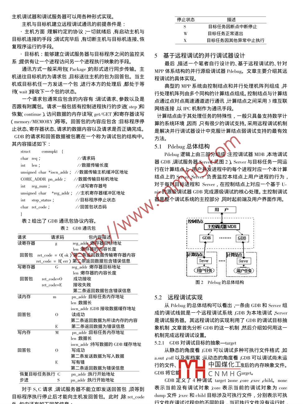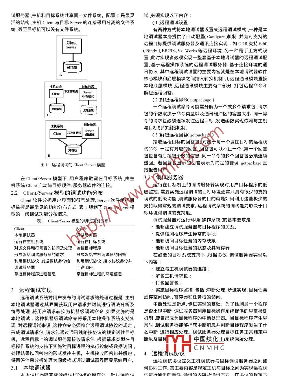 遠(yuǎn)程調(diào)試的設(shè)計(jì)與實(shí)現(xiàn)*黃瑞芳朱敏張衛(wèi)民國(guó)防科技大學(xué)計(jì)算機(jī)學(xué)院( 長(zhǎng)沙410073 )E-mail rfhuang@nudt.edu.cn摘要一般情況下調(diào)試器與被調(diào)試程序(目標(biāo)程序運(yùn)行在同一個(gè)計(jì)算機(jī)系統(tǒng)環(huán)境中但是在實(shí)時(shí)系統(tǒng)、內(nèi)核調(diào)試及一些Client/Server系統(tǒng)等情況下調(diào)試器不能運(yùn)行在目標(biāo)程序運(yùn)行的環(huán)境中此時(shí)有效的解決方法就是實(shí)施遠(yuǎn)程調(diào)試( Remote debugging 》遠(yuǎn)程調(diào)試系統(tǒng)由本地調(diào)試器、遠(yuǎn)程調(diào)試服務(wù)器以及遠(yuǎn)程調(diào)試通訊協(xié)議組成。該文詳細(xì)討論這三部分的設(shè)計(jì)與實(shí)現(xiàn)并介紹一- 個(gè)自行設(shè)計(jì)的基于遠(yuǎn)程調(diào)試的并行調(diào)試器。關(guān)鍵詞遠(yuǎn)程調(diào)試調(diào)試服務(wù)器并行調(diào)試Design and Realization of Remote DebuggingHuang Ruifang Zhu Min Zhang Weimin( National University of Defense Technology ,Changsha 410073 )Abstract : Remote debugging system ,which consists of native debugger remote debugging server and the communicationprotocol is a good solution to the problem that debugger can not run on the environment such as kermel debugging re-altime system and some client/server system on which debuggee ( target program )loes. This paper focuses on the designand realization of the remote debuging system and introduces a remote -debugging -based parallel debugger developedby us.Keywords : Remote debugging ,Debug server Parallel debugging.引言節(jié)介紹遠(yuǎn)程調(diào)試的實(shí)現(xiàn)方法第四節(jié)討論遠(yuǎn)程調(diào)試協(xié)議;最后調(diào)試器是軟件開(kāi)發(fā)必不可少的工具。通用計(jì)算機(jī)無(wú)論是描述自行設(shè)計(jì)的一個(gè)基于遠(yuǎn)程調(diào)試的大規(guī)模并行調(diào)試工具。巨型機(jī)、大型機(jī)、工作站、還是PC機(jī)都配置有適合系統(tǒng)特點(diǎn)的調(diào)試工具。如CRAY巨型機(jī)的Totalview. SGI工作站.上的2遠(yuǎn)程調(diào)試的Client/Server概念workshop debugger、 IBM SPI 上的xpdbx. PC機(jī)Windows上的源級(jí)調(diào)試器典型的內(nèi)部功能包括用戶界面、符號(hào)表處理、codeview等。然而在一些特殊環(huán)境下 系統(tǒng)可能不具備支持本目標(biāo)程序控制。其中用戶界面部分處理調(diào)試器與目標(biāo)程序的地調(diào)試器運(yùn)行的能力如:輸入/輸出以及調(diào)試命令語(yǔ)法分析;符號(hào)表處理主要進(jìn)行源級(jí)系統(tǒng)不能運(yùn)行一個(gè)本地調(diào)試器。如嵌入式系統(tǒng)、實(shí)時(shí)系和機(jī)器級(jí)調(diào)試功能及數(shù)據(jù)間的轉(zhuǎn)換,它包括表達(dá)式分析、地址統(tǒng);映射、命令轉(zhuǎn)換等;目標(biāo)程序控制是在操作系統(tǒng)支持下實(shí)施對(duì)系統(tǒng)沒(méi)有運(yùn)行本地調(diào)試器的資源。如缺乏調(diào)試需要的內(nèi).目標(biāo)程序的執(zhí)行控制、地址空間訪問(wèn)、狀態(tài)監(jiān)控。需要實(shí)施遠(yuǎn)程存、或不支持多進(jìn)程使得系統(tǒng)不能在運(yùn)行- -個(gè)本地調(diào)試器的同調(diào)試的主要原因是目標(biāo)系統(tǒng)不能完全支持這些功能必須有另時(shí)又運(yùn)行一個(gè)目標(biāo)程序;一個(gè)系統(tǒng)即主機(jī)系統(tǒng)分擔(dān)其中-部分功能。因而設(shè)計(jì)遠(yuǎn)程調(diào)系統(tǒng)不能訪問(wèn)目標(biāo)程序源文件。如缺乏文件系統(tǒng);試系統(tǒng)的首要問(wèn)題是如何在主機(jī)與目標(biāo)機(jī)之間分布這些調(diào)試系統(tǒng)的屏幕或鍵盤(pán)不能用于調(diào)試。如目標(biāo)程序占用了屏幕和鍵盤(pán)。Client/Server 結(jié)構(gòu)是-般遠(yuǎn)程調(diào)試系統(tǒng)采用的模型CNU另- -方面從計(jì)算機(jī)系統(tǒng)結(jié)構(gòu)的發(fā)展現(xiàn)狀看,Client/Server的GDB、CRAY的Totalview以及DEC的Ladebug的遠(yuǎn)程調(diào)試結(jié)構(gòu)已越來(lái)越普遍,- 個(gè)應(yīng)用軟件通常分布在多個(gè)不同的機(jī)器系統(tǒng)都是這種模型。上運(yùn)行,與這種應(yīng)用相對(duì)應(yīng)的調(diào)試也必須向分布式結(jié)構(gòu)發(fā)展。2.1遠(yuǎn)程 調(diào)試Client/Server模型要解決調(diào)試領(lǐng)域中這種特殊且日趨普遍的情況最有效的解決在Client/Server模型中Client調(diào)試器即為本地調(diào)試器運(yùn)方法就是該文討論的遠(yuǎn)程調(diào)試。行在主機(jī)環(huán)境下Server 調(diào)試器即為調(diào)試服務(wù)器,與目標(biāo)程序通常調(diào)試器運(yùn)行的環(huán)境’主機(jī)"與目標(biāo)程序運(yùn)行的環(huán)境一起運(yùn)行在目標(biāo)環(huán)境下。 圖1給出了三種典型的Client/Server(目標(biāo)機(jī)" )相同遠(yuǎn)程調(diào)試是指主機(jī)和目 標(biāo)機(jī)為物理上分離的模型。中國(guó)煤化工系統(tǒng)兩個(gè)系統(tǒng)之間用網(wǎng)絡(luò)或-般線性端口連接。遠(yuǎn)程調(diào)試系在配置HCNMH G與同一文件系統(tǒng)連接統(tǒng)由三部分組成主機(jī)上的本地調(diào)試器,目標(biāo)機(jī).上的調(diào)試服務(wù)的同一機(jī)器L必疋件仞任1舊過(guò)區(qū)租上分離的遠(yuǎn)程調(diào)試特器遠(yuǎn)程調(diào)試協(xié)議。該文第二節(jié)介紹遠(yuǎn)程調(di