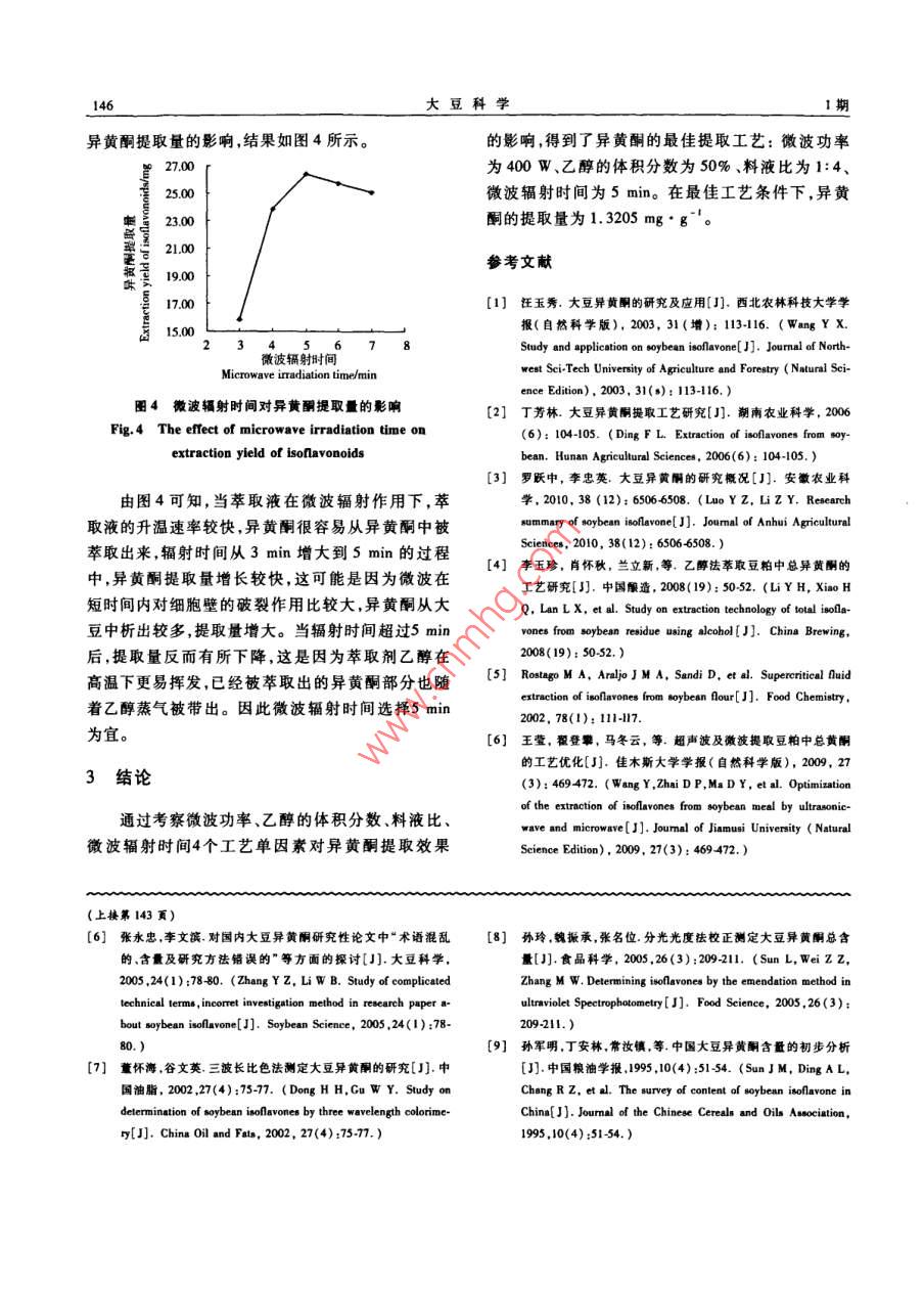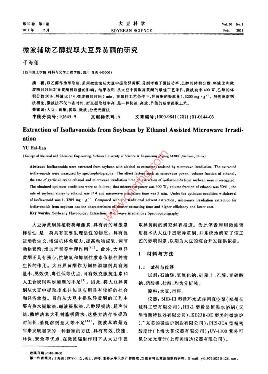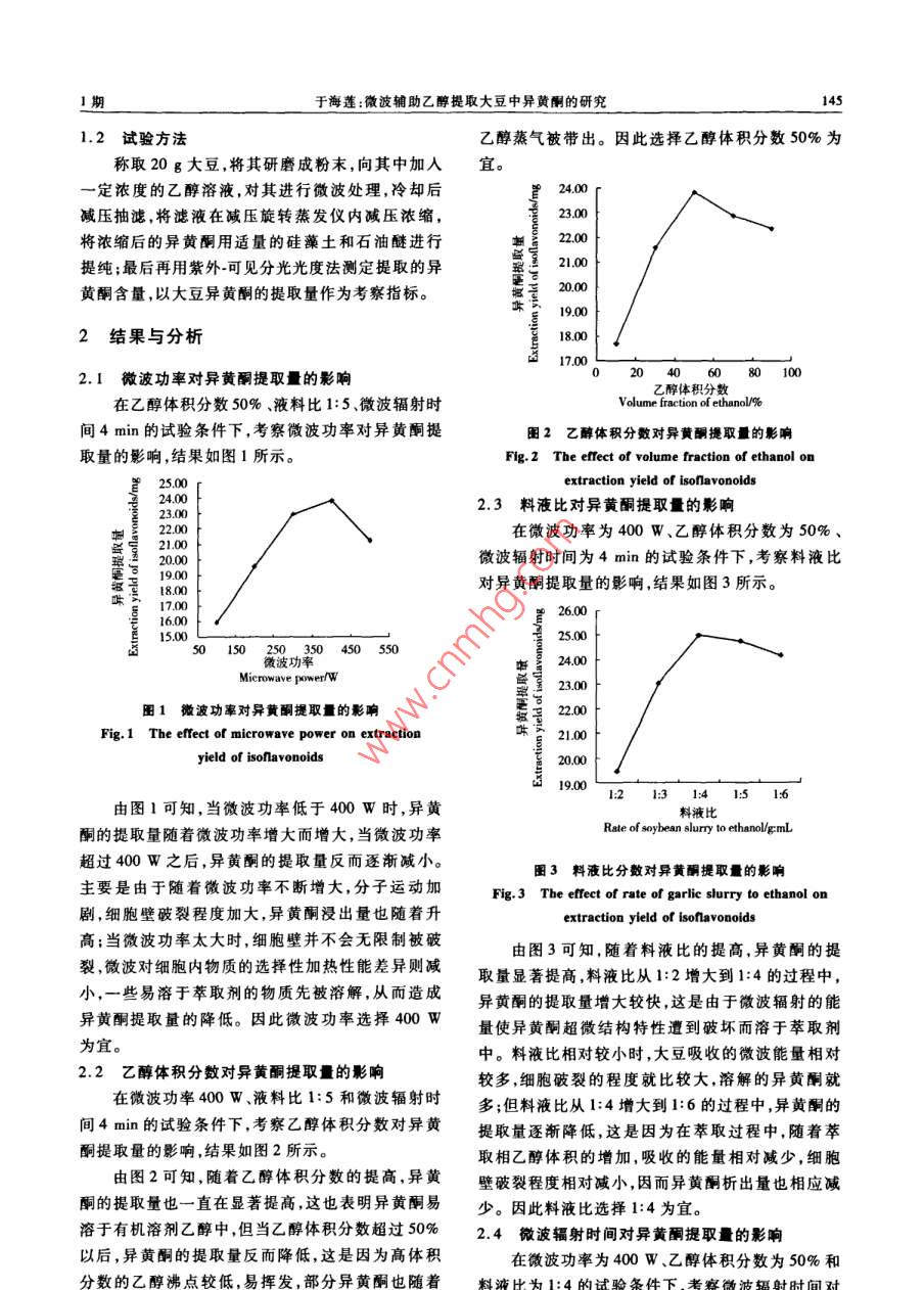 第30卷第I期大豆科學(xué)Vol 30 No. 12011年2月SOYBEAN SCIENCEFeb.2011微波輔助乙醇提取大豆異黃酮的研究于海蓮(四川理工學(xué)院材料與化學(xué)工程學(xué)院四川自貢643000摘要:以乙醇作為萃取劑,采用微波法從大豆中提取異黃酮,分別考察了微波功率、乙醇的體積分?jǐn)?shù)料液比和微波輻射時(shí)間對(duì)異黃酮提取量的影響。結(jié)果表明:從大豆中提取異黃酮的最佳工藝條件:微波功率400W、乙醇的體積分?jǐn)?shù)50%、料液比1:4、微波輻射時(shí)間5min。在最佳工藝條件下,異黃酮的提取量1.3205mg·g1。與傳統(tǒng)溶劑法相比微波法不僅節(jié)省時(shí)間,而且提取效率高,是一種快速、高效、節(jié)能的新型提取工藝。關(guān)鍵詞:大豆;黃酮;提取;微波;分光光度法中圖分類號(hào):TQ645.9文獻(xiàn)標(biāo)識(shí)碼:A文章編號(hào):10009841(2011)014014403Extraction of Isoflavonoids from Soybean by Ethanol Assisted Microwave Irradi-ationYU Hai-lianCollege of Material and Chemical Engineering, Sichuan University of Science Engineering, Zigong 643000, Sichuan, China)Abstract: Isoflavonoids were extracted from soybean with alcohol as extractant assisted by microwave irradiation. The extractedsoflavonoids were measured by spectrophotography. The effect factors such as microwave power, volume fraction of ethanolthe rate of garlic slurry to ethanol and microwave irradiation time on extraction of isoflavonoids from soybean were investigatedThe obtained optimum conditions were as follows: that microwave power was 400 W, volume fraction of ethanol was 50%, therate of soybean slurry to ethanol was 1: 4 and microwave irradiation time was 5 min. Under the optimum condition withdrawalof isoflavonoid was 1. 3205 mg.g". Compared with the traditional solvent extraction, microwave irradiation extraction forisoflavonoids from soybean has the characteristics of shorter extracting time and higher efficiency and lower cost.Key words: Soybean; Flavonoids Extraction; Microwave irradiation; Spectrophotography大豆異黃酮屬植物類雌激素,具有弱的雌激素取異黃酮的研究鮮有報(bào)道。為此筆者利用微波輻樣活性,是一類具有重要生理活性的物質(zhì)。具有促射技術(shù)從大豆中提取異黃酮,并系統(tǒng)地研究了該工進(jìn)動(dòng)物生長(zhǎng),增強(qiáng)機(jī)體免疫力,提高動(dòng)物泌乳,調(diào)節(jié)藝的彩響因素,以期為大豆的綜合開(kāi)發(fā)提供依據(jù)。動(dòng)物繁殖,增加產(chǎn)蛋等生理作用(13。此外,大豆異黃酮還具有強(qiáng)心,抗缺氧和抑制性激素依賴性腫瘤材料與方法生長(zhǎng)的作用。大豆異黃酮作為飼料添加劑具有劑1.1試劑與儀器量小、見(jiàn)效快、毒性低等優(yōu)點(diǎn),可有效克服抗生素和試劑:石油醚、氫氧化鈉、硅藻土、乙醇、亞硝酸人工合成飼料添加劑的不足1。因此將大豆異黃鈉、硝酸鋁、鹽酸,均為分析純。酮從大豆中提取出來(lái)并加以應(yīng)用具有較好的社會(huì)原料:大豆,市售。和經(jīng)濟(jì)效益。目前從大豆中提取異黃酮的工藝主儀器:SHB-Ⅲ型循環(huán)水式多用真空泵(鄭州長(zhǎng)要有熱水提取法堿液提取法、乙醇浸提法超聲波城科工貿(mào)有限公司);HH2型數(shù)顯恒溫水浴鍋(天法、酶解法和大孔樹(shù)脂吸附法,這些方法存在提取津市斯特儀器有限公司);KD23BDE型美的微波爐時(shí)間長(zhǎng),消耗溶劑量大等不足。微波萃取是近廣東美的微波爐制造有限公司);PHS3CA型精密年來(lái)發(fā)展起來(lái)的一種新穎的方法,具有高效、快速、酸度計(jì)(上海大普儀器有限公司);UV-1100紫外可環(huán)保、安全等優(yōu)點(diǎn),在微波輻射作用下從大豆中提見(jiàn)分光光度計(jì)(上海美譜達(dá)儀器有限公司)收稿日期:20101031第一作者簡(jiǎn)介:于海蓮(1979-),女,碩士,講師,主要從事天然產(chǎn)物提取功能材料及其添加劑的研究。 E-mail:yhl9791027@126,cm1期于海蓮:微波輔助乙醇提取大豆中異黃酮的研究1451.2試驗(yàn)方法乙醇蒸氣被帶出。因此選擇乙醇體積分?jǐn)?shù)50%為稱取20g大豆,將其研磨成粉末,向其中加人宜一定濃度的乙醇溶液,對(duì)其進(jìn)行微波處理,冷卻后2400減壓抽濾,將濾液在減壓旋轉(zhuǎn)蒸發(fā)儀內(nèi)減壓濃縮2300將濃縮后的異黃酮用適量的硅藻土和石油醚進(jìn)行22.00提純;最后再用紫外可見(jiàn)分光光度法測(cè)定提取的異21黃酮含量,以大豆異黃酮的提取量作為考察指標(biāo)。2結(jié)果與分析2.1微波功率對(duì)異黃酮提取量的影響乙醇體積分?jǐn)?shù)在乙醇體積分?jǐn)?shù)50%、液料比1:5微波輻射時(shí)間4min的試驗(yàn)條件下,考察微波功率對(duì)異黃酮提圖2乙醇體積分?jǐn)?shù)對(duì)異黃酮提取量的影響取量的影響結(jié)果如圖1所示。Flg. 2 The effect of volume fraction of ethanol onextraction yield of isoflavonoids24.002.3料液比對(duì)異黃酮提取量的影響2200在微波功率為400W、乙醇體積分?jǐn)?shù)為50%微波輻射時(shí)間為4min的試驗(yàn)條件下,考察料液比19008.O0對(duì)異黃酮提取量的影響,結(jié)果如圖3所示17.002550150450550圖1微波功率對(duì)異黃酮提取量的影響ig. 1 The effect of microwave power on extraction集云2100900:21:31:41:51:6由圖1可知,當(dāng)微波功率低于400W時(shí),異黃酮的提取量隨著微波功率增大而增大,當(dāng)微波功率Rate of soybean slurry to ethanol/gmL超過(guò)400W之后,異黃酮的提取量反而逐漸減小。圖3料液比分?jǐn)?shù)對(duì)異黃酮提取量的影響主要是由于隨著微波功率