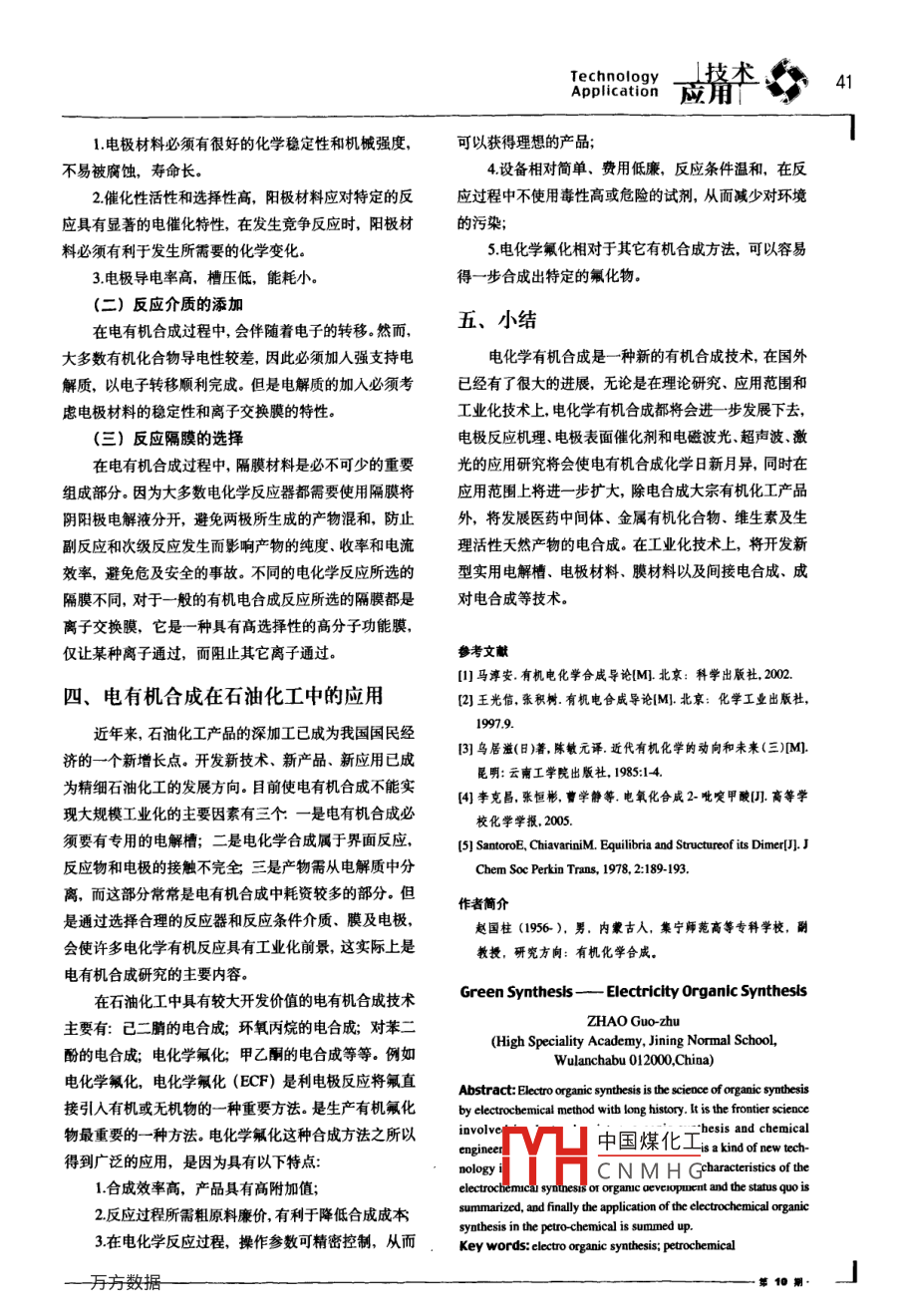 40科技成果Management and Research on管理與研究Scientitic & Technological Achievements|中圖分類號:0621.38文獻(xiàn)標(biāo)識碼:A D0107272.j.s.673-6516.2009.10.000綠色合成一-電有機合成趙國柱/集寧師范高等專科學(xué)校,內(nèi)蒙古烏蘭察布012000摘要:電有機合成是用電化學(xué)方法進(jìn)行有機化合物合成的科學(xué),具有悠久的歷史。它是一門涉及電化學(xué)、有機合成及化學(xué)工程等內(nèi)容的邊緣學(xué)科。電化學(xué)有機合成是一種新的有機合成技術(shù)。本文歸納了電化學(xué)有機合成的特點發(fā)展及現(xiàn)狀,并介紹了電化學(xué)有機合成在石油化工中的應(yīng)用情況。關(guān)鍵詞:電有機合成;石油化工電有機合成是綠色環(huán)保型的有機合成方法,目前主(一)直接電有機合成要用于有機化工和石油化工中,國外已有幾百種電有機直接電有機合成是有機物分子直接與電極交換電子合成技術(shù)在研究和開發(fā)中,且有50種之多的電有機合成而引起氧化反應(yīng)或還原反應(yīng)。這種電有機合成方法是最技術(shù)在工業(yè)上得到應(yīng)用。隨著人們環(huán)保意識的不斷增早開發(fā)的電合成方法,現(xiàn)在已廣泛地用于科研和工業(yè)生強,對這種綠色環(huán)保型的有機合成方法越來越重視,不產(chǎn)中久的將來,電有機合成就會在很多領(lǐng)域得到廣泛的推廣(二)間接電有機合成和應(yīng)用。間接電有機合成是利用一種媒質(zhì)和有機物發(fā)生反應(yīng),然后通過電化學(xué)反應(yīng)使得該媒質(zhì)被重復(fù)利用。一、電有機合成的優(yōu)越性間接電化學(xué)合成有機物有許多優(yōu)點,可在較低的電電有機合成相對傳統(tǒng)的有機合成具有顯著的優(yōu)越壓下進(jìn)行反應(yīng),因而節(jié)省電能,可將有害的有機合成路性,其特點是:線變?yōu)閷Νh(huán)境無害的綠色環(huán)保合成路線。但間接電有機(一)電化學(xué)反應(yīng)是在電極上得失電子實現(xiàn)的,原則合成分離提純相對困難,而且槽內(nèi)式間接電有機合成很上不需要加入其它化學(xué)試劑,副反應(yīng)少,反應(yīng)效率高。難實現(xiàn),因為媒質(zhì)電化學(xué)反應(yīng)和反應(yīng)物化學(xué)反應(yīng)在同- -(二)由于電子是最千凈的試劑,因而污染小,這對反應(yīng)條件下很難匹配或相容。一般間接電有機合成是在于當(dāng)前的無公害生產(chǎn)要求尤為重要,是今后發(fā)展“綠色直接電有機合成無法實現(xiàn)或者生成目標(biāo)產(chǎn)物的選擇性、化學(xué)合成工業(yè)”和精細(xì)化工產(chǎn)品的重要手段。電流效率等參數(shù)比較低的情況下,才考慮間接電有機合(三)電有機合成反應(yīng)條件溫和,大多是在常溫常壓成方法。下進(jìn)行,可方便地通過控制電壓或電流來控制氧化或還原反應(yīng)速度,可隨時終止和啟動反應(yīng)的發(fā)生。對節(jié)約能三電有機合成的研究對象源、簡化生產(chǎn)過程和實現(xiàn)自動控制等都是十分有利的。電有機合成最基本的研究對象是各類有機反應(yīng)在(四)反應(yīng)有較高的選擇性,在定向合成上有優(yōu)勢而“電極/溶液”界面上的熱力學(xué)與動力學(xué)性質(zhì),考察這類且產(chǎn)品純度高。有機反應(yīng)在電化學(xué)體系內(nèi)反應(yīng)的可能性及機理。許多合(五)不僅可代替昂貴、危險的氧化還原劑,還使反成有機化合物的化學(xué)反應(yīng)中包含著電子轉(zhuǎn)移,如果把這應(yīng)步驟大為減少,可以將某些對環(huán)境有污染的反應(yīng),轉(zhuǎn)些合成反應(yīng)安排在電解池中進(jìn)行,就是電有機合成反為對環(huán)境無害的合成方法。中國煤化工,主要取決于電極材二、電有機合成分類YCNMH G電有機合成通常分為直接電有機合成和間接電有機電極材料是- -種特殊的功能材料,對整個反應(yīng)過程合成。都有影響。因此就要求電極材料具有以下性質(zhì):L總抒衢數(shù)據(jù)Technology41Application應(yīng)角T1.電極材料必須有很好的化學(xué)穩(wěn)定性和機械強度,可以獲得理想的產(chǎn)品;不易被腐蝕,壽命長。4.設(shè)備相對簡單、費用低廉,反應(yīng)條件溫和,在反2.催化性活性和選擇性高,陽極材料應(yīng)對特定的反應(yīng)過程中不使用毒性高或危險的試劑,從而減少對環(huán)境應(yīng)具有顯著的電催化特性,在發(fā)生競爭反應(yīng)時,陽極材的污染;料必須有利于發(fā)生所需要的化學(xué)變化。5.電化學(xué)氟化相對于其它有機合成方法,可以容易3.電極導(dǎo)電率高,槽壓低,能耗小。得一步合成出特定的氟化物。(二)反應(yīng)介質(zhì)的添加在電有機合成過程中,會伴隨著電子的轉(zhuǎn)移。然而,.五、小結(jié)大多數(shù)有機化合物導(dǎo)電性較差,因此必須加入強支持電電化學(xué)有機合成是- -種新的有機合成技術(shù),在國外解質(zhì),以電子轉(zhuǎn)移順利完成。但是電解質(zhì)的加入必須考已經(jīng)有了很大的進(jìn)展,無論是在理論研究、應(yīng)用范圍和慮電極材料的穩(wěn)定性和離子交換膜的特性。工業(yè)化技術(shù)上,電化學(xué)有機合成都將會進(jìn)步發(fā)展下去,(三)反應(yīng)隔膜的選擇電極反應(yīng)機理、電極表面催化劑和電磁波光、超聲波、激在電有機合成過程中,隔膜材料是必不可少的重要光的應(yīng)用研究將會使電有機合成化學(xué)日新