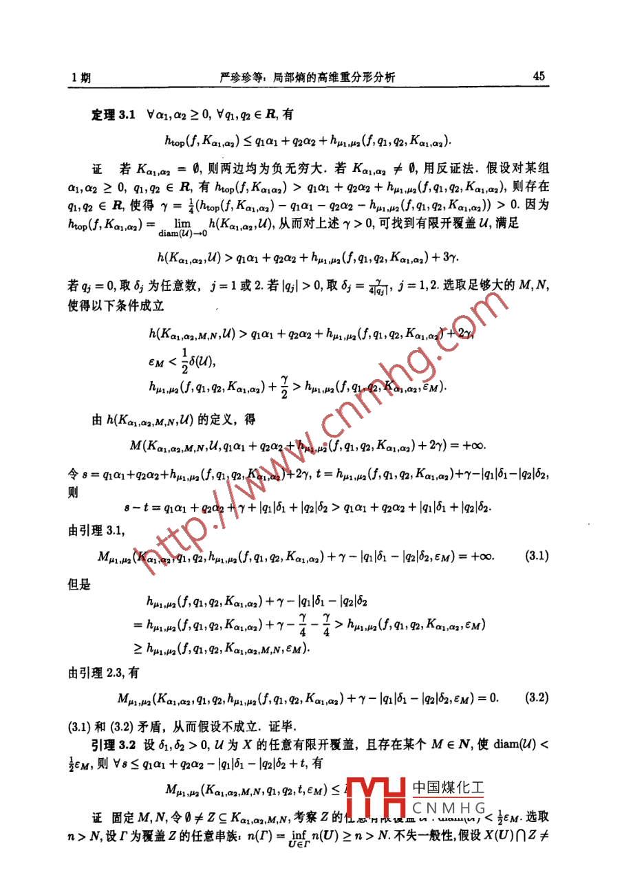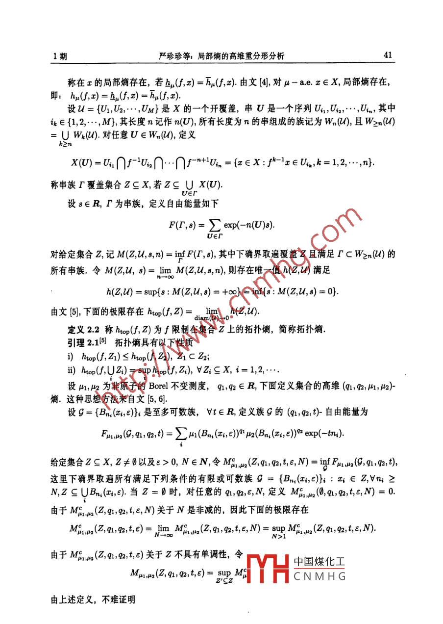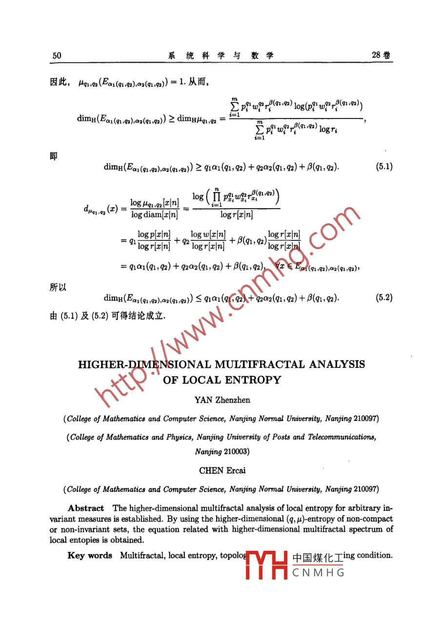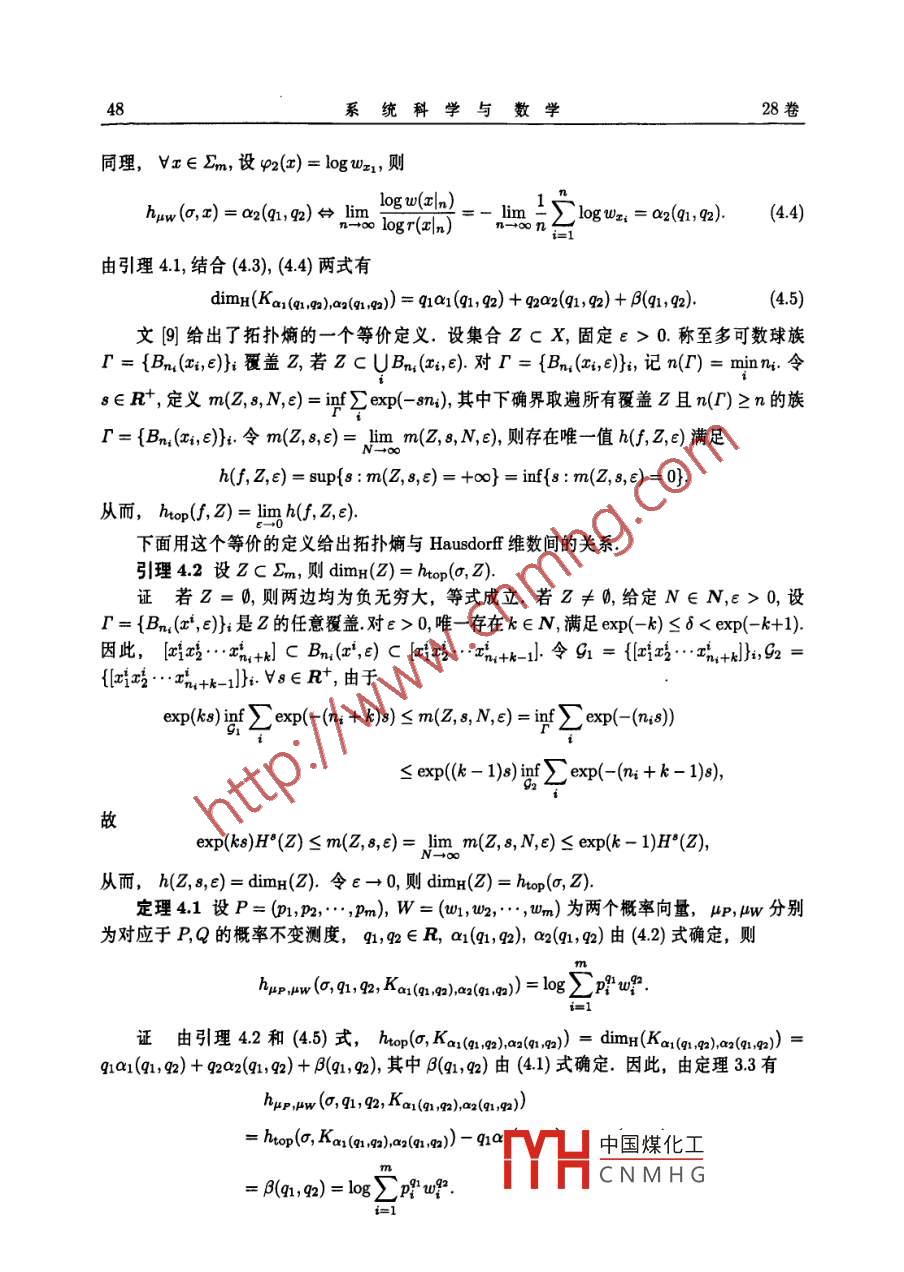 系統(tǒng)科學(xué)與數(shù)學(xué)J. Sys. Sci. Math. Scis28(1)(2008,1),4050局部熵的高維重分形分析嚴珍珍(南京師范大學(xué)數(shù)學(xué)與計算機科學(xué)學(xué)院,南京210097;南京郵電大學(xué)數(shù)理學(xué)院,南京21003陳二才(南京師范大學(xué)數(shù)學(xué)與計算機科學(xué)學(xué)院,南京210097)瘸要對不變測度建立了高維形式的重分形分析,即考察與多維參數(shù)相關(guān)聯(lián)的重分形分解利用非緊集或非不變集的高維(q,山)嫡,給出了局部熵的高維重分形譜的一個關(guān)系式關(guān)鍵詞重分形分析,局部熵,拓撲熵,熵倍增條件MR(2000)主題分類號28A80,37D251引言設(shè)(X,d為緊致的度量空間,f:X→X是連續(xù)映射,μ是非原子的Bore不變測度,重分形分析的主要問題是描述測度的局部奇異性.一般地,重分形分析主要是與研究 Borel測度的局部(點態(tài))維數(shù)相關(guān)聯(lián),在文(中,重分形譜是維數(shù)譜,即函數(shù)f(a)= dimH({t:d(x)=a})由于一般的動力系統(tǒng)不具有微分結(jié)構(gòu),因此文(2用不變測度μ的局部熵取代了局部點態(tài)維數(shù),同時用集合的拓撲熵取代了集合的 hausdorff維數(shù),其重分形譜是熵譜,即函數(shù)E(a)=hop(f{x∈X:h4(f,x)=a}).而文3對某些雙曲動力系統(tǒng)建立了高維形式的重分形分析.本文對不變測度p,建立了局部熵高維形式的重分形分析,即Va1,a2≥0,Vq,q2∈R,有hiop (, Kai, aa)=q1a1 +9202+hha(, 91, 92, Ka1, a?)2定義及引理定義21關(guān)于測度μ的下、上點態(tài)(局部)熵的定義如下A)=二(-1(B9),項2單1(-1其中B1)={∈x;(a,()<=0,,中國煤化工述關(guān)于E的極限存在CNMHG國家自然科學(xué)基金(10271057,10571086)和南京郵電大學(xué)青藍計劃(NY206053)資助項目收稿日期:20050415,收到修改稿日期,200605-101期嚴珍珍等,局部熵的高維重分形分析稱在z的局部熵存在,若b(f,)=h2(,2),由文囤,對μ-ae,x∈x,局部熵存在,Bp: hu(f, r)=hu(, a)=hu(, r)設(shè)l={U1,U2,…,UM}是X的一個開覆蓋,串U是一個序列U1,U2,…,Un,其中ik∈{1,2,…,M},其長度n記作n(U),所有長度為n的串組成的族記為Wn),且Wn4UW().對任意U∈Wn(),定義k>nx(U)=U∩fUn∩1…∩fn+Un=ex:/ CE E Ui,k=12…,n稱串族F覆蓋集合Z≌X,若ZsUX(U設(shè)s∈R,P為串族,定義自由能量如下F(F,8)=∑exp(n(U)8)U∈r對給定集合2,記M2,)=fF(F,,其中下確界取遍覆蓋2且滿足rcW2n)的所有串族.令M(z,,8)=limM(z,l,s,n),則存在唯一值h(z,)滿足h(z,0)=sup{8:M(∠z,,8)=+0=inf{:M(z,l,)=0}由文間],下面的極限存在hp(,Z)=,limh(2Z,0定義22稱hp(f,Z)為∫限制在集合Z上的拓撲熵,簡稱拓撲熵引理21拓撲熵具有以下性質(zhì)i)htop(, Z1)s hop (, Z2), Z1 CZ2iii)hop (f, UZi)=sup htop(, Zi),VZisx, i=1, 2,設(shè),2為非原子的 Borel不變測度,qn,q∈況,下面定義集合的高維(q,2,p1,2)熵.這種思想方法來自文⑤,6]設(shè)g={Bn(x1,)}是至多可數(shù)族,t∈R,定義族9的(q,g2,t)-自由能量為FuI,a(9,91, 92, t)=A1(Bn (c e ))u2(Bn (z;, e))exp(tni)給定集合ZX,Z≠以及c>0,N∈N,令M12(,n,q,te,N)=infF2(,q,,這里下確界取遍所有滿足下列條件的有限或可數(shù)族g={Bn,(x1,l)};:x;∈z,n≥N, ZCUBn、(r;2)當Z=時,對任意的q,9a,e,N,定義M,2(0,q,9,te,M)=0由于M1n(2,n,g,t,E,N)關(guān)于N是非減的,因此下面的極限存在Ma.(Z, 91, 92, t, e)=lim MC, u (Z, 91, 92, t, E, N)=sup Ma u(Z, 91, 92, t,E, N)由于M1m2(zq1,q2,t,E)關(guān)于Z不具有單調(diào)性,令中國煤化工Mui, wa(Z, q1, 92, t, e)=sup MeYHCNMHG由上述定義,不難證明系統(tǒng)科學(xué)與數(shù)學(xué)28卷引理22集函數(shù)M1,2(,q,g,t,e)具有以下性質(zhì)i)Mx2(,q2,q,t,E)=0;ii)MH1,a(Z1, 91,92, t,e)< MH1 a(Z2, 91, 92, t, e),VZ1SZ2i)lMnn2(U;2,q1,m2,t,e)≤∑AM12(2,q,g,t,e),V么sx,讠=1,2,引理23存在唯一確定的值h12(f,q1,g,z,e)∈|-∞,+],使得t< hHi, u?(, 1, 92, Z, e)Mn1,2(z,q1,g2,t,E)=0,t>hn1,n2(,q1,g,Z,e)引理24下面的結(jié)論成立i)h-1,2(f,q1,g2,0,E)=-∞;ii)hui, ua(, 1, 92, Z1, E)shui, ua(, 41, 92, Z2, e), vZ1 Z2ii)hui, Ha(, 91, 92, UZi, e)=sup hp1 u2 (, 91, 92, Zi, e),VZiSX, i=1, 2,定義23集合Z的(1,g,p1,p2)熵定義為91, 92, 2)=lim p1, ua(, 91, 92, Z,E)(21)下面說明上述定義中關(guān)于E的極限的存在性若q,q2≤0,對e1>E2>0,令g={Bn,(x;,E2)}是Z的中心覆蓋,則¢"={Bn1(x,1)}也是Z的中心覆蓋,且F412(,q1,g,)≥F2,2(y,q,g,t),故MHl, ua(Z, 91, 92, t, E2)>MHl, 2(Z, 91, 92, t, E1),從而n12(f,q1,9,2,e1)≤h,2(,q,g,Z,e2因此(21)中的極限存在一般地,當q1,q2>0時,關(guān)于E的單調(diào)性不再成立,因此需要附加的條件定義24稱不變測度μ滿足熵倍增條件,若對任意充分小的ε>0,有C(=n()<0容易看出,若測度滿足熵倍增條件,則8upup出:12<∞對任意a>1及充分小的E>0成立若測度,j=1,2對任意的e∈(0,0)滿足熵倍增條件,取e1,e2∈(0,E0,a=a>1,則存在C=C(a)<∞,使得ui Bn(a,Ai B,Ai(Bn(, E2))(qi+qa)Mul,a(Z, 91, 92, t, E1)嚴珍珍等:局部熵的高維重分形分析從而hu, ua(, 91, 92, Z, E2)>hu1, wa(, 91, 92, Z,E1)因此(21)中的極限存在當q1≤0,g>0時,若測度p對任意的ε∈(0,-o)滿足熵倍增條件,結(jié)合前面兩種情況的討論,(21)中的極限存在引理25由引理24及定義23,下面的結(jié)論成立i)hn1,n2(,q1,g2,)=-0;i)hn,2(f,qh,q,z1)≤h,(f,q,g,2),ⅤZ1sZ2ii)hmi, ua(, 91, 92, Z4)s sup hul, a(, 91, 92, Z1),ZiSX, i=1, 2,3主要結(jié)果及證明設(shè)a1,a2≥0,q1,g∈R,記Ka,a2={x∈x:h1(,x)=a1,hn2(f,x)=a2}下面證明本文的主要結(jié)果htop(, Kan ag)=qa1+q2a2+hua,ua(, 91, 92, Ka1, a2)當x∈Ka1,a2時,有如(-1()21m(k(B()=,了=12選取單調(diào)遞減序列EM→0(M→∞),令>0,j=1,2記Ka1a2.M={x∈Ka1aaj-5y< lim inf ( -i1logA(B(r,EM))), j顯然Ka1,a2,MsKa,a21M+1,且Ka,a2=UKa1,a2,M由-1ogH(Bn(x,e),=1,2關(guān)于c