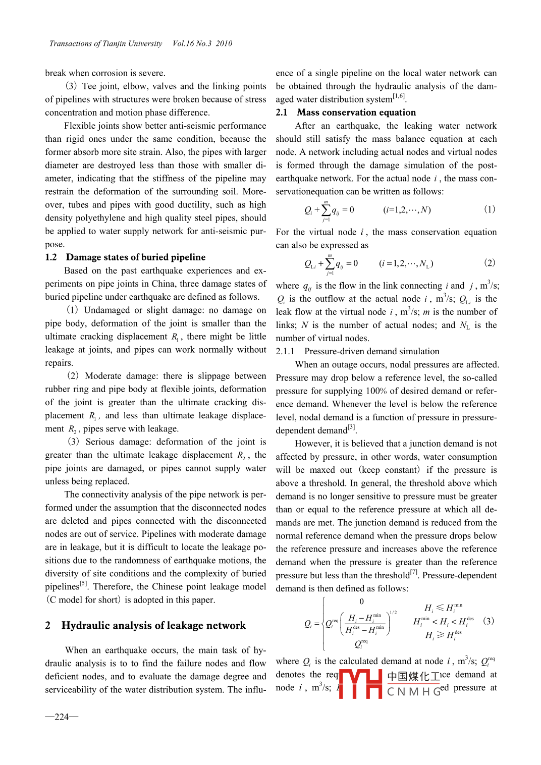 Trans. Tianjin Univ. 2010, 16: 223-228DOL 10.1007/s12209-01 0-0039-9Seismic Reliability and Rehabilitation Decisionof Water Distribution System"LIU Chunguang (柳春光) 1,2,HE Shuanghua (何雙華)2(1. State Key Laboratory of Coastal and Offshore Engineering, Dalian University ofTechnology, Dalian 116024,China; 2. Faculty of Infrastructure Engineering, Dalian University of Technology, Dalian 1 16024, China)◎Tianjin University and Springer-Verlag Berlin Heidelberg 2010Abstract: In order to evaluate the seismic reliability of water distribution system and make rehabilitation decisionscorrespondingly, it is necessary to assess pipelines damage states and conduct functional analysis based on pipe leak-age model. When an earthquake ocurred, the water distribution system kept serving with leakage. By adding a virtualnode at the centre of the pipeline with leakage, an efficient approach to pressure-driven analysis was developed forsimulating a variety of low relative scenarios, and a hydraulic leakage model was also built to perform hydraulic analy-sis of the water supply network with seismic damage. Then the mean-first-order-second-moment method was used toanalyse the seismic serviceability of the water distribution system. According to the assessment analysis, pipes thatwere destroyed or in heavy leakage were isolated and repaired emergently, which improved the water supply capabilityof the network and would constitute the basis for enhancing seismic reliability of the system. The proposed approachto seismic reliability and rehabilitation decision analysis on water distribution system is demonstrated effectivethrough a case study.Keywords: water distribution system; hydraulic analysis; leakage model; seismic reliability; rehabilitation decisionW ater distribution system is an important part of ur- pressure is not sufficient for supplying the required de-ban lifeline systems. Due to severe earthquakes occurred mand'. In this paper, pressure-driven demand analysis isin recent years, there were many structure damages and developed for simulating pressure deficient conditions,function failures in the water distribution system, which and the mean-first-order-second-moment method is in-brought great inconvenience to people's life and huge troduced to analyse the seismic serviceability of the watereconomic losses. Thus, it is important to analyse and es- distribution system, which can be applied to further studytimate the serviceability of the water distribution system on seismic performance control analysis and enhance-properly before and after the earthquake.ment of seismic resistance of water distribution system.Seismic performance of the water distribution system refers to the ability that the water supply network 1 Damage states simulation of pipe networkmeets the post-earthquake special demands for waterquantity and pressure under the seismic damage". As 1.1 Damage behaviour and anti-seismic measuresburied pipelines are numerous and geographically dis-of buried pipelinetributed, the locations of slight or moderate damage areThe main damage types of water supply pipelinesvery difficult to discover and repair after the earthquake. under earthquake in China arel4 as follows.Therefore, the water supply network often served with(1) Joint damage: mortar fller falls off in joint,leakage after the earthquakel-, and leakage models spigot pulls out or bell breaks for segmented pipeline; theneeded to be built to perform hydraulic analysis.weld crack or the bolts of pipe-flanges loosen for steelConventional demand-driven models of water sys- pipeline.tem are formulated under the assumption that water con-(2) Longitudinal and oblique crevices appear insumption or demand defined at nodes is statistically con- pipe bodies of reinforced concrete, asbestos concrete andstant, which is not suitable for the cases in which nodal cast iron. Small diameter steel and cast-iron pipe bodyAccepted date: 209-11-13.中國煤化工*Supported by National Natural Science Foundation of China (No. 50478094).CNMH GLIU Chunguang, born in 1964, male, Dr, Prof.MHCorrespondence to LIU Chunguang, E-mail: liucg@dlut.edu.cn.Transactions of Tianjin University Vol. 16 No.32010break when corrosion is severe.ence of a single pipeline on the local water network can(3) Tee joint, elbow, valves and the linking points be obtained through the hydraulic analysis of the dam-of pipelines with structures were broken because of stress aged water distribution systeml1,o.concentration and motion phase difference.2.1 Mass conservation equationFlexible joints show better anti-seismic performanceAfter an earthquake, the leaking water networkthan rigid ones under the same condition, because the should still satisfy the mass balance equation at eachformer absorb more site strain. Also, the pipes with larger node. A network including actual nodes and virtual nodesdiameter are destroyed less than those with smaller di- is formed through the damage simulation of the postameter, indicating that the stiffiness of the pipeline may earthquake network. For the actual node i , the mass con-restrain the deformation of the surrounding soil. More- servationequation can be witten as follows:over, tubes and pipes with good ductility, such as highQ+Zq, =0(-1.,2,..,N)(1)density polyethylene and high quality steel pipes, shouldbe applied to water supply network for anti-seismic pur- For the virtual node i, the mass conservation equationpose.can also be expressed as1.2 Damage states of buried pipelineQu+Zqy=0(i= ,2,.,N,.)(2Based on the past earthquake experiences and ex-periments on pipe joints in China, three damage states of where q;j is the flow in the link connecting iand j , m/s;buried pipeline under earthquake are defined as follows.Q is the outflow at the actual node i, m'/s; Qu; is the(1) Undamaged or slight damage: no damage on leak flow at the virtual node i, m2/s; m is the number ofpipe body, deformation of the joint is smaller than the links; N is the number