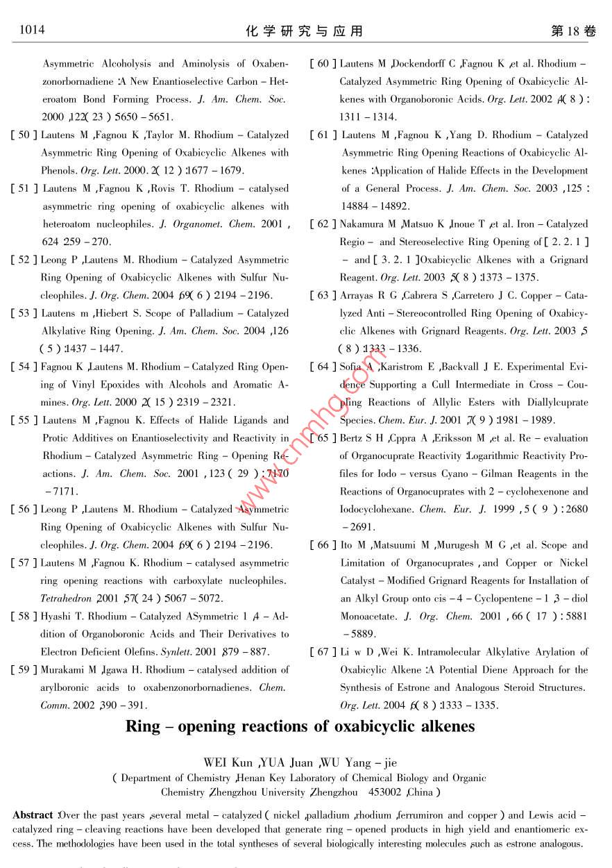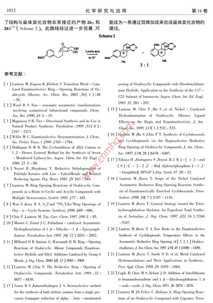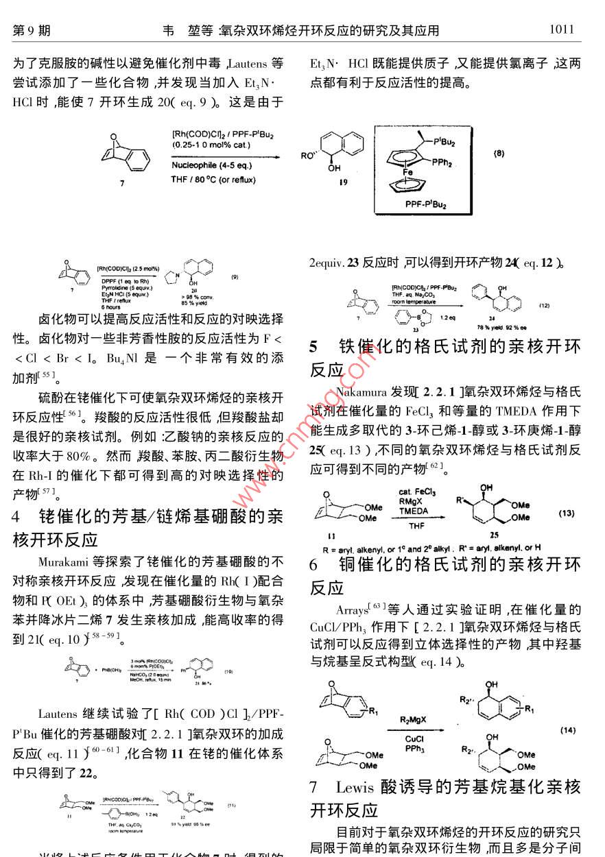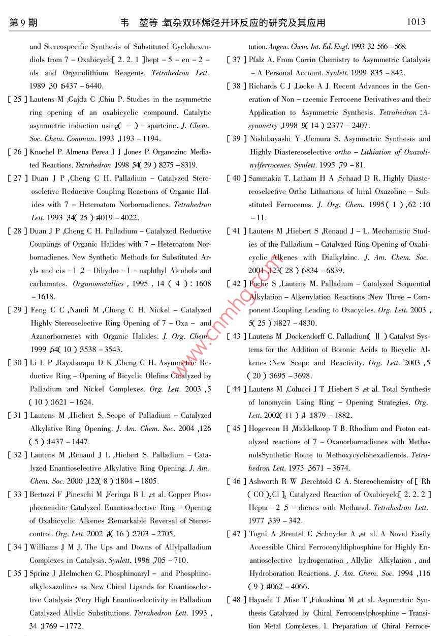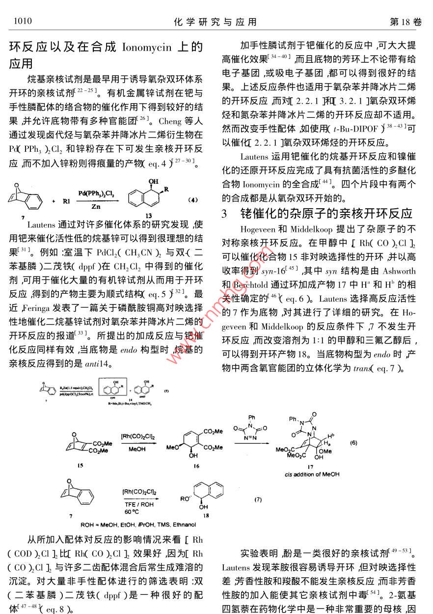 第18卷第9期化學(xué)研究與應(yīng)用Vol. 18 ,No. 92006年9月Chemical Research and ApplicationSep.2006文章編號(hào):1006 - 1656( 2006 )09 - 1009 -06氧雜雙環(huán)烯烴開環(huán)反應(yīng)的研究及其應(yīng)用韋壟,于阿娟吳養(yǎng)潔(鄭州大學(xué)化學(xué)系河南化學(xué)生物與 有機(jī)化學(xué)重點(diǎn)實(shí)驗(yàn)室,河南鄭州450052 )摘要有機(jī)金屬試劑其中包括鎳、鈀、銠、鐵、銅)以及路易斯酸能選擇性地催化氧雜雙環(huán)烯烴的親核開環(huán)反應(yīng)并建立多個(gè)手性中心。這種方法已經(jīng)被用在-些生物活性分子的全合成過程當(dāng)中如甾體酮類似物等。關(guān)鍵詞氧雜雙環(huán)烯烴有機(jī)金屬試劑路易斯酸中圖分類號(hào):0623. 121文獻(xiàn)標(biāo)識(shí)碼:A目前化學(xué)工作者在不斷地探索以尋求能用本文按照不同的催化劑分別進(jìn)行介紹。于環(huán)或非環(huán)化合物的新反應(yīng)希望能借以控制化1鎳催化的氫化物的親核開環(huán)反應(yīng)合物相對(duì)的或絕對(duì)的立體化學(xué)構(gòu)型。其中通過對(duì)以及在合成Sertradine.上的應(yīng)用內(nèi)消旋化合物進(jìn)行去對(duì)稱化作用的方法越來越受早期人們?cè)O(shè)想通過t-Bu2CuCNLi2或t-Bu-到重視。這種方法可以經(jīng)一步反應(yīng),即通過對(duì)[ 4Li/MgBr,產(chǎn)生氫化物,以用于氧雜雙環(huán)烯烴還原+3]或4+2]環(huán)加成產(chǎn)物生成的氧雜雙環(huán)母核開環(huán),但反應(yīng)通常不發(fā)生或沒有選擇性12]。然而進(jìn)行親核開環(huán)反應(yīng),從而有效地建立多個(gè)手性中用DIBAL-H作為氫化物時(shí),可以得到很好的結(jié)心1-4]得到許多重要藥物的中間體( Scheme 1 )。果[13-14( eq.1 )。當(dāng)反應(yīng)體系中加入催化量的鎳時(shí)反應(yīng)得到了明顯的改善( eq.2)15-16]。阿-DIBALHhewane. rehux3.10 mo% NMCOO)DIBALH.THEarolo or當(dāng)Ni( COD )2與手性配體BINAP17]絡(luò)合時(shí),70年代后期,由于合成[ 3.2. 1 ]環(huán)的方法的也可以得到很好的開環(huán)產(chǎn)物"8( eq.3 )。發(fā)展和對(duì)呋喃環(huán)的Diels-Alder 反應(yīng)的不斷探索,MINAP Hisw口制: (3)氧雜雙環(huán)烯烴的開環(huán)反應(yīng)研究得到了長(zhǎng)足的發(fā)展氧雜雙環(huán)模板逐漸被作為起始原料用于合成這個(gè)方法也可以用于氧雜苯并降冰片二烯類環(huán)或非環(huán)化合物5-11。加拿大化學(xué)家Mark Laut-衍生物的開環(huán)反應(yīng) 19 -20]。Mark Lautens 利用這種ens在這方面做了較為詳細(xì)的工作。為了達(dá)到對(duì)對(duì)映選擇性的還原開環(huán)反應(yīng)成功地合成了在臨床氧雜雙環(huán)烯烴的好的開環(huán)效果,使用了-些過渡上非常重要的抗抑郁藥物Sertraline21]。 此化合金屬(其中包括鎳、鈀、銠、鐵、銅等)以及一些強(qiáng)物的合成是以氧雜苯并降冰片二烯的開環(huán)反應(yīng)為的Lewis酸來催化這個(gè)反應(yīng)并取得了很好的反起始反應(yīng)經(jīng)九步反應(yīng)完成總收率為33%。應(yīng)結(jié)果,已被成功地用于-些天然產(chǎn)物的全合成。2 鈀催化的烷 基親核試劑的親核開收稿日期2006 -02 -21 ;修回日期2006 -05 -12基金項(xiàng)目國(guó)家自然科學(xué)基金( 20472074 )資助項(xiàng)目聯(lián)系人簡(jiǎn)介:韋墊( 1975 - )女講師主要研究方向有機(jī)合成化學(xué)、金屬有機(jī)化學(xué)。Email sweikun@ zu. edu. cn第18卷1010化學(xué)研究與應(yīng)用環(huán)反應(yīng)以及在合成lonomycin上的加手性膦試劑于鈀催化的反應(yīng)中可大大提高催化效果34-40]1而且底物的芳環(huán)上不論帶有給應(yīng)用烷基親核試劑是最早用于誘導(dǎo)氧雜雙環(huán)體系電子基團(tuán),或吸電子基團(tuán)都可以得到很好的結(jié)果。,上述反應(yīng)條件也適用于氧雜苯并降冰片二烯開環(huán)的親核試劑2-25。有機(jī)金屬鋅試劑在鈀與的開環(huán)反應(yīng)而對(duì)2.2.1和3.2.1 ]氧雜雙環(huán)烯手性膦配體的絡(luò)合物的催化作用下得到較好的結(jié)烴和氮雜苯并降冰片二烯的開環(huán)反應(yīng)卻不適用。果并允許底物帶有多種官能團(tuán)”1。Cheng 等人然而改變手性配體如使用1-Bu-DIPOF $8-8]可通過發(fā)現(xiàn)鹵代烴與氧雜苯并降冰片二烯衍生物在以催化2.2.1 ]氧雜雙環(huán)烯烴的開環(huán)反應(yīng)。pa( PPh, ),Cl2和鋅粉存在下可發(fā)生親核開環(huán)反Lautens運(yùn)用鈀催化的烷基開環(huán)反應(yīng)和鎳催應(yīng)而不加入鋅粉則得痕量的產(chǎn)物eq.41273?;?的還原開環(huán)反應(yīng)完成了具有抗菌活性的多醚化QH合物lonomycin的全合成41。四個(gè)片段中有兩個(gè)POPh)2CL(4)的合成都是從氧雜雙環(huán)開始的。Zn133銠催化的雜原子的親核開環(huán) 反應(yīng)' Lautens通過對(duì)許多催化體系的研究發(fā)現(xiàn)使Hogeveen和Middelkoop提出了雜原子的不用鈀來催化活性低的烷基鋅可以得到很理想的結(jié)對(duì)稱親核開環(huán)反應(yīng)。在甲醇中[ Rh( CO)2CI l果31。例如:室溫下PdCl,( CH,CN)2與雙(二可以催化化合物 15非對(duì)映選擇性的開環(huán)并以高苯基膦)二茂鐵( dppf )在CH2C2中得到的催化收率得到 syn-1645]其中syn結(jié)構(gòu)是由Ashworth劑可用于催化大量的有機(jī)鋅試劑從而用于開環(huán)和 Berchtold通過環(huán)加成產(chǎn)物17中H°和H°的相反應(yīng)得到的產(chǎn)物主要為順式結(jié)構(gòu)( eq.5y。最關(
