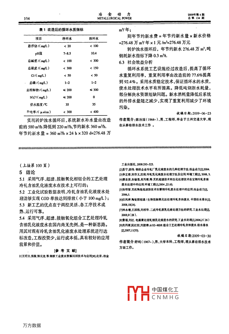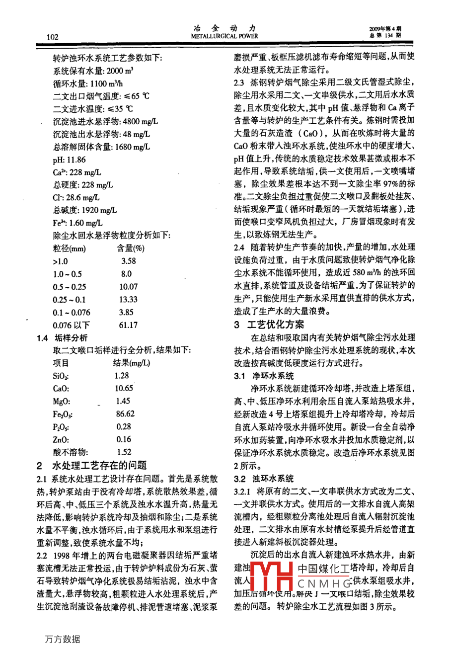200年第4期冶金動力總第134期METALLURGICAL POWER101一煉鋼轉(zhuǎn)爐循環(huán)水系統(tǒng)改造陳治國,孫麗紅(酒泉鋼鐵公司動力廠甘肅嘉峪關(guān)735100)【摘要】敘述了酒鋼一煉鋼廠凈、濁環(huán)水系統(tǒng)存在的問題并對問題原因進行分析針對問題進行了優(yōu)化改造最后對改造效果進行了綜合評價?!娟P(guān)鍵詞】轉(zhuǎn)爐濁環(huán)水循環(huán)使用【中圖分類號】TK235【文獻標識碼】B【文章編號]0606764(200040101-04Reconstruction of Converter Circulation Water System of No. 1 Steel PlantCHEN Zhi-guo, SUN Li-hong(Power Panu, Jiuquan Iron& Sweel(Group)Co. Lad, Jiayuguan, Ganu 735100, China[Abstract]The problems in the clean and turbid circulation water systems of No. 1 Steel Plant ofJiuquan Iron Steel(Group) Co. Ltd were presented. The causes were analyzed and corresponding re.construction measures were adopted. A comprehensive evaluation was made on the reconstruction ef-Key words]converter; turbid circulation water; circulation usage系統(tǒng)概述上,硬度較高。濁環(huán)水系統(tǒng)只要循環(huán),轉(zhuǎn)爐喉口很快酒鋼一煉鋼廠現(xiàn)有的三座50t轉(zhuǎn)爐建于20世結(jié)垢,堵塞,造成抽煙不暢,爐口冒煙,影響煉鋼生紀80年代,至今已運行20多年供水系統(tǒng)包括轉(zhuǎn)爐產(chǎn)為了保證轉(zhuǎn)爐的正常生產(chǎn),只能采用采取生產(chǎn)新高、中、低凈環(huán)水系統(tǒng)和一文、二文除塵水系統(tǒng)循環(huán)水直供直排的方式造成新水較大的浪費。水處理設(shè)施由水泵站、輻射式沉淀池及泥漿泵站泥漿脫水間和相應的給排水管網(wǎng)組成。隨著煉鋼產(chǎn)量的逐年增加原有水處理工藝存在的問題日益突出,②·450「冷卻單600已遠不能適應生產(chǎn)要求,并成為制約煉鋼生產(chǎn)的主耳軸、吹氧管L水套等用要瓶頸。e20「鼓風機房11凈環(huán)水系統(tǒng)凈環(huán)水系統(tǒng)由高壓水系統(tǒng)、中壓水系統(tǒng)和低壓吸水下二文除塵等用戶水箱2水系統(tǒng)組成,主要為轉(zhuǎn)爐氧槍、爐體和除塵風機煤氣柜提供冷卻用水,凈環(huán)回水均自流人原循環(huán)泵站文除塵等用戶吸水井加壓后循環(huán)使用。外排輻射沉淀池12濁環(huán)水系統(tǒng)轉(zhuǎn)爐除塵濁環(huán)水系統(tǒng)主要供給轉(zhuǎn)爐煙氣除塵凈圖1原供水工藝流程圖化系統(tǒng)“一文”、“二文”噴淋水除塵系統(tǒng)為濕法除13濁環(huán)水水質(zhì)塵,原設(shè)計除塵用水采用二文、一文串級供水方式,由于轉(zhuǎn)爐煉鋼是個非連續(xù)生產(chǎn)過程,使得爐氣洗滌后除塵水中夾雜有大量懸浮物和各種鹽類,一量溫度、煙氣成分都在不斷變化著,因此除塵水的文排水經(jīng)高架流槽流入分配井后再自流入φ20m物理化學成分和性質(zhì),也在不斷變化中除塵水含有輻射式沉淀池,經(jīng)加藥沉淀處理的出水流入二文吸大量氣件紅廿一其含量在廢水中水井后通過供水泵組供轉(zhuǎn)爐“一文”、“二文除塵是隨昆入大量的石灰粉用水。這套系統(tǒng)自投用以來,由于水處理設(shè)施不完塵CNMHGH>10,廢水中的善水質(zhì)無法達到使用要求懸浮物在200mg以懸浮物高達150050mg,水質(zhì)波動范圍大。水冶金動力102ETALLURGICAL POWER總第134轉(zhuǎn)爐濁環(huán)水系統(tǒng)工藝參數(shù)如下磨損嚴重、板框壓濾機濾布壽命縮短等問題,從而使系統(tǒng)保有水量:2000m3水處理系統(tǒng)無法正常運行循環(huán)水量:1100m/h23煉鋼轉(zhuǎn)爐煙氣除塵采用二級文氏管濕式除塵,二文出口煙氣溫度:≤65℃除塵用水采用二文、一文串級供水,二文用后水水質(zhì)二文進水溫度:≤35℃差,且水質(zhì)變化較大,其中pH值、懸浮物和Ca離子沉淀池進水懸浮物4800mg/L含量等與轉(zhuǎn)爐的生產(chǎn)工藝條件有關(guān)。煉鋼時需投加沉淀池出水懸浮物:48mg/L大量的石灰造渣(Ca0),從而在吹煉時將大量的總?cè)芙夤腆w含量:1680mgLCaO粉末帶入濁環(huán)水系統(tǒng),使?jié)岘h(huán)水中的硬度增大pH:186pH值上升,傳統(tǒng)的水質(zhì)穩(wěn)定技術(shù)效果甚微或根本不Ca* 228 mg/L起作用,導致系統(tǒng)結(jié)垢,供一文使用后,一文噴嘴堵總硬度:228mg塞,除塵效果差根本達不到一文除塵率97%的標Cl-: 28.6 mg/L準。二文除塵負擔過重促使二文喉口及翻板處掛灰、總堿度:1920mg結(jié)垢現(xiàn)象嚴重(循環(huán)時最短的一天就結(jié)垢堵塞),進Fe*:1.60 mg/L而使喉口變窄風機負擔過大,廠房冒煙現(xiàn)象時有發(fā)除塵水回水懸浮物粒度分析如下生,以致煉鋼無法生產(chǎn)。粒徑(mm)含量(%)24隨著轉(zhuǎn)爐生產(chǎn)節(jié)奏的加快,產(chǎn)量的增加,水處理設(shè)施負荷過重,由于水質(zhì)問題致使轉(zhuǎn)爐煙氣凈化除1.0~0.5塵水系統(tǒng)不能循環(huán)使用,造成近580mh的濁環(huán)回0.5~0.251007水直排,系統(tǒng)管道及設(shè)備結(jié)垢嚴重為了保證轉(zhuǎn)爐的0.25~0.113.33生產(chǎn),只能使用生產(chǎn)新水采用直供直排的供水方式01~00763.85造成了生產(chǎn)水的大量浪費。0.076以下3工藝優(yōu)化方案14垢樣分析在總結(jié)和吸取國內(nèi)有關(guān)轉(zhuǎn)爐煙氣除塵污水處理取二文喉口垢樣進行全分析,結(jié)果如下:技術(shù),結(jié)合酒鋼轉(zhuǎn)爐除塵污水處理系統(tǒng)的現(xiàn)狀,本次項目結(jié)果mgL)改造按高堿度低硬度運行方式進行。31凈環(huán)水系統(tǒng)1065凈環(huán)水系統(tǒng)新建循環(huán)冷卻塔,并改造上塔泵