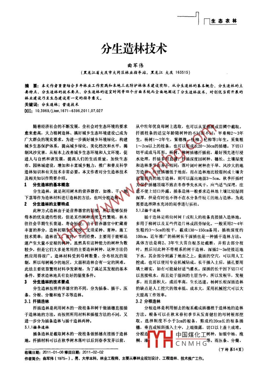 幾生態(tài)農(nóng)林分生造林技術(shù)曲軍偉(黑龍江省大慶市大同區(qū)林業(yè)指導(dǎo)站,黑龍江大慶163515)摘要:本文作者緊密結(jié)合多年林業(yè)工作實踐和本地三北防護林體系建設(shè)實際,從分生造林的基本概念、分生造林的主要特點、分生造林的技術(shù)要點、分生造林的適宜時間等四個方面系統(tǒng)而全面地闡述了分生造林技術(shù),對創(chuàng)優(yōu)當(dāng)前開展的林業(yè)建設(shè)乃至生態(tài)建設(shè)有一定的指導(dǎo)意義。.關(guān)鍵詞:分生造林;營造技術(shù)DOI: 10.3969/.isn.1671-6396.2011.07.027隨著經(jīng)濟社會的不斷發(fā)展,全社會對生態(tài)環(huán)境的要求從中壯年優(yōu)良母樹上選取,也可以從采穗國或苗圃中截取。愈來愈高,大力植樹造林、搞好城鄉(xiāng)生態(tài)環(huán)境建設(shè)已成為扦插枝條的適宜年齡隨樹種的不同而不同:阜垂柳2-~3年廣大群眾的現(xiàn)實要求。為進-步搞好城鄉(xiāng)環(huán)境綠化,構(gòu)建生, 楊樹1~2年生,紫穗槐、怪柳、杞柳等1年生。采集粗城鄉(xiāng)生態(tài)保護體系,提高城鄉(xiāng)綠化、美化檔次和水平,揭1~2cm以上的枝條,也可以剪成長20~ 30cm的插穗。下切口制風(fēng)沙災(zāi)害,從根本上改善城鄉(xiāng)生態(tài)環(huán)境和人文環(huán)境,促切平或成馬耳形。楊樹、柳樹插穗扦插前,最好預(yù)先進行浸進人與自然和請發(fā)展,提高人們的生活質(zhì)量,加快生態(tài)水處理,扦插多用直播。扦插深度因樹種、穗長、土壤濕度市、園林城建設(shè),增加和豐富城鄉(xiāng)魅力,推廣和普及科學(xué)和造林季節(jié)而各不相同:落葉闊葉樹種在干旱、風(fēng)沙大的地造林知識和有關(guān)技術(shù)非常必要。本文作者對分生造林技術(shù)方造林,應(yīng)使插穗低于地面,而在造林地比較濕潤或土壤含及相關(guān)知識作簡要介紹。鹽量較高的地方造林,則可以露出地面3~5cm。秋季扦插時1分生造林的基本概念為保護插穗頂端不致在冬春季失水風(fēng)千,應(yīng)當(dāng)適當(dāng)深埋,注分生造林,就是利用樹木的營養(yǎng)器官,如株、干、地意不使上切口外露。插條造林一般要求造林地+壤比較濕潤下莖等作為造林材料進行造林的方法,也叫分植造林。濼厚,但是有時也不得不在水分條件較差的地方造林,為此2分生造林的主 特點需要選擇降水充沛的雨季進行插植。此種方式造林由于是營養(yǎng)器官的延續(xù),所以能夠保持3.1.2插干造林母本的優(yōu)良遺傳性狀,但是某些樹種連續(xù)無性繁殖,林木插干造林是將幼樹樹F或粗人的枝條真接插入造林地。往往會早期生長衰退、壽命短促;由于營養(yǎng)器官中貯藏著多用于柳樹以及某些營造片林或四旁綠化。一般采用2~4年.豐富的養(yǎng)分,造林初期生長較快:無須采種、育種,施工生粗約3~ 5cm的枝干,截成130~ 150cm備用。插植深度約技術(shù)簡單:造林省工、省時,節(jié)約經(jīng)費。主要用于能夠迅100cm.近年推廣的楊樹長干深插也是一種插干造林方法。速產(chǎn)生大量不定根的樹種。雖然具有這種能力的樹種為數(shù)具體方法是將2、3年生大苗自根莖處截斷,并剪去部分枝較少,但是它們大多是常用的主要造林樹種,這種方法仍葉,然后用此種不帶根系的樹干造林,深插2~3m使接近地然應(yīng)用得很廣.造林材料受到母樹數(shù)量、分布狀況的限下水,其余部分則露于地面之上。栽插的空穴,可以用人工制,所以母樹稀少的地區(qū),大面積造林會有一定 的閑難。挖成,也可以使用專業(yè)機械鉆成。長干插入土后,插孔要用此法主要依靠繁殖材料孕發(fā)新根,為了滿足其發(fā)根的基本填土砸實,如有叮能最好適當(dāng)灌水。深插的長干因下切口可條件,要求造林地具有良好的濕度條件。以直接吸水,而且處于濕潤的七層當(dāng)中,所以發(fā)根早,發(fā)根3分生造林的技術(shù)要點多,而且面積大,成活率高,生長迅速。楊樹長根深插造林分生造林按照營養(yǎng)器官的不同,分為插條、插干、壓的缺點是人工挖穴的效率低、成本大,采用機械挖穴叮以大條、分根、分蘗和地下答等造林。大提高T.作效率。3.1扦插造林3.2分根造林扦插造林是利用樹木的- -段枝條和樹干做插穗直接插分根造林是利用刨去的根系截成捅聰植于造林地的造林于造林地的方法。而按照所用材料和插植方法的不同,又方法。根條可以在秋末春初季節(jié)從發(fā)育健壯的世樹根部挖進一步分為插條造林與插十造林兩種。取。選擇粗度不小于2cm的根條,剪成約20cm長的根條插3.1.1插條造林穗,垂直或傾斜插入土中,上端微露,切口以上.蓋+成堆。插條造林是截取樹木的一-段枝 條做插穗直接插于造林分根造中國煤化工樹種,如銀中楊、泡地。扦插材料叮以在秋季樹木落葉以后到春季發(fā)芽以前,桐、MYHCNMHG而壓條、分蘗、(下轉(zhuǎn)第54頁) .收稿日期: 2011-01-08 修回8期: 2011-02-02作者簡介:曲軍偉(1975-),男,大學(xué)本科,林業(yè)工程師,主要從事林業(yè)規(guī)劃設(shè)計、工程造林、技術(shù)推廣工作。55中國西部科技2011年03月 (上旬)第10卷第07期總第240期綜上所述,結(jié)合建設(shè)該保護區(qū)的目的和任務(wù),建議使建議規(guī)劃的總體目標(biāo)是在規(guī)劃期內(nèi),對保護區(qū)的保護用名稱二,即:四川安寧河源濕地自然保護區(qū)作為本保護管理、科研監(jiān)測、宣傳