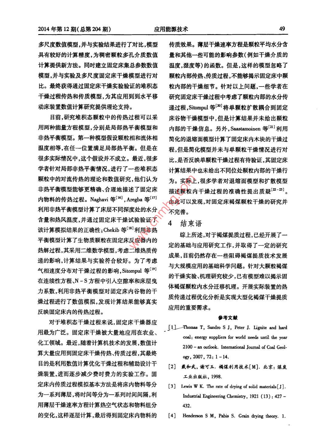 46應(yīng)用能源技術(shù)2014年第12期(總第204期)doi:10.3969/.isn.1009-3230.2014.12.011褐煤千燥及熱解機(jī)理研究現(xiàn)狀張凱(中國電能成套設(shè)備有限公司,北京100080摘要:單個大顆粒褐煤干燥、熱解機(jī)理的研究對于褐煤提質(zhì)技術(shù)的開發(fā)具有重要的理論與實際意義,可用于該過程的數(shù)值計算與優(yōu)化研究。對于單個大顆粒褐煤而言在干燥、熱結(jié)過程中內(nèi)部存在較大的溫度、水含量及揮發(fā)分含量的梯度,所涉及到的科學(xué)問題為多孔介質(zhì)傳熱與傳質(zhì)問題。文中主要針對褐煤的干燥機(jī)理、熱解機(jī)理及堆積態(tài)干燥過程機(jī)理進(jìn)行了詳細(xì)的文獻(xiàn)調(diào)研。關(guān)鍵詞:褐煤;千燥機(jī)理;熱解機(jī)理中圖分類號:TD849.2文獻(xiàn)標(biāo)志碼B文章編號:1009-3230(2014)12-0046-05Study State Review of Lignite Drying and Pyrolysis MechanismZHANG KaiChina Power Complete Equipment Co, Ltd, Beijing 100080, ChinaAbstract The mechanism of drying and pyrolysis of single coarse lignite particles has importanttheoretical and practical significance for the development of the lignite upgrading technologies, and itcan be used for simulation and optimization study. For single larger lignite particles, there isgnificant difference of particle temperature, water content and volatile content and the scientificquestion is about the heat and mass transfer of the porous medium. In the study the study statereview is completed for the mechanism of lignite drying and pyrolysisKey words: Lignite; Drying mechanism; Pyrolysis mechanism引言澳大利亞、中國、俄羅斯等國家擁有豐富的褐煤資褐煤是泥炭經(jīng)過長期地質(zhì)成巖作用的產(chǎn)物,源。褐煤主要用于燃燒熱解、煉焦氣化提取褐即植物殘骸在物理、生物、化學(xué)作用下變成的固體煤蠟及褐煤微生物的轉(zhuǎn)化與利用,在我國動力與碳?xì)淙剂虾置菏敲禾抠Y源中煤化程度較小的煤,化工用煤中起到重要的作用,見表1。屬于軟質(zhì)煤。與其它煤種相比,褐煤含氧量高,灰我國褐煤的特性是高揮發(fā)份(50%左右)高份大密度小,易于自燃煤粉容易爆炸。表1給水分(30%左右)、高灰份(30%左右)低熱值(14出了截止207年1月世界煤炭可采儲量。由該M/kg左右)、低灰熔點2。主要分布在東北西表可知全球褐煤可采儲量約146億,占煤炭北西南和華北等地集中在內(nèi)蒙古、云南和新疆可采儲量的17.7%。我國褐煤可采儲量約186等省份。由于地區(qū)經(jīng)濟(jì)發(fā)展相對東部沿海地區(qū)較億噸占全國煤炭可采儲量的162%田。美國、落后的原因這些地區(qū)的用煤量相對較少因此需要將褐煤運輸?shù)骄嚯x比較遠(yuǎn)的利用場地。但由于收稿日期:2014-10-10修訂日期:2014-11-09作者簡介:張凱(1982-),男,主要從事煤化工及火電設(shè)褐煤易氧化自燃以及高水分含量,不適于遠(yuǎn)途運備招標(biāo)工作輸利用,而且會造成了鐵路系統(tǒng)的運力浪費。2014年第12期(總第204期)應(yīng)用能源技術(shù)衰世界各國煤可采儲量億噸無煙煤估計可地區(qū)/國家次煙煤褐煤總計2006年產(chǎn)量和煙煤開采年全球2658.960.4761.69美國1089.53991.552383.1710.89219俄羅斯1570.34中國622.33336.57185.971144.87澳大利亞和新西蘭377.39213印度565.18加拿大34.479.070.91單個大顆粒褐煤干燥、熱解機(jī)理的研究對于態(tài)干燥過程機(jī)理。褐煤提質(zhì)技術(shù)的開發(fā)具有重要的理論與實際意1千燥過程傳熱傳質(zhì)機(jī)理研究義,可用于該過程的數(shù)值計算與優(yōu)化研究。對于現(xiàn)狀單個大顆粒褐煤而言,在干燥、熱結(jié)過程中內(nèi)部存到目前為止,由于多孔介質(zhì)內(nèi)部結(jié)構(gòu)的復(fù)雜在較大的溫度、水含量及揮發(fā)分含量的梯度,所涉性和隨機(jī)性,還沒有一種理論模型能夠全面的描及到的科學(xué)問題為多孔介質(zhì)傳熱與傳質(zhì)問題。文述干燥過程中多孔介質(zhì)內(nèi)部的熱濕傳遞機(jī)理?,F(xiàn)中的研究對象為褐煤的干燥、熱解過程,因此,文有的干燥模型主要有以下三類。獻(xiàn)調(diào)研主要針對褐煤的干燥機(jī)理、熱解機(jī)理,堆積表2已提出的薄層干燥經(jīng)驗?zāi)P湍P兔Q研究者單指數(shù)模型(1)LewisMR=p(-k·)Henderson and PabisMR=a·ep(一k·)MR=a·e(-k·t)+cTogrul and Pehlivan[s]雙指數(shù)模型P(-k·)+B·e(-k1·)Page模型和修正Page模型MR=∞p(-k·)Modified PageMR=a·exqp(-k·rWang and Singh(7)OverhultsMR=四p[-(k·)]0 erhults et al.可純經(jīng)驗?zāi)P蚆R=a-b·ex(-k·p)MR=1+a·t+Bompsont=a·MR+b·(lnMR)2Thompson et al(1)經(jīng)驗?zāi)P?當(dāng)物質(zhì)的外部干燥條件恒定理論模型主要有液態(tài)擴(kuò)散模型、毛細(xì)流動模型蒸時,可以使用引人時間項的經(jīng)驗?zāi)P?。已提出的發(fā)-冷凝模型、ikow非平衡熱力學(xué)理論模型、部分薄層干燥經(jīng)驗?zāi)P鸵姳?。經(jīng)驗?zāi)P偷娜秉cPhip與DeⅤies模型、蒸發(fā)前沿模型、 Whitaker是由于模型中有時間項當(dāng)干燥條件發(fā)生改變時,體積平均模型理論和孔道網(wǎng)絡(luò)干燥模型等。系統(tǒng)該模型不再適合,模型使用范圍受限。完善的干燥理論不但要能解釋物料干燥過程中出(2)熱質(zhì)耦合理論模型:已提出的熱質(zhì)耦合現(xiàn)的熱濕現(xiàn)象而且還應(yīng)該給出相應(yīng)的干燥模型,應(yīng)用能源技術(shù)2014年第12期(總第204期)進(jìn)而去預(yù)測在一定條件下物料的干燥特性,并能響。由于其自身