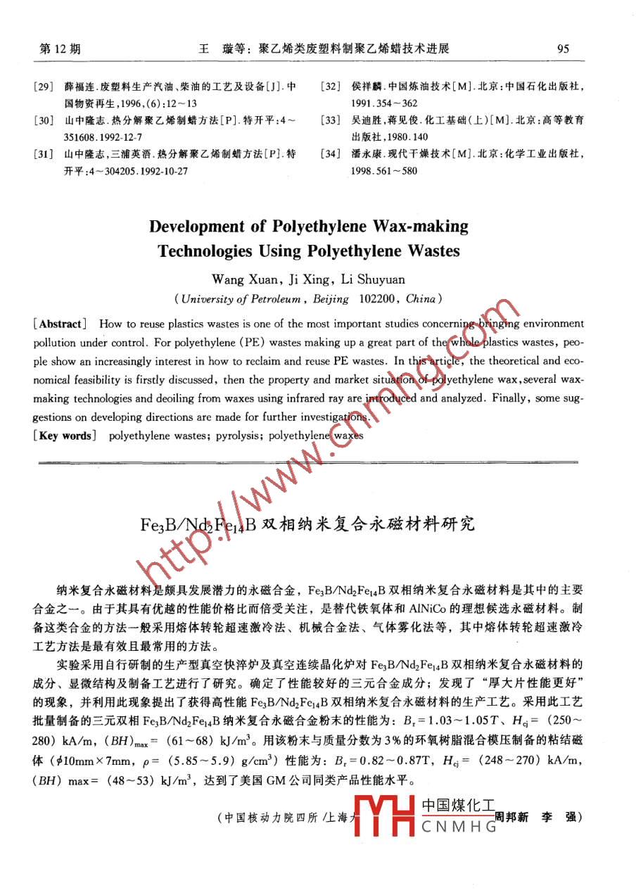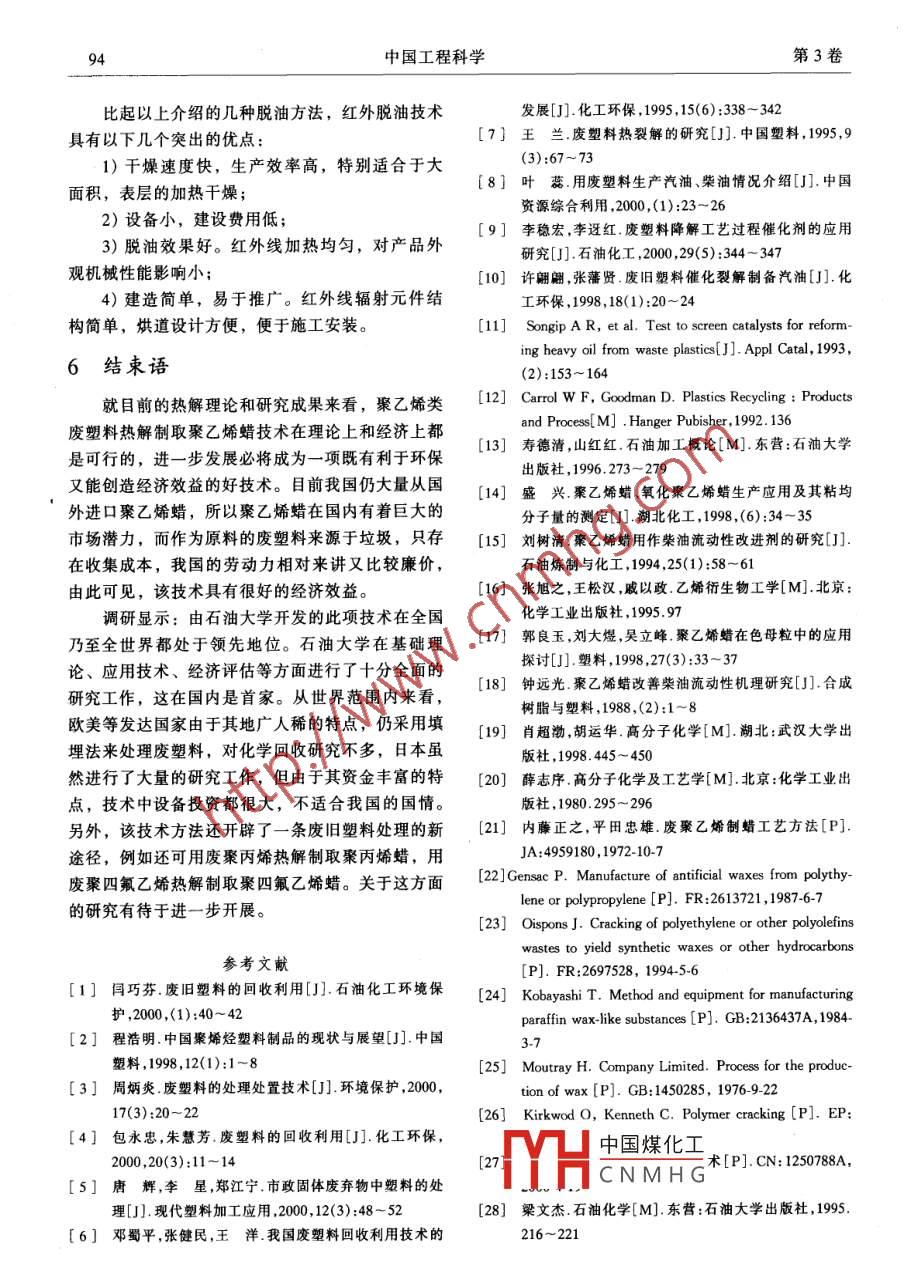 2001年12月中國工程科學(xué)Dec.2001第3卷第12期Engineering Science _Vol.3 No.12綜合述評聚乙烯類廢塑料制聚乙烯蠟技術(shù)進展王璇,冀星,李術(shù)元(石油大學(xué)化工學(xué)院,北京102200)[摘要]廢舊塑料的回收利用是近年來治理環(huán)境污染的一個重要課題。廢聚乙烯(PE) 在塑料垃圾中占有很大的比例,如何對其進行合理的回收、利用已成為人們十分關(guān)心的問題。從理論和經(jīng)濟兩方面分析了廢聚乙烯裂解制取聚乙烯蠟技術(shù)的可行性,介紹了棗乙烯蠟的性能及市場情況,分析比較了幾種有代表性的制蠟工藝,綜合評價了這些工藝技術(shù)的應(yīng)用范圍和優(yōu)缺點。還簡要介紹了紅外脫油技術(shù),并對該技術(shù)的研究和應(yīng)用方向提出了一些建議。[關(guān)鍵詞]聚乙烯類廢塑料;熱解;聚乙烯蠟化學(xué)回收是將高分子化合物經(jīng)熱解或催化裂引言解,制成小分子的化合物[1,主要有產(chǎn)氣技術(shù)[7],近年來,塑料的產(chǎn)量和用量逐漸增加,目前全產(chǎn)油技術(shù)和產(chǎn)蠟技術(shù),均有專利報導(dǎo)。對廢塑料的世界總產(chǎn)量已超過1X108t。我國的塑料工業(yè)在80油化研究開展較早,目前已經(jīng)基本成熟,并在某些年代后開始飛速發(fā)展,年產(chǎn)量以近20%的速度增國家實現(xiàn)了工業(yè)化。該技術(shù)可用于處理混合熱塑性長[1]。到1995年我國塑料生產(chǎn)量已達994X 10* t,廢塑料,具有較好的經(jīng)濟效益。廢塑料油化的工藝成為世界塑料制品生產(chǎn)大國(2]。2000年塑料產(chǎn)量主要有:熱解工藝、催化裂解工藝以及兩者結(jié)合的估計達到10 Mt,而且每年還會進口不少塑料原兩段法。熱解法是直接對廢塑料進行加熱使其分解料、半制成品和制成品(3]。各種塑料產(chǎn)品的應(yīng)用的方法[8],它具有工藝簡單、設(shè)備裝置成本低的給人類的生產(chǎn)和生活帶來了極大的方便,但也因此優(yōu)點,但是得到的汽、柴油質(zhì)量不佳,僅適用于對導(dǎo)致了人類生存環(huán)境的惡化。產(chǎn)品要求不高的回收廠使用。催化裂解法是將廢塑廢塑料的回收利用方法主要有:填埋法、焚燒料與催化劑按照一定比例混合,然后送人反應(yīng)器中法、再生利用法和化學(xué)回收法。填埋法因其簡單易進行裂解的方法[9]; 兩段法是指先將廢塑料置于行,幾乎不需要成本,在很多國家得到采用,但資熱解反應(yīng)器中進行熱解,然后對裂解氣進行催化改源利用率極低[5],同時也會造成環(huán)境污染。焚燒質(zhì)[10,11]。相比較而言,前者的工藝比較簡單,但法是將廢塑料燃燒轉(zhuǎn)化為熱能的處理方法。該方法催化劑無法再生,操作成本很大,所以目前的油化可以用來處理混合廢塑料,但燃燒產(chǎn)生的氣體中含工藝基本.上采取的是兩段法。典型的工藝有日本的有致癌的二鮊英及其它有害氣體,給人類健康造成富士回收法,德國的BASF回收法等。在我國,廢危害[4.5]。再生利用法中最典型的方法是熔融再生塑料制取汽、柴油技術(shù)已經(jīng)引起了環(huán)保部門和產(chǎn)業(yè)法,再生塑料產(chǎn)品的質(zhì)量- -般比較差,而且需要對界的重視,并成為經(jīng)濟界關(guān)注的熱點。石油大學(xué)系原料進行細致的分離、篩選和清洗工作,從而增加統(tǒng)地工民了本朔判制所當(dāng)些油的理論與應(yīng)用研了工藝的復(fù)雜性[6]。究中國煤化工置的中試工作。THCNMHG[收稿日期] 2001 -04-19;修回日期2001 -07 - 10[作者簡介]王璇(1978-),女,山西運城市人,石油大學(xué)碩士研究生第12期王璇等: 聚乙烯類廢塑料制聚乙烯蠟技術(shù)進展:91廢塑料油化技術(shù)的關(guān)鍵在于生產(chǎn)出合格的汽、且潤滑性、分散性、流動性好,可以與涂料、油柴油。但因聚乙烯支鏈化程度較低,制得的汽油辛漆、油墨等配合使用,能產(chǎn)生消光、分散光和光滑烷值只能達到88,制得的柴油含蠟量較高,凝點的效果,與其他種類的蠟及其聚烯烴樹脂有良好的較低。調(diào)查顯示,廢塑料中各種品種的用量比例約相溶性。為LDPE (低密聚乙烯) :HDPE (高密聚乙烯) :1聚乙烯蠟的性能PP (聚丙烯) :PS (聚苯乙烯) :PVC (聚氯乙烯)Table 1 Property of polyethlene waxes:其它= 27:21:18:16:7:1112],其中聚乙烯的用量聚乙烯蠟軟化點/心相對分子質(zhì)量熔點心幾乎占到了一半。廢聚乙烯量大,但不適合于生產(chǎn)1號104~ 1051 350~2 000>93汽、柴油。研究表明,在一定操作條件下,由廢聚2106 ~ 1081 600~ 2200>95乙烯熱解可生產(chǎn)聚乙烯蠟。3號109~ 1121 900~2 700>971聚乙烯蠟的性能、應(yīng)用與市場供求聚乙烯蠟的用途十分廣泛,可用于油墨制造擦情況.亮蠟、高檔地板漆、高檔轎車上光蠟、橡膠脫模防聚乙烯蠟又稱為低相對分子質(zhì)量聚乙烯[13)。老化劑、紡織加工用柔軟劑、潤滑劑、聚氯乙烯制根據(jù)制造方法的不同,分為聚合型聚乙烯蠟和裂解品光亮潤滑劑、脫模劑、熱熔膠粘劑、用于提高紙型聚乙烯蠟兩種。前者是聚乙烯聚合時的副產(chǎn)物,張涂料光澤度和持久度、用于電纜填充劑、電纜色后者由聚乙烯樹脂加熱裂解而成[14]。聚合型聚乙母料添加劑、紙板涂料、玻璃瓶涂料、熱融粘合烯蠟的產(chǎn)量在1994年就達1 kt左右(15],近年來隨劑、特種工藝蠟燭等[13]。質(zhì)量好的聚乙烯微粉蠟著聚乙烯產(chǎn)量的增加其產(chǎn)量也隨之增長。目前市場還可用于化妝品和個人