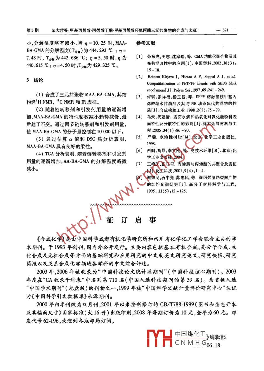 2008年第16卷合成化學(xué)vol.16,2008第3期,318-321Chinese Journal of Synthetic ChemistryNo.3,318~·研究簡報·甲基丙烯酸-丙烯酸丁酯-甲基丙烯酸環(huán)氧丙酯三元共聚物的合成與表征柴大付,董前年,章于川(安徽大學(xué)化學(xué)化工學(xué)院安徽省綠色高分子材料重點實驗室,安徽合肥230039)摘要:以甲基丙烯酸(MAA),丙烯酸丁酯(BA)和甲基丙烯酸環(huán)氧丙酯(GMA)為原料,偶氮二異丁腈(ABN)為引發(fā)劑,十二硫醇(DT)為鏈轉(zhuǎn)移劑,通過溶液聚合法合成了甲基丙烯酸-丙烯酸丁酯-甲基丙烯酸環(huán)氧丙酯( MAA-BA-GMA)三元共聚物其結(jié)構(gòu)和性能經(jīng)HNMR,CNMR,IR,GPC,DSC和TGA表征。通過調(diào)節(jié)AIBN和DT的用量可控制 MAA-BA-GMA的分子量在7900~23700。熱分析數(shù)據(jù)結(jié)果表明, MAA-BA-GMA具有良好的柔性;分解溫度為429℃~440℃。關(guān)鍵詞:自由基溶液聚合;三元共聚物;甲基丙烯酸環(huán)氧丙酯;大分子表面改性劑中圖分類號:063文獻標(biāo)識碼:A文章編號:1005-1511(2008)03031804Synthesis and Characterization ofMethacrylic Acid-Butyl Acrvlate- Glycidyl MethacrylateCHAI Da-fu, DONG Qian-nian, ZHANG Yu-chuan( School of Chemistry and Chemical EngineeringAnhui Key Laboratory of Green Polymer Materials, Anhui University, Hefei 230039, China)Abstract: Tercopolymer macromolecular modifier, methacrylic acid-butyl acrylate-glycidyl Methacrylate ( MAA-BA-GMA), was synthesized by radical polymerization from methacrylic acid( MAA)/butylacrylat( BA)/glycidyl methacrylate( GMA)using azobisisobutyronitrile( AIBN)as the initiator,1-do-decanethiol( DT) as the chain transfer agent. The structure and the properties of MAA-BA-GMA werecharacterized by H NMR, C NMR, IR, GPC, DSC and TGA. The molecular weight of MAA-BAGMa was controlled at the range of 7900-23 700 by adjusting amount of AIBN and DT. The resultsof DSC and TGA showed that MAA-BA-GMA exhibited well plasticity and the descomposition temperatures were429℃~440℃Keywords: radical polymerization; tercopolymer; macromolecular modifier甲基丙烯酸環(huán)氧丙酯(GMA)又稱甲基丙烯衍生物,分子結(jié)構(gòu)中的不飽和雙鍵容易發(fā)生共聚酸縮水甘油酯,是一種含有多官能團的丙烯酸酯反應(yīng)活性強的環(huán)氧基團很容易與羥基胺基等官收稿日期:2007基金項目:國家科技攻關(guān)資助項目(2005BA316C);安徽省科技攻V凵中國煤化工作者簡介:柴大付(1981-),男漢族,安徽亳州人主要從事高CNMHO5515108643,Emcom通訊聯(lián)系人:章于川教授碩士生導(dǎo)師,Emil:yuchuanzhangl46@126.com第3期柴大付等甲基丙烯酸丙烯酸丁酯甲基丙烯酸環(huán)氧丙酯三元共聚物的合成與表征319CHxH2C-C yH2C-CH zH2C=C--CO2CH2C-CH2COHMAAGMAcO2CH2C、CH2長CH2CCH2CHCH2CCO2H CO, Bu CHMAA-BA-GMA能團發(fā)生開環(huán)加成反應(yīng),有利于提高高分子合金1實驗部分的相容性。 Heino(2比較了SEBS(苯乙烯乙烯丁二烯苯乙烯), SEBS-g-MA和 SEBS-g-GMA1,1儀器與試劑對PET/P(聚對苯二甲酸乙二醇酯/聚丙烯)共Bruker cav400型變換核磁共振譜儀(氘代混物的增容作用。結(jié)果表明, SEBS-g-GMA比丙酮為溶劑TYMS為內(nèi)標(biāo)); Nicolet Neuxs9830型SEBS-g-MA對PETP有更好的增容性。許琪傅立葉變換紅外光諧儀(K壓片);wac1等通過對EPDM(三元乙丙膠)熔融接枝CMA型凝膠滲透色譜儀(GPC); Perkin Elmer Pyris-I及其與NR(天然膠)動態(tài)硫化共混物的性能研型熱分析儀;烏氏黏度計。究發(fā)現(xiàn)其拉伸強度和斷裂伸長率有較大幅度的MAA,上海五聯(lián)化工廠;BA,天津市博迪化工提高,這是由于EPDM接枝GMA改善了EPDM有限公司;CMA,上海富蔗化工有限公司;乙酸乙NR的硫化相容性。酯,上海東懿化學(xué)試劑公司;AIBN,湖北成宇制藥本文以甲基丙烯酸(MA),丙烯酸丁酯有限公司;Dr,廣州市珍林貿(mào)易有限公司。以上(BA)和GMA為原料偶氮二異丁腈(ABN)為引試劑均為化學(xué)純發(fā)劑十二硫醇(DT)為鏈轉(zhuǎn)移劑通過溶液聚合12 MAA-BA-GMA的合成法合成了甲基丙烯酸-丙烯酸丁酯-甲基丙烯酸在燒杯中配制反應(yīng)液:MAA2g,按環(huán)氧丙酯(MA-BA-CMA)三元共聚物( Scheme(MAA):m(BA):m(GMA)=1:6:2加入BA1),其結(jié)構(gòu)和性能經(jīng)HNMR,BCMR,皿,和GMA,一定量的ABN和DT[m(AIBN):mGPC,DSC和TGA表征。(DT)=1:1]?;旌暇鶆蚝笕?/3(體積)倒入四合成的 MAA-BA-GMA為大分子表面改性口燒瓶中加入乙酸乙酯100m,攪拌使其完全劑,是針對極性較強的橡膠改性而設(shè)計的能顯著溶解N2保護下于50℃反應(yīng)1h后升至75℃反提高橡膠和陶瓷粉體的增容性。 MAA-BA-GMA應(yīng)2h。自然冷卻至室溫,過濾,濾餅真空干燥后分子鏈側(cè)基上的羧基或環(huán)氧基均可以與納米陶瓷用乙酸乙酯溶解,再真空干燥,重復(fù)2次-3次得粉體表面的OH,NH,NH以等發(fā)生化學(xué)鍵合,淡黃色固體 MAA-BA-GMA;HMMR:,97(s,而其分子鏈上帶酯側(cè)基的鏈段和聚丙烯酸酯氯1H,co2H),4.07(m,2H,CO2CH1),3.70(m,丁橡膠等的結(jié)構(gòu)或極性相似,二者可形成良好的2H,與環(huán)氧基相連的CH2),2.95(m,IH,與環(huán)相互作用,從而在納米陶瓷粉體和橡膠基體之間氧基相連的CH),2.04[m,1H,cH(Co)in架橋、偶聯(lián),有效地改善了無機陶瓷納米粉體在上BA],1.56(m,2H,主鏈CH2),1.41(d,2H,述橡膠中的相容性和分散性,是一種新型的大分凵中國煤化工c,cCH)子改性劑。MA- BA-GMA對丙烯酸酯膠耐摩實·,CCNMHGCH2),0-60驗的結(jié)果表明 MAA-BA-GMA改性納米TN在(cH,cH2);Rv:344,2960,2873,173,ACM中的分散性較好。合成化學(xué)Vol.16,20081457,1383,1254,1165,944cm-1。800a(2)],求得K=0.0022,a=0.765。由于a較小,可知 MAA-BA-CMA為線性柔性
