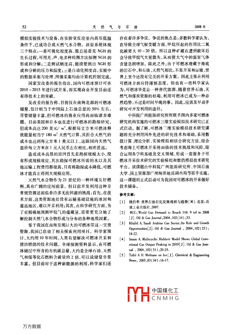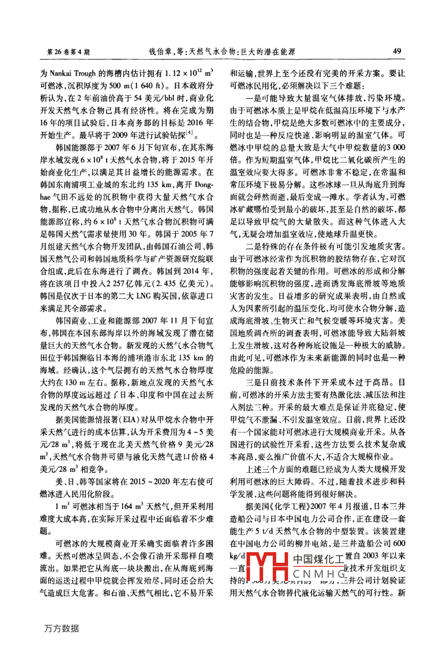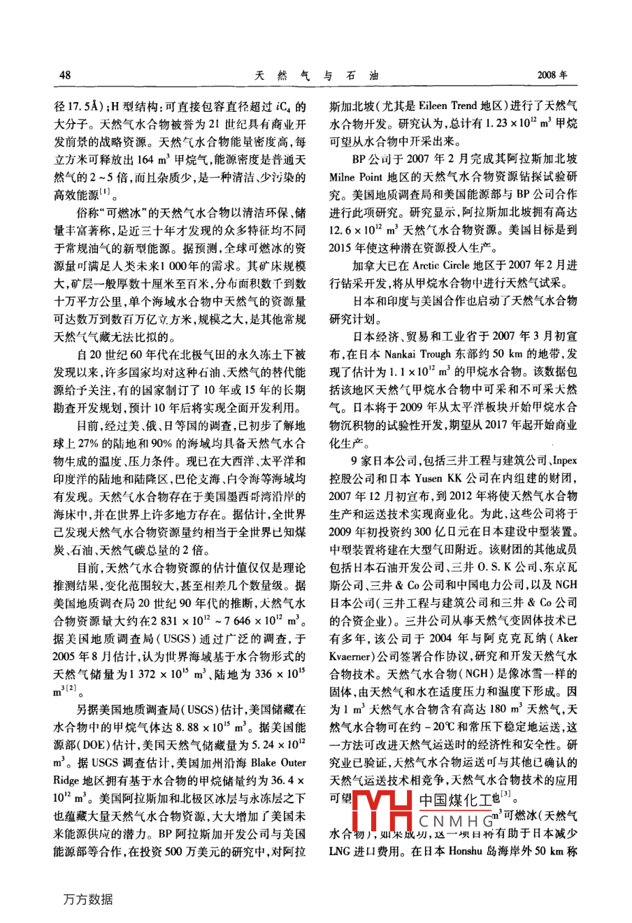 第26卷第4期天然與石油2008年8月Natural Gas And OilAug.2008天然氣水合物:巨大的潛在能源錢伯章,朱建芳(上海擎督信息科技公司金秋科技傳播公司,上海200127)摘要:天然氣水合物(又稱可燃冰)分布的范圍約4000×103km2,占海洋總面積的10%海底可燃冰的儲量夠人類使用1000年。可燃冰發(fā)現(xiàn)儲量是石油夭然氣的2倍,可燃冰將成為人類利用能源的新希望。評述了世界各國可燃冰開發(fā)的探索現(xiàn)狀與前景,對中國可燃冰開發(fā)進(jìn)行展望。關(guān)鍵詞:甲烷水合物;可燃冰;儲量;開發(fā);前景;世界;中國文章編號:10065539(2008)040047406文獻(xiàn)標(biāo)識碼:A約2800×102m3甲烷就可望滿足美國現(xiàn)能源總消1世界研究開發(fā)現(xiàn)狀費(fèi)量約達(dá)1000年。近二十年來,世界上對深藏地下的清潔能源基于對能源的危機(jī)感全世界包括中國,都在尋天然氣水合物的研究和開發(fā)越來越重視。天然氣水找替代能源,科學(xué)家估計(jì),1m3天然氣水合物(又稱合物是水和天然氣在高壓和低溫條件下混合時產(chǎn)生可燃冰)可轉(zhuǎn)化為164m3的天然氣和08m3的水。的一種固態(tài)物質(zhì),外貌極像冰雪或固體酒精,點(diǎn)火即海底可燃冰分布的范圍約4000×104km2,占海洋總可燃燒,有“可燃冰”、“氣冰”、“固體瓦斯”之稱,天面積的10%,海底可燃冰的儲量夠人類使用100然氣水合物俗稱“可燃冰”,外表像冰,但其成分中年。因此,可燃冰這個天然氣的水合物將成為人類80%~99.%為甲烷,可以燃燒。它是一種非化學(xué)利用能源的新寵計(jì)量籠形物,為超分子結(jié)構(gòu),具有很強(qiáng)的吸附(濃天然氣水合物( Natural Gas Hydrates成為了人縮)氣體能力,單位體積的水合物可含164倍同單們對“后石油時代”能源接替能源的希望。那么,可位的氣體,分子量小,成分不穩(wěn)定除以甲烷氣體為燃冰是否是繼煤炭、石油、天然氣之后,人類最有希主外,還含有乙、丙、丁烷多種氣體。天然氣水合物望的第四代能源?的主要成分是甲烷與水分子(CH4·H2O)。它的形按照目前的石油儲量和人類對石油需求的不斷成與海底石油天然氣的形成過程相傷,而且密切相增加,石油資源將在四五十年后被人類消耗光。按關(guān)。埋于海底地層深處的大量有機(jī)質(zhì)在缺氧環(huán)境照專家的預(yù)測,目前發(fā)現(xiàn)儲量是石油天然氣2倍的中厭氣性細(xì)菌把有機(jī)質(zhì)分解,最后形成石油和天然可燃冰,正好可以接替上氣。其中,許多大然氣又被包進(jìn)水分子中,在海底的天然氣水合物擁有巨大潛力。事實(shí)上,地球上低溫與壓力下又形成可燃冰。這是因?yàn)樘烊粴庥袀€所有有機(jī)碳(可采和不可采化石燃料、土壤、溶解性特殊性能,它和水可以在溫度2~5℃內(nèi)結(jié)晶,這個有機(jī)物、陸上生物群和泥煤)超過一半都是海洋和結(jié)晶就是可燃冰。目前研究認(rèn)為水合物的結(jié)構(gòu)是似永凍地甲烷水合物沉積物的形式。它相當(dāng)于19768冰狀、立方籠形格子,構(gòu)型分為:Ⅰ型結(jié)構(gòu):籠架以體102m3甲烷。美國《油氣雜志》2006年底載文報堆積,只容納小分子烴,如甲烷、乙烷及CO2,H2S道,美國海岸沉積物和少數(shù)永凍地沉積物有95%可等(直徑小于12);Ⅱ型結(jié)構(gòu):籠架以菱形堆積,不僅能擁有3136×10-3164×10°m甲烷。據(jù)測算,能容中國煤化工,C等大分子(直收稿日期:200802-14CNMHG作者簡介:錢伯章(1939),男,上海市人,教授級高工,畢業(yè)于華東理工大學(xué)燃料化工系。長期從事技術(shù)與經(jīng)濟(jì)情報的調(diào)研和傳播工作。電話:(021)58700767。天然氣與石油徑17.5A);H型結(jié)構(gòu):可直接包容直徑超過iC4的斯加北坡(尤其是 Eileen Trend地區(qū))進(jìn)行了天然氣大分子。天然氣水合物被譽(yù)為21世紀(jì)具有商業(yè)開水合物開發(fā)。研究認(rèn)為總計(jì)有1.23×102m3甲烷發(fā)前景的戰(zhàn)略資源。天然氣水合物能量密度高,每可望從水合物中開采出來。立方米可釋放出164m3甲烷氣,能源密度是普通天BP公司于2007年2月完成其阿拉斯加北坡然氣的2~5倍,而且雜質(zhì)少,是一種清潔、少污染的 Milne point地區(qū)的天然氣水合物資源鉆探試驗(yàn)研高效能源"。究。美國地質(zhì)調(diào)查局和美國能源部與BP公司合作俗稱“可燃冰”的天然氣水合物以淸潔環(huán)保、儲進(jìn)行此項(xiàng)研究。研究顯示,阿拉斯加北坡?lián)碛懈哌_(dá)量豐富著稱,是近三十年才發(fā)現(xiàn)的眾多特征均不同12.6×102m3天然氣水合物資源。美國目標(biāo)是到于常規(guī)油氣的新型能源。據(jù)預(yù)測,全球可燃冰的資2015年使這種潛在資源投入生產(chǎn)。源量叮滿足人類未來1000年的需求。其礦床規(guī)模加拿大已在 Arctic Circle地區(qū)于2007年2月進(jìn)大,礦層一般厚數(shù)十厘米至百米,分布面積數(shù)千到數(shù)行鉆采開發(fā)將從甲烷水合物中進(jìn)行天然氣試采十萬平方公里,單個海域水合物中天然氣的資源量H本和印度與美國合作也啟動了天然氣水合物可達(dá)數(shù)萬到數(shù)百萬億立方米,規(guī)模之大,是其他常規(guī)研究計(jì)劃。天然氣氣藏?zé)o法比擬的日本經(jīng)濟(jì)、貿(mào)易和工業(yè)省于2007年3月初宣自20世紀(jì)60年代在北極氣田的永久凍土下被布,在日本 Nankai Trough東部約50km的地帶,發(fā)發(fā)現(xiàn)以來許多國家均對這種石油天然氣
