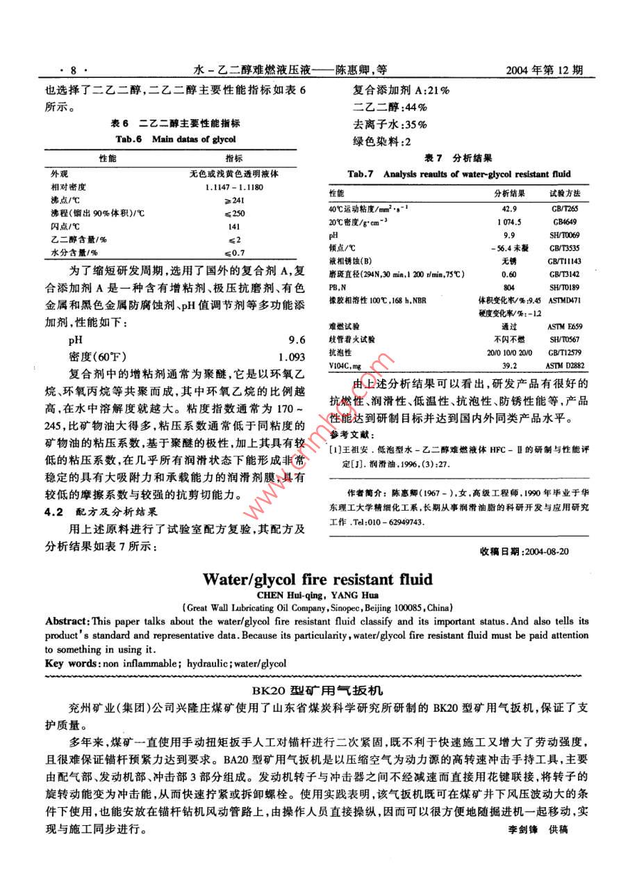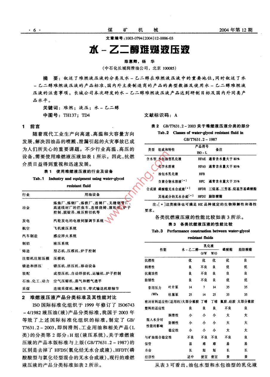 煤礦機械文章編號:1003-0794(2004)12-000603水-乙二醇避哪液壓陳惠卿,楊華(中石化長城潤滑油公司,北京100085摘要:敘述了難燃液壓液的分類及水一乙二醇在難燃液壓液中的重要地位,同時敘述了水乙二醇難燃液壓液的產(chǎn)品標(biāo)準(zhǔn)、國內(nèi)外主要制造商的產(chǎn)品的典型數(shù)據(jù)及使用水一乙二醇難燃液壓液的注意事項。長堿城公司本次研發(fā)的水一乙二醇難燃液壓液產(chǎn)品達(dá)到研制目標(biāo)及國內(nèi)外同類產(chǎn)品水平。關(guān)鍵詞:難燃;液壓;水-乙二醇中圖號:TH37;TD4文獻(xiàn)標(biāo)識碼:A1前言表2GB/T6312-2003關(guān)于難燃液壓液分類的部分隨著現(xiàn)代工業(yè)生產(chǎn)向高速、高溫和大容量方向Tab 2 Classes of waterglycol resistant nuid in發(fā)展解決因油品的噴濺泄漏引起的火災(zāi)事故已成GB/T76312-1987為人們所關(guān)心的重要課題。不少行業(yè)高溫、高壓的類型組成和特性產(chǎn)品符號備注設(shè)備,需要使用難燃液壓液如表1所示。因此,抗燃含水型水包油型乳化液HFAE通常含水量大于80%介質(zhì)日益得到重視和迅速發(fā)展。化學(xué)水溶液HFAS通常含水量大于80%表1使用難燃液壓液的行業(yè)及設(shè)備油包水乳化液ab1 Industry and equipment using water-glycol含聚合物水溶液{·1HFC通常含水量大于3%resistant nuid合成液磷酸酯無水合成液·1HFDR三烷基、三芳基烷基芳基磷酸酯行業(yè)用油設(shè)備其他成分的無水合成【·1HFDU脂肪酸酯n蘭焦車、連續(xù)澆鑄、滾軋機、爐子注:[]這類液體也可滿足HE品種規(guī)定的生物降解性和毒性壓剪切機等求汽輪發(fā)電的電液伺服調(diào)節(jié)系統(tǒng)各類抗燃液壓液的性能比較如表3所示。衰3各類抗燃液壓液的性能比較飛機液壓系統(tǒng)Tab 3 Performance constraction between waterglycol汽車制造感應(yīng)淬火系統(tǒng)resistant fluids制鋁液壓系統(tǒng)鑄造型芯機、壓模機、爐子控制性能水乙二醉磷酸酯脂肪酸酯注塑機注射壓模壓模機抗燃性優(yōu)優(yōu)優(yōu)優(yōu)鍛造和擠壓鍛壓機、擠壓機、移動設(shè)備潤滑性不良良裝配成型壓機、自動焊接機、運輸機、爐子控制抗腐濁性良石油、化工、動力空氣壓縮機、蒸氣和燃?xì)馔钙椒冷P性不良良優(yōu)優(yōu)連續(xù)采煤機、測位車、帶式輸送機聯(lián)軸節(jié)常用壓力葉片泵147|435352難燃液壓液產(chǎn)品分類標(biāo)準(zhǔn)及其性能對比/MRa柱塞泵密封材料適應(yīng)性(適用的)大部分橡膠丁晴丁晴氟膠、硅膠大部分橡膠0國際標(biāo)準(zhǔn)化組織于1999年修訂了ls06743塑料的適應(yīng)性-4/1982液壓油(液)產(chǎn)品分類標(biāo)準(zhǔn),我國于2003年等效了上述國際標(biāo)準(zhǔn)化組織的標(biāo)準(zhǔn),制定了GBM混八水分潤滑性小小小大性能的影響小小小大大T7631.2-2003,即潤滑劑、工業(yè)用油和相關(guān)產(chǎn)品(L穩(wěn)定性小小小大大類)的分類第2部分:H組(液壓系統(tǒng)),關(guān)于難燃液與礦油混合穩(wěn)定性不良不良不良不良良壓液的產(chǎn)品本版標(biāo)準(zhǔn)與上版(GB76312-1987)的保管區(qū)別是去掉了HFDS(氯化烴無水合成液)、HFDT(磷壽命酸酸型與氯化烴型混合的無水合成液),現(xiàn)行的難燃經(jīng)濟性適中便宜便宜液壓液的產(chǎn)品分類標(biāo)準(zhǔn)如表2所示從表3可看出,油包水型和水包油型的乳化液2004年第12期水-乙二醇難燃液壓液—陳惠卿,等穩(wěn)定性差、不易保管、使用壽命短。磷酸酯型的液壓司的產(chǎn)品標(biāo)準(zhǔn),特制定本次研制目標(biāo)如表5所示。液對大多數(shù)橡膠材料不適用,易水解,價格較高。脂表5水-乙二醇難燃液壓液研制目標(biāo)肪酸酯型的液壓液抗燃性比其他抗燃液壓油差,水Tab.5 Development aim for waterglycol resistant auld解安定性差,價格高。因此,在眾多的抗燃液中,經(jīng)性能質(zhì)量指標(biāo)試驗方法過多方面的比較,水-乙二醇抗燃液的綜合性能是40運動粘度/m2,41,4-50.6GB最好的其壽命長、價格適中、低凝、無毒、不存在水20℃密度/gm3解安定性問題,適合高溫、易燃、有火災(zāi)爆炸等危險p8.5-10SH/TO069場所使用。傾點/℃<-453水-乙二醇難燃液壓液液相銹蝕(B)GB/TI1143水-乙二醇難燃液壓液已有近50a的工業(yè)應(yīng)感斑直徑(N,3m,120m,萬)報告用歷史,是國際上冶金、鑄造、化工等行業(yè)液壓設(shè)備,N普遍采用的一種介質(zhì),據(jù)統(tǒng)計,2000年我國水一乙橡膠相溶性1℃,1h,NBR體積變化率:報告 ASTMD4二醇的年用量為4000t,并且有逐年上升的趨勢。硬度變化率:報告(1)水-乙二醇難燃液壓液產(chǎn)品標(biāo)準(zhǔn)歧管著火試驗ISO國際標(biāo)準(zhǔn)化組織于1999年制定了難燃液壓抗泡性報告GB/T12579液的產(chǎn)品標(biāo)準(zhǔn)即IO1292:19,其中水-2二wcm醇(HFC)難燃液壓液包括4個粘度級別,產(chǎn)品主要4配方復(fù)驗性能指標(biāo)如表4所示。4.1原料表4IsO12922:1999(E)水-乙二醇(HFC)難燃液壓液產(chǎn)品主要性能指標(biāo)水-乙二醇難燃液壓液主要由3部分組成,第Tab 4 Product standard for water-glycol resistant fluid部分為水,占40%,它是水-乙二醇難燃液壓液的(Iso2922抗燃部分。當(dāng)遇明火時,水的蒸汽隔斷了燃燒所需粘度級別要的空氣,起到阻燃作用。第2部分是乙二醇及其產(chǎn)品性能測試方法2232466同系物,改善液壓液的低溫性能;第3部分是復(fù)合添水含量/%(m/m)Bo7a加劑,包括增粘劑油性劑、防
