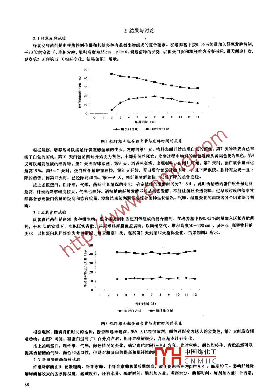 第31卷第12期湖南科技學院學報Vol 31 No 122010年12月Journal of Hunan University of Science and engineeriDec.2010利用紅薯燃料乙醇生產(chǎn)中產(chǎn)生的廢糟生產(chǎn)生物飼料的研究劉凱劉惠易金華肖瓊虞禮唐杰李尊華(湖南科技學院生命科學與化學工程系,湖南永州425100)摘要:紅薯生產(chǎn)燃補乙醇產(chǎn)生了大量的廢酒糟,其營養(yǎng)價值低,特別是粗纖維很難被利用.采用妤氧發(fā)酵,厭氧青貯維降解酶酶解的方法分別處理紅薯燃料乙醇廢酒糟,以降低粗纖維的含量,提高營養(yǎng)價值,生產(chǎn)節(jié)糧型的生物飼料,通過財處理后酒精糟營養(yǎng)成分和感官指標的比較,發(fā)現(xiàn)妤氧發(fā)酵營養(yǎng)成分提高最多,厭氧青貯的色香等感官指標最佳,酶解周期最短,粗纖維降解最明顯關(guān)鍵詞:酒糟;生物飼料;發(fā)酵;青貯;酶解中圖分類號:069文獻標識碼:A文章編號:1673-2219(2010)12-0067-03紅薯酒精糟是以紅薯為原料生產(chǎn)燃料乙醇的副產(chǎn)物。干紅薯的淀粉含量超過60%,是酒精生產(chǎn)的理想原料,但是紅薯酒精糟水分大,營養(yǎng)價值低,利用困難,容易造成環(huán)境的污染。與啤酒糟和閂酒糟相比,紅薯酒精糟粗蛋白質(zhì)低,粗脂肪低粗纖維高,很難滿足飼料營養(yǎng)的需求目前只有部分紅薯酒精棉直接出售給農(nóng)戶作粗飼料或者肥料,大部分被視作廢物,既浪費了資源,又造成了環(huán)境污染。利用生物的方法處理酒輔精,提高營養(yǎng)價值,發(fā)展生物飼料是紅薯酒精精利用的有效途徑。這不僅充分利用了資源,降低了環(huán)境污染,也是解決人畜爭糧的有效途徑之一,具有極大的經(jīng)濟效益和社會效益。文中初步探討了以紅薯酒精精為原料生產(chǎn)生物飼料的一些方法,并對這些方法進行了比較1材料與方法1原料紅薯酒精精:永州市永大生物能源科技有限公司提供;麩皮,尿素等當?shù)刭徺I。1.2菌劑和酶好氧發(fā)酵蔭劑:河北南和春熙生物工程有限賚任公司提供厭氧青貯鹵劑:江兩宜春高新技術(shù)專利產(chǎn)品開發(fā)中心提供。纖維降解:寧夏和氏璧生物技術(shù)有限公司提供。1.3分析方法粗蛋白質(zhì)的測定:采用GB/T6432-1994飼料中粗蛋白質(zhì)的測定方法;水分的測定:采用GBT6435-1986飼料水分的測定方法粗纖維的測定:采用GBT6434-1994飼料中粗纖維的測定方法粗灰分的測定:采用GBT6438-1992飼料中粗灰分的測定方法。1.4培養(yǎng)基組成麩皮2%尿素0.2%和灑精精978%(以半烘干后水分65%計)。新鮮的酒精柟含水分85%,pH5.5左右,需按發(fā)酵或酶解的要求做一些調(diào)整。試驗步驟如下:鮮濕酒精糟→半烘千→添加輔料→接入蔭劑或酶劑→混合→發(fā)酵或酶解→烘千→檢測中國煤化工CNMHG收稿日期:2010-11-01基金項目:湖南省大學生研究性學習和創(chuàng)新性實驗計劃項目。作者簡介:劉覬(1986-),男,湖南科技學院生命科學與化學工程系2005屆化學專業(yè)學生。2結(jié)果與討論2.1好氧發(fā)酵試驗好氧發(fā)酵菌劑是由嗜熱性側(cè)孢霉和其他多種有益微生物組成的復合菌劑。在培養(yǎng)基中按0.05%的量加入好氧發(fā)酵菌劑,于30℃的室溫下,堆積發(fā)酵,堆積高度為25cm,pH=6。觀察菌種的長勢,以粗蛋白質(zhì)和粗纖維為考察指標,每天測定!次,觀察第2天到第12天指標變化。結(jié)果如圖1所示。培養(yǎng)時回(d)料蛋門含氧一和扦維含圖1粗纖維和粗蛋白含量與發(fā)酵時間的關(guān)系根據(jù)觀察,培養(yǎng)基可以滿足好氧發(fā)酵菌劑的生長,發(fā)酵的第4天,物料表面開始出現(xiàn)白色的藺絲,第7天物料表面已布滿了白色的繭絲,第10天白色的藺絲開始變?yōu)榛疑?小部分絲死亡。發(fā)酵過程中物料的顏色還漸從黃褐色變?yōu)楹谏?第4天可以聞到淡淡的酒香味,第7天灑香味濃烈,第9天,酒香味變淡,出現(xiàn)氨味。由圖!可知,第7天時,蛋白質(zhì)含量到達最高19%第5~7天時,蛋白質(zhì)含量增加較快,第8天開始,蛋臼質(zhì)含敏又開始下降,并且下降很快。粗纖維呈現(xiàn)一直下降的趨勢,到第12天時,已經(jīng)降到28%。第6~9天,粗纖維降解較快,以后下降的趨勢變緩按上述粗蛋白,粗纖維,氣味,菌絲生長情況的變化,確定最佳的發(fā)酵時間為7~8d,此時酒精糟的蛋白質(zhì)含量達到最高,纖維的降解幅度較大,氣味也較好。酒精糟的好發(fā)酵不能是徹底發(fā)酵,不能讓菌絲長透物料,過早或過晩的結(jié)束發(fā)酵都會影響蛋白含址的提高和感官質(zhì)量。發(fā)酵結(jié)束的判斷雷要綜合菌種生長情況、氣味、溫度變化的曲線等各個因素綜合判2.2厭氧青貯試驗厭氧青貯菌劑是由50多種微生物,配合滲透劑和固定劑等組成的復合菌劑。在培養(yǎng)基中按005%的量加入?yún)捬跚噘A菌劑,于30℃的室溫下,堆積壓實青貯,并用塑料薄膜覆蓋表面,以隔絕空氣。堆積高度50~200cm,pH=6。觀察物料的變化,以粗蛋臼和粗纖維為考察指標,每天測定1次,觀察第2天到第12天指標變化。結(jié)果如圖2所示12345678910112貯時間(d梨含量一粗纖維含量圖2粗纖維和粗蛋白含量與青貯時間的關(guān)系根據(jù)觀察,隨著青貯時間的延長,醬香味越來越濃,第9天已經(jīng)很濃烈;顏色逐漸變?yōu)檎T人的金黃色,第7天時適合飼喂動物。由圖2可知,粗蛋白提高f百分點左右;粗纖維降解很少,含量基本沒有變化。按上述粗蛋白,粗纖維,氣味,顫色情況的變化,確定青貯時間7~9d為宜。此時氣味,